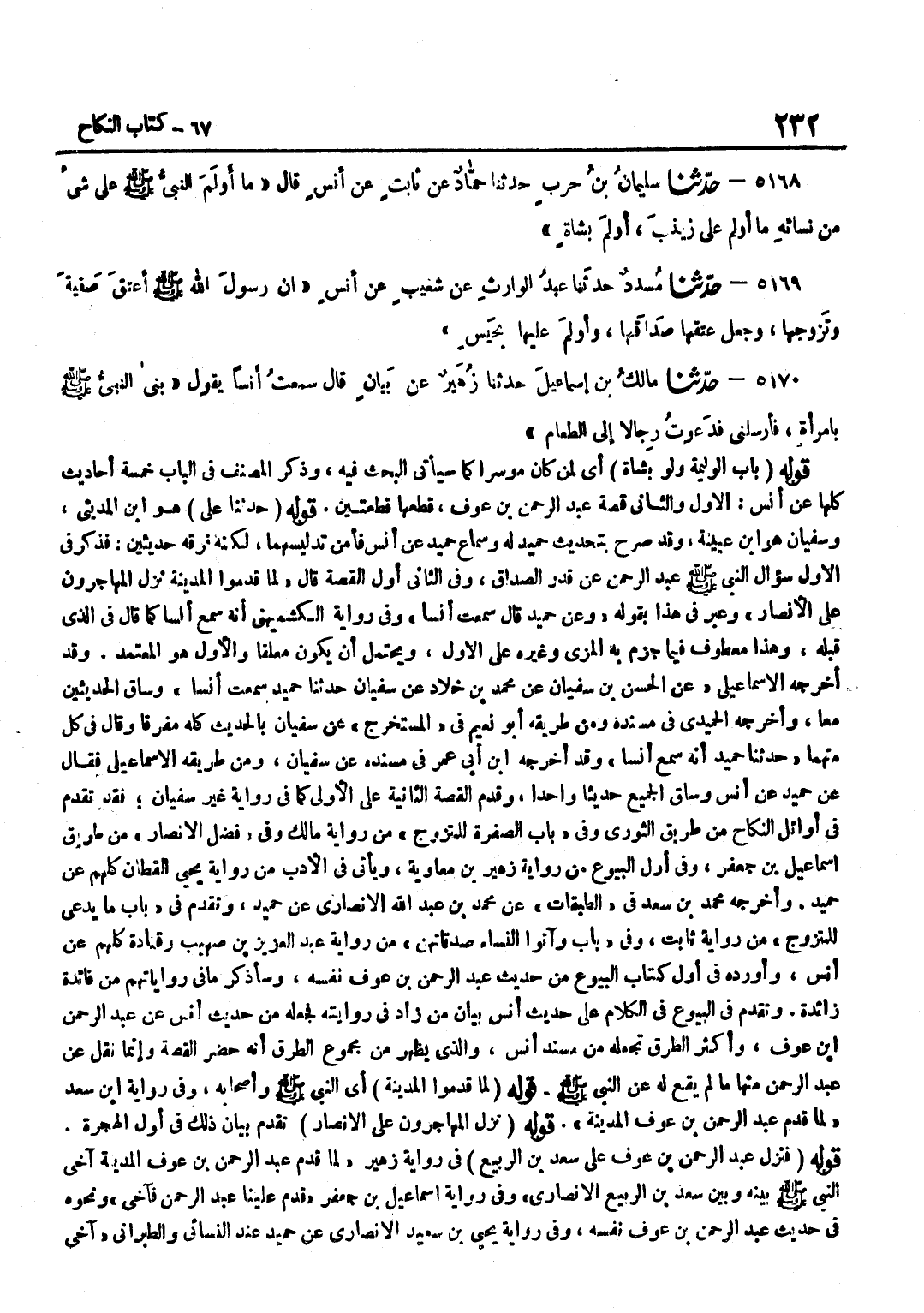 [5167] قَوْلُهُ حَدَّثَنَا عَلِيٌّ هُوَ بن الْمَدِينِيّ وسُفْيَان هُوَ بن عُيَيْنَةَ وَقَدْ صَرَّحَ بِتَحْدِيثِ حُمَيْدٍ لَهُ وَسَمَاعِ حُمَيْدٍ عَنْ أَنَسٍ فَأُمِنَ تَدْلِيسُهُمَا لَكِنَّهُ فَرَّقَهُ حَدِيثَيْنِ فَذَكَرَ فِي الْأَوَّلِ سُؤَالَ النَّبِيِّ صَلَّى اللَّهُ عَلَيْهِ وَسَلَّمَ عَبْدَ الرَّحْمَنِ عَنْ قَدْرِ الصَّدَاقِ وَفِي الثَّانِي أَوَّلَ الْقِصَّةِ قَالَ لَمَّا قَدِمُوا الْمَدِينَةَ نَزَلَ الْمُهَاجِرُونَ عَلَى الْأَنْصَارِ وَعَبَّرَ فِي هَذَا بِقَوْلِهِ وَعَنْ حُمَيْدٍ قَالَ سَمِعْتُ أَنَسًا وَفِي رِوَايَةِ الْكُشْمِيهَنِيِّ أَنَّهُ سَمِعَ أَنَسًا كَمَا قَالَ فِي الَّذِي قَبْلَهُ وَهَذَا مَعْطُوفٌ فِيمَا جَزَمَ بِهِ الْمِزِّيُّ وَغَيْرُهُ عَلَى الْأَوَّلِ وَيَحْتَمِلُ أَنْ يَكُونَ مُعَلَّقًا وَالْأَوَّلُ هُوَ الْمُعْتَمَدُ وَقَدْ أَخْرَجَهُ الْإِسْمَاعِيلِيِّ عَنِ الْحَسَنِ بْنِ سُفْيَانَ عَنْ مُحَمَّدِ بْنِ خَلَّادٍ عَنْ سُفْيَانَ حَدَّثَنَا حُمَيْدٌ سَمِعْتُ أَنَسًا وَسَاقَ الْحَدِيثَيْنِ مَعًا وَأَخْرَجَهُ الْحُمَيْدِيُّ فِي مُسْنَدِهِ وَمِنْ طَرِيقِهِ أَبُو نُعَيْمٍ فِي الْمُسْتَخْرَجِ عَنْ سُفْيَانَ بِالْحَدِيثِ كُلِّهِ مُفَرَّقًا وَقَالَ فِي كُلِّ مِنْهُمَا حَدَّثَنَا حُمَيْدٌ أَنَّهُ سمع أنسا وَقد أخرجه بن أَبِي عُمَرَ فِي مُسْنَدِهِ عَنْ سُفْيَانَ وَمِنْ طَرِيقِهِ الْإِسْمَاعِيلِيُّ فَقَالَ عَنْ حُمَيْدٍ عَنْ أَنَسٍ وَسَاقَ الْجَمِيعُ حَدِيثًا وَاحِدًا وَقَدَّمَ الْقِصَّةَ الثَّانِيَةَ على الأولى كَمَا فِي رِوَايَة غَيْرِ سُفْيَانَ فَقَدْ تَقَدَّمَ فِي أَوَائِلِ النِّكَاحِ مِنْ طَرِيقِ الثَّوْرِيِّ وَفِي بَابِ الصُّفْرَةِ لِلْمُتَزَوِّجِ مِنْ رِوَايَةِ مَالِكٍ وَفِي فَضْلِ الْأَنْصَارِ مِنْ طَرِيقِ إِسْمَاعِيلَ بْنِ جَعْفَرٍ وَفِي أَوَّلِ الْبُيُوعِ مِنْ رِوَايَةِ زُهَيْرِ بْنِ مُعَاوِيَةَ وَيَأْتِي فِي الْأَدَبِ مِنْ رِوَايَةِ يَحْيَى الْقَطَّانِ كُلُّهُمْ عَنْ حُمَيْدٍ وَأَخْرَجَهُ مُحَمَّدُ بْنُ سَعْدٍ فِي الطَّبَقَاتِ عَنْ مُحَمَّدِ بْنِ عَبْدِ اللَّهِ الْأَنْصَارِيِّ عَنْ حُمَيْدٍ وَتَقَدَّمَ فِي بَابِ مَا يُدْعَى لِلْمُتَزَوِّجِ مِنْ رِوَايَةِ ثَابِتٍ وَفِي بَابِ وَآتُوا النِّسَاءَ صدقاتهن مِنْ رِوَايَةِ عَبْدِ الْعَزِيزِ بْنِ صُهَيْبٍ وَقَتَادَةَ كُلُّهُمْ عَنْ أَنَسٍ وَأَوْرَدَهُ فِي أَوَّلِ كِتَابِ الْبُيُوعِ مِنْ حَدِيثِ عَبْدِ الرَّحْمَنِ بْنِ عَوْفٍ نَفْسِهِ وَسَأَذْكُرُ مَا فِي رِوَايَاتِهِمْ مِنْ فَائِدَةٍ زَائِدَةٍ وَتَقَدَّمَ فِي الْبُيُوعِ فِي الْكَلَامِ عَلَى حَدِيثِ أَنَسٍ بَيَانُ مَنْ زَادَ فِي رِوَايَتِهِ فَجَعَلَهُ مِنْ حَدِيثِ أَنَسٍ عَنْ عَبْدِ الرَّحْمَنِ بْنِ عَوْفٍ وَأَكْثَرُ الطُّرُقِ تَجْعَلُهُ مِنْ مُسْنَدِ أَنَسٍ وَالَّذِي يَظْهَرُ مِنْ مَجْمُوعِ الطُّرُقِ أَنَّهُ حَضَرَ الْقِصَّةَ وَإِنَّمَا نُقِلَ عَنْ عَبْدِ الرَّحْمَنِ مِنْهَا مَا لَمْ يَقَعْ لَهُ عَنِ النَّبِيِّ صَلَّى اللَّهُ عَلَيْهِ وَسَلَّمَ قَوْلُهُ لَمَّا قَدِمُوا الْمَدِينَةَ أَيِ النَّبِيُّ صَلَّى اللَّهُ عَلَيْهِ وَسَلَّمَ وَأَصْحَابُهُ وَفِي رِوَايَة بن سَعْدٍ لَمَّا قَدِمَ عَبْدُ الرَّحْمَنِ بْنُ عَوْفٍ الْمَدِينَةَ قَوْلُهُ نَزَلَ الْمُهَاجِرُونَ عَلَى الْأَنْصَارِ تَقَدَّمَ بَيَانُ ذَلِكَ فِي أَوَّلِ الْهِجْرَةِ قَوْلُهُ فَنَزَلَ عَبْدُ الرَّحْمَنِ بْنُ عَوْفٍ عَلَى سَعْدِ بْنِ الرَّبِيعِ فِي رِوَايَةِ زُهَيْرٍ لَمَّا قَدِمَ عَبْدُ الرَّحْمَنِ بْنُ عَوْفٍ الْمَدِينَةُ آخَى النَّبِيُّ صَلَّى اللَّهُ عَلَيْهِ وَسَلَّمَ بَيْنَهُ وَبَيْنَ سَعْدِ بْنِ الرَّبِيعِ الْأَنْصَارِيِّ وَفِي رِوَايَةِ إِسْمَاعِيلَ بْنِ جَعْفَ
