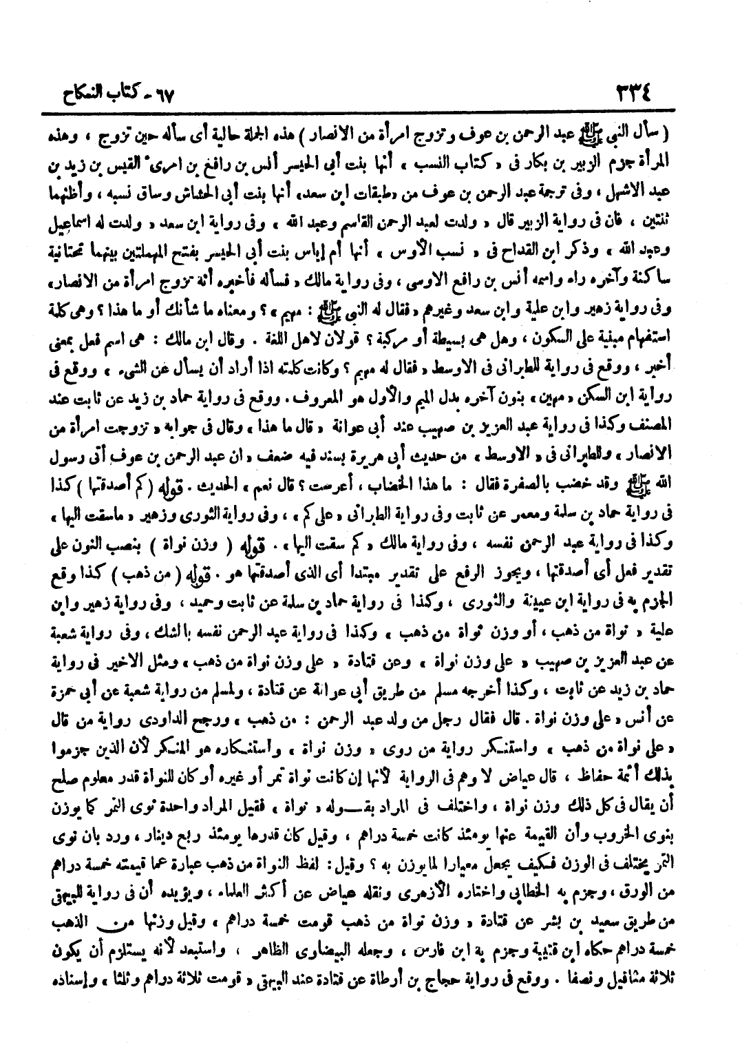 سَأَلَ النَّبِيُّ صَلَّى اللَّهُ عَلَيْهِ وَسَلَّمَ عَبْدَ الرَّحْمَنِ بْنَ عَوْفٍ وَتَزَوَّجَ امْرَأَةً مِنَ الْأَنْصَارِ هَذِهِ الْجُمْلَةُ حَالِيَّةٌ أَيْ سَأَلَهُ حِينَ تَزَوَّجَ وَهَذِهِ الْمَرْأَةُ جَزَمَ الزُّبَيْرُ بْنُ بَكَّارٍ فِي كِتَابِ النَّسَبِ أَنَّهَا بِنْتُ أَبِي الْحَيْسَرِ أَنَسِ بْنِ رَافِعِ بْنِ امْرِئِ الْقَيْسِ بْنِ زَيْدِ بْنِ عَبْدِ الْأَشْهَلِ وَفِي تَرْجَمَةِ عَبْدِ الرَّحْمَنِ بن عَوْف من طَبَقَات بن سَعْدٍ أَنَّهَا بِنْتُ أَبِي الْحَشَّاشِ وَسَاقَ نَسَبَهُ وَأَظُنُّهُمَا ثِنْتَيْنِ فَإِنَّ فِي رِوَايَةِ الزُّبَيْرِ قَالَ وَلَدَتْ لِعَبْدِ الرَّحْمَنِ الْقَاسِمَ وَعَبْدَ اللَّهِ وَفِي رِوَايَة بن سَعْدٍ وَلَدَتْ لَهُ إِسْمَاعِيلَ وَعَبْدَ اللَّهِ وَذَكَرَ بن الْقَدَّاحِ فِي نَسَبِ الْأَوْسِ أَنَّهَا أُمُّ إِيَاسٍ بِنْتُ أَبِي الْحَيْسَرِ بِفَتْحِ الْمُهْمَلَتَيْنِ بَيْنَهُمَا تَحْتَانِيَّةٌ سَاكِنَةٌ وَآخِرُهُ رَاءٌ وَاسْمُهُ أَنَسُ بْنُ رَافِعٍ الْأَوْسِيُّ وَفِي رِوَايَةِ مَالِكٍ فَسَأَلَهُ فَأَخْبَرَهُ أَنَّهُ تَزَوَّجَ امْرَأَةً مِنَ الْأَنْصَارِ وَفِي رِوَايَةِ زُهَيْرٍ وبن علية وبن سَعْدٍ وَغَيْرِهِمْ فَقَالَ لَهُ النَّبِيُّ صَلَّى اللَّهُ عَلَيْهِ وَسَلَّمَ مَهْيَمْ وَمَعْنَاهُ مَا شَأْنُكَ أَوْ مَا هَذَا وَهِيَ كَلِمَةُ اسْتِفْهَامٍ مَبْنِيَّةٌ عَلَى السُّكُونِ وَهَلْ هِيَ بَسِيطَةٌ أَوْ مَرْكَبَةٌ قَوْلَانِ لأهل اللُّغَة وَقَالَ بن مَالِكٍ هِيَ اسْمُ فِعْلٍ بِمَعْنَى أَخْبِرْ وَوَقَعَ فِي رِوَايَةِ لِلطَّبَرَانِيِّ فِي الْأَوْسَطِ فَقَالَ لَهُ مَهْيَمْ وَكَانَتْ كَلِمَتَهُ إِذَا أَرَادَ أَنْ يَسْأَلَ عَن الشَّيْء وَوَقع فِي رِوَايَة بن السَّكَنِ مَهْيَنْ بِنُونٍ آخِرَهُ بَدَلَ الْمِيمِ وَالْأَوَّلُ هُوَ الْمَعْرُوفُ وَوَقَعَ فِي رِوَايَةِ حَمَّادِ بْنِ زَيْدٍ عَنْ ثَابِتٍ عِنْدَ الْمُصَنِّفِ وَكَذَا فِي رِوَايَةِ عَبْدِ الْعَزِيزِ بْنِ صُهَيْبٍ عِنْدَ أَبِي عَوَانَةَ قَالَ مَا هَذَا وَقَالَ فِي جَوَابِهِ تَزَوَّجْتُ امْرَأَةً مِنَ الْأَنْصَارِ وَلِلطَّبَرَانِيِّ فِي الْأَوْسَطِ مِنْ حَدِيثِ أَبِي هُرَيْرَةَ بِسَنَدٍ فِيهِ ضَعْفٌ أَنَّ عَبْدَ الرَّحْمَنَ بْنَ عَوْفٍ أَتَى رَسُولُ اللَّهِ صَلَّى اللَّهُ عَلَيْهِ وَسَلَّمَ وَقَدْ خُضِبَ بِالصُّفْرَةِ فَقَالَ مَا هَذَا الْخِضَابُ أَعْرَسْتَ قَالَ نَعَمْ الْحَدِيثَ قَوْلُهُ كَمْ أَصْدَقْتَهَا كَذَا فِي رِوَايَةِ حَمَّادِ بْنِ سَلَمَةَ وَمَعْمَرٍ عَنْ ثَابِتٍ وَفِي رِوَايَةِ الطَّبَرَانِيِّ عَلَى كَمْ وَفِي رِوَايَةِ الثَّوْرِيِّ وَزُهَيْرٍ مَا سُقْتَ إِلَيْهَا وَكَذَا فِي رِوَايَةِ عَبْدِ الرَّحْمَنِ نَفْسِهِ وَفِي رِوَايَةِ مَالِكٍ كَمْ سُقْتَ إِلَيْهَا قَوْلُهُ وَزْنَ نَوَاةٍ بِنَصْبِ النُّونِ عَلَى تَقْدِيرِ فِعْلٍ أَيْ أَصْدَقْتُهَا وَيَجُوزُ الرَّفْعُ عَلَى تَقْدِيرِ مُبْتَدَأٍ أَيِ الَّذِي أَصْدَقْتُهَا هُوَ قَوْلُهُ مِنْ ذَهَبٍ كَذَا وَقَعَ الْجَزْمُ بِهِ فِي رِوَايَة بن عُيَيْنَةَ وَالثَّوْرِيِّ وَكَذَا فِي رِوَايَةِ حَمَّادِ بْنِ سَلَمَةَ عَنْ ثَابِتٍ وَحُمَيْدٍ وَفِي رِوَايَةِ زُهَيْرٍ وبن عُلَيَّةَ نَوَاةً مِنْ ذَهَبٍ أَوْ وَزْنَ نَوَاةٍ مِنْ ذَهَبٍ وَكَذَا فِي رِوَايَةِ عَبْدِ الرَّحْمَنِ نَفْسِهِ بِالشَّكِّ وَفِي رِوَايَةِ شُعْبَةَ عَنْ عَبْدِ الْعَزِيزِ بْنِ صُهَيْبٍ عَلَى وَزْنِ نَوَاةٍ وَعَنْ قَتَادَةَ عَلَى وَزْنِ نَوَاةٍ مِنْ ذَهَبٍ وَمِثْلُ الْأَخِيرِ فِي رِوَايَةِ حَمَّادِ بْنِ زَيْدٍ عَنْ ثَابِتٍ وَكَذَا أَخْرَجَهُ مُسْلِمٌ مِنْ طَرِيقِ أَبِي عَوَانَةَ عَنْ قَتَادَةَ وَلِمُسْلِمٍ مِنْ رِوَايَةِ شُعْبَةَ عَنْ أَبِي حَمْزَةَ عَنْ أَنَسٍ عَ