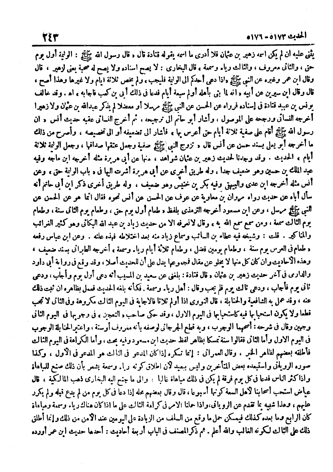 يُثْنَى عَلَيْهِ إِنْ لَمْ يَكُنِ اسْمُهُ زُهَيْرَ بْنَ عُثْمَانَ فَلَا أَدْرِي مَا اسْمُهُ يَقُولُهُ قَتَادَةُ قَالَ قَالَ رَسُولُ اللَّهِ صَلَّى اللَّهُ عَلَيْهِ وَسَلَّمَ الْوَلِيمَةُ أَوَّلَ يَوْمٍ حَقٌّ وَالثَّانِي مَعْرُوفٌ وَالثَّالِثُ رِيَاءٌ وَسُمْعَةٌ قَالَ الْبُخَارِيُّ لَا يَصِحُّ إِسْنَادُهُ وَلَا يَصِحُّ لَهُ صُحْبَةٌ يَعْنِي لزهير قَالَ وَقَالَ بن عُمَرَ وَغَيْرُهُ عَنِ النَّبِيِّ صَلَّى اللَّهُ عَلَيْهِ وَسَلَّمَ إِذَا دُعِيَ أَحَدُكُمْ إِلَى الْوَلِيمَةِ فَلْيُجِبْ وَلَمْ يَخُصَّ ثَلَاثَةَ أَيَّامٍ وَلَا غَيْرَهَا وَهَذَا أصح قَالَ وَقَالَ بن سِيرِينَ عَنْ أَبِيهِ أَنَّهُ لَمَّا بَنَى بِأَهْلِهِ أَوْلَمَ سَبْعَةَ أَيَّامٍ فَدَعَا فِي ذَلِكَ أُبَيَّ بْنَ كَعْبٍ فَأَجَابَهُ اه وَقَدْ خَالَفَ يُونُسُ بْنُ عُبَيْدٍ قَتَادَةَ فِي إِسْنَادِهِ فَرَوَاهُ عَنِ الْحَسَنِ عَنِ النَّبِيِّ صَلَّى اللَّهُ عَلَيْهِ وَسَلَّمَ مُرْسَلًا أَوْ مُعْضَلًا لَمْ يَذْكُرْ عَبْدَ اللَّهِ بْنَ عُثْمَانَ وَلَا زُهَيْرًا أَخْرَجَهُ النَّسَائِيُّ وَرَجَّحَهُ عَلَى الْمَوْصُولِ وَأَشَارَ أَبُو حَاتِمٍ إِلَى تَرْجِيحِهِ ثُمَّ أَخْرَجَ النَّسَائِيُّ عَقِبَهُ حَدِيثَ أَنَسٍ أَنَّ رَسُولَ اللَّهِ صَلَّى اللَّهُ عَلَيْهِ وَسَلَّمَ أَقَامَ عَلَى صَفِيَّةَ ثَلَاثَةَ أَيَّامٍ حَتَّى أَعْرَسَ بِهَا فَأَشَارَ إِلَى تَضْعِيفِهِ أَوْ إِلَى تَخْصِيصِهِ وَأَصْرَحُ مِنْ ذَلِكَ مَا أَخْرَجَهُ أَبُو يَعْلَى بِسَنَدٍ حَسَنٍ عَنْ أَنَسٍ قَالَ تَزَوَّجَ النَّبِيُّ صَلَّى اللَّهُ عَلَيْهِ وَسَلَّمَ صَفِيَّةَ وَجَعَلَ عِتْقَهَا صَدَاقَهَا وَجَعَلَ الْوَلِيمَةَ ثَلَاثَةَ أَيَّامٍ الْحَدِيثَ وَقَدْ وَجَدْنَا لِحَدِيثِ زُهَيْرِ بْنِ عُثْمَانَ شَوَاهِدَ مِنْهَا عَنْ أبي هُرَيْرَة مثله أخرجه بن مَاجَهْ وَفِيهِ عَبْدُ الْمَلِكِ بْنُ حُسَيْنٍ وَهُوَ ضَعِيفٌ جِدًّا وَلَهُ طَرِيقٌ أُخْرَى عَنْ أَبِي هُرَيْرَةَ أَشَرْتُ إِلَيْهَا فِي بَابِ الْوَلِيمَةِ حَقٌّ وَعَن أنس مثله أخرجه بن عَدِيٍّ وَالْبَيْهَقِيُّ وَفِيهِ بَكْرُ بْنُ خُنَيْسٍ وَهُوَ ضَعِيف وَله طَرِيق أُخْرَى ذكر بن أَبِي حَاتِمٍ أَنَّهُ سَأَلَ أَبَاهُ عَنْ حَدِيثٍ رَوَاهُ مَرْوَانُ بْنُ مُعَاوِيَةَ عَنْ عَوْفٍ عَنِ الْحَسَنِ عَنْ أَنَسٍ نَحْوُهُ فَقَالَ إِنَّمَا هُوَ عَنِ الْحَسَنِ عَنِ النَّبِيِّ صَلَّى اللَّهُ عَلَيْهِ وَسَلَّمَ مُرْسَلٌ وَعَن بن مَسْعُودٍ أَخْرَجَهُ التِّرْمِذِيُّ بِلَفْظِ طَعَامُ أَوَّلِ يَوْمٍ حَقٌّ وَطَعَامٌ يَوْمِ الثَّانِي سُنَّةٌ وَطَعَامُ يَوْمِ الثَّالِثِ سُمْعَةٌ وَمَنْ سَمَّعَ سَمَّعَ اللَّهُ بِهِ وَقَالَ لَا نَعْرِفُهُ إِلَّا مِنْ حَدِيثِ زِيَادِ بْنِ عَبْدِ اللَّهِ الْبَكَّائِيِّ وَهُوَ كَثِيرُ الْغَرَائِبِ وَالْمَنَاكِيرِ قُلْتُ وَشَيْخُهُ فِيهِ عَطَاءُ بْنُ السَّائِبِ وَسَمَاعُ زِيَادٍ مِنْهُ بَعْدَ اخْتِلَاطِهِ فَهَذِهِ عِلَّتُهُ وَعَن بن عَبَّاسٍ رَفَعَهُ طَعَامٌ فِي الْعُرْسِ يَوْمٌ سُنَّةٌ وَطَعَامُ يَوْمَيْنِ فَضْلٌ وَطَعَامُ ثَلَاثَةِ أَيَّامٍ رِيَاءٌ وَسُمْعَةٌ أَخْرَجَهُ الطَّبَرَانِيُّ بِسَنَدٍ ضَعِيفٍ وَهَذِهِ الْأَحَادِيثُ وَإِنْ كَانَ كُلٌّ مِنْهَا لَا يَخْلُو عَنْ مَقَالٍ فَمَجْمُوعُهَا يَدُلُّ عَلَى أَنَّ لِلْحَدِيثِ أَصْلًا وَقَدْ وَقَعَ فِي رِوَايَةِ أَبِي دَاوُدَ وَالدَّارِمِيِّ فِي آخِرِ حَدِيثِ زُهَيْرِ بْنِ عُثْمَانَ قَالَ قَتَادَةُ بَلَغَنِي عَنْ سَعِيدِ بْنِ الْمُسَيَّبِ أَنَّهُ دُعِيَ أَوَّلَ يَوْمٍ وَأَجَابَ وَدُعِيَ ثَانِي يَوْمٍ فَأَجَابَ وَدُعِيَ ثَالِثَ يَوْمٍ فَلَمْ يُجِبْ وَقَالَ أَهْلُ رِيَاءٍ وَسُمْعَةٍ فَكَأَنَّهُ بَلَغَهُ الْحَدِيثُ فَعَمِلَ بِظَاهِرِهِ إِن