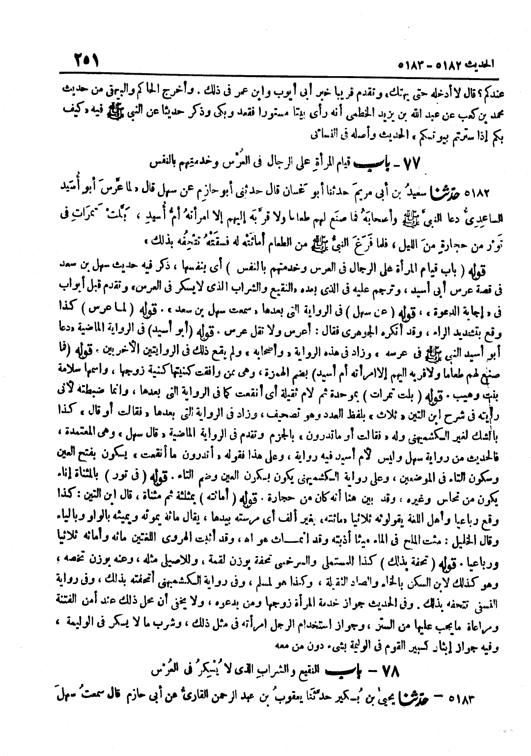 [5182] قَوْلُهُ عَنْ سَهْلٍ فِي الرِّوَايَةِ الَّتِي بَعْدَهَا سَمِعْتُ سَهْلَ بْنَ سَعْدٍ قَوْلُهُ لَمَّا عَرَّسَ كَذَا وَقَعَ بِتَشْدِيدِ الرَّاءِ وَقَدْ أَنْكَرَهُ الْجَوْهَرِيُّ فَقَالَ أَعْرَسَ وَلَا تَقُلْ عَرَّسَ قَوْلُهُ أَبُو أُسَيْدٍ فِي الرِّوَايَةِ الْمَاضِيَةِ دَعَا أَبُو أُسَيْدٍ النَّبِيَّ صَلَّى اللَّهُ عَلَيْهِ وَسَلَّمَ فِي عُرْسِهِ وَزَادَ فِي هَذِهِ الرِّوَايَةِ وَأَصْحَابَهُ وَلَمْ يَقَعْ ذَلِكَ فِي الرِّوَايَتَيْنِ الْأُخْرَيَيْنِ قَوْلُهُ فَمَا صَنَعَ لَهُمْ طَعَامًا وَلَا قَرَّبَهُ إِلَيْهِمْ إِلَّا امْرَأَتُهُ أُمُّ أُسَيْدٍ بِضَمِّ الْهَمْزَةِ وَهِيَ مِمَّنْ وَافَقَتْ كُنْيَتُهَا كُنْيَةَ زَوْجِهَا وَاسْمُهَا سَلَّامَةُ بِنْتُ وُهَيْبٍ قَوْلُهُ بَلَّتْ تَمَرَاتٍ بِمُوَحَّدَةٍ ثُمَّ لَامٍ ثَقِيلَةٍ أَيْ أَنْقَعَتْ كَمَا فِي الرِّوَايَةِ الَّتِي بَعْدَهَا وَإِنَّمَا ضبطته لِأَنِّي رَأَيْته فِي شرح بن التِّينِ ثَلَاثَ بِلَفْظِ الْعَدَدِ وَهُوَ تَصْحِيفٌ وَزَادَ فِي الرِّوَايَةِ الَّتِي بَعْدَهَا فَقَالَتْ أَوْ قَالَ كَذَا بِالشَّكِّ لِغَيْرِ الْكُشْمِيهَنِيِّ وَلَهُ فَقَالَتْ أَوْ مَا تَدْرُونَ بِالْجَزْمِ وَتَقَدَّمَ فِي الرِّوَايَةِ الْمَاضِيَةِ قَالَ سَهْلٌ وَهِيَ الْمُعْتَمَدَةُ فَالْحَدِيثُ مِنْ رِوَايَةِ سَهْلٍ وَلَيْسَ لِأُمِّ أُسَيْدٍ فِيهِ رِوَايَةٌ وَعَلَى هَذَا فَقَوْلُهُ أَتَدْرُونَ مَا أَنْقَعَتْ يَكُونُ بِفَتْحِ الْعَيْنِ وَسُكُونِ التَّاءِ فِي الْمَوْضِعَيْنِ وَعَلَى رِوَايَةِ الْكُشْمِيهَنِيِّ يَكُونُ بِسُكُونِ الْعَيْنِ وَضَمِّ التَّاءِ قَوْلُهُ فِي تَوْرٍ بِالْمُثَنَّاةِ إِنَاءٌ يَكُونُ مِنْ نُحَاسٍ وَغَيْرِهِ وَقَدْ بَيَّنَ هُنَا أَنَّهُ كَانَ مِنْ حِجَارَةٍ قَوْلُهُ أَمَاثَتْهُ بِمُثَلَّثَةٍ ثُمَّ مُثَنَّاةٍ قَالَ بن التِّينِ كَذَا وَقَعَ رُبَاعِيًّا وَأَهْلُ اللُّغَةِ يَقُولُونَهُ ثُلَاثِيًّا مَاثَتْهُ بِغَيْرِ أَلِفٍ أَيْ مَرَسَتْهُ بِيَدِهَا يُقَالُ مَاثَهُ يَمُوثُهُ وَيَمِيثُهُ بِالْوَاوِ وَبِالْيَاءِ وَقَالَ الْخَلِيلُ مِثْتُ الْمِلْحَ فِي الْمَاءِ مَيْثًا أَذَبْتَهُ وَقَدِ انْمَاثَ هُوَ اه وَقَدْ أَثْبَتُ الْهَرَوِيُّ اللُّغَتَيْنِ مَاثَهُ وَأَمَاثَهُ ثُلَاثِيًّا وَرُبَاعِيًّا قَوْلُهُ تُحْفَةٌ بِذَلِكَ كَذَا لِلْمُسْتَمْلِي وَالسَّرَخْسِيِّ تُحْفَةٌ بِوَزْنِ لُقْمَةٍ وَلِلْأَصِيلِيِّ مِثْلُهُ وَعَنْهُ بِوَزْنِ تَخُصُّهُ وَهُوَ كَذَلِكَ لِابْنِ السَّكَنِ بِالْخَاءِ وَالصَّادِ الثَّقِيلَةِ وَكَذَا هُوَ لِمُسْلِمٍ وَفِي رِوَايَةِ الْكُشْمِيهَنِيِّ أَتْحَفَتْهُ بِذَلِكَ وَفِي رِوَايَةِ النَّسَفِيِّ تُتْحِفُهُ بِذَلِكَ وَفِي الْحَدِيثِ جَوَازُ خِدْمَةِ الْمَرْأَةِ زَوْجَهَا وَمَنْ يَدْعُوهُ وَلَا يَخْفَى أَنَّ مَحَلَّ ذَلِكَ عِنْدَ أَمْنِ الْفِتْنَةِ وَمُرَاعَاةِ مَا يَجِبُ عَلَيْهَا مِنَ السِّتْرِ وَجَوَازُ اسْتِخْدَامِ الرَّجُلِ امْرَأَتَهُ فِي مِثْلِ ذَلِكَ وَشُرْبِ مَا لَا يُسْكِرُ فِي الْوَلِيمَةِ وَفِيهِ جَوَازُ إِيثَارَ كَبِيرِ الْقَوْمِ فِي الْوَلِيمَةِ بِشَيْءٍ دُونَ مَنْ مَعَه