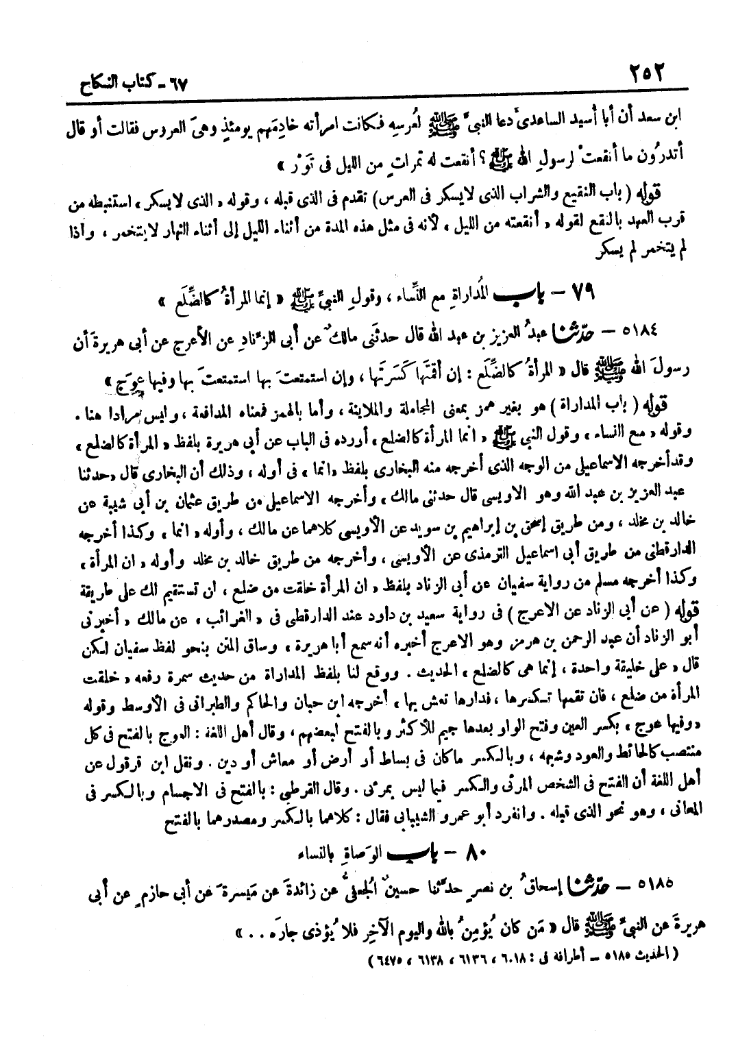 تَقَدَّمَ فِي الَّذِي قَبْلَهُ وَقَوْلُهُ الَّذِي لَا يُسْكِرُ اسْتَنْبَطَهُ مِنْ قُرْبِ الْعَهْدِ بِالنَّقْعِ لِقَوْلِهِ أَنْقَعَتْهُ مِنَ اللَّيْلِ لِأَنَّهُ فِي مِثْلِ هَذِهِ الْمُدَّةِ مِنْ أَثْنَاءِ اللَّيْلِ إِلَى أَثْنَاءِ النَّهَارِ لَا يَتَخَمَّرُ وَإِذَا لَمْ يَتَخَمَّرْ لم يسكر قَوْلُهُ بَابُ الْمُدَارَاةِ هُوَ بِغَيْرِ هَمْزٍ بِمَعْنَى الْمُجَامَلَةِ وَالْمُلَايَنَةِ وَأَمَّا بِالْهَمْزِ فَمَعْنَاهُ الْمُدَافَعَةُ وَلَيْسَ مُرَادًا هُنَا وَقَوْلُهُ مَعَ النِّسَاءِ وَقَوْلُ النَّبِيِّ صَلَّى اللَّهُ عَلَيْهِ وَسَلَّمَ إِنَّمَا الْمَرْأَةُ كَالضِّلَعِ أَوْرَدَهُ فِي الْبَابِ عَنْ أَبِي هُرَيْرَةَ بِلَفْظِ الْمَرْأَةِ كَالضِّلَعِ وَقَدْ أَخْرَجَهُ الْإِسْمَاعِيلِيُّ مِنَ الْوَجْهِ الَّذِي أَخْرَجَهُ مِنْهُ الْبُخَارِيُّ بِلَفْظِ إِنَّمَا فِي أَوَّلِهِ وَذَلِكَ أَنَّ الْبُخَارِيَّ قَالَ حَدَّثَنَا عَبْدُ الْعَزِيزِ بْنُ عَبْدِ اللَّهِ وَهُوَ الْأُوَيْسِيُّ قَالَ حَدثنِي مَالك أَخْرَجَهُ الْإِسْمَاعِيلِيِّ مِنْ طَرِيقِ عُثْمَانَ بْنِ أَبِي شَيْبَةَ عَنْ خَالِدِ بْنِ مَخْلَدٍ وَمِنْ طَرِيقِ إِسْحَاق بْنِ إِبْرَاهِيمَ بْنِ سُوَيْدٍ عَنِ الْأُوَيْسِيِّ كِلَاهُمَا عَنْ مَالِكٍ وَأَوَّلُهُ إِنَّمَا وَكَذَا أَخْرَجَهُ الدَّارَقُطْنِيُّ مِنْ طَرِيقِ أَبِي إِسْمَاعِيلَ التِّرْمِذِيِّ عَنِ الْأُوَيْسِيِّ وَأَخْرَجَهُ مِنْ طَرِيقِ خَالِدِ بْنِ مَخْلَدٍ وَأَوَّلُهُ إِنَّ الْمَرْأَةَ وَكَذَا أَخْرَجَهُ مُسْلِمٍ مِنْ رِوَايَةِ سُفْيَانَ عَنْ أَبِي الزِّنَادِ بِلَفْظِ إِنَّ الْمَرْأَةَ خُلِقَتْ مِنْ ضِلَعٍ لَنْ تَسْتَقِيمَ لَكَ عَلَى طَرِيقَةٍ