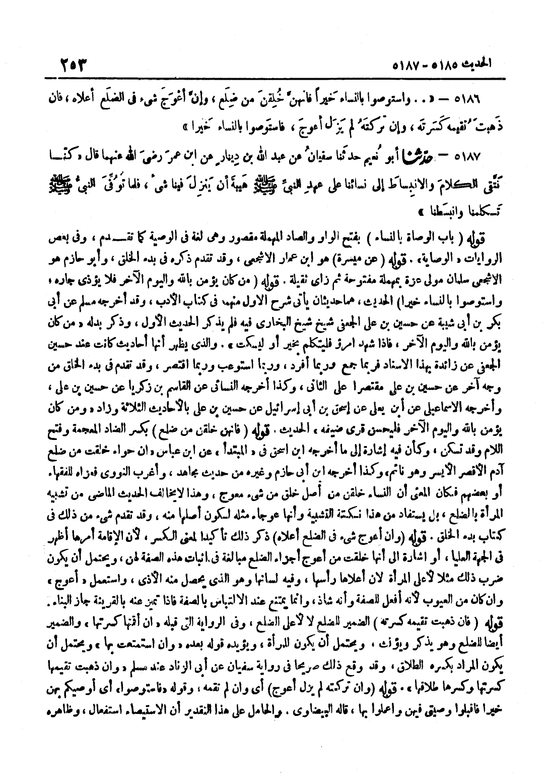 [5185] قَوْلُهُ عَنْ ميسرَة هُوَ بن عَمَّارٍ الْأَشْجَعِيُّ وَقَدْ تَقَدَّمَ ذِكْرُهُ فِي بَدْءِ الْخَلْقِ وَأَبُو حَازِمٍ هُوَ الْأَشْجَعِيُّ سَلْمَانُ مَوْلَى عَزَّةَ بِمُهْمَلَةٍ مَفْتُوحَةٍ ثُمَّ زَايٍ ثَقِيلَةٍ قَوْلُهُ مَنْ كَانَ يُؤْمِنُ بِاللَّهِ وَالْيَوْمِ الْآخِرِ فَلَا يُؤْذِي جَارَهُ وَاسْتَوْصُوا بِالنِّسَاءِ خَيْرًا الْحَدِيثَ هُمَا حَدِيثَانِ يَأْتِي شَرْحُ الْأَوَّلِ مِنْهُمَا فِي كِتَابِ الْأَدَبِ وقداخرجه مُسْلِمٌ عَنْ أَبِي بَكْرِ بْنِ أَبِي شَيْبَةَ عَنْ حُسَيْنِ بْنِ عَلِيٍّ الْجُعْفِيِّ شَيْخِ شَيْخِ الْبُخَارِيِّ فِيهِ فَلَمْ يَذْكُرِ الْحَدِيثَ الْأَوَّلَ وَذَكَرَ بَدَلَهُ مَنْ كَانَ يُؤْمِنُ بِاللَّهِ وَالْيَوْمِ الْآخِرِ فَإِذَا شَهِدَ امْرُؤٌ فَلْيَتَكَلَّمْ بِخَيْرٍ أَوْ لِيَسْكُتْ وَالَّذِي يَظْهَرُ أَنَّهَا أَحَادِيثُ كَانَتْ عِنْدَ حُسَيْنٍ الْجُعْفِيِّ عَنْ زَائِدَةَ بِهَذَا الْإِسْنَادِ فَرُبَّمَا جَمَعَ وَرُبَّمَا أَفْرَدَ وَرُبَّمَا اسْتَوْعَبَ وَرُبَّمَا اقْتَصَرَ وَقَدْ تَقَدَّمَ فِي بَدْءِ الْخَلْقِ مِنْ وَجْهٍ آخَرَ عَنْ حُسَيْنِ بْنِ عَلِيٍّ مُقْتَصِرًا عَلَى الثَّانِي وَكَذَا أَخْرَجَهُ النَّسَائِيُّ عَنِ الْقَاسِمِ بْنِ زَكَرِيَّا عَنْ حُسَيْنِ بْنِ عَلِيٍّ وَأَخْرَجَهُ الْإِسْمَاعِيلِيُّ عَنِ بن يَعْلَى عَنْ إِسْحَاقَ بْنِ أَبِي إِسْرَائِيلَ عَنْ حُسَيْنِ بْنِ عَلِيٍّ بِالْأَحَادِيثِ الثَّلَاثَةِ وَزَادَ وَمَنْ كَانَ يُؤْمِنُ بِاللَّهِ وَالْيَوْمِ الْآخِرِ فَلْيُحْسِنْ قِرَى ضَيْفِهِ الْحَدِيثَ قَوْلُهُ فَإِنَّهُنَّ خُلِقْنَ مِنْ ضِلَعٍ بِكَسْر الضَّاد الْمُعْجَمَة وَفَتْحِ اللَّامِ وَقَدْ تُسَكَّنُ وَكَأَنَّ فِيهِ إِشَارَةً إِلَى مَا أخرجه بن إِسْحَاق فِي الْمُبْتَدَأ عَن بن عَبَّاسٍ إِنَّ حَوَّاءَ خُلِقَتْ مِنْ ضِلْعِ آدَمَ الاقصر الْأَيْسَر وَهُوَ نَائِم وَكَذَا أخرجه بن أَبِي حَازِمٍ وَغَيْرُهُ مِنْ حَدِيثِ مُجَاهِدٍ وَأَغْرَبَ النَّوَوِيُّ فَعَزَاهُ لِلْفُقَهَاءِ أَوْ بَعْضِهِمْ فَكَانَ الْمَعْنَى أَنَّ النِّسَاءَ خُلِقْنَ مِنْ أَصْلٍ خُلِقَ مِنْ شَيْءٍ مُعْوَجٍّ وَهَذَا لَا يُخَالِفُ الْحَدِيثَ الْمَاضِيَ مِنْ تَشْبِيهِ الْمَرْأَةِ بِالضِّلْعِ بَلْ يُسْتَفَادُ مِنْ هَذَا نُكْتَةُ التَّشْبِيهِ وَأَنَّهَا عَوْجَاءُ مِثْلُهُ لِكَوْنِ أَصْلِهَا مِنْهُ وَقَدْ تَقَدَّمَ شَيْءٌ مِنْ ذَلِكَ فِي كِتَابِ بَدْءِ الْخَلْقِ قَوْلُهُ وَإِنَّ أَعْوَجَ شَيْءٍ فِي الضِّلَعِ أَعْلَاهُ ذَكَرَ ذَلِكَ تَأْكِيدًا لِمَعْنَى الْكَسْرِ لِأَنَّ الْإِقَامَةَ أَمْرُهَا أَظْهَرُ فِي الْجِهَةِ الْعُلْيَا أَوْ إِشَارَةً إِلَى أَنَّهَا خُلِقَتْ مِنْ أَعْوَجِ أَجْزَاءِ الضِّلْعِ مُبَالَغَةً فِي إِثْبَاتِ هَذِهِ الصِّفَةِ لَهُنَّ وَيَحْتَمِلُ أَنْ يَكُونَ ضَرَبَ ذَلِكَ مَثَلًا لِأَعْلَى الْمَرْأَةِ لِأَنَّ أَعْلَاهَا رَأْسُهَا وَفِيهِ لِسَانُهَا وَهُوَ الَّذِي يَحْصُلُ مِنْهُ الْأَذَى وَاسْتَعْمَلَ أَعْوَجَ وَإِنْ كَانَ مِنَ الْعُيُوبِ لِأَنَّهُ أَفْعَلَ لِلصِّفَةِ وَأَنَّهُ شَاذٌّ وَإِنَّمَا يَمْتَنِعُ عِنْدَ الِالْتِبَاسِ بِالصِّفَةِ فَإِذَا تَمَيَّزَ عَنْهُ بِالْقَرِينَةِ جَازَ الْبِنَاءُ قَوْلُهُ فَإِنْ ذَهَبْتَ تُقِيمُهُ كَسَرْتَهُ الضَّمِيرُ لِلضِّلْعِ لَا لِأَعْلَى الضِّلْعِ وَفِي الرِّوَايَةِ الَّتِي قَبْلَهُ إِنْ أَقَمْتَهَا كَسَرْتَهَا وَالضَّمِيرُ أَيْضًا لِلضِّلْعِ وَهُوَ يُذَكَّرُ وَيُؤَنَّثُ وَيَحْتَمِلُ أَنْ يَكُونَ لِلْمَرْأَةِ وَيُؤَيِّدُهُ قَوْلُهُ بَعْدَهُ وَإِنِ اسْتَمْتَعْتَ بِهَا وَيَحْتَمِلُ أَنْ يَكُونَ الْمُرَادُ بِكَسْرِهِ الطَّلَاقَ وَقَدْ وَقَعَ ذَلِكَ صَرِيحًا فِي رِوَايَةِ سُفْيَانَ ع