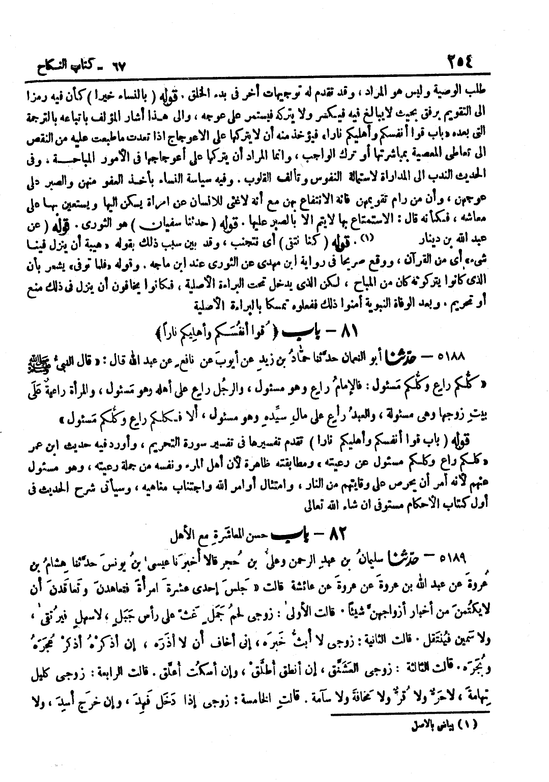 تَقَدَّمَ تَفْسِيرُهَا فِي تَفْسِيرِ سُورَةِ التَّحْرِيمِ وَأَوْرَدَ فِيهِ حَدِيث بن عمر كلكُمْ رَاع وكلكم مسؤول عَنْ رَعِيَّتِهِ وَمُطَابَقَتُهُ ظَاهِرَةٌ لِأَنَّ أَهْلَ الْمَرْءِ وَنَفسه من جملَة رَعيته وَهُوَ مسؤول عَنْهُمْ لِأَنَّهُ أُمِرَ أَنْ يَحْرِصَ عَلَى وِقَايَتِهِمْ مِنَ النَّارِ وَامْتِثَالِ أَوَامِرِ اللَّهِ وَاجْتِنَابِ مَنَاهِيهِ وَسَيَأْتِي شَرْحُ الْحَدِيثِ فِي أَوَّلِ كِتَابِ الْأَحْكَامِ مُسْتَوْفًى إِنْ شَاءَ اللَّهُ تَعَالَى