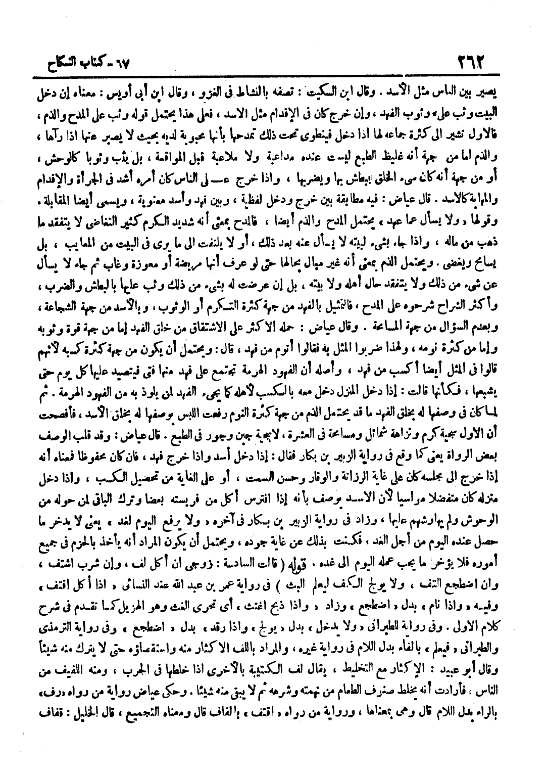 يصير بَين النَّاس مثل الْأسد وَقَالَ بن السّكيت تصفه بالنشاط فِي الْغَزْو وَقَالَ بن أَبِي أُوَيْسٍ مَعْنَاهُ إِنْ دَخَلَ الْبَيْتَ وَثْبَ عَلَيَّ وُثُوبِ الْفَهْدِ وَإِنْ خَرَجَ كَانَ فِي الْإِقْدَامِ مِثْلَ الْأَسَدِ فَعَلَى هَذَا يَحْتَمِلُ قَوْلُهُ وَثَبَ عَلَى الْمَدْحِ وَالذَّمِّ فَالْأَوَّلُ تُشِيرُ إِلَى كَثْرَةِ جِمَاعِهِ لَهَا إِذَا دَخَلَ فَيَنْطَوِي تَحْتَ ذَلِكَ تَمَدُّحُهَا بِأَنَّهَا مَحْبُوبَةٌ لَدَيْهِ بِحَيْثُ لَا يصير عَنْهَا إِذَا رَآهَا وَالذَّمُّ إِمَّا مِنْ جِهَةِ أَنَّهُ غَلِيظُ الطَّبْعِ لَيْسَتْ عِنْدَهُ مُدَاعَبَةٌ وَلَا ملاعبة قبل المواقعة بل يثبت وَثَوْبًا كَالْوَحْشِ أَوْ مِنْ جِهَةِ أَنَّهُ كَانَ سيء الْخُلُقِ يَبْطِشُ بِهَا وَيَضْرِبُهَا وَإِذَا خَرَجَ عَلَى النَّاسِ كَانَ أَمْرُهُ أَشَدَّ فِي الْجَرْأَةِ وَالْإِقْدَامِ وَالْمَهَابَةِ كَالْأَسَدِ قَالَ عِيَاضٌ فِيهِ مُطَابَقَةٌ بَيْنَ خَرَجَ وَدَخَلَ لَفْظِيَّةٌ وَبَيْنَ فَهِدَ وَأَسِدَ مَعْنَوِيَّةٌ وَيُسَمَّى أَيْضًا الْمُقَابَلَةَ وَقَوْلُهَا وَلَا يَسْأَلُ عَمَّا عَهِدَ يَحْتَمِلُ الْمَدْحَ وَالذَّمَّ أَيْضًا فَالْمَدْحُ بِمَعْنَى أَنَّهُ شَدِيدُ الْكَرَمِ كَثِيرُ التَّغَاضِي لَا يَتَفَقَّدُ مَا ذَهَبَ مِنْ مَالِهِ وَإِذَا جَاءَ بِشَيْءٍ لِبَيْتِهِ لَا يَسْأَلُ عَنْهُ بَعْدَ ذَلِكَ أَوْ لَا يَلْتَفِتُ إِلَى مَا يَرَى فِي الْبَيْتِ مِنَ الْمَعَايِبِ بَلْ يُسَامِحُ وَيُغْضِي وَيَحْتَمِلُ الذَّمَّ بِمَعْنَى أَنَّهُ غَيْرُ مُبَالٍ بِحَالِهَا حَتَّى لَوْ عَرَفَ أَنَّهَا مَرِيضَةٌ أَوْ مُعْوَزَّةٌ وَغَابَ ثُمَّ جَاءَ لَا يَسْأَلُ عَنْ شَيْءٍ مِنْ ذَلِكَ وَلَا يَتَفَقَّدُ حَالَ أَهْلِهِ وَلَا بَيْتِهِ بَلْ إِنْ عَرَضَتْ لَهُ بِشَيْءٍ مِنْ ذَلِكَ وَثَبَ عَلَيْهَا بِالْبَطْشِ وَالضَّرْبِ وَأَكْثَرُ الشُّرَّاحِ شَرَحُوهُ عَلَى الْمَدْحِ فَالتَّمْثِيلُ بِالْفَهْدِ مِنْ جِهَةِ كَثْرَةِ التَّكَرُّمِ أَوِ الْوُثُوبِ وَبِالْأَسَدِ مِنْ جِهَةِ الشَّجَاعَةِ وَبِعَدَمِ السُّؤَالِ مِنْ جِهَةِ الْمُسَامَحَةِ وَقَالَ عِيَاضٌ حَمَلَهُ الْأَكْثَرُ عَلَى الِاشْتِقَاقِ مِنْ خُلُقِ الْفَهْدِ إِمَّا مِنْ جِهَةِ قُوَّةِ وُثُوبِهِ وَإِمَّا مِنْ كَثْرَةِ نَوْمِهِ وَلِهَذَا ضَرَبُوا الْمَثَلَ بِهِ فَقَالُوا أَنْوَمُ مِنْ فَهْدٍ قَالَ وَيُحْتَمَلُ أَنْ يَكُونَ مِنْ جِهَةِ كَثْرَةِ كَسْبِهِ لِأَنَّهُمْ قَالُوا فِي الْمَثَلِ أَيْضًا أَكْسَبُ مِنْ فَهْدٍ وَأَصْلُهُ أَنَّ الْفُهُودَ الْهَرِمَةَ تَجْتَمِعُ عَلَى فَهْدٍ مِنْهَا فَتِيٍّ فَيَتَصَيَّدُ عَلَيْهَا كُلَّ يَوْمٍ حَتَّى يُشْبِعَهَا فَكَأَنَّهَا قَالَتْ إِذَا دَخَلَ الْمَنْزِلَ دَخَلَ مَعَهُ بِالْكَسْبِ لِأَهْلِهِ كَمَا يَجِيءُ الْفَهْدُ لِمَنْ يَلُوذُ بِهِ مِنَ الْفُهُودِ الْهَرِمَةِ ثُمَّ لَمَّا كَانَ فِي وَصْفِهَا لَهُ بِخُلُقِ الْفَهْدِ مَا قَدْ يَحْتَمِلُ الذَّمَّ مِنْ جِهَةِ كَثْرَةِ النَّوْمِ رَفَعَتِ اللَّبْسَ بِوَصْفِهَا لَهُ بِخُلُقِ الْأَسَدِ فَأَفْصَحَتْ أَنَّ الْأَوَّلَ سَجِيَّةُ كَرَمٍ وَنَزَاهَةُ شَمَائِلَ وَمُسَامَحَةٌ فِي الْعِشْرَةِ لَا سجية جبن وجور فِي الطَّبْعِ قَالَ عِيَاضٌ وَقَدْ قَلَبَ الْوَصْفَ بَعْضُ الرُّوَاةِ يَعْنِي كَمَا وَقَعَ فِي رِوَايَةِ الزُّبَيْرِ بْنِ بَكَّارٍ فَقَالَ إِذَا دَخَلَ أَسِدَ وَإِذَا خَرَجَ فَهِدَ فَإِنْ كَانَ مَحْفُوظًا فَمَعْنَاهُ أَنَّهُ إِذَا خَرَجَ إِلَى مَجْلِسِهِ كَانَ عَلَى غَايَةِ الرَّزَانَةِ وَالْوَقَارِ وَحُسْنِ السَّمْتِ أَوْ عَلَى الْغَايَةِ مِنْ تَحْصِيلِ الْكَسْبِ وَإِذَا دَخَلَ مَنْزِلَهُ كَانَ مُتَفَضِّلًا مُوَاسِيًا لِأَنَّ الْأَسَدَ يُوصَفُ بِأَنَّهُ إِذَا افْتَر
