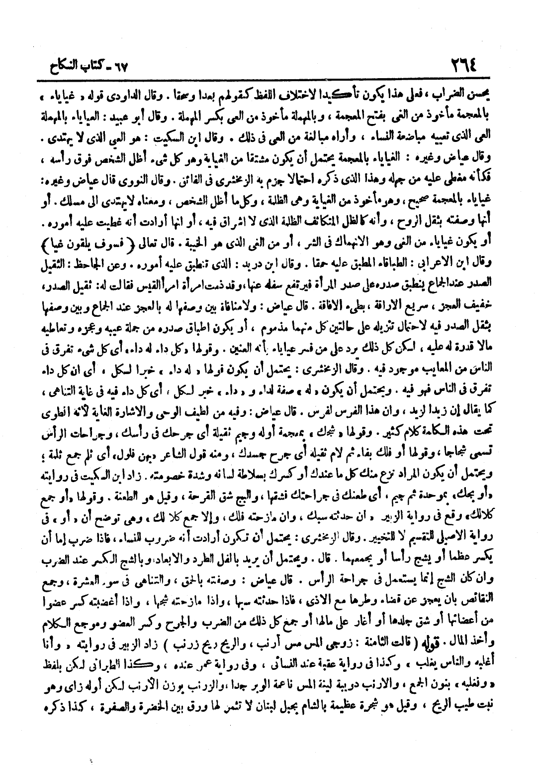 يُحْسِنُ الضِّرَابَ فَعَلَى هَذَا يَكُونُ تَأْكِيدًا لِاخْتِلَافِ اللَّفْظِ كَقَوْلِهِمْ بُعْدًا وَسُحْقًا وَقَالَ الدَّاوُدِيُّ قَوْلُهُ غَيَايَاءُ بِالْمُعْجَمَةِ مَأْخُوذٌ مِنَ الْغَيِّ بِفَتْحِ الْمُعْجَمَةِ وَبِالْمُهْمَلَةِ مَأْخُوذٌ مِنَ الْعِيِّ بِكَسْرِ الْمُهْمَلَةِ وَقَالَ أَبُو عبيد العياياء بِالْمُهْمَلَةِ العي الَّذِي تعيبه مُبَاضَعَةُ النِّسَاءِ وَأَرَاهُ مُبَالَغَةً مِنَ الْعِيِّ فِي ذَلِك وَقَالَ بن السّكيت هُوَ العي الَّذِي لَا يَهْتَدِي وَقَالَ عِيَاضٌ وَغَيْرُهُ الْغَيَايَاءُ بِالْمُعْجَمَةِ يُحْتَمَلُ أَنْ يَكُونَ مُشْتَقًّا مِنَ الْغَيَايَةِ وَهُوَ كُلُّ شَيْءٍ أَظَلَّ الشَّخْصَ فَوْقَ رَأْسِهِ فَكَأَنَّهُ مُغَطًّى عَلَيْهِ مِنْ جَهْلِهِ وَهَذَا الَّذِي ذَكَرَهُ احْتِمَالًا جَزَمَ بِهِ الزَّمَخْشَرِيُّ فِي الْفَائِقِ وَقَالَ النَّوَوِيُّ قَالَ عِيَاضٌ وَغَيْرُهُ غَيَايَاءُ بِالْمُعْجَمَةِ صَحِيح وَهُوَ مَأْخُوذ من الغياية وَهِيَ الظُّلْمَةُ وَكُلُّ مَا أَظَلَّ الشَّخْصَ وَمَعْنَاهُ لَا يَهْتَدِي إِلَى مَسْلَكٍ أَوْ أَنَّهَا وَصَفَتْهُ بِثِقَلِ الرُّوحِ وَأَنَّهُ كَالظِّلِّ الْمُتَكَاثِفِ الظُّلْمَةِ الَّذِي لَا إِشْرَاقَ فِيهِ أَوْ أَنَّهَا أَرَادَتْ أَنَّهُ غُطِّيَتْ عَلَيْهِ أُمُورُهُ أَوْ يَكُونُ غَيَايَاءُ مِنَ الْغَيِّ وَهُوَ الِانْهِمَاكُ فِي الشَّرِّ أَوْ مِنَ الْغَيِّ الَّذِي هُوَ الْخَيْبَةُ قَالَ تَعَالَى فَسَوْفَ يلقون غيا وَقَالَ بن الْأَعرَابِي الطباقاء المطبق عَلَيْهِ حمقا وَقَالَ بن دُرَيْدٍ الَّذِي تَنْطَبِقُ عَلَيْهِ أُمُورُهُ وَعَنِ الْجَاحِظِ الثَّقِيلُ الصَّدْرِ عِنْدَ الْجِمَاعِ يَنْطَبِقُ صَدْرُهُ عَلَى صَدْرِ الْمَرْأَةِ فَيَرْتَفِعُ سُفْلُهُ عَنْهَا وَقَدْ ذَمَّتِ امْرَأَةٌ امْرَأَ الْقَيْسِ فَقَالَتْ لَهُ ثَقِيلُ الصَّدْرِ خَفِيف العجر سَرِيعُ الْإِرَاقَةِ بَطِيءُ الْإِفَاقَةِ قَالَ عِيَاضٌ وَلَا مُنَافَاةَ بَيْنَ وَصْفِهَا لَهُ بِالْعَجْزِ عِنْدَ الْجِمَاعِ وَبَين وصفهَا بثقل الصَّدْرِ فِيهِ لِاحْتِمَالِ تَنْزِيلِهِ عَلَى حَالَتَيْنِ كُلٌّ مِنْهُمَا مَذْمُومٌ أَوْ يَكُونُ إِطْبَاقُ صَدْرِهِ مِنْ جُمْلَةِ عَيْبِهِ وَعَجْزِهِ وَتَعَاطِيهِ مَا لَا قُدْرَةَ لَهُ عَلَيْهِ لَكِنَّ كُلَّ ذَلِكَ يَرُدُّ عَلَى مَنْ فَسَّرَ عَيَايَاءَ بِأَنَّهُ الْعِنِّينُ وَقَوْلُهَا كُلُّ دَاءٍ لَهُ دَاءٌ أَيْ كُلُّ شَيْءٍ تَفَرَّقَ فِي النَّاسِ مِنَ الْمَعَايِبِ مَوْجُودٌ فِيهِ وَقَالَ الزَّمَخْشَرِيُّ يُحْتَمَلُ أَنْ يَكُونَ قَوْلُهَا لَهُ دَاءٌ خَبرا لكل أَيْ أَنَّ كُلَّ دَاءٍ تَفَرَّقَ فِي النَّاسِ فَهُوَ فِيهِ وَيُحْتَمَلُ أَنْ يَكُونَ لَهُ صِفَةً لداء وداء خير لكل أَي كل دَاء فِيهِ فِي غَايَةِ التَّنَاهِي كَمَا يُقَالُ إِنَّ زَيْدًا لَزَيْدٌ وَإِنَّ هَذَا الْفَرَسَ لَفَرَسٌ قَالَ عِيَاضٌ وَفِيه من لطيف الْوَحْي وَالْإِشَارَة الْغَايَة لِأَنَّهُ انْطَوَى تَحْتَ هَذِهِ الْكَلِمَةِ كَلَامٌ كَثِيرٌ وَقَوْلُهَا شَجَّكِ بِمُعْجَمَةٍ أَوَّلَهُ وَجِيمٍ ثَقِيلَةٍ أَيْ جَرَحَكِ فِي رَأْسِكِ وَجِرَاحَاتُ الرَّأْسِ تُسَمَّى شِجَاجًا وَقَوْلُهَا أَوْ فَلَّكِ بِفَاءٍ ثُمَّ لَامٍ ثَقِيلَةٍ أَيْ جَرَحَ جَسَدَكِ وَمِنْهُ قَوْلُ الشَّاعِرِ بِهِنَّ فُلُولٌ أَيْ ثُلَمٌ جَمْعُ ثُلْمَةٍ وَيُحْتَمَلُ أَنْ يَكُونَ الْمُرَادُ نَزَعَ مِنْكِ كُلَّ مَا عِنْدَكِ أَوْ كَسَرَكِ بِسَلَاطَةِ لِسَانِهِ وَشِدَّةِ خُصُومَتِهِ زَادَ بن السِّكِّيتِ فِي رِوَايَتِهِ أَوْ بَجَّكِ بِمُوَحَّدَةٍ ثُمَّ جِيم أَي طعنك فِي جراحتك فشقتها وَالْبَجُّ شَقُّ الْقُرْحَةِ وَقِيلَ هُوَ الطَّعْنَةُ وَقَوْلُهَا أَو جمع كلالك وَقَعَ فِي رِوَايَةِ الزُّبَيْرِ إِنْ 