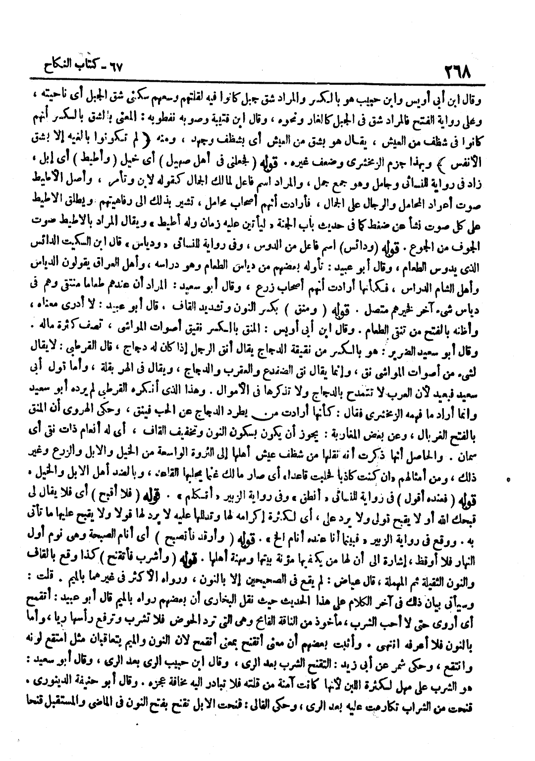 وَقَالَ بن أبي أويس وبن حَبِيبٍ هُوَ بِالْكَسْرِ وَالْمُرَادُ شِقُّ جَبَلٍ كَانُوا فِيهِ لِقِلَّتِهِمْ وَسِعَهُمْ سُكْنَى شِقِّ الْجَبَلِ أَيْ نَاحِيَتِهِ وَعَلَى رِوَايَةِ الْفَتْحِ فَالْمُرَادُ شِقٌّ فِي الْجَبَل كالغار وَنَحْوه وَقَالَ بن قُتَيْبَةِ وَصَوَّبَهُ نِفْطَوَيْهِ الْمَعْنَى بِالشِّقِّ بِالْكَسْرِ أَنَّهُمْ كَانُوا فِي شَظَفٍ مِنَ الْعَيْشِ يُقَالُ هُوَ بِشِقٍّ مِنَ الْعَيْشِ أَيْ بِشَظَفٍ وَجُهْدٍ وَمِنْهُ لم تَكُونُوا بالغيه الا بشق الْأَنْفس وَبِهَذَا جزم الزَّمَخْشَرِيّ وَضعف غَيْرُهُ قَوْلُهُ فَجَعَلَنِي فِي أَهْلِ صَهِيلٍ أَيْ خَيْلٍ وَأَطِيطٍ أَيْ إِبِلٍ زَادَ فِي رِوَايَةٍ النَّسَائِيّ وَجَامِلٍ وَهُوَ جَمْعٌ جَمَلٍ وَالْمُرَادُ اسْمُ فَاعِلٍ لِمَالِكِ الْجَمَالِ كَقَوْلِهِ لَابِنٌ وَتَامِرٌ وَأَصْلُ الْأَطِيطِ صَوْتُ أَعْوَادِ الْمَحَامِلِ وَالرِّجَالِ عَلَى الْجِمَالِ فَأَرَادَتْ أَنَّهُمْ أَصْحَابُ مَحَامِلَ تُشِيرُ بِذَلِكَ إِلَى رَفَاهِيَتِهِمْ وَيُطْلَقُ الْأَطِيطُ عَلَى كُلِّ صَوْتٍ نَشَأَ عَنْ ضغط كَمَا فِي حَدِيث بَاب الْجنَّة ليَأْتِيَن عَلَيْهِ زَمَانٌ وَلَهُ أَطِيطٌ وَيُقَالُ الْمُرَادُ بِالْأَطِيطِ صَوْتُ الْجَوْفِ مِنَ الْجُوعِ قَوْلُهُ وَدَائِسٍ اسْمُ فَاعِلٍ مِنَ الدَّوْسِ وَفِي رِوَايَةٍ لِلنَّسَائِيِّ وَدِيَاسٍ قَالَ بن السِّكِّيتِ الدَّائِسُ الَّذِي يَدُوسُ الطَّعَامَ وَقَالَ أَبُو عُبَيْدٍ تَأَوَّلَهُ بَعْضُهُمْ مِنْ دِيَاسِ الطَّعَامِ وَهُوَ دِرَاسُهُ وَأَهْلُ الْعِرَاقِ يَقُولُونَ الدِّيَاسُ وَأَهْلُ الشَّامِ الدِّرَاسُ فَكَأَنَّهَا أَرَادَتْ أَنَّهُمْ أَصْحَابُ زَرْعٍ وَقَالَ أَبُو سعيد المُرَاد أَن عِنْدهم طَعَاما منتقى وَهُمْ فِي دِيَاسِ شَيْءٍ آخَرَ فَخَيْرُهُمْ مُتَّصِلٌ قَوْلُهُ ومِنَقٍّ بِكَسْرِ النُّونِ وَتَشْدِيدِ الْقَافِ قَالَ أَبُو عُبَيْدٍ لَا أَدْرِي مَعْنَاهُ وَأَظُنُّهُ بِالْفَتْحِ من تنقى الطَّعَام وَقَالَ بن أَبِي أُوَيْسٍ الْمِنَقُّ بِالْكَسْرِ نَقِيقُ أَصْوَاتِ الْمَوَاشِي تصف كَثْرَة مَاله وَقَالَ أَبُو سعيد الضَّرِيرُ هُوَ بِالْكَسْرِ مِنْ نَقِيقَةِ الدَّجَاجِ يُقَالُ أَنَقَّ الرَّجُلُ إِذَا كَانَ لَهُ دَجَاجٌ قَالَ الْقُرْطُبِيُّ لَا يُقَالُ لِشَيْءٍ مِنْ أَصْوَاتِ الْمَوَاشِي نَقٌّ وَإِنَّمَا يُقَالُ نَقَّ الضِّفْدِعُ وَالْعَقْرَبُ وَالدَّجَاجُ وَيُقَالُ فِي الْهِرِّ بِقِلَّةٍ وَأَمَّا قَوْلُ أَبِي سعيد فبعيد لِأَن الْعَرَب لَا تتمدح بالدجاج وَلَا تذكرها فِي الْأَمْوَال وَهَذَا الَّذِي أنكرهُ الْقُرْطُبِيّ لم يردهُ أَبُو سَعِيدٍ وَإِنَّمَا أَرَادَ مَا فَهِمَهُ الزَّمَخْشَرِيُّ فَقَالَ كَأَنَّهَا أَرَادَتْ مَنْ يَطْرُدُ الدَّجَاجَ عَنِ الْحَبِّ فَيَنِقُّ وَحَكَى الْهَرَوِيُّ أَنَّ الْمَنَقَّ بِالْفَتْحِ الْغِرْبَالُ وَعَنْ بَعْضِ الْمَغَارِبَةِ يَجُوزُ أَنْ يَكُونَ بِسُكُونِ النُّونِ وَتَخْفِيفِ الْقَافِ أَيْ لَهُ أَنْعَامٌ ذَاتُ نَقًى أَيْ سِمَانٌ وَالْحَاصِلُ أَنَّهَا ذَكَرَتْ أَنَّهُ نَقَلَهَا مِنْ شَظَفِ عَيْشِ أَهْلِهَا إِلَى الثَّرْوَةِ الْوَاسِعَةِ مِنَ الْخَيْلِ وَالْإِبِلِ والزَرْعِ وَغَيْرِ ذَلِكَ وَمِنْ أَمْثَالِهِمْ إِنْ كُنْتَ كَاذِبًا فَحَلَبْتَ قَاعِدًا أَيْ صَارَ مَالُكَ غَنَمًا يَحْلِبُهَا الْقَاعِدُ وَبِالضِّدِّ أَهُلِ الْإِبِلِ وَالْخَيْلِ قَوْلُهُ فَعِنْدَهُ أَقُولُ فِي رِوَايَة للنسائي أَنْطِقُ وَفِي رِوَايَةِ الزُّبَيْرِ أَتَكَلَّمُ قَوْلُهُ فَلَا أُقَبَّحُ أَيْ فَلَا يُقَالُ لِي قَبَّحَكِ اللَّهُ أَوْ لَا يُقَبَّحُ قَوْلِي وَلَا يَرُدُّ عَلَيَّ أَيْ لِكَثْرَةِ إِكْرَامِهِ لَهَا وَتَدَلُّلِهَا عَلَيْهِ لَا يرد لَهَا قولا وَلَا يُقَبِّحُ عَلَيْهَا 