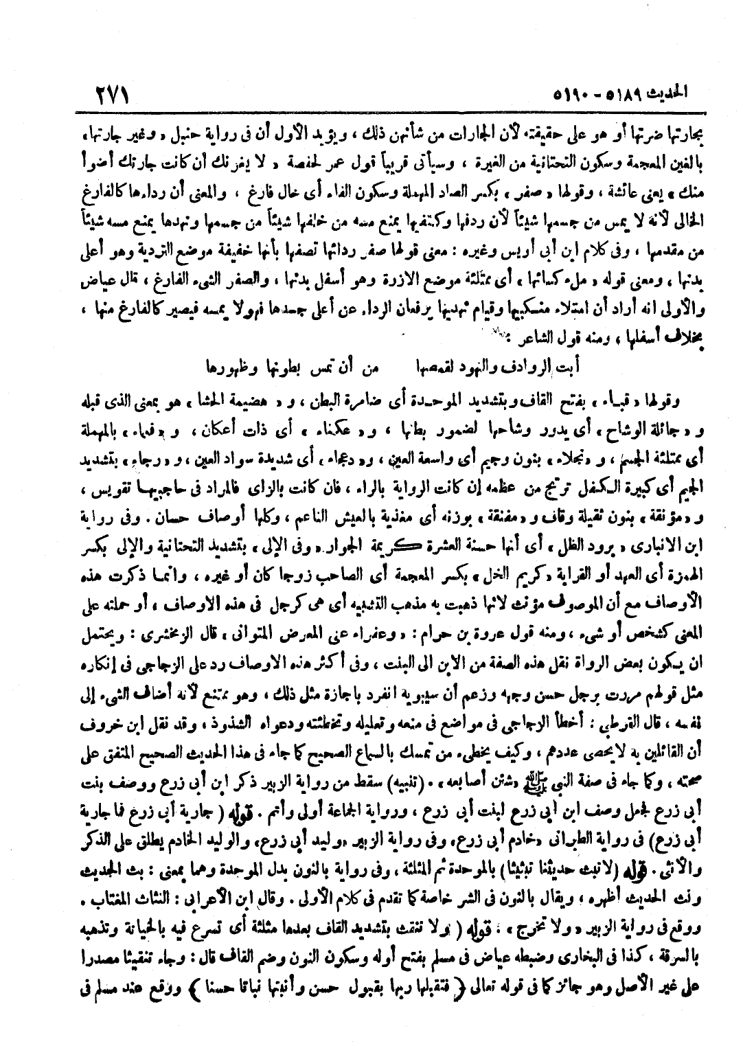 بِجَارَتِهَا ضَرَّتُهَا أَوْ هُوَ عَلَى حَقِيقَتِهِ لِأَنَّ الْجَارَاتِ مِنْ شَأْنِهِنَّ ذَلِكَ وَيُؤَيِّدُ الْأَوَّلَ أَنَّ فِي رِوَايَةِ حَنْبَلٍ وَغَيْرُ جَارَتِهَا بِالْغَيْنِ الْمُعْجَمَةِ وَسُكُونِ التَّحْتَانِيَّةِ مِنَ الْغَيْرَةِ وَسَيَأْتِي قَرِيبًا قَوْلُ عُمَرَ لِحَفْصَةَ لَا يَغُرَّنَّكِ أَنْ كَانَتْ جَارَتُكِ أَضْوَأَ مِنْكِ يَعْنِي عَائِشَةَ وَقَوْلُهَا صِفْرٌ بِكَسْرِ الصَّادِ الْمُهْمَلَةِ وَسُكُونِ الْفَاءِ أَيْ خَالٍ فَارِغٌ وَالْمَعْنَى أَنَّ رِدَاءَهَا كَالْفَارِغِ الْخَالِي لِأَنَّهُ لَا يَمَسُّ مِنْ جِسْمِهَا شَيْئًا لِأَنَّ رَدْفَهَا وَكَتِفَيْهَا يَمنَعُ مَسَّهُ مِنْ خَلْفِهَا شَيْئًا مِنْ جِسْمِهَا وَنَهْدَهَا يَمْنَعُ مَسَّهُ شَيْئًا مِنْ مُقَدَّمِهَا وَفِي كَلَام بن أبي أويس وَغَيره معنى قَوْلهَا صفر ردائها تَصِفُهَا بِأَنَّهَا خَفِيفَةُ مَوْضِعِ التَّرْدِيَةِ وَهُوَ أَعْلَى بَدَنِهَا وَمَعْنَى قَوْلِهِ مِلْءُ كِسَائِهَا أَيْ مُمْتَلِئَةُ مَوْضِعِ الْأَزْرَةِ وَهُوَ أَسْفَلُ بَدَنِهَا وَالصِّفْرُ الشَّيْءُ الْفَارِغُ قَالَ عِيَاضٌ وَالْأَوْلَى أَنَّهُ أَرَادَ أَنَّ امْتِلَاءَ مَنْكِبَيْهَا وَقِيَامَ نَهْدِيهَا يَرْفَعَانِ الرِّدَاءَ عَنْ أَعْلَى جَسَدِهَا فَهُوَ لَا يَمَسُّهُ فَيَصِيرُ كَالْفَارِغِ مِنْهَا بِخِلَافِ أَسْفَلِهَا وَمِنْهُ قَوْلُ الشَّاعِرِ أَبَتِ الرَّوَادِفُ وَالنُّهُودُ لِقُمُصِهَا مِنْ أَنْ تَمَسَّ بُطُونَهَا وَظُهُورَهَا وَقَوْلُهَا قَبَّاءُ بِفَتْحِ الْقَافِ وَبِتَشْدِيدِ الْمُوَحَّدَةِ أَي ضامرة الْبَطن وهضيمة الحسا هُوَ بِمَعْنى الَّذِي قبله وجائلة الوشاح أَي يَدُور وشاحها لضمور بَطنهَا وعكناء أَي ذَات اعكان وفعماء بِالْمُهْمَلَةِ أَي ممتلئة الْجِسْم ونجلاء بنُون وجين أَي وَاسِعَة الْعين ودعجاء أَي شَدِيدَة سَواد الْعين ورجاء بِتَشْدِيدِ الْجِيمِ أَيْ كَبِيرَةُ الْكِفْلِ تَرْتَجُّ مِنْ عَظَمَةٍ إِنْ كَانَتِ الرِّوَايَةُ بِالرَّاءِ فَإِنْ كَانَتْ بالزاي فَالْمُرَاد فِي حاجبيها تقويس ومونقة بنُون ثَقيلَة وقاف ومفنقة بِوَزْنِهِ أَيْ مُغَذَّيَةٌ بِالْعَيْشِ النَّاعِمِ وَكُلُّهَا أَوْصَافٌ حسان وَفِي رِوَايَة بن الْأَنْبَارِيِّ بُرُودُ الظِّلِّ أَيْ أَنَّهَا حَسَنَةُ الْعِشْرَةِ كَرِيمَةُ الْجِوَارِ وَفِيُّ الْإِلَى بِتَشْدِيدِ التَّحْتَانِيَّةِ وَالْإِلَى بِكَسْرِ الْهَمْزَةِ أَيِ الْعَهْدِ أَوِ الْقَرَابَةِ كَرِيمُ الْخِلِّ بِكَسْرِ الْمُعْجَمَةِ أَيِ الصَّاحِبُ زَوْجًا كَانَ أَوْ غَيْرَهُ وَإِنَّمَا ذَكَرَتْ هَذِهِ الْأَوْصَافَ مَعَ أَنَّ الْمَوْصُوفَ مُؤَنَّثٌ لِأَنَّهَا ذَهَبَتْ بِهِ مَذْهَبَ التَّشْبِيهِ أَيْ هِيَ كَرَجُلٍ فِي هَذِهِ الْأَوْصَافِ أَوْ حَمَلَتْهُ عَلَى الْمَعْنَى كَشَخْصٍ أَوْ شَيْءٍ وَمِنْهُ قَوْلُ عُرْوَةَ بْنِ حَرَامٍ وَعَفْرَاءُ عَنِّي الممرض الْمُتَوَانِي قَالَ الزَّمَخْشَرِيُّ وَيُحْتَمَلُ أَنْ يَكُونَ بَعْضُ الرُّوَاةِ نَقَلَ هَذِهِ الصِّفَةَ مِنَ الِابْنِ إِلَى الْبِنْتِ وَفِي أَكْثَرِ هَذِهِ الْأَوْصَافِ رَدٌّ عَلَى الزَّجَّاجِيِّ فِي إِنْكَارِهِ مِثْلَ قَوْلِهِمْ مَرَرْتُ بِرَجُلٍ حَسَنِ وَجْهِهِ وَزَعَمَ أَنَّ سِيبَوَيْهِ انْفَرَدَ بِإِجَازَةِ مِثْلِ ذَلِكَ وَهُوَ مُمْتَنِعٌ لِأَنَّهُ أَضَافَ الشَّيْءَ إِلَى نَفْسِهِ قَالَ الْقُرْطُبِيُّ أَخْطَأَ الزَّجَّاجِيُّ فِي مَوَاضِعَ فِي مَنْعِهِ وَتَعْلِيلِهِ وَتَخْطِئَتِهِ وَدَعْوَاهُ الشُّذُوذَ وَقد نقل بن خَرُوفٍ أَنَّ الْقَائِلِينَ بِهِ لَا يُحْصَى عَدَدُهُمْ وَكَيف يخطىء مَنْ تَمَسَّكَ بِالسَّمَاعِ الصَّحِيحِ كَمَا جَاءَ فِي هَذَا الْحَدِيثِ الصَّحِيحِ الْمُتَّفَقِ عَلَى صِحَّتِهِ وَكَمَا جَاءَ فِي صِفَ