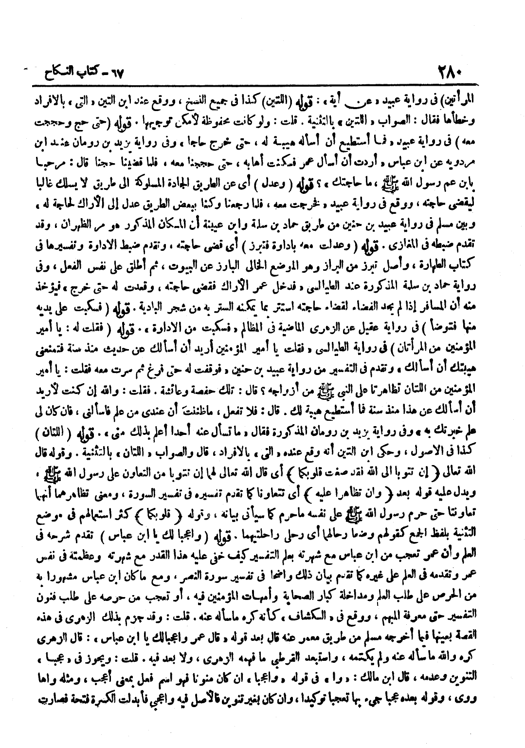 الْمَرْأَتَيْنِ فِي رِوَايَةِ عُبَيْدٍ عَنْ آيَةٍ قَوْلُهُ اللَّتَيْنِ كَذَا فِي جَمِيعِ النُّسَخِ وَوَقَعَ عِنْدَ بن التِّينِ الَّتِي بِالْإِفْرَادِ وَخَطَّأَهَا فَقَالَ الصَّوَابُ اللَّتَيْنِ بِالتَّثْنِيَةِ قُلْتُ وَلَوْ كَانَتْ مَحْفُوظَةً لَأَمْكَنَ تَوْجِيهُهَا قَوْلُهُ حَتَّى حَجَّ وَحَجَجْتُ مَعَهُ فِي رِوَايَةِ عُبَيْدٍ فَمَا أَسْتَطِيعُ أَنْ أَسْأَلَهُ هَيْبَةً لَهُ حَتَّى خَرَجَ حَاجًّا وَفِي رِوَايَةِ يَزِيدَ بْنِ رُومَان عِنْد بن مرْدَوَيْه عَن بن عَبَّاسٍ أَرَدْتُ أَنْ أَسْأَلَ عُمَرَ فَكُنْتُ أَهَابُهُ حَتَّى حَجَجْنَا مَعَهُ فَلَمَّا قَضَيْنَا حَجَّنَا قَالَ مَرْحَبًا بِابْنِ عَمِّ رَسُولِ اللَّهِ صَلَّى اللَّهُ عَلَيْهِ وَسَلَّمَ مَا حَاجَتُكَ قَوْلُهُ وَعَدَلَ أَيْ عَنِ الطَّرِيقِ الْجَادَّةِ الْمَسْلُوكَةِ إِلَى طَرِيقٍ لَا يُسْلَكُ غَالِبًا لِيَقْضِيَ حَاجَتَهُ وَوَقَعَ فِي رِوَايَةِ عُبَيْدٍ فَخَرَجْتُ مَعَهُ فَلَمَّا رَجَعْنَا وَكُنَّا بِبَعْضِ الطَّرِيقِ عَدَلَ إِلَى الْأَرَاكِ لِحَاجَةٍ لَهُ وَبَيَّنَ مُسْلِمٌ فِي رِوَايَةِ عُبَيْدِ بْنِ حُنَيْنٍ مِنْ طَرِيق حَمَّاد بن سَلمَة وبن عُيَيْنَةَ أَنَّ الْمَكَانَ الْمَذْكُورَ هُوَ مَرُّ الظَّهْرَانِ وَقَدْ تَقَدَّمَ ضَبْطُهُ فِي الْمَغَازِي قَوْلُهُ وَعَدَلْتُ مَعَهُ بِإِدَاوَةٍ فَتَبَرَّزَ أَيْ قَضَى حَاجَتَهُ وَتَقَدَّمَ ضَبْطُ الْإِدَاوَةِ وَتَفْسِيرِهَا فِي كِتَابِ الطَّهَارَةِ وَأَصْلُ تَبَرَّزَ مِنَ الْبَرَازِ وَهُوَ الْمَوْضِعُ الْخَالِي الْبَارِزُ عَنِ الْبُيُوتِ ثُمَّ أُطْلِقَ عَلَى نَفْسِ الْفِعْلِ وَفِي رِوَايَةِ حَمَّادِ بْنِ سَلَمَةَ الْمَذْكُورَةِ عِنْدَ الطَّيَالِسِيِّ فَدَخَلَ عُمَرُ الْأَرَاكَ فَقَضَى حَاجَتَهُ وَقَعَدْتُ لَهُ حَتَّى خَرَجَ فَيُؤْخَذُ مِنْهُ أَنَّ الْمُسَافِرَ إِذا لم يَجِدُ الْفَضَاءَ لِقَضَاءِ حَاجَتِهِ اسْتَتَرَ بِمَا يُمْكِنُهُ السِّتْرُ بِهِ مِنْ شَجَرِ الْبَادِيَةِ قَوْلُهُ فَسَكَبْتُ عَلَى يَدَيْهِ مِنْهَا فَتَوَضَّأَ فِي رِوَايَةِ عُقَيْلٍ عَنِ الزُّهْرِيِّ الْمَاضِيَةِ فِي الْمَظَالِمِ فَسَكَبْتُ مِنَ الْإِدَاوَةِ قَوْلُهُ فَقُلْتُ لَهُ يَا أَمِيرَ الْمُؤْمِنِينَ مَنِ الْمَرْأَتَانِ فِي رِوَايَةِ الطَّيَالِسِيِّ فَقُلْتُ يَا أَمِيرَ الْمُؤْمِنِينَ أُرِيدُ أَنْ أَسْأَلَكَ عَنْ حَدِيثٍ مُنْذُ سَنَةٍ فَتَمْنَعُنِي هَيْبَتُكَ أَنْ أَسْأَلَكَ وَتَقَدَّمَ فِي التَّفْسِيرِ مِنْ رِوَايَةِ عُبَيْدِ بْنِ حُنَيْنٍ فَوَقَفْتُ لَهُ حَتَّى فَرَغَ ثُمَّ سِرْتُ مَعَهُ فَقُلْتُ يَا أَمِيرَ الْمُؤْمِنِينَ مَنِ اللَّتَانِ تَظَاهَرَتَا عَلَى النَّبِيِّ صَلَّى اللَّهُ عَلَيْهِ وَسَلَّمَ مِنْ أَزْوَاجِهِ قَالَ تِلْكَ حَفْصَةُ وَعَائِشَةُ فَقُلْتُ وَاللَّهِ إِنْ كُنْتُ لَأُرِيدُ أَنْ أَسْأَلَكَ عَنْ هَذَا مُنْذُ سَنَةٍ فَمَا أَسْتَطِيعُ هَيْبَةً لَكَ قَالَ فَلَا تَفْعَلْ مَا ظَنَنْتَ أَنَّ عِنْدِي مِنْ عِلْمٍ فَاسْأَلْنِي فَإِنْ كَانَ لِي عِلْمٌ خَبَّرْتُكَ بِهِ وَفِي رِوَايَةِ يَزِيدَ بْنِ رُومَانَ الْمَذْكُورَةِ فَقَالَ مَا تَسْأَلُ عَنْهُ أَحَدًا أَعْلَمَ بِذَلِكَ مِنِّي قَوْلُهُ اللَّتَانِ كَذَا فِي الْأُصُولِ وَحَكَى بن التِّينِ أَنَّهُ وَقَعَ عِنْدَهُ الَّتِي بِالْإِفْرَادِ قَالَ وَالصَّوَابُ اللَّتَانِ بِالتَّثْنِيَةِ وَقَوْلُهُ قَالَ اللَّهُ تَعَالَى إِنْ تَتُوبَا إِلَى اللَّهِ فَقَدْ صَغَتْ قُلُوبُكُمَا أَيْ قَالَ اللَّهُ تَعَالَى لَهُمَا إِنْ تَتُوبَا مِنَ التَّعَاوُنِ عَلَى رَسُولِ اللَّهِ صَلَّى اللَّهُ عَلَيْهِ وَسَلَّمَ وَيَدُلُّ عَلَيْهِ قَوْلُهُ بَعْدُ وَإِنْ تظاهرا عَلَيْهِ أَيْ تَتَعَاوَنَا كَمَا تَقَدَّمَ تَفْسِيرُهُ فِي تَفْس