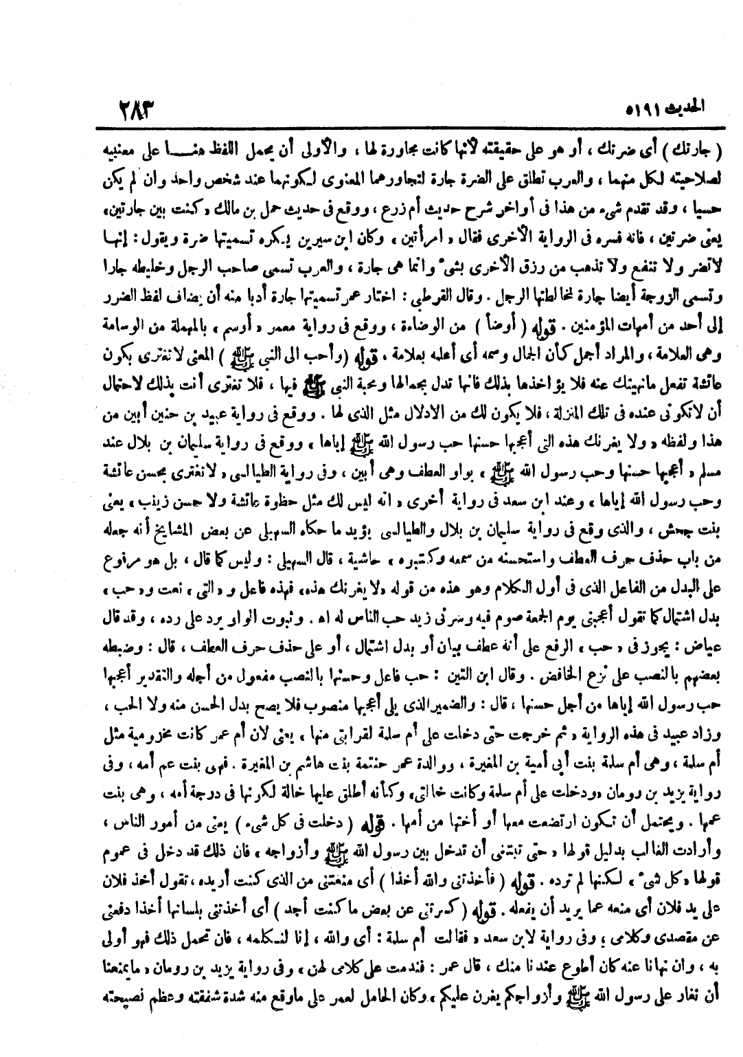 جَارَتُكِ أَيْ ضَرَّتُكِ أَوْ هُوَ عَلَى حَقِيقَتِهِ لِأَنَّهَا كَانَتْ مُجَاوِرَةً لَهَا وَالْأَوْلَى أَنْ يَحْمِلَ اللَّفْظُ هُنَا عَلَى مَعْنَيَيْهِ لِصَلَاحِيَّتِهِ لِكُلٍّ مِنْهُمَا وَالْعَرَبُ تُطْلِقُ عَلَى الضَّرَّةِ جَارَةً لِتَجَاوُرِهِمَا الْمَعْنَوِيِّ لِكَوْنِهِمَا عِنْدَ شَخْصٍ وَاحِدٍ وَإِنْ لَمْ يَكُنْ حِسِّيًّا وَقَدْ تَقَدَّمَ شَيْءٌ مِنْ هَذَا فِي أَوَاخِرِ شَرْحِ حَدِيثِ أُمِّ زَرْعٍ وَوَقَعَ فِي حَدِيثِ حَمَلِ بْنِ مَالِكٍ كُنْتُ بَيْنَ جَارَتَيْنِ يَعْنِي ضَرَّتَيْنِ فَإِنَّهُ فَسَّرَهُ فِي الرِّوَايَةِ الْأُخْرَى فَقَالَ امْرَأتَيْنِ وَكَانَ بن سِيرِينَ يَكْرَهُ تَسْمِيَتَهَا ضَرَّةً وَيَقُولُ إِنَّهَا لَا تَضُرُّ وَلَا تَنْفَعُ وَلَا تَذْهَبُ مِنْ رِزْقِ الْأُخْرَى بِشَيْءٍ وَإِنَّمَا هِيَ جَارَةٌ وَالْعَرَبُ تُسَمِّي صَاحِبَ الرَّجُلِ وَخَلِيطَهُ جَارًا وَتُسَمِّي الزَّوْجَةَ أَيْضًا جَارَةً لِمُخَالَطَتِهَا الرَّجُلَ وَقَالَ الْقُرْطُبِيُّ اخْتَارَ عُمَرُ تَسْمِيَتَهَا جَارَةً أَدَبًا مِنْهُ أَنْ يُضَافَ لَفْظُ الضَّرَرِ إِلَى أَحَدٍ مِنْ أُمَّهَاتِ الْمُؤْمِنِينَ قَوْلُهُ أَوْضَأُ مِنَ الْوَضَاءَةِ وَوَقَعَ فِي رِوَايَةِ مَعْمَرٍ أَوْسَمُ بِالْمُهْمَلَةِ مِنَ الْوَسَامَةِ وَهِيَ الْعَلَامَةُ وَالْمُرَادُ أَجْمَلُ كَأَنَّ الْجَمَالَ وَسَمَهُ أَيْ أَعْلَمَهُ بِعَلَامَةٍ قَوْلُهُ وَأَحَبُّ إِلَى النَّبِيِّ صَلَّى اللَّهُ عَلَيْهِ وَسَلَّمَ الْمَعْنَى لَا تَغْتَرِّي بِكَوْنِ عَائِشَةَ تَفْعَلُ مَا نَهَيْتُكِ عَنْهُ فَلَا يُؤَاخِذُهَا بِذَلِكَ فَإِنَّهَا تَدِلُّ بِجَمَالِهَا وَمَحَبَّةِ النَّبِيِّ صَلَّى اللَّهُ عَلَيْهِ وَسَلَّمَ فِيهَا فَلَا تَغْتَرِّي أَنْتِ بِذَلِكَ لِاحْتِمَالِ أَنْ لَا تَكُونِي عِنْدَهُ فِي تِلْكَ الْمَنْزِلَةِ فَلَا يَكُونُ لَكِ مِنَ الْإِدْلَالِ مِثْلُ الَّذِي لَهَا وَوَقَعَ فِي رِوَايَةِ عُبَيْدِ بْنِ حُنَيْنٍ أَبْيَنُ مِنْ هَذَا وَلَفْظُهُ وَلَا يَغُرَّنَّكِ هَذِهِ الَّتِي أَعْجَبَهَا حُسْنُهَا حِبَّ رَسُولِ اللَّهِ صَلَّى اللَّهُ عَلَيْهِ وَسَلَّمَ إِيَّاهَا وَوَقَعَ فِي رِوَايَةِ سُلَيْمَانَ بْنِ بِلَالٍ عِنْدَ مُسْلِمٍ أَعْجَبَهَا حُسْنُهَا وَحُبُّ رَسُولِ اللَّهِ صَلَّى اللَّهُ عَلَيْهِ وَسَلَّمَ بِوَاوِ الْعَطْفِ وَهِيَ أَبْيَنُ وَفِي رِوَايَةِ الطَّيَالِسِيِّ لَا تَغْتَرِّي بِحُسْنِ عَائِشَةَ وَحُبِّ رَسُولِ اللَّهِ إِيَّاهَا وَعند بن سَعْدٍ فِي رِوَايَةٍ أُخْرَى إِنَّهُ لَيْسَ لَكِ مِثْلُ حُظْوَةِ عَائِشَةَ وَلَا حُسْنُ زَيْنَبَ يَعْنِي بِنْتَ جَحْشٍ وَالَّذِي وَقَعَ فِي رِوَايَةِ سُلَيْمَانَ بْنِ بِلَالٍ وَالطَّيَالِسِيِّ يُؤَيِّدُ مَا حَكَاهُ السُّهَيْلِيُّ عَنْ بَعْضِ الْمَشَايِخِ أَنَّهُ جَعَلَهُ مِنْ بَابِ حَذْفِ حَرْفِ الْعَطْفِ وَاسْتَحْسَنَهُ مَنْ سَمِعَهُ وَكَتَبُوهُ حَاشِيَةً قَالَ السُّهَيْلِيُّ وَلَيْسَ كَمَا قَالَ بَلْ هُوَ مَرْفُوعٌ عَلَى الْبَدَلِ مِنَ الْفَاعِلِ الَّذِي فِي أَوَّلِ الْكَلَامِ وَهُوَ هَذِهِ مِنْ قَوْلِهِ لَا يغرنك هَذِه فَهَذِهِ فَاعل وَالَّتِي نعت وَحب بَدَلُ اشْتِمَالٍ كَمَا تَقُولُ أَعْجَبَنِي يَوْمَ الْجُمُعَةِ صَوْمٌ فِيهِ وَسَرَّنِي زَيْدٌ حُبُّ النَّاسِ لَهُ اه وَثُبُوتُ الْوَاوِ يَرُدُّ عَلَى رَدِّهِ وَقَدْ قَالَ عِيَاضٌ يَجُوزُ فِي حُبِّ الرَّفْعِ عَلَى أَنَّهُ عَطْفُ بَيَانٍ أَوْ بَدَلُ اشْتِمَالٍ أَوْ عَلَى حَذْفِ حَرْفِ الْعَطْفِ قَالَ وَضَبَطَهُ بَعْضُهُمْ بِالنّصب على نزع الْخَافِض وَقَالَ بن التِّينِ حُبٌّ فَاعِلٌ وَحُسْنَهَا بِالنَّصْبِ مَفْعُولٌ مِنْ أَجْلِهِ وَالتَّقْدِيرُ أَعْجَبَهَا حُبُّ رَسُولِ اللَّهِ إِيَّاهَا مِنْ أَجْلِ 