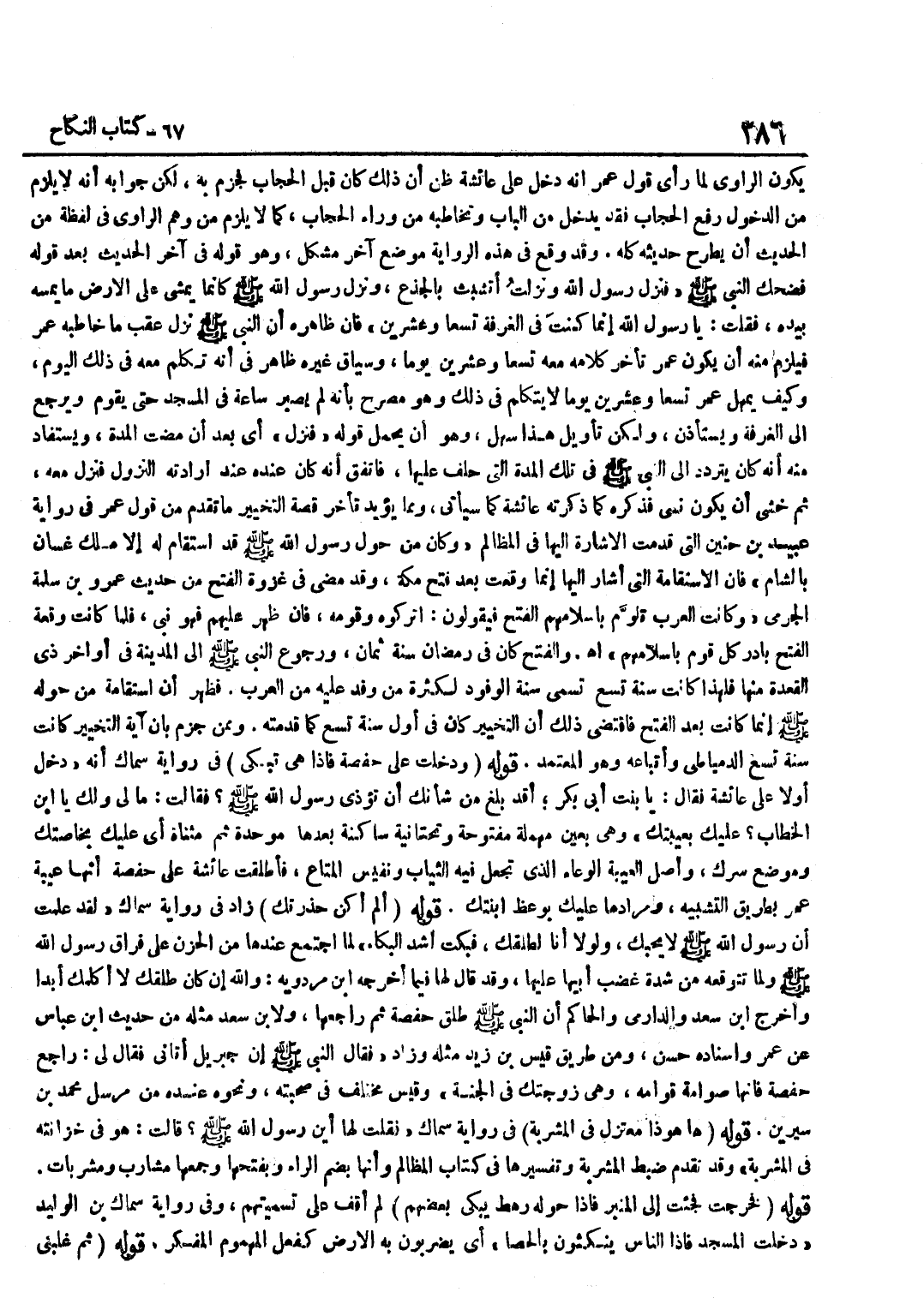 يَكُونَ الرَّاوِي لَمَّا رَأَى قَوْلَ عُمَرَ أَنَّهُ دَخَلَ عَلَى عَائِشَةَ ظَنَّ أَنَّ ذَلِكَ كَانَ قَبْلَ الْحِجَابِ فَجَزَمَ بِهِ لَكِنَّ جَوَابَهُ أَنَّهُ لَا يَلْزَمُ مِنَ الدُّخُولِ رَفْعُ الْحِجَابِ فَقَدْ يدْخل مِنَ الْبَابِ وَتُخَاطِبُهُ مِنْ وَرَاءِ الْحِجَابِ كَمَا لَا يَلْزَمُ مِنْ وَهْمِ الرَّاوِي فِي لَفْظَةٍ مِنَ الْحَدِيثِ أَنْ يُطْرَحَ حَدِيثُهُ كُلُّهُ وَقَدْ وَقَعَ فِي هَذِهِ الرِّوَايَةِ مَوْضِعٌ آخَرُ مُشْكِلٌ وَهُوَ قَوْلُهُ فِي آخِرِ الْحَدِيثِ بَعْدَ قَوْلُهُ فَضَحِكَ النَّبِيُّ صَلَّى اللَّهُ عَلَيْهِ وَسَلَّمَ فَنَزَلَ رَسُولُ اللَّهِ وَنَزَلْتُ أَتَشَبَّثُ بِالْجِذْعِ وَنَزَلَ رَسُولُ اللَّهِ صَلَّى اللَّهُ عَلَيْهِ وَسَلَّمَ كَأَنَّمَا يَمْشِي عَلَى الْأَرْضِ مَا يَمَسُّهُ بِيَدِهِ فَقُلْتُ يَا رَسُولَ اللَّهِ إِنَّمَا كُنْتَ فِي الْغُرْفَةِ تِسْعًا وَعِشْرِينَ فَإِنَّ ظَاهِرُهُ أَنَّ النَّبِيَّ صَلَّى اللَّهُ عَلَيْهِ وَسَلَّمَ نَزَلَ عَقِبَ مَا خَاطَبَهُ عُمَرُ فَيَلْزَمُ مِنْهُ أَنْ يَكُونَ عُمَرُ تَأَخَّرَ كَلَامُهُ مَعَهُ تِسْعًا وَعِشْرِينَ يَوْمًا وَسِيَاقُ غَيْرِهِ ظَاهِرٌ فِي أَنَّهُ تَكَلَّمَ مَعَهُ فِي ذَلِكَ الْيَوْمِ وَكَيْفَ يُمْهِلُ عُمَرَ تِسْعًا وَعِشْرِينَ يَوْمًا لَا يَتَكَلَّمُ فِي ذَلِكَ وَهُوَ مُصَرَّحٌ بِأَنَّهُ لَمْ يَصْبِرْ سَاعَةً فِي الْمَسْجِدِ حَتَّى يَقُومَ وَيَرْجِعَ إِلَى الْغُرْفَةِ وَيَسْتَأْذِنَ وَلَكِنَّ تَأْوِيلَ هَذَا سَهْلٌ وَهُوَ أَنْ يَحْمِلَ قَوْلَهُ فَنَزَلَ أَيْ بَعْدَ أَنْ مَضَتِ الْمُدَّةُ وَيُسْتَفَادُ مِنْهُ أَنَّهُ كَانَ يَتَرَدَّدُ إِلَى النَّبِيِّ صَلَّى اللَّهُ عَلَيْهِ وَسَلَّمَ فِي تِلْكَ الْمُدَّةِ الَّتِي حَلَفَ عَلَيْهَا فَاتَّفَقَ أَنَّهُ كَانَ عِنْدَهٌ عِنْدَ إِرَادَتِهِ النُّزُولَ فَنَزَلَ مَعَهُ ثُمَّ خَشِيَ أَنْ يَكُونَ نَسِيَ فَذَكَّرَهُ كَمَا ذكرته عَائِشَة كَمَا سَيَأْتِي وَمِمَّا يُؤَيِّدُ تَأَخُّرَ قِصَّةِ التَّخْيِيرِ مَا تَقَدَّمَ مِنْ قَوْلِ عُمَرَ فِي رِوَايَةِ عُبَيْدِ بْنِ حُنَيْنٍ الَّتِي قَدَّمْتُ الْإِشَارَةَ إِلَيْهَا فِي الْمَظَالِمِ وَكَانَ مَنْ حَوْلِ رَسُولَ اللَّهِ صَلَّى اللَّهُ عَلَيْهِ وَسَلَّمَ قَدْ اسْتَقَامَ لَهُ إِلَّا مَلِكَ غَسَّانَ بِالشَّامِ فَإِنَّ الِاسْتِقَامَةَ الَّتِي أَشَارَ إِلَيْهَا إِنَّمَا وَقَعَتْ بَعْدَ فَتْحِ مَكَّةَ وَقَدْ مَضَى فِي غَزْوَةِ الْفَتْحِ مِنْ حَدِيثِ عَمْرِو بن سَلمَة الْجرْمِي وَكَانَت الْعَرَب تقوم بِإِسْلَامِهِمُ الْفَتْحَ فَيَقُولُونَ اتْرُكُوهُ وَقَوْمَهُ فَإِنْ ظَهَرَ عَلَيْهِمْ فَهُوَ نَبِيٌّ فَلَمَّا كَانَتْ وَقْعَةُ الْفَتْحِ بَادَرَ كُلُّ قَوْمٍ بِإِسْلَامِهِمْ اه وَالْفَتْحُ كَانَ فِي رَمَضَانَ سَنَةَ ثَمَانٍ وَرُجُوعُ النَّبِيُّ صَلَّى اللَّهُ عَلَيْهِ وَسَلَّمَ إِلَى الْمَدِينَةِ فِي أَوَاخِرِ ذِي الْقَعْدَةِ مِنْهَا فَلِهَذَا كَانَتْ سَنَةُ تِسْعٍ تُسَمَّى سَنَةَ الْوُفُودِ لِكَثْرَةِ مَنْ وَفَدَ عَلَيْهِ مِنَ الْعَرَبِ فَظَهَرَ أَنَّ اسْتِقَامَةَ مَنْ حَوْلَهُ صَلَّى اللَّهُ عَلَيْهِ وَسَلَّمَ إِنَّمَا كَانَتْ بَعْدَ الْفَتْحِ فَاقْتَضَى ذَلِكَ أَنَّ التَّخْيِيرَ كَانَ فِي أَوَّلِ سَنَةِ تِسْعٍ كَمَا قَدَّمْتُهُ وَمِمَّنْ جَزَمَ بِأَنَّ آيَةَ التَّخْيِيرِ كَانَتْ سَنَةَ تِسْعٍ الدِّمْيَاطِيُّ وَأَتْبَاعُهُ وَهُوَ الْمُعْتَمَدُ قَوْلُهُ وَدَخَلْتُ عَلَى حَفْصَةَ فَإِذَا هِيَ تَبْكِي فِي رِوَايَةِ سِمَاكٍ أَنَّهُ دَخَلَ أَوَّلًا عَلَى عَائِشَةَ فَقَالَ يَا بِنْتَ أَبِي بَكْرٍ أَقَدْ بَلَغَ مِنْ شَأْنِكِ أَنْ تُؤْذِي رَسُولِ اللَّهِ صَلَّى اللَّهُ عَلَيْهِ وَسَلَّمَ فَقَالَتْ مَا