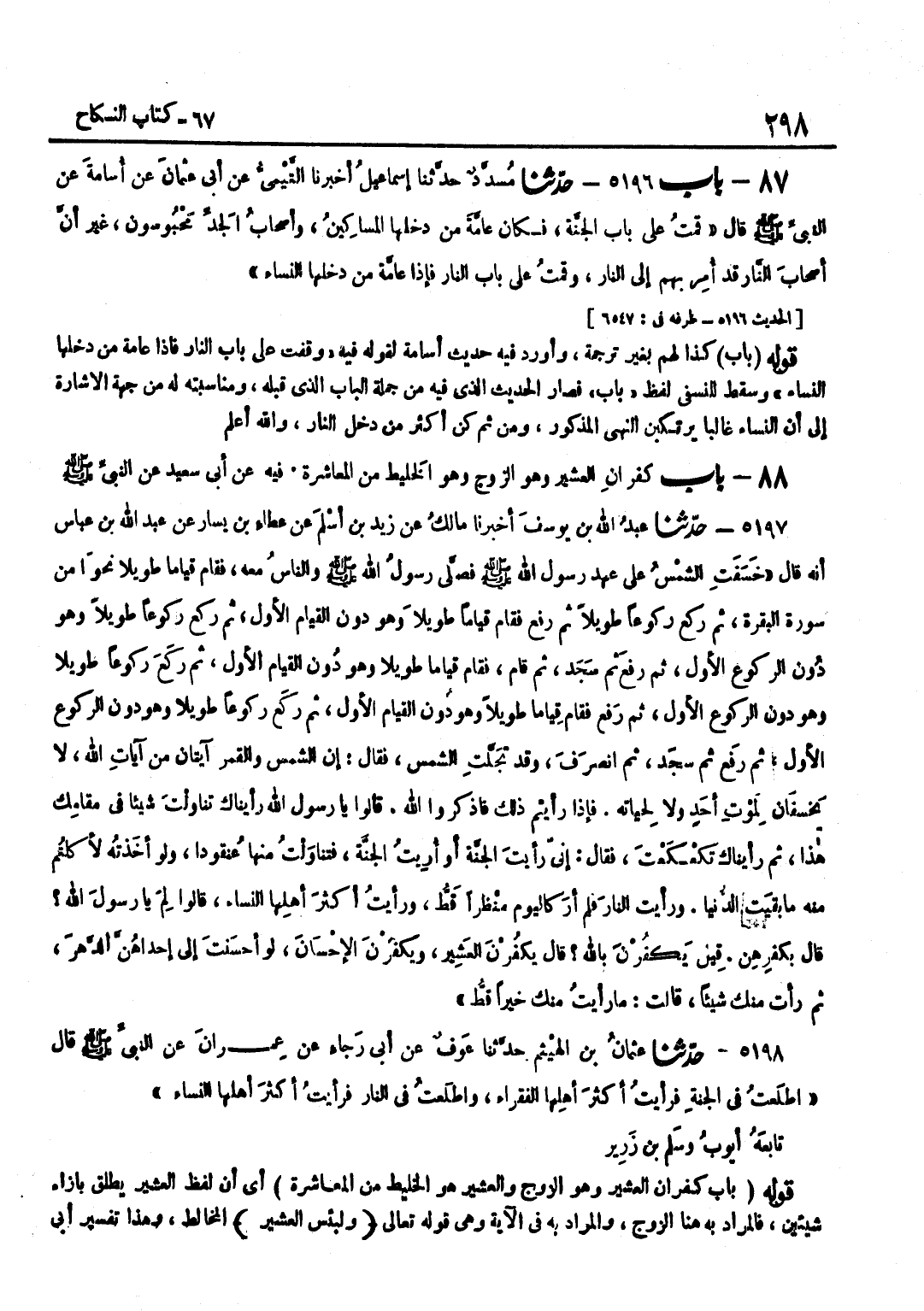 لَهُمْ بِغَيْرِ تَرْجَمَةٍ وَأَوْرَدَ فِيهِ حَدِيثَ أُسَامَةَ لِقَوْلِهِ فِيهِ وَقَفْتُ عَلَى بَابِ النَّارِ فَإِذَا عَامَّةُ مَنْ دَخَلَهَا النِّسَاءُ وَسَقَطَ لِلنَّسَفِيِّ لَفْظُ بَابٌ فَصَارَ الْحَدِيثُ الَّذِي فِيهِ مِنْ جُمْلَةِ الْبَابِ الَّذِي قَبْلَهُ وَمُنَاسَبَتُهُ لَهُ مِنْ جِهَةِ الْإِشَارَةِ إِلَى أَنَّ النِّسَاءَ غَالِبًا يَرْتَكِبْنَ النَّهْيَ الْمَذْكُورَ وَمِنْ ثَمَّ كُنَّ أَكثر من دخل النَّار وَالله أعلم قَوْلُهُ بَابُ كُفْرَانِ الْعَشِيرِ وَهُوَ الزَّوْجُ وَالْعَشِيرُ هُوَ الْخَلِيطُ مِنَ الْمُعَاشَرَةِ أَيْ أَنَّ لَفْظَ الْعَشِيرِ يُطْلَقُ بِإِزَاءِ شَيْئَيْنِ فَالْمُرَادُ بِهِ هُنَا الزَّوْجُ وَالْمُرَادُ بِهِ فِي الْآيَةِ وَهِيَ قَوْلُهُ تَعَالَى ولبئس العشير الْمُخَالِطُ وَهَذَا تَفْسِيرُ أَبِي