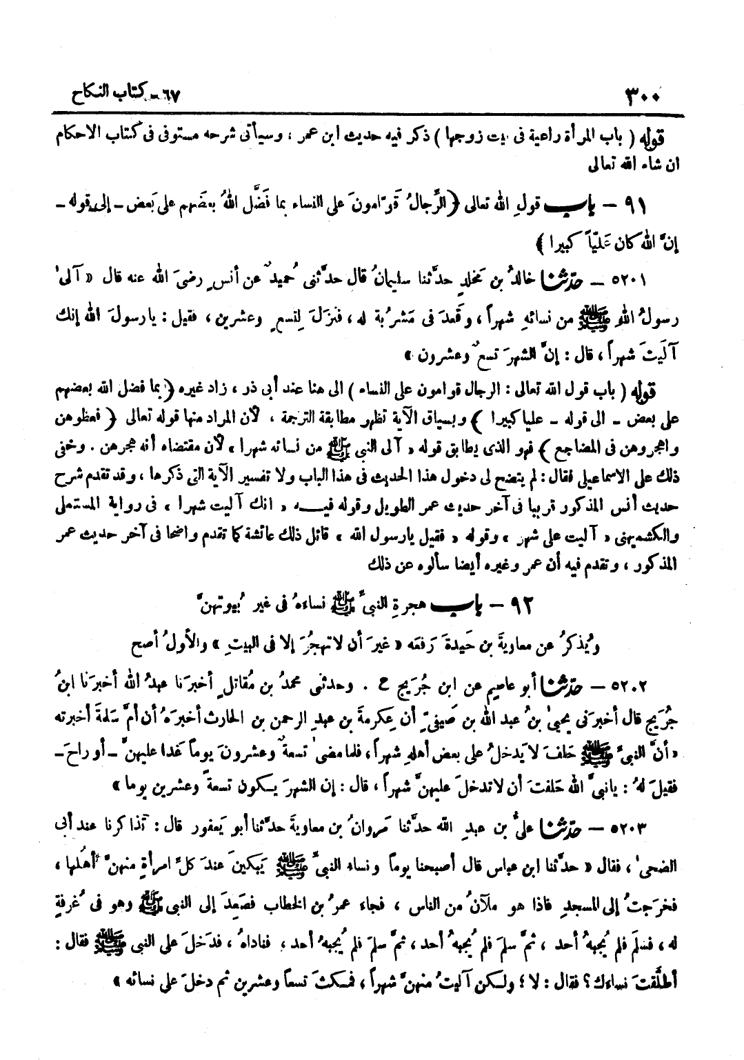 ذكر فِيهِ حَدِيث بن عُمَرَ وَسَيَأْتِي شَرْحُهُ مُسْتَوْفًى فِي كِتَابِ الْأَحْكَامِ إِنْ شَاءَ اللَّهُ تَعَالَى قَوْلُهُ بَابُ قَوْلِ اللَّهِ تَعَالَى الرِّجَالُ قَوَّامُونَ على النِّسَاء إِلَى هُنَا عِنْدَ أَبِي ذَرٍّ زَادَ غَيْرُهُ بِمَا فَضَّلَ اللَّهُ بَعْضَهُمْ عَلَى بَعْضٍ إِلَى قَوْلِهِ عَلِيًّا كَبِيرًا وَبِسِيَاقِ الْآيَةِ تَظْهَرُ مُطَابَقَةُ التَّرْجَمَةِ لِأَنَّ الْمُرَادَ مِنْهَا قَوْلُهُ تَعَالَى فعظوهن واهجروهن فِي الْمضَاجِع فَهُوَ الَّذِي يُطَابِقُ