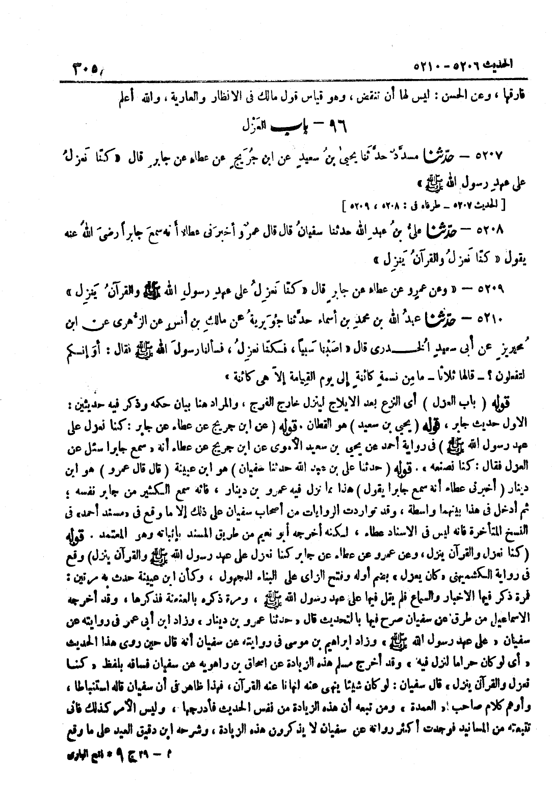 [5207] الْأَوَّلُ حَدِيثُ جَابِرٍ قَوْلُهُ يَحْيَى بْنُ سَعِيدٍ هُوَ الْقَطَّانُ قَوْلُهُ عَنِ بن جُرَيْجٍ عَنْ عَطَاءٍ عَنْ جَابِرٍ كُنَّا نَعْزِلُ عَلَى عَهْدِ رَسُولِ اللَّهِ صَلَّى اللَّهُ عَلَيْهِ وَسَلَّمَ فِي رِوَايَة أَحْمد عَن يحيى بن سعيد الْأمَوِي عَن بن جُرَيْجٍ عَنْ عَطَاءٍ أَنَّهُ سَمِعَ جَابِرًا سُئِلَ عَنِ الْعَزْلِ فَقَالَ كُنَّا نَصْنَعُهُ قَوْلُهُ حَدَّثَنَا عَلِيُّ بْنُ عَبْدِ اللَّهِ حَدَّثَنَا سُفْيَانُ هُوَ بن عُيَيْنَة قَالَ قَالَ عَمْرو هُوَ بن دِينَارٍ أَخْبَرَنِي عَطَاءٌ أَنَّهُ سَمِعَ جَابِرًا يَقُولُ هَذَا مِمَّا نَزَلَ فِيهِ عَمْرُو بْنُ دِينَارٍ فَإِنَّهُ سَمِعَ الْكَثِيرَ مِنْ جَابِرٍ نَفْسِهِ ثُمَّ أَدْخَلَ فِي هَذَا بَيْنَهُمَا وَاسِطَةً وَقَدْ تَوَارَدَتِ الرِّوَايَاتُ مِنْ أَصْحَابِ سُفْيَانَ عَلَى ذَلِكَ إِلَّا مَا وَقَعَ فِي مُسْنَدِ أَحْمَدَ فِي النُّسَخِ الْمُتَأَخِّرَةِ فَإِنَّهُ لَيْسَ فِي الْإِسْنَادِ عَطَاءٌ لَكِنَّهُ أَخْرَجَهُ أَبُو نُعَيْمٍ مِنْ طَرِيقِ الْمُسْنَدِ بِإِثْبَاتِهِ وَهُوَ الْمُعْتَمَدُ قَوْلُهُ كُنَّا نَعْزِلُ وَالْقُرْآنُ يَنْزِلُ وَعَنْ عَمْرٍو عَنْ عَطَاءٍ عَنْ جَابِرٍ كُنَّا نَعْزِلُ عَلَى عَهْدِ رَسُولِ اللَّهِ صَلَّى اللَّهُ عَلَيْهِ وَسَلَّمَ وَالْقُرْآنُ يَنْزِلُ وَقَعَ فِي رِوَايَةِ الْكُشْمِيهَنِيِّ كَانَ يُعْزَلُ بِضَمِّ أَوَّلِهِ وَفَتْحِ الزَّايِ على الْبناء للْمَجْهُول وَكَأن بن عُيَيْنَةَ حَدَّثَ بِهِ مَرَّتَيْنِ فَمَرَّةً ذَكَرَ فِيهَا الْأَخْبَارَ وَالسَّمَاعَ فَلَمْ يَقُلْ فِيهَا عَلَى عَهْدِ رَسُولِ اللَّهِ صَلَّى اللَّهُ عَلَيْهِ وَسَلَّمَ وَمَرَّةً ذَكَرَهُ بِالْعَنْعَنَةِ فَذَكَرَهَا وَقَدْ أَخْرَجَهُ الْإِسْمَاعِيلِيُّ مِنْ طُرُقٍ عَنْ سُفْيَانَ صَرَّحَ فِيهَا بِالتَّحْدِيثِ قَالَ حَدثنَا عَمْرو بن دِينَار وَزَاد بن أَبِي عُمَرَ فِي رِوَايَتِهِ عَنْ سُفْيَانَ عَلَى عَهْدِ رَسُولِ اللَّهِ صَلَّى اللَّهُ عَلَيْهِ وَسَلَّمَ وَزَادَ إِبْرَاهِيمُ بْنُ مُوسَى فِي رِوَايَتِهِ عَنْ سُفْيَانَ أَنَّهُ قَالَ حِينَ رَوَى هَذَا الْحَدِيثَ أَيْ لَوْ كَانَ حَرَامًا لَنَزَلَ فِيهِ وَقَدْ أَخْرَجَ مُسْلِمٌ هَذِهِ الزِّيَادَةَ عَنْ إِسْحَاقِ بْنِ رَاهَوَيْهِ عَنْ سُفْيَانَ فَسَاقَهُ بِلَفْظِ كُنَّا نَعْزِلُ وَالْقُرْآنُ يَنْزِلُ قَالَ سُفْيَانُ لَوْ كَانَ شَيْئًا يَنْهَى عَنْهُ لَنَهَانَا عَنْهُ الْقُرْآنُ فَهَذَا ظَاهِرٌ فِي أَنَّ سُفْيَانَ قَالَهُ اسْتِنْبَاطًا وَأَوْهَمَ كَلَامَ صَاحِبِ الْعُمْدَةِ وَمَنْ تَبِعَهُ أَنَّ هَذِهِ الزِّيَادَةَ مِنْ نَفْسِ الْحَدِيثِ فَأَدْرَجَهَا وَلَيْسَ الْأَمْرُ كَذَلِكَ فَإِنِّي تَتَبَّعْتُهُ مِنَ الْمَسَانِيدِ فَوَجَدْتُ أَكْثَرَ رُوَاتِهِ عَنْ سُفْيَانَ لَا يَذْكُرُونَ هَذِهِ الزِّيَادَةَ وَشَرَحَهُ بن دَقِيقِ الْعِيدِ عَلَى مَا وَقَعَ