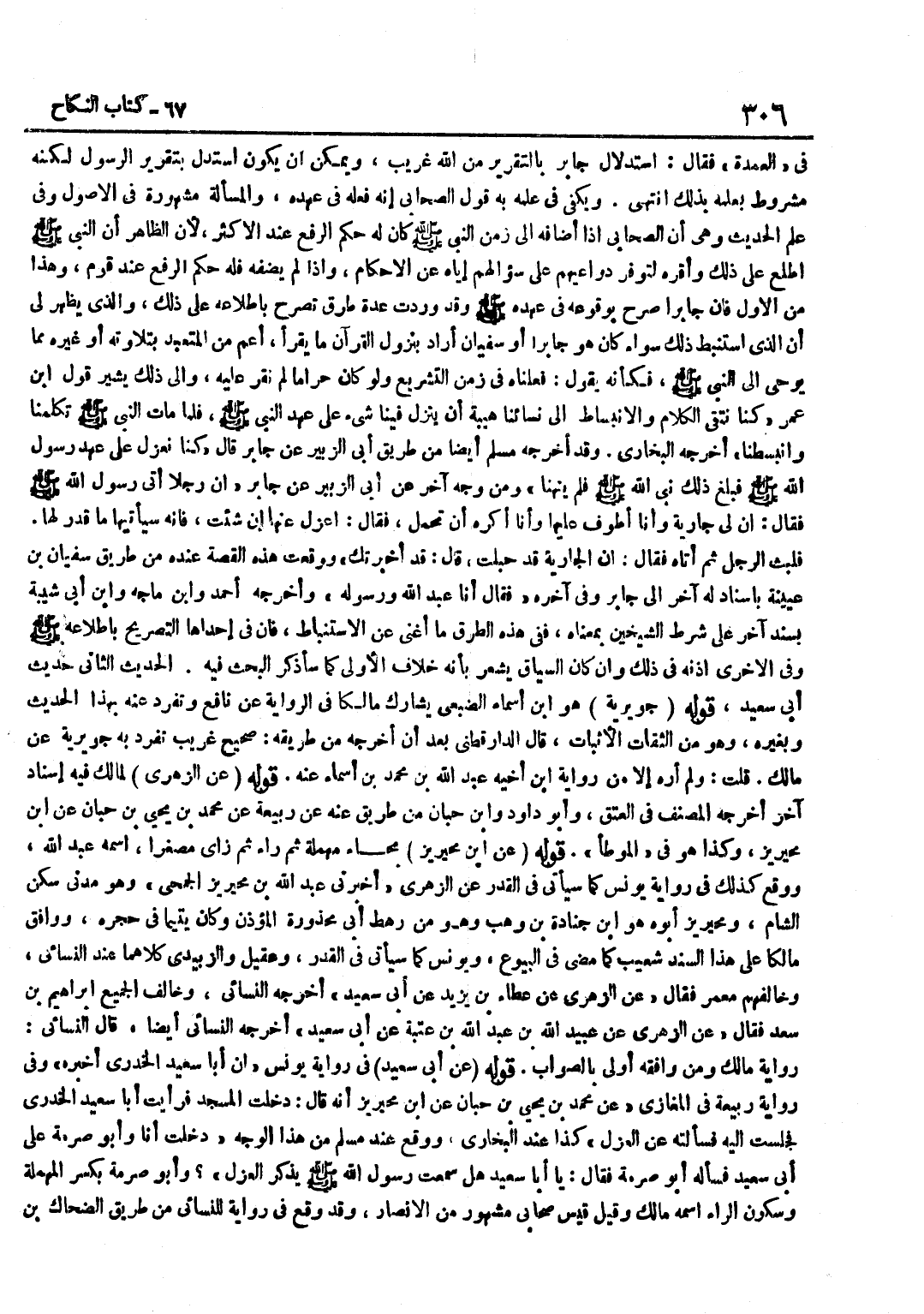 فِي الْعُمْدَةِ فَقَالَ اسْتِدْلَالُ جَابِرٍ بِالتَّقْرِيرِ مِنَ اللَّهِ غَرِيبٌ وَيُمْكِنُ أَنْ يَكُونَ اسْتَدَلَّ بِتَقْرِيرِ الرَّسُولِ لَكِنَّهُ مَشْرُوطٌ بِعِلْمِهِ بِذَلِكَ انْتَهَى وَيَكْفِي فِي عِلْمِهِ بِهِ قَوْلُ الصَّحَابِيِّ إِنَّهُ فَعَلَهُ فِي عَهْدِهِ وَالْمَسْأَلَةُ مَشْهُورَةٌ فِي الْأُصُولِ وَفِي عِلْمِ الْحَدِيثِ وَهِيَ أَنَّ الصَّحَابِيَّ إِذَا أَضَافَهُ إِلَى زَمَنِ النَّبِيِّ صَلَّى اللَّهُ عَلَيْهِ وَسَلَّمَ كَانَ لَهُ حُكْمُ الرَّفْعِ عِنْدَ الْأَكْثَرِ لِأَنَّ الظَّاهِرَ أَنَّ النَّبِيُّ صَلَّى اللَّهُ عَلَيْهِ وَسَلَّمَ اطَّلَعَ عَلَى ذَلِكَ وَأَقَرَّهُ لِتَوَفُّرِ دَوَاعِيهِمْ عَلَى سُؤَالِهِمْ إِيَّاهُ عَنِ الْأَحْكَامِ وَإِذَا لَمْ يُضِفْهُ فَلَهُ حُكْمُ الرَّفْعِ عِنْدَ قَوْمٍ وَهَذَا مِنَ الْأَوَّلِ فَإِنَّ جَابِرًا صَرَّحَ بِوُقُوعِهِ فِي عَهْدِهِ صَلَّى اللَّهُ عَلَيْهِ وَسَلَّمَ وَقَدْ وَرَدَتْ عِدَّةُ طُرُقٍ تُصَرِّحُ بِاطِّلَاعِهِ عَلَى ذَلِكَ وَالَّذِي يَظْهَرُ لِي أَنَّ الَّذِي اسْتَنْبَطَ ذَلِكَ سَوَاءٌ كَانَ هُوَ جَابِرًا أَوْ سُفْيَانَ أَرَادَ بِنُزُولِ الْقُرْآنِ مَا يُقْرَأُ أَعَمُّ مِنَ الْمُتَعَبَّدِ بِتِلَاوَتِهِ أَوْ غَيْرِهِ مِمَّا يُوحَى إِلَى النَّبِيِّ صَلَّى اللَّهُ عَلَيْهِ وَسَلَّمَ فَكَأَنَّهُ يَقُولُ فَعَلْنَاهُ فِي زَمَنِ التَّشْرِيعِ وَلَوْ كَانَ حَرَامًا لَمْ نُقَرَّ عَلَيْهِ وَإِلَى ذَلِك يُشِير قَول بن عُمَرَ كُنَّا نَتَّقِي الْكَلَامَ وَالِانْبِسَاطَ إِلَى نِسَائِنَا هيْبَةً أَنْ يَنْزِلَ فِينَا شَيْءٌ عَلَى عَهْدِ النَّبِيِّ صَلَّى اللَّهُ عَلَيْهِ وَسَلَّمَ فَلَمَّا مَاتَ النَّبِيُّ صَلَّى اللَّهُ عَلَيْهِ وَسَلَّمَ تَكَلَّمْنَا وَانْبَسَطْنَا أَخْرَجَهُ الْبُخَارِيُّ وَقَدْ أَخْرَجَهُ مُسْلِمٌ أَيْضًا مِنْ طَرِيقِ أَبِي الزُّبَيْرِ عَنْ جَابِرٍ قَالَ كُنَّا نَعْزِلُ عَلَى عَهْدِ رَسُولِ اللَّهِ صَلَّى اللَّهُ عَلَيْهِ وَسَلَّمَ فَبَلَغَ ذَلِكَ نَبِيَّ اللَّهِ صَلَّى اللَّهُ عَلَيْهِ وَسَلَّمَ فَلَمْ يَنْهَنَا وَمِنْ وَجْهٍ آخَرَ عَنْ أَبِي الزُّبَيْرِ عَنْ جَابِرٍ أَنَّ رَجُلًا أَتَى رَسُولُ اللَّهِ صَلَّى اللَّهُ عَلَيْهِ وَسَلَّمَ فَقَالَ إِنَّ لِي جَارِيَةً وَأَنَا أَطُوفُ عَلَيْهَا وَأَنَا أَكْرَهُ أَنْ تَحْمِلَ فَقَالَ اعْزِلْ عَنْهَا إِنْ شِئْتَ فَإِنَّهُ سَيَأْتِيهَا مَا قُدِّرَ لَهَا فَلَبِثَ الرَّجُلُ ثُمَّ أَتَاهُ فَقَالَ إِنَّ الْجَارِيَةَ قَدْ حَبِلَتْ قَالَ قَدْ أَخْبَرْتُكَ وَوَقَعَتْ هَذِهِ الْقِصَّةُ عِنْدَهُ مِنْ طَرِيقِ سُفْيَانَ بْنِ عُيَيْنَةَ بِإِسْنَادٍ لَهُ آخَرَ إِلَى جَابِرٍ وَفِي آخِرِهِ فَقَالَ أَنَا عَبْدُ اللَّهِ وَرَسُولُهُ وَأَخْرَجَهُ أَحْمد وبن ماجة وبن أَبِي شَيْبَةَ بِسَنَدٍ آخَرَ عَلَى شَرْطِ الشَّيْخَيْنِ بِمَعْنَاهُ فَفِي هَذِهِ الطُّرُقِ مَا أَغْنَى عَنِ الِاسْتِنْبَاطِ فَإِنَّ فِي إِحْدَاهَا التَّصْرِيحُ بِاطِّلَاعِهِ صَلَّى اللَّهُ عَلَيْهِ وَسَلَّمَ وَفِي الْأُخْرَى إِذْنُهُ فِي ذَلِكَ وَإِنْ كَانَ السِّيَاقُ يُشْعِرُ بِأَنَّهُ خِلَافُ الْأَوْلَى كَمَا سَأَذْكُرُ الْبَحْثَ فِيهِ الْحَدِيثُ الثَّانِي حَدِيث أبي سعيد