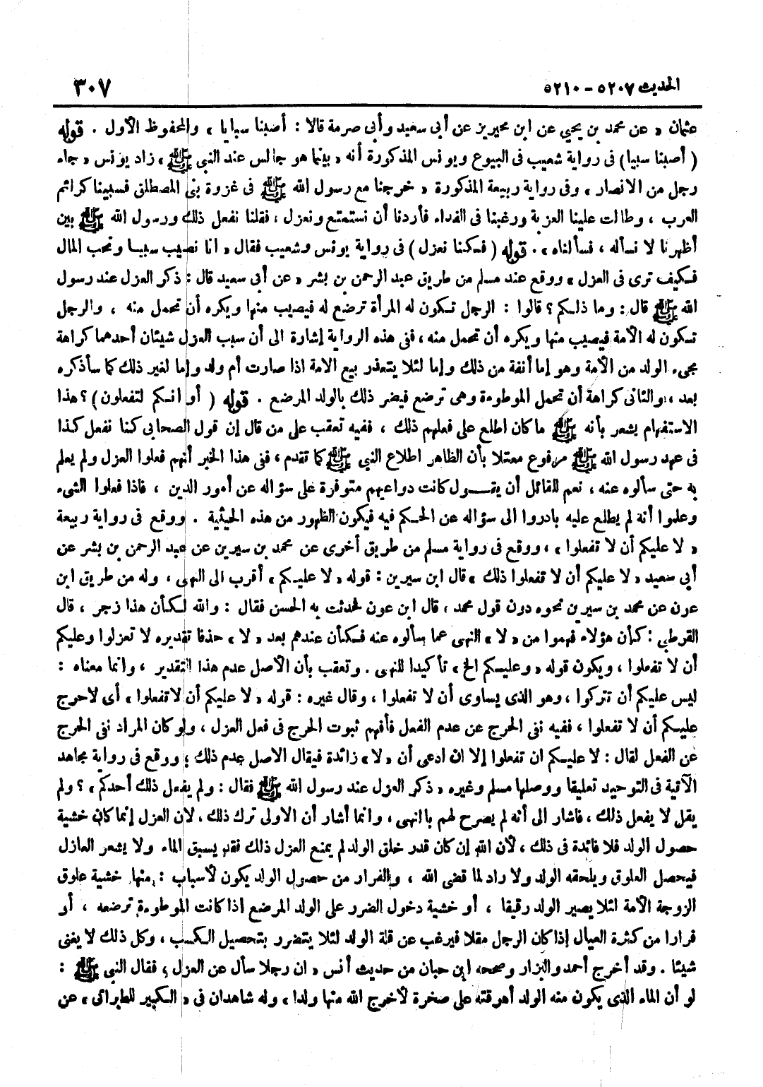 عُثْمَان عَن مُحَمَّد بن يحيى عَن بن مُحَيْرِيزٍ عَنْ أَبِي سَعِيدٍ وَأَبِي صِرْمَةَ قَالَا أَصَبْنَا سَبَايَا وَالْمَحْفُوظُ الْأَوَّلُ قَوْلُهُ أَصَبْنَا سَبْيًا فِي رِوَايَةِ شُعَيْبٍ فِي الْبُيُوعِ وَيُونُسَ الْمَذْكُورَةِ أَنَّهُ بَيْنَمَا هُوَ جَالِسٌ عِنْدَ النَّبِيِّ صَلَّى اللَّهُ عَلَيْهِ وَسَلَّمَ زَادَ يُونُسُ جَاءَ رَجُلٌ مِنَ الْأَنْصَارِ وَفِي رِوَايَةِ رَبِيعَةَ الْمَذْكُورَةِ خَرَجْنَا مَعَ رَسُولِ اللَّهِ صَلَّى اللَّهُ عَلَيْهِ وَسَلَّمَ فِي غَزْوَةِ بَنِي الْمُصْطَلِقِ فَسَبْينَا كَرَائِمَ الْعَرَبِ وَطَالَتْ عَلَيْنَا الْعُزْبَةُ وَرَغِبْنَا فِي الْفِدَاءِ فَأَرَدْنَا أَنْ نَسْتَمْتِعَ وَنَعْزِلَ فَقُلْنَا نَفْعَلُ ذَلِكَ وَرَسُولُ اللَّهِ صَلَّى اللَّهُ عَلَيْهِ وَسَلَّمَ بَيْنَ أَظْهُرِنَا لَا نَسْأَلُهُ فَسَأَلْنَاهُ قَوْلُهُ فَكُنَّا نَعْزِلُ فِي رِوَايَةِ يُونُسَ وَشُعَيْبٍ فَقَالَ إِنَّا نُصِيبُ سَبْيًا وَنُحِبُّ الْمَالَ فَكَيْفَ تَرَى فِي الْعَزْلِ وَوَقَعَ عِنْدَ مُسْلِمٍ مِنْ طَرِيقِ عَبْدِ الرَّحْمَنِ بْنِ بِشْرٍ عَنْ أَبِي سَعِيدٍ قَالَ ذُكِرَ الْعَزْلُ عِنْدَ رَسُولِ اللَّهِ صَلَّى اللَّهُ عَلَيْهِ وَسَلَّمَ قَالَ وَمَا ذَلِكُمْ قَالُوا الرَّجُلُ تَكُونُ لَهُ الْمَرْأَةُ تُرْضِعُ لَهُ فَيُصِيبُ مِنْهَا وَيَكْرَهُ أَنْ تَحْمِلَ مِنْهُ وَالرَّجُلُ تَكُونُ لَهُ الْأَمَةُ فَيُصِيبُ مِنْهَا وَيَكْرَهُ أَنْ تَحْمِلَ مِنْهُ فَفِي هَذِهِ الرِّوَايَةِ إِشَارَةٌ إِلَى أَنَّ سَبَبَ الْعَزْلِ شَيْئَانِ أَحَدُهُمَا كَرَاهَةُ مَجِيءِ الْوَلَدِ مِنَ الْأَمَةِ وَهُوَ إِمَّا أَنَفَةً مِنْ ذَلِكَ وَإِمَّا لِئَلَّا يَتَعَذَّرَ بَيْعُ الْأَمَةِ إِذَا صَارَتْ أُمَّ وَلَدٍ وَإِمَّا لغير ذَلِك كَمَا سأذكره بعد وَالثَّانِي كَرَاهَةَ أَنْ تَحْمِلَ الْمَوْطُوءَةُ وَهِيَ تُرْضِعُ فَيضر ذَلِك بِالْوَلَدِ الْمُرْضع قَوْله أَو إِنَّكُم لَتَفْعَلُونَ هَذَا الِاسْتِفْهَامُ يُشْعِرُ بِأَنَّهُ صَلَّى اللَّهُ عَلَيْهِ وَسَلَّمَ مَا كَانَ اطَّلَعَ عَلَى فِعْلِهِمْ ذَلِكَ فَفِيهِ تَعَقُّبٌ عَلَى مَنْ قَالَ إِنَّ قَوْلَ الصَّحَابِيِّ كُنَّا نَفْعَلُ كَذَا فِي عَهْدِ رَسُولِ اللَّهِ صَلَّى اللَّهُ عَلَيْهِ وَسَلَّمَ مَرْفُوعٌ مُعْتَلًّا بِأَنَّ الظَّاهِرَ اطِّلَاعُ النَّبِيِّ صَلَّى اللَّهُ عَلَيْهِ وَسَلَّمَ كَمَا تَقَدَّمَ فَفِي هَذَا الْخَبَرِ أَنَّهُمْ فَعَلُوا الْعَزْلَ وَلَمْ يَعْلَمْ بِهِ حَتَّى سَأَلُوهُ عَنْهُ نَعَمْ لِلْقَائِلِ أَنْ يَقُولَ كَانَتْ دَوَاعِيهُمْ مُتَوَفِّرَةً عَلَى سُؤَالِهِ عَنْ أُمُورِ الدِّينِ فَإِذَا فَعَلُوا الشَّيْءَ وَعَلِمُوا أَنَّهُ لَمْ يَطَّلِعْ عَلَيْهِ بَادَرُوا إِلَى سُؤَالِهِ عَنِ الْحُكْمِ فِيهِ فَيَكُونُ الظُّهُورُ مِنْ هَذِهِ الْحَيْثِيَّةِ وَوَقَعَ فِي رِوَايَةِ رَبِيعَةَ لَا عَلَيْكُمْ أَنْ لَا تَفْعَلُوا وَوَقَعَ فِي رِوَايَةِ مُسْلِمٍ مِنْ طَرِيقٍ أُخْرَى عَنْ مُحَمَّدِ بْنِ سِيرِينَ عَنْ عَبْدِ الرَّحْمَنِ بْنِ بِشْرٍ عَنْ أَبِي سَعِيدٍ لَا عَلَيْكُمْ أَن لَا تَفعلُوا ذَلِك قَالَ بن سِيرِينَ قَوْلُهُ لَا عَلَيْكُمْ أَقْرَبُ إِلَى النَّهْيِ وَله من طَرِيق بن عَوْنٍ عَنْ مُحَمَّدِ بْنِ سِيرِينَ نَحْوُهُ دُونَ قَول مُحَمَّد قَالَ بن عَوْنٍ فَحَدَّثْتُ بِهِ الْحَسَنَ فَقَالَ وَاللَّهِ لِكَأَنَّ هَذَا زَجْرٌ قَالَ الْقُرْطُبِيُّ كَأَنَّ هَؤُلَاءِ فَهِمُوا مِنْ لَا النَّهْيَ عَمَّا سَأَلُوهُ عَنْهُ فَكَأَنَّ عِنْدَهُمْ بَعْدَ لَا حَذْفًا تَقْدِيرُهُ لَا تَعْزِلُوا وَعَلَيْكُمْ أَنْ لَا تَفْعَلُوا وَيَكُونُ قَوْلُهُ وَعَلَيْكُمْ إِلَخْ تَأْكِيدًا لِلنَّهْيِ وَتُعُقِّبَ بِأَنَّ الْأَصْلَ عَدَمُ هَذَا ا