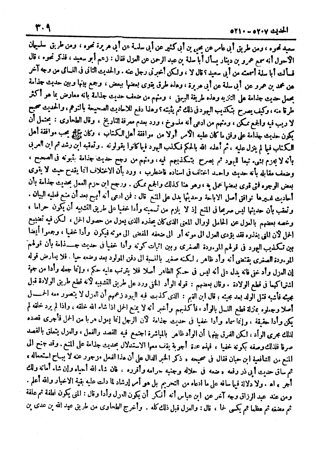 سَعِيدٍ نَحْوَهُ وَمِنْ طَرِيقِ أَبِي عَامِرٍ عَنْ يَحْيَى بْنِ أَبِي كَثِيرٍ عَنْ أَبِي سَلَمَةَ عَنْ أَبِي هُرَيْرَةَ نَحْوَهُ وَمِنْ طَرِيقِ سُلَيْمَانَ الْأَحْوَلِ أَنَّهُ سَمِعَ عَمْرَو بْنَ دِينَارٍ يَسْأَلُ أَبَا سَلَمَةَ بْنَ عَبْدِ الرَّحْمَنِ عَنِ الْعَزْلِ فَقَالَ زَعَمَ أَبُو سَعِيدٍ فَذَكَرَ نَحْوَهُ قَالَ فَسَأَلْتُ أَبَا سَلَمَةَ أَسَمِعْتَهُ مِنْ أَبِي سَعِيدٍ قَالَ لَا وَلَكِنْ أَخْبَرَنِي رَجُلٌ عَنْهُ وَالْحَدِيثُ الثَّانِي فِي النَّسَائِيِّ مِنْ وَجْهٍ آخَرَ عَنْ مُحَمَّدِ بْنِ عَمْرٍو عَنْ أَبِي سَلَمَةَ عَنْ أَبِي هُرَيْرَةَ وَهَذِهِ طُرُقٌ يَقْوَى بَعْضُهَا بِبَعْضٍ وَجُمِعَ بَيْنَهَا وَبَيْنَ حَدِيثِ جُذَامَةَ بِحَمْلِ حَدِيثِ جُذَامَةَ عَلَى التَّنْزِيهِ وَهَذِهِ طَرِيقَةُ الْبَيْهَقِيِّ وَمِنْهُمْ مَنْ ضَعَّفَ حَدِيثَ جُذَامَةَ بِأَنَّهُ مُعَارَضٌ بِمَا هُوَ أَكْثَرُ طُرُقًا مِنْهُ وَكَيْفَ يُصَرِّحُ بِتَكْذِيبِ الْيَهُودِ فِي ذَلِكَ ثُمَّ يُثْبِتُهُ وَهَذَا دَفْعٌ لِلْأَحَادِيثِ الصَّحِيحَةِ بِالتَّوَهُّمِ وَالْحَدِيثُ صَحِيحٌ لَا رَيْبَ فِيهِ وَالْجَمْعُ مُمْكِنٌ وَمِنْهُمْ مَنِ ادَّعَى أَنَّهُ مَنْسُوخٌ وَرُدَّ بِعَدَمِ مَعْرِفَةِ التَّارِيخِ وَقَالَ الطَّحَاوِيُّ يَحْتَمِلُ أَنْ يَكُونَ حَدِيثُ جُذَامَةَ عَلَى وَفْقِ مَا كَانَ عَلَيْهِ الْأَمْرُ أَوَّلًا مِنْ مُوَافَقَةِ أَهْلِ الْكِتَابِ وَكَانَ صَلَّى اللَّهُ عَلَيْهِ وَسَلَّمَ يُحِبُّ مُوَافَقَةَ أَهْلِ الْكِتَابِ فِيمَا لَمْ يَنْزِلْ عَلَيْهِ ثُمَّ أَعْلَمَهُ اللَّهُ بِالْحُكْمِ فَكَذَّبَ الْيَهُودَ فِيمَا كَانُوا يَقُولُونَهُ وَتعقبه بن رشد ثمَّ بن الْعَرَبِيِّ بِأَنَّهُ لَا يَجْزِمُ بِشَيْءٍ تَبَعًا لِلْيَهُودِ ثُمَّ يُصَرِّحُ بِتَكْذِيبِهِمْ فِيهِ وَمِنْهُمْ مَنْ رَجَّحَ حَدِيثَ جُذَامَةَ بِثُبُوتِهِ فِي الصَّحِيحِ وَضَعَّفَ مُقَابِلَهُ بِأَنَّهُ حَدِيثٌ وَاحِدٌ اخْتُلِفَ فِي إِسْنَادِهِ فَاضْطَرَبَ وَرُدَّ بِأَنَّ الِاخْتِلَافَ إِنَّمَا يَقْدَحُ حَيْثُ لَا يَقْوَى بَعْضُ الْوُجُوهِ فَمَتَى قَوِيَ بَعْضُهَا عُمِلَ بِهِ وَهُوَ هُنَا كَذَلِكَ وَالْجَمْعُ مُمْكِنٌ وَرَجَّحَ بن حَزْمٍ الْعَمَلَ بِحَدِيثِ جُذَامَةَ بِأَنَّ أَحَادِيثَ غَيْرِهَا تُوَافِقُ أَصْلَ الْإِبَاحَةِ وَحَدِيثُهَا يَدُلُّ عَلَى الْمَنْعِ قَالَ فَمَنِ ادَّعَى أَنَّهُ أُبِيحَ بَعْدَ أَنْ مُنِعَ فَعَلَيْهِ الْبَيَانُ وَتُعُقِّبَ بِأَنَّ حَدِيثَهَا لَيْسَ صَرِيحًا فِي الْمَنْعِ إِذْ لَا يَلْزَمُ مِنْ تَسْمِيَتِهِ وَأْدًا خَفِيًّا عَلَى طَرِيقِ التَّشْبِيهِ أَنْ يَكُونَ حَرَامًا وَخَصَّهُ بَعْضُهُمْ بِالْعَزْلِ عَنِ الْحَامِلِ لِزَوَالِ الْمَعْنَى الَّذِي كَانَ يَحْذَرُهُ الَّذِي يَعْزِلُ مِنْ حُصُولِ الْحَمْلِ لَكِنْ فِيهِ تَضْيِيعُ الْحَمْلِ لِأَنَّ الْمَنِيَّ يَغْذُوهُ فَقَدْ يُؤَدِّي الْعَزْلُ إِلَى مَوْتِهِ أَوْ إِلَى ضَعْفِهِ الْمُفْضِي إِلَى مَوْتِهِ فَيَكُونُ وَأْدًا خَفِيًّا وَجَمَعُوا أَيْضًا بَيْنَ تَكْذِيبِ الْيَهُودِ فِي قَوْلِهِمُ الْمَوْءُودَةُ الصُّغْرَى وَبَيْنَ إِثْبَاتِ كَوْنِهِ وَأْدًا خَفِيًّا فِي حَدِيثِ جُذَامَةَ بِأَنَّ قَوْلَهُمُ الْمَوْءُودَةُ الصُّغْرَى يَقْتَضِي أَنَّهُ وَأْدٌ ظَاهِرٌ لَكِنَّهُ صَغِيرٌ بِالنِّسْبَةِ إِلَى دَفْنِ الْمَوْلُودِ بَعْدَ وَضْعِهِ حَيًّا فَلَا يُعَارِضُ قَوْلُهُ إِنَّ الْعَزْلَ وَأْدٌ خَفِيٌّ فَإِنَّهُ يَدُلُّ عَلَى أَنَّهُ لَيْسَ فِي حُكْمِ الظَّاهِرِ أَصْلًا فَلَا يَتَرَتَّبُ عَلَيْهِ حُكْمٌ وَإِنَّمَا جَعَلَهُ وَأْدًا مِنْ جِهَةِ اشْتِرَاكِهِمَا فِي قَطْعِ الْوِلَادَةِ وَقَالَ بَعْضُهُمْ قَوْلُهُ الْوَأْدُ الْخَفِيُّ وَرَدَ 