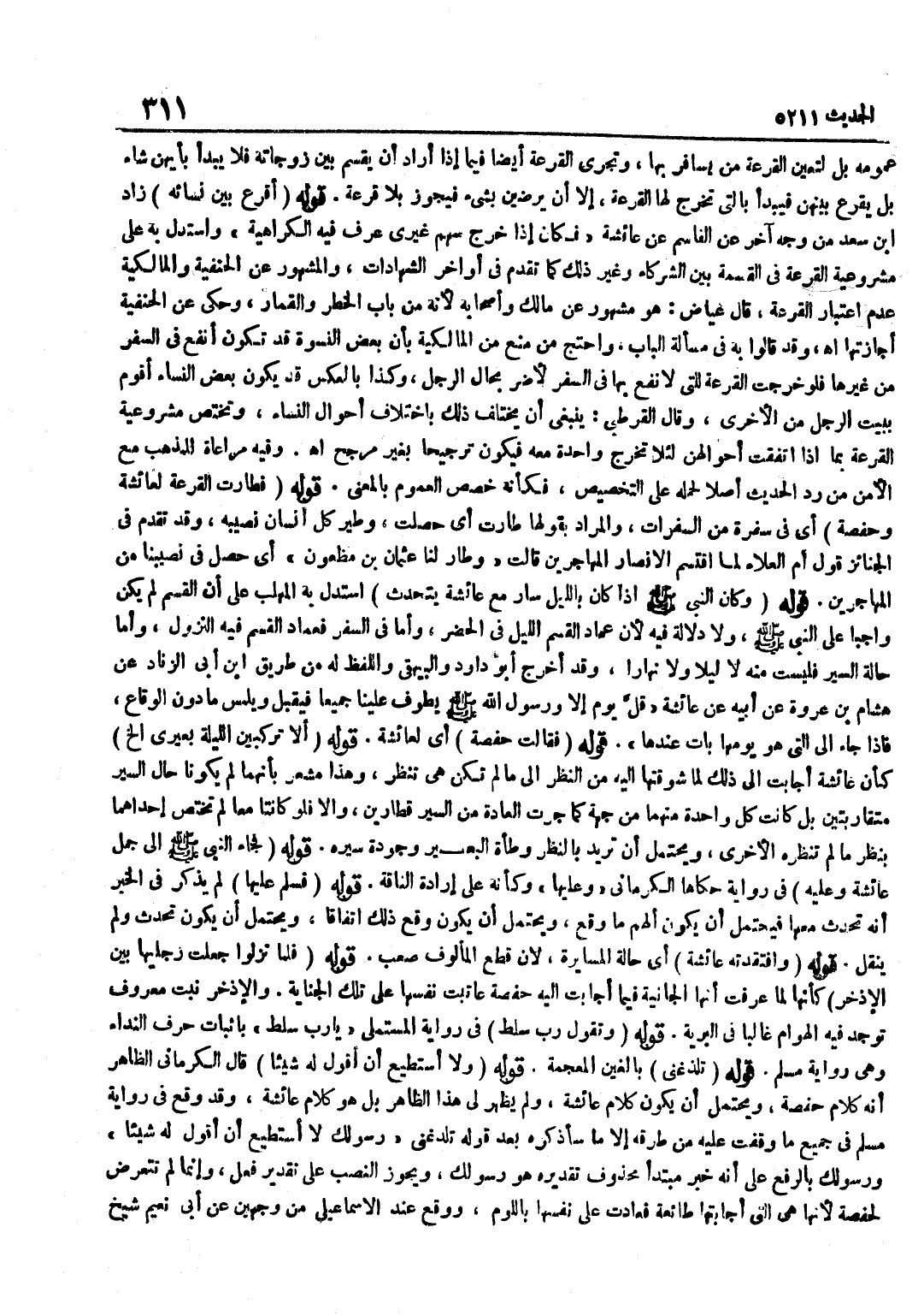 عُمُومِهِ بَلْ لِتَعَيُّنِ الْقُرْعَةِ مَنْ يُسَافِرُ بِهَا وَتَجْرِي الْقُرْعَةُ أَيْضًا فِيمَا إِذَا أَرَادَ أَنْ يَقْسِمَ بَيْنَ زَوْجَاتِهِ فَلَا يَبْدَأُ بِأَيِّهِنَّ شَاءَ بَلْ يَقْرَعُ بَيْنَهُنَّ فَيَبْدَأُ بِالَّتِي تَخْرُجُ لَهَا الْقُرْعَةُ إِلَّا أَنْ يَرْضَيْنَ بِشَيْءٍ فَيَجُوزُ بِلَا قرعَة قَوْله أَقرع بَين نِسَائِهِ زَاد بن سَعْدٍ مِنْ وَجْهٍ آخَرَ عَنِ الْقَاسِمِ عَنْ عَائِشَةَ فَكَانَ إِذَا خَرَجَ سَهْمُ غَيْرِي عَرَفَ فِيهِ الْكَرَاهِيَةَ وَاسْتُدِلَّ بِهِ عَلَى مَشْرُوعِيَّةِ الْقُرْعَةِ فِي الْقِسْمَةِ بَيْنَ الشُّرَكَاءِ وَغَيْرِ ذَلِكَ كَمَا تَقَدَّمَ فِي أَوَاخِرِ الشَّهَادَاتِ وَالْمَشْهُورُ عَنِ الْحَنَفِيَّةِ وَالْمَالِكِيَّةِ عَدَمُ اعْتِبَارِ الْقُرْعَةِ قَالَ عِيَاضٌ هُوَ مَشْهُورٌ عَنْ مَالِكٍ وَأَصْحَابِهِ لِأَنَّهُ مِنْ بَابِ الْخَطَرِ وَالْقِمَارِ وَحُكِيَ عَنِ الْحَنَفِيَّةِ إِجَازَتُهَا اه وَقَدْ قَالُوا بِهِ فِي مَسْأَلَةِ الْبَابِ وَاحْتَجَّ مَنْ مَنَعَ مِنَ الْمَالِكِيَّةِ بِأَنَّ بَعْضَ النِّسْوَةِ قَدْ تَكُونُ أَنْفَعُ فِي السَّفَرِ مِنْ غَيْرِهَا فَلَوْ خَرَجَتِ الْقُرْعَةُ لِلَّتِي لَا نَفْعَ بِهَا فِي السَّفَرِ لَأَضَرَّ بِحَالِ الرَّجُلِ وَكَذَا بِالْعَكْسِ قَدْ يَكُونُ بَعْضُ النِّسَاءِ أَقْوَمَ بِبَيْتِ الرَّجُلِ مِنَ الْأُخْرَى وَقَالَ الْقُرْطُبِيُّ يَنْبَغِي أَنْ يَخْتَلِفَ ذَلِكَ بِاخْتِلَافِ أَحْوَالِ النِّسَاءِ وَتَخْتَصُّ مَشْرُوعِيَّةُ الْقُرْعَةِ بِمَا إِذَا اتَّفَقَتْ أَحْوَالُهُنَّ لِئَلَّا تَخْرُجَ وَاحِدَةٌ مَعَهُ فَيَكُونُ تَرْجِيحًا بِغَيْرِ مُرَجِّحٍ اه وَفِيهِ مُرَاعَاةٌ لِلْمَذْهَبِ مَعَ الْأَمْنِ مِنْ رَدِّ الْحَدِيثِ أَصْلًا لِحَمْلِهِ عَلَى التَّخْصِيصِ فَكَأَنَّهُ خَصَّصَ الْعُمُومَ بِالْمَعْنَى قَوْلُهُ فَطَارَتِ الْقُرْعَةُ لِعَائِشَةَ وَحَفْصَةَ أَيْ فِي سَفْرَةٍ مِنَ السَّفْرَاتِ وَالْمُرَادُ بِقَوْلِهَا طَارَتْ أَيْ حَصَلَتْ وَطَيْرُ كُلِّ إِنْسَانٍ نَصِيبُهُ وَقَدْ تَقَدَّمَ فِي الْجَنَائِزِ قَوْلُ أُمِّ الْعَلَاءِ لَمَّا اقْتَسَمَ الْأَنْصَارُ الْمُهَاجِرِينَ قَالَتْ وَطَارَ لَنَا عُثْمَانُ بْنُ مَظْعُونٍ أَيْ حَصَلَ فِي نَصِيبِنَا مِنَ الْمُهَاجِرِينَ قَوْلُهُ وَكَانَ النَّبِيُّ صَلَّى اللَّهُ عَلَيْهِ وَسَلَّمَ إِذَا كَانَ بِاللَّيْلِ سَارَ مَعَ عَائِشَةَ يَتَحَدَّثُ اسْتَدَلَّ بِهِ الْمُهَلَّبُ عَلَى أَنَّ الْقَسْمَ لَمْ يَكُنْ وَاجِبًا عَلَى النَّبِيِّ صَلَّى اللَّهُ عَلَيْهِ وَسَلَّمَ وَلَا دَلَالَةَ فِيهِ لِأَنَّ عِمَادَ الْقَسْمِ اللَّيْلُ فِي الْحَضَرِ وَأَمَّا فِي السَّفَرِ فَعِمَادُ الْقَسْمِ فِيهِ النُّزُولُ وَأَمَّا حَالَةُ السَّيْرِ فَلَيْسَتْ مِنْهُ لَا لَيْلًا وَلَا نَهَارًا وَقَدْ أَخْرَجَ أَبُو دَاوُدَ وَالْبَيْهَقِيُّ وَاللَّفْظُ لَهُ مِنْ طَرِيق بْنِ أَبِي الزِّنَادِ عَنْ هِشَامِ بْنِ عُرْوَةَ عَنْ أَبِيهِ عَنْ عَائِشَةَ قَلَّ يَوْمٌ إِلَّا وَرَسُولُ اللَّهِ صَلَّى اللَّهُ عَلَيْهِ وَسَلَّمَ يَطُوفُ عَلَيْنَا جَمِيعًا فَيُقَبِّلُ وَيَلْمِسُ مَا دُونَ الْوِقَاعِ فَإِذَا جَاءَ إِلَى الَّتِي هُوَ يَوْمُهَا بَاتَ عِنْدَهَا قَوْلُهُ فَقَالَتْ حَفْصَةُ أَيْ لِعَائِشَةَ قَوْلُهُ أَلَا تَرْكَبِينَ اللَّيْلَةَ بَعِيرِي إِلَخْ كَأَنَّ عَائِشَةَ أَجَابَتْ إِلَى ذَلِكَ لِمَا شَوَّقَتْهَا إِلَيْهِ مِنَ النَّظَرِ إِلَى مَا لَمْ تَكُنْ هِيَ تَنْظُرُ وَهَذَا مُشْعِرٌ بِأَنَّهُمَا لَمْ يَكُونَا حَالَ السَّيْرِ مُتَقَارِبَتَيْنِ بَلْ كَانَتْ كُلُّ وَاحِدَةٍ مِنْهُمَا مِنْ جِهَةٍ كَمَا جَرَتِ الْعَادَةُ مِنْ السَّيْرِ قِطَارَيْنِ وَإِلَّا فَلَوْ كَانَتَا 