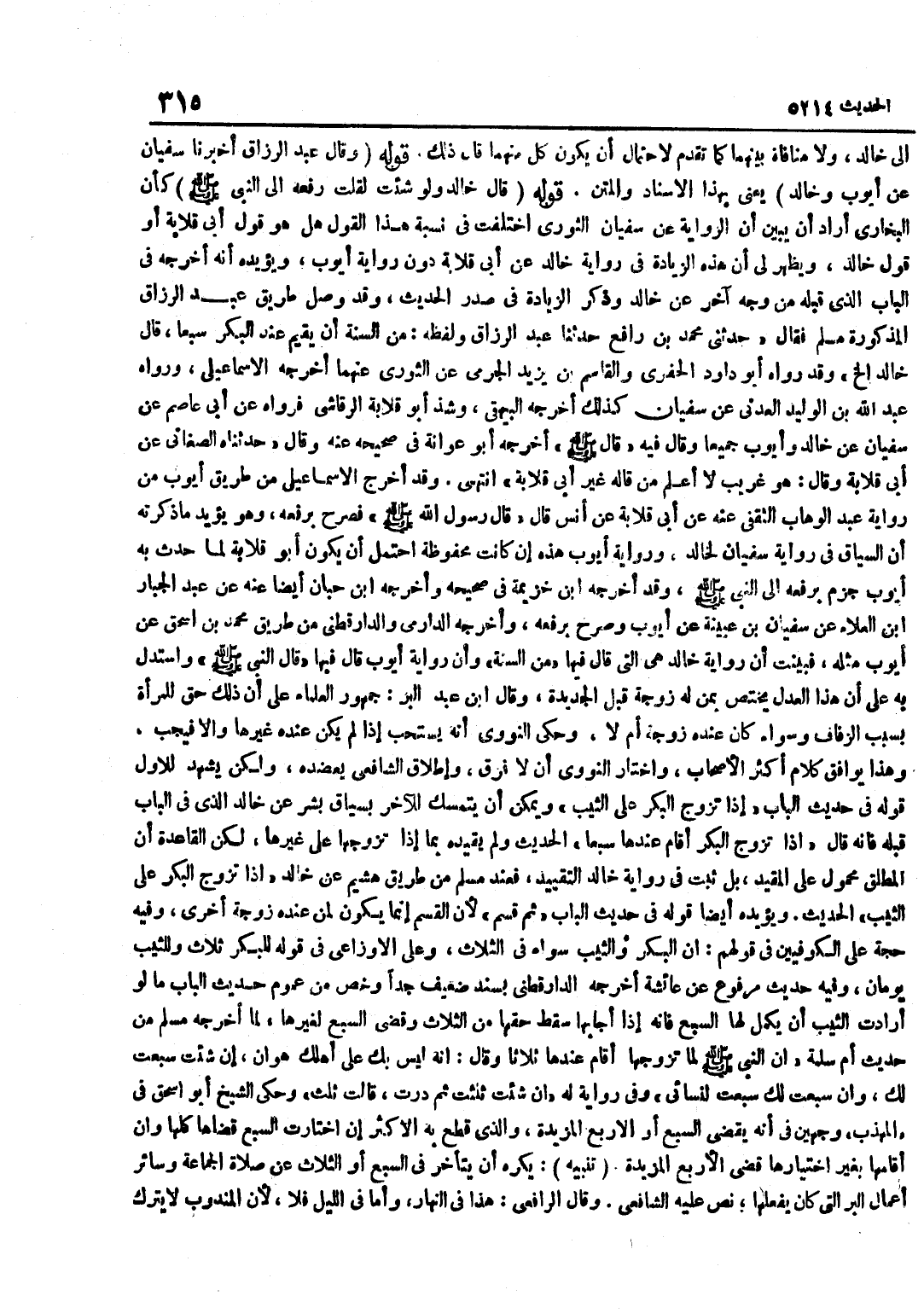 إِلَى خَالِدٍ وَلَا مُنَافَاةَ بَيْنَهُمَا كَمَا تَقَدَّمَ لِاحْتِمَالِ أَنْ يَكُونَ كُلٌّ مِنْهُمَا قَالَ ذَلِكَ قَوْلُهُ وَقَالَ عَبْدُ الرَّزَّاقِ أَخْبَرَنَا سُفْيَانُ عَنْ أَيُّوبَ وَخَالِدٍ يَعْنِي بِهَذَا الْإِسْنَادِ وَالْمَتْنِ قَوْلُهُ قَالَ خَالِدٌ وَلَوْ شِئْتُ لَقُلْتُ رَفْعُهُ إِلَى النَّبِيِّ صَلَّى اللَّهُ عَلَيْهِ وَسَلَّمَ كَأَنَّ الْبُخَارِيَّ أَرَادَ أَنْ يُبَيِّنَ أَنَّ الرِّوَايَةَ عَنْ سُفْيَانَ الثَّوْرِيِّ اخْتَلَفَتْ فِي نِسْبَةِ هَذَا الْقَوْلِ هَلْ هُوَ قَوْلُ أَبِي قِلَابَةَ أَوْ قَوْلُ خَالِدٍ وَيَظْهَرُ لِي أَنَّ هَذِهِ الزِّيَادَةَ فِي رِوَايَةِ خَالِدٍ عَنْ أَبِي قِلَابَةَ دُونَ رِوَايَةِ أَيُّوبَ وَيُؤَيِّدُهُ أَنَّهُ أَخْرَجَهُ فِي الْبَابِ الَّذِي قَبْلَهُ مِنْ وَجْهٍ آخَرَ عَنْ خَالِدٍ وَذَكَرَ الزِّيَادَةَ فِي صَدْرِ الْحَدِيثِ وَقَدْ وَصَلَ طَرِيقَ عَبْدِ الرَّزَّاقِ الْمَذْكُورَةَ مُسْلِمٌ فَقَالَ حَدَّثَنِي مُحَمَّدُ بْنُ رَافِعٍ حَدَّثَنَا عَبْدُ الرَّزَّاقِ وَلَفْظُهُ مِنَ السُّنَّةِ أَنْ يُقِيمَ عِنْدَ الْبِكْرِ سَبْعًا قَالَ خَالِدٌ إِلَخْ وَقَدْ رَوَاهُ أَبُو دَاوُدَ الْحَفَرِيُّ وَالْقَاسِمُ بْنُ يَزِيدَ الْجَرْمِيُّ عَنِ الثَّوْرِيِّ عَنْهُمَا أَخْرَجَهُ الْإِسْمَاعِيلِيُّ وَرَوَاهُ عَبْدِ اللَّهِ بْنِ الْوَلِيدِ الْعَدَنِيِّ عَنْ سُفْيَانَ كَذَلِكَ أَخْرَجَهُ الْبَيْهَقِيُّ وَشَذَّ أَبُو قِلَابَةَ الرِّقَاشِيُّ فَرَوَاهُ عَنْ أَبِي عَاصِمٍ عَنْ سُفْيَانَ عَنْ خَالِدٍ وَأَيُّوبَ جَمِيعًا وَقَالَ فِيهِ قَالَ صَلَّى اللَّهُ عَلَيْهِ وَسَلَّمَ أَخْرَجَهُ أَبُو عَوَانَةَ فِي صَحِيحِهِ عَنْهُ وَقَالَ حَدَّثَنَاهُ الصَّغَانِيُّ عَنْ أَبِي قِلَابَةَ وَقَالَ هُوَ غَرِيبٌ لَا أَعْلَمُ مَنْ قَالَهُ غَيْرَ أَبِي قِلَابَةَ انْتَهَى وَقَدْ أَخْرَجَ الْإِسْمَاعِيلِيُّ مِنْ طَرِيقِ أَيُّوبَ مِنْ رِوَايَةِ عَبْدِ الْوَهَّابِ الثَّقَفِيِّ عَنْهُ عَنْ أَبِي قِلَابَةَ عَنْ أَنَسٌ قَالَ قَالَ رَسُولُ اللَّهِ صَلَّى اللَّهُ عَلَيْهِ وَسَلَّمَ فَصَرَّحَ بِرَفْعِهِ وَهُوَ يُؤَيِّدُ مَا ذَكَرْتُهُ أَنَّ السِّيَاقَ فِي رِوَايَةِ سُفْيَانَ لِخَالِدٍ وَرِوَايَةُ أَيُّوبَ هَذِهِ إِنْ كَانَتْ مَحْفُوظَةً احْتَمَلَ أَنْ يَكُونَ أَبُو قِلَابَةَ لَمَّا حَدَّثَ بِهِ أَيُّوبَ جَزَمَ بِرَفْعِهِ إِلَى النَّبِيِّ صَلَّى اللَّهُ عَلَيْهِ وَسَلَّمَ وَقَدْ أَخْرَجَهُ بن خُزَيْمَة فِي صَحِيحه وَأخرجه بن حِبَّانَ أَيْضًا عَنْهُ عَنْ عَبْدِ الْجَبَّارِ بْنِ الْعَلَاءِ عَنْ سُفْيَانَ بْنِ عُيَيْنَةَ عَنْ أَيُّوبَ وَصَرَّحَ بِرَفْعِهِ وَأَخْرَجَهُ الدَّارِمِيُّ وَالدَّارَقُطْنِيُّ مِنْ طَرِيقِ مُحَمَّدِ بْنِ إِسْحَاقَ عَنْ أَيُّوبَ مِثْلَهُ فَبَيَّنْتُ أَنَّ رِوَايَةَ خَالِدٍ هِيَ الَّتِي قَالَ فِيهَا مِنَ السُّنَّةِ وَأَنَّ رِوَايَةَ أَيُّوبَ قَالَ فِيهَا قَالَ النَّبِيِّ صَلَّى اللَّهُ عَلَيْهِ وَسَلَّمَ وَاسْتَدَلَّ بِهِ عَلَى أَنَّ هَذَا الْعَدْلَ يَخْتَصُّ بِمَنْ لَهُ زَوْجَة قبل الجديدة وَقَالَ بن عَبْدِ الْبَرِّ جُمْهُورُ الْعُلَمَاءِ عَلَى أَنَّ ذَلِكَ حَقٌّ لِلْمَرْأَةِ بِسَبَبِ الزِّفَافِ وَسَوَاءٌ كَانَ عِنْدَهُ زَوْجَةٌ أَمْ لَا وَحَكَى النَّوَوِيُّ أَنَّهُ يُسْتَحَبُّ إِذَا لَمْ يَكُنْ عِنْدَهُ غَيْرُهَا وَإِلَّا فَيَجِبُ وَهَذَا يُوَافِقُ كَلَامَ أَكْثَرِ الْأَصْحَابِ وَاخْتَارَ النَّوَوِيُّ أَنْ لَا فَرْقَ وَإِطْلَاقُ الشَّافِعِيِّ يُعَضِّدُهُ وَلَكِنْ يَشْهَدُ لِلْأَوَّلِ قَوْلُهُ فِي حَدِيثِ الْبَابِ إِذَا تَزَوَّجَ الْبِكْرَ عَلَى الثَّيِّبِ وَيُمْكِنُ أَنْ يَتَمَسَّكَ لِلْآخَرِ بِسِيَاقِ بِشْرٍ عَنْ خَالِدٍ الَ