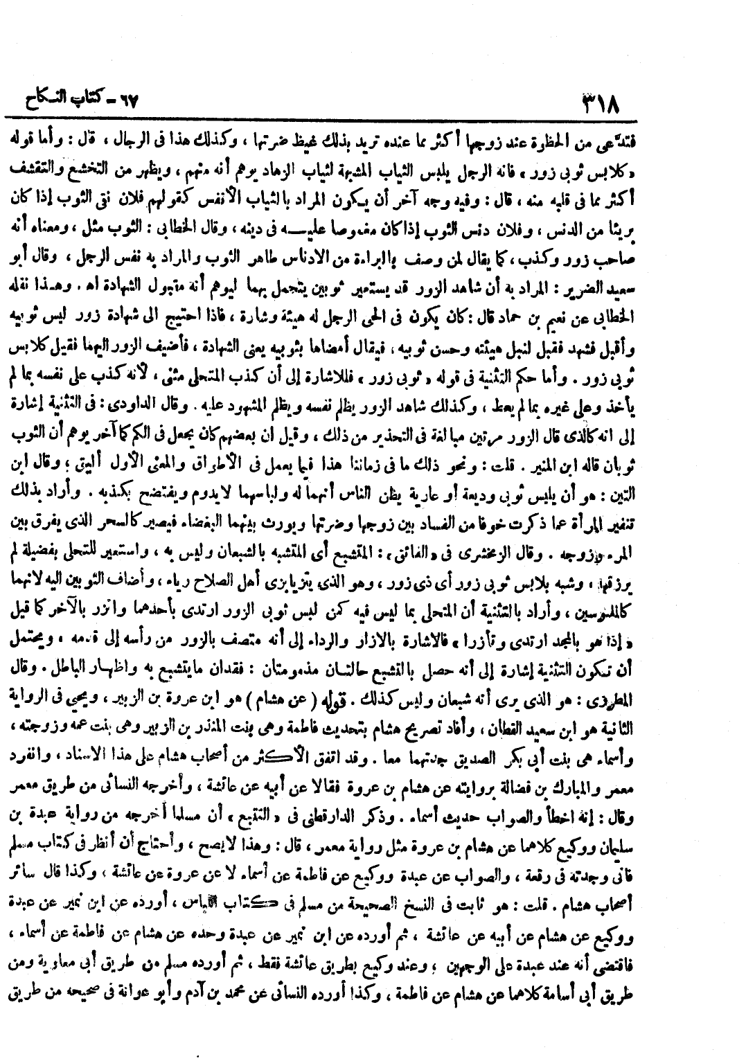 فَتَدَّعِي مِنَ الْحَظْوَةِ عِنْدَ زَوْجِهَا أَكْثَرَ مِمَّا عِنْدَهُ تُرِيدُ بِذَلِكَ غَيْظَ ضَرَّتِهَا وَكَذَلِكَ هَذَا فِي الرِّجَالِ قَالَ وَأَمَّا قَوْلُهُ كَلَابِسِ ثَوْبَيْ زُورٍ فَإِنَّهُ الرَّجُلُ يَلْبِسُ الثِّيَابَ الْمُشْبِهَةَ لِثِيَابِ الزُّهَّادِ يُوهِمُ أَنَّهُ مِنْهُمْ وَيَظْهَرُ مِنَ التَّخَشُّعِ وَالتَّقَشُّفِ أَكْثَرُ مِمَّا فِي قَلْبِهِ مِنْهُ قَالَ وَفِيهِ وَجْهٌ آخَرُ أَنْ يَكُونَ الْمُرَادُ بِالثِّيَابِ الْأَنْفَسَ كَقَوْلِهِمْ فُلَانٌ نَقِيُّ الثَّوْبِ إِذَا كَانَ بَرِيئًا مِنَ الدَّنَسِ وَفُلَانٌ دَنِسُ الثَّوْبِ إِذَا كَانَ مَغْمُوصًا عَلَيْهِ فِي دِينِهِ وَقَالَ الْخَطَّابِيُّ الثَّوْبُ مَثَلٌ وَمَعْنَاهُ أَنَّهُ صَاحِبُ زُورٍ وَكَذِبٍ كَمَا يُقَالُ لِمَنْ وُصِفَ بِالْبَرَاءَةِ مِنَ الْأَدْنَاسِ طَاهِرُ الثَّوْبِ وَالْمُرَادُ بِهِ نَفْسُ الرَّجُلِ وَقَالَ أَبُو سَعِيدٍ الضَّرِيرُ الْمُرَادُ بِهِ أَنَّ شَاهِدَ الزُّورِ قَدْ يَسْتَعِيرُ ثَوْبَيْنِ يَتَجَمَّلُ بِهِمَا لِيُوهِمَ أَنَّهُ مَقْبُولُ الشَّهَادَةِ اه وَهَذَا نَقَلَهُ الْخَطَّابِيُّ عَنْ نُعَيْمِ بْنِ حَمَّادٍ قَالَ كَانَ يَكُونُ فِي الْحَيِّ الرَّجُلُ لَهُ هَيْئَةٌ وَشَارَةٌ فَإِذَا احْتِيجَ إِلَى شَهَادَةِ زُورٍ لَبِسَ ثَوْبَيْهِ وَأَقْبَلَ فَشَهِدَ فَقُبِلَ لِنُبْلِ هَيْئَتِهِ وَحُسْنِ ثَوْبَيْهِ فَيُقَالُ أَمْضَاهَا بِثَوْبَيْهِ يَعْنِي الشَّهَادَةَ فَأُضِيفَ الزُّورُ إِلَيْهِمَا فَقِيلَ كَلَابِسِ ثَوْبَيْ زُورٍ وَأَمَّا حُكْمُ التَّثْنِيَةِ فِي قَوْلِهِ ثَوْبَيْ زُورٍ فَلِلْإِشَارَةِ إِلَى أَنَّ كَذِبَ الْمُتَحَلِّي مَثْنًى لِأَنَّهُ كَذَبَ عَلَى نَفْسِهِ بِمَا لَمْ يَأْخُذْ وَعَلَى غَيْرِهِ بِمَا لَمْ يُعْطِ وَكَذَلِكَ شَاهِدُ الزُّورِ يَظْلِمُ نَفْسَهُ وَيَظْلِمُ الْمَشْهُودَ عَلَيْهِ وَقَالَ الدَّاوُدِيُّ فِي التَّثْنِيَةِ إِشَارَةٌ إِلَى أَنَّهُ كَالَّذِي قَالَ الزُّورَ مَرَّتَيْنِ مُبَالَغَةً فِي التَّحْذِيرِ مِنْ ذَلِكَ وَقِيلَ إِنَّ بَعْضَهُمْ كَانَ يَجْعَلُ فِي الْكُمِّ كُمًّا آخَرَ يُوهِمُ أَن الثَّوْب ثَوْبَان قَالَه بن الْمُنِيرِ قُلْتُ وَنَحْوُ ذَلِكَ مَا فِي زَمَانِنَا هَذَا فِيمَا يُعْمَلُ فِي الْأَطْوَاقِ وَالْمَعْنَى الْأَوَّلُ أليق وَقَالَ بن التِّينِ هُوَ أَنْ يَلْبَسَ ثَوْبَيْ وَدِيعَةٍ أَوْ عَارِيَّةٍ يَظُنُّ النَّاسُ أَنَّهُمَا لَهُ وَلِبَاسُهُمَا لَا يَدُومُ وَيَفْتَضِحُ بِكَذِبِهِ وَأَرَادَ بِذَلِكَ تَنْفِيرَ الْمَرْأَةِ عَمَّا ذَكَرْتُ خَوْفًا مِنَ الْفَسَادِ بَيْنَ زَوْجِهَا وَضَرَّتِهَا وَيُورِثُ بَيْنَهُمَا الْبَغْضَاءَ فَيَصِيرُ كَالسِّحْرِ الَّذِي يُفَرِّقُ بَيْنَ الْمَرْءِ وَزَوْجِهِ وَقَالَ الزَّمَخْشَرِيُّ فِي الْفَائِقِ الْمُتَشَبِّعُ أَيِ الْمُتَشَبِّهُ بِالشَّبْعَانِ وَلَيْسَ بِهِ وَاسْتُعِيرَ لِلتَّحَلِّي بِفَضِيلَةٍ لَمْ يُرْزَقْهَا وَشُبِّهَ بِلَابِسِ ثَوْبَيْ زُورٍ أَيْ ذِي زُورٍ وَهُوَ الَّذِي يَتَزَيَّا بِزِيِّ أَهْلِ الصَّلَاحِ رِيَاءً وَأَضَافَ الثَّوْبَيْنِ إِلَيْهِ لِأَنَّهُمَا كَالْمَلْبُوسَيْنِ وَأَرَادَ بِالتَّثْنِيَةِ أَنَّ الْمُتَحَلِّيَ بِمَا لَيْسَ فِيهِ كَمَنْ لَبِسَ ثَوْبَيِ الزُّورِ ارْتَدَى بِأَحَدِهِمَا وَاتَّزَرَ بِالْآخَرِ كَمَا قِيلَ إِذَا هُوَ بِالْمَجْدِ ارْتَدَى وَتَأَزَّرَا فَالْإِشَارَةُ بِالْإِزَارِ وَالرِّدَاءِ إِلَى أَنَّهُ مُتَّصِفٌ بِالزُّورِ مِنْ رَأْسِهِ إِلَى قَدَمِهِ وَيَحْتَمِلُ أَنْ تَكُونَ التَّثْنِيَةُ إِشَارَةٌ إِلَى أَنَّهُ حَصَلَ بِالتَّشَبُّعِ حَالَتَانِ مَذْمُومَتَانِ فِقْدَانُ مَا يُتَشَبَّعُ بِهِ وَإِظْهَارُ الْبَاطِلِ وَقَالَ الْمُطَرِّزِيُّ هُوَ ا