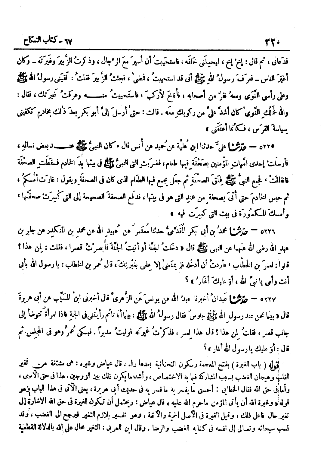 بِفَتْحِ الْمُعْجَمَةِ وَسُكُونِ التَّحْتَانِيَّةِ بَعْدَهَا رَاءٍ قَالَ عِيَاضٌ وَغَيْرُهُ هِيَ مُشْتَقَّةٌ مِنْ تَغَيُّرِ الْقَلْبِ وَهَيَجَانِ الْغَضَبِ بِسَبَبِ الْمُشَارَكَةِ فِيمَا بِهِ الِاخْتِصَاصُ وَأَشَدُّ مَا يَكُونُ ذَلِكَ بَيْنَ الزَّوْجَيْنِ هَذَا فِي حَقِّ الْآدَمِيِّ وَأَمَّا فِي حَقِّ اللَّهِ فَقَالَ الْخَطَّابِيُّ أَحْسَنُ مَا يُفَسَّرُ بِهِ مَا فُسِّرَ بِهِ فِي حَدِيثِ أَبِي هُرَيْرَةَ يَعْنِي الْآتِي فِي هَذَا الْبَابِ وَهُوَ قَوْلُهُ وَغَيْرَةُ اللَّهِ أَنْ يَأْتِيَ الْمُؤْمِنُ مَا حَرَّمَ اللَّهُ عَلَيْهِ قَالَ عِيَاضٌ وَيَحْتَمِلُ أَنْ تَكُونَ الْغَيْرَةُ فِي حَقِّ اللَّهِ الْإِشَارَةَ إِلَى تَغَيُّرِ حَالِ فَاعِلِ ذَلِكَ وَقِيلَ الْغَيْرَةُ فِي الْأَصْلِ الْحَمِيَّةُ وَالْأَنَفَةُ وَهُوَ تَفْسِيرٌ بِلَازِمِ التَّغَيُّرِ فَيَرْجِعُ إِلَى الْغَضَبِ وَقَدْ نَسَبَ سُبْحَانَهُ وَتَعَالَى إِلَى نَفْسِهِ فِي كِتَابِهِ الْغَضَبَ وَالرِّضَا وَقَالَ بن الْعَرَبِيِّ التَّغَيُّرُ مُحَالٌ عَلَى اللَّهِ بِالدَّلَالَةِ الْقَطْعِيَّةِ