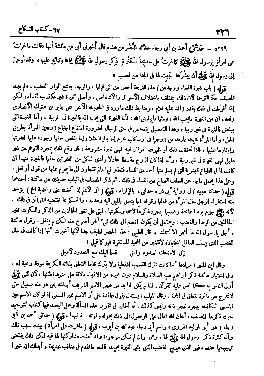 [5229] قَوْلُهُ حَدَّثَنِي أَحْمَدُ بْنُ أَبِي رَجَاءٍ هُوَ أَبُو الْوَلِيدِ الْهَرَوِيُّ وَاسْمُ أَبِي رَجَاءٍ عَبْدُ اللَّهِ بْنُ أَيُّوبَ قَوْلُهُ مَا غِرْتُ عَلَى امْرَأَةٍ بَيَّنْتُ سَبَبَ ذَلِكَ وَأَنَّهُ كَثْرَةِ ذِكْرُ رَسُولِ اللَّهِ صَلَّى اللَّهُ عَلَيْهِ وَسَلَّمَ لَهَا وَهِيَ وَإِنْ لَمْ تَكُنْ مَوْجُودَةً وَقَدْ أَمِنَتْ مُشَارَكَتَهَا لَهَا فِيهِ لَكِنَّ ذَلِكَ يَقْتَضِي تَرْجِيحَهَا عِنْدَهُ فَهُوَ الَّذِي هَيَّجَ الْغَضَبَ الَّذِي يُثِيرُ الْغَيْرَةَ بِحَيْثُ قَالَتْ مَا تَقَدَّمَ فِي مَنَاقِبِ خَدِيجَةَ أَبْدَلَكَ اللَّهُ خَيْرًا مِنْهَا فَقَالَ مَا أَبْدَلَنِي اللَّهُ خَيْرًا مِنْهَا وَمَعَ ذَلِكَ فَلَمْ يُنْقَلْ أَنَّهُ وَاخَذَ عَائِشَةَ لِقِيَامِ مَعْذِرَتِهَا بِالْغَيْرَةِ الَّتِي جُبِلَ عَلَيْهَا النِّسَاء وَقد تقدّمت مبَاحث الحَدِيث فِي كتاب المناقب مستوفاة