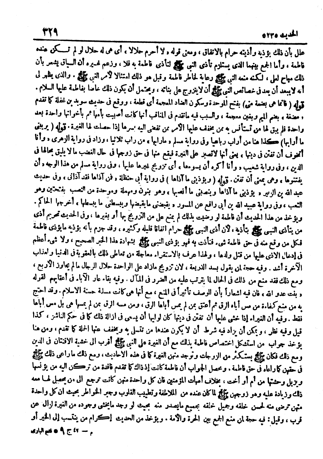 عَلَّلَ بِأَنَّ ذَلِكَ يُؤْذِيهِ وَأَذِيَّتُهُ حَرَامٌ بِالِاتِّفَاقِ وَمَعْنَى قَوْلِهِ لَا أُحَرِّمُ حَلَالًا أَيْ هِيَ لَهُ حَلَالٌ لَوْ لَمْ تَكُنْ عِنْدَهُ فَاطِمَةُ وَأَمَّا الْجَمْعُ بَيْنَهُمَا الَّذِي يَسْتَلْزِمُ تَأَذِّيَ النَّبِيِّ صَلَّى اللَّهُ عَلَيْهِ وَسَلَّمَ لِتَأَذِّي فَاطِمَةَ بِهِ فَلَا وَزَعَمَ غَيْرُهُ أَنَّ السِّيَاقَ يُشْعِرُ بِأَنَّ ذَلِك مُبَاح لعَلي لكنه مَنعه النَّبِيُّ صَلَّى اللَّهُ عَلَيْهِ وَسَلَّمَ رِعَايَةً لِخَاطِرِ فَاطِمَةَ وَقَبِلَ هُوَ ذَلِكَ امْتِثَالًا لِأَمْرِ النَّبِيِّ صَلَّى اللَّهُ عَلَيْهِ وَسَلَّمَ وَالَّذِي يَظْهَرُ لِي أَنَّهُ لَا يَبْعُدُ أَنْ يُعَدَّ فِي خَصَائِصِ النَّبِيِّ صَلَّى اللَّهُ عَلَيْهِ وَسَلَّمَ أَنْ لَا يُتَزَوَّجَ عَلَى بَنَاتِهِ وَيَحْتَمِلُ أَنْ يَكُونَ ذَلِكَ خَاصًّا بِفَاطِمَةَ عَلَيْهَا السَّلَامُ قَوْلُهُ فَإِنَّمَا هيَ بَضْعَةٌ مِنِّي بِفَتْحِ الْمُوَحَّدَةِ وَسُكُونِ الضَّادِ الْمُعْجَمَةِ أَيْ قِطْعَةٌ وَوَقَعَ فِي حَدِيثِ سُوَيْدِ بْنِ غَفَلَةَ كَمَا تَقَدَّمَ مُضْغَةٌ بِضَمِّ الْمِيمِ وَبِغَيْنٍ مُعْجَمَةٍ وَالسَّبَبُ فِيهِ مَا تَقَدَّمَ فِي الْمَنَاقِبِ أَنَّهَا كَانَتْ أُصِيبَتْ بِأُمِّهَا ثُمَّ بِأَخَوَاتِهَا وَاحِدَةً بَعْدَ وَاحِدَةٍ فَلَمْ يَبْقَ لَهَا مَنْ تَسْتَأْنِسُ بِهِ مِمَّنْ يُخَفِّفُ عَلَيْهَا الْأَمْرَ مِمَّنْ تُفْضِي إِلَيْهِ بِسِرِّهَا إِذَا حَصَلَتْ لَهَا الْغَيْرَةُ قَوْلُهُ يريبني مَا ارا بهَا كَذَا هُنَا مِنْ أَرَابَ رُبَاعِيًّا وَفِي رِوَايَةِ مُسْلِمٍ مَا رَابَهَا مِنْ رَابَ ثُلَاثِيًّا وَزَادَ فِي رِوَايَةِ الزُّهْرِيِّ وَأَنَا أَتَخَوَّفُ أَنْ تُفْتَنَ فِي دِينِهَا يَعْنِي أَنَّهَا لَا تَصْبِرُ عَلَى الْغَيْرَةِ فَيَقَعُ مِنْهَا فِي حَقِّ زَوْجِهَا فِي حَالِ الْغَضَبِ مَا لَا يَلِيقُ بِحَالِهَا فِي الدِّينِ وَفِي رِوَايَةِ شُعَيْبٍ وَأَنَا أَكْرَهُ أَنْ يَسُوءَهَا أَيْ تَزْوِيجُ غَيْرِهَا عَلَيْهَا وَفِي رِوَايَةِ مُسْلِمٍ مِنْ هَذَا الْوَجْهِ أَنْ يَفْتِنُوهَا وَهِيَ بِمَعْنَى أَنْ تُفْتَنَ قَوْلُهُ وَيُؤْذِينِي مَا آذَاهَا فِي رِوَايَةِ أَبِي حَنْظَلَةَ فَمَنْ آذَاهَا فَقَدْ آذَانِي وَفِي حَدِيثِ عَبْدِ اللَّهِ بْنِ الزُّبَيْرِ يُؤْذِينِي مَا آذَاهَا وَيَنْصِبُنِي مَا أَنْصَبَهَا وَهُوَ بِنُونٍ وَمُهْمَلَةٍ وَمُوَحَّدَةٍ مِنَ النَّصَبِ بِفَتْحَتَيْنِ وَهُوَ التَّعَبُ وَفِي رِوَايَةِ عُبَيْدِ اللَّهِ بْنِ أَبِي رَافِعٍ عَنِ الْمِسْوَرِ يُقْبِضُنِي مَا يُقْبِضُهَا وَيُبْسِطُنِي مَا يُبْسِطُهَا أَخْرَجَهَا الْحَاكِمُ وَيُؤْخَذُ مِنْ هَذَا الْحَدِيثِ أَنَّ فَاطِمَةَ لَوْ رَضِيَتْ بِذَلِكَ لَمْ يُمْنَعْ عَلِيٌّ مِنَ التَّزْوِيجِ بِهَا أَوْ بِغَيْرِهَا وَفِي الْحَدِيثِ تَحْرِيمُ أَذَى مَنْ يَتَأَذَّى النَّبِيُّ صَلَّى اللَّهُ عَلَيْهِ وَسَلَّمَ بِتَأَذِّيهِ لِأَنَّ أَذَى النَّبِيِّ صَلَّى اللَّهُ عَلَيْهِ وَسَلَّمَ حَرَامٌ اتِّفَاقًا قَلِيلُهُ وَكَثِيرُهُ وَقَدْ جَزَمَ بِأَنَّهُ يُؤْذِيهِ مَا يُؤْذِي فَاطِمَةَ فَكُلُّ مَنْ وَقَعَ مِنْهُ فِي حَقِّ فَاطِمَةَ شَيْءٌ فَتَأَذَّتْ بِهِ فَهُوَ يُؤْذِي النَّبِيَّ صَلَّى اللَّهُ عَلَيْهِ وَسَلَّمَ بِشَهَادَةِ هَذَا الْخَبَرِ الصَّحِيحِ وَلَا شَيْءَ أَعْظَمُ فِي إِدْخَالِ الْأَذَى عَلَيْهَا مِنْ قَتْلِ وَلَدِهَا وَلِهَذَا عُرِفَ بِالِاسْتِقْرَاءِ مُعَاجَلَةُ مَنْ تَعَاطَى ذَلِكَ بِالْعُقُوبَةِ فِي الدُّنْيَا وَلَعَذَابُ الْآخِرَةِ أَشَدُّ وَفِيهِ حُجَّةٌ لِمَنْ يَقُولُ بِسَدِّ الذَّرِيعَةِ لِأَنَّ تَزْوِيجَ مَا زَادَ عَلَى الْوَاحِدَةِ حَلَالٌ لِلرِّجَالِ مَا لَمْ يُجَاوِزِ الْأَرْبَعَ وَمَعَ 