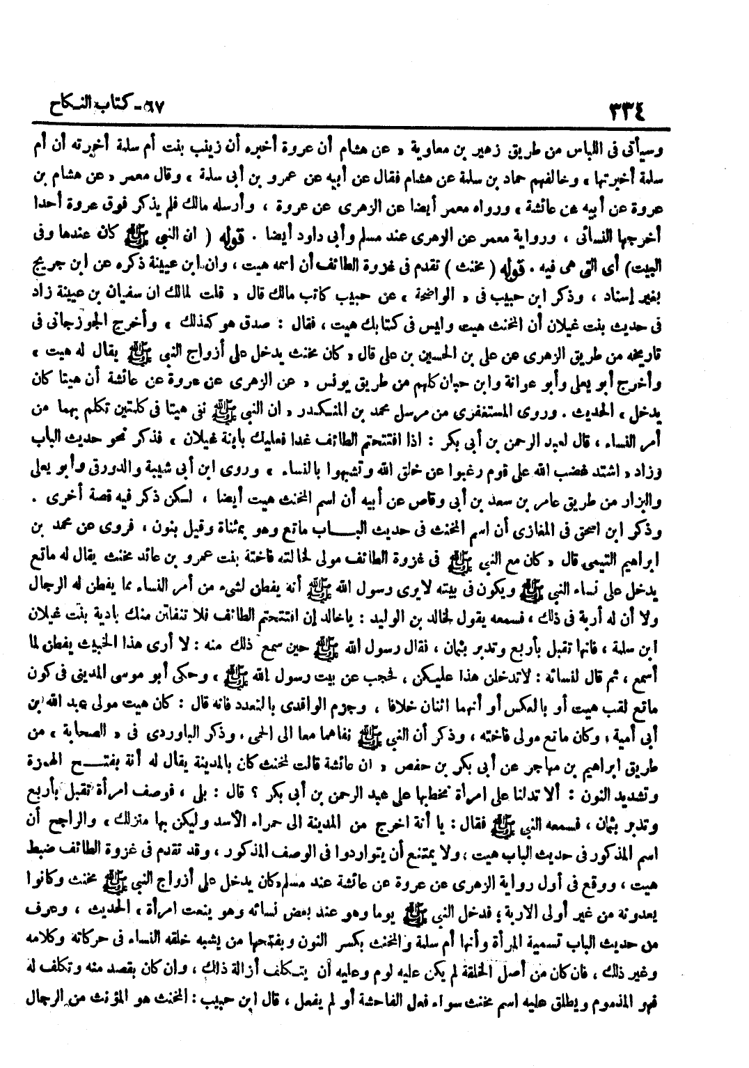 وَسَيَأْتِي فِي اللِّبَاسِ مِنْ طَرِيقِ زُهَيْرِ بْنِ مُعَاوِيَةَ عَنْ هِشَامٍ أَنَّ عُرْوَةَ أَخْبَرَهُ أَنَّ زَيْنَبَ بِنْتَ أُمِّ سَلَمَةَ أَخْبَرَتْهُ أَنَّ أُمَّ سَلَمَةَ أَخْبَرَتْهَا وَخَالَفَهُمْ حَمَّادُ بْنُ سَلَمَةَ عَنْ هِشَامٍ فَقَالَ عَنْ أَبِيهِ عَنْ عَمْرِو بْنِ أَبِي سَلَمَةَ وَقَالَ مَعْمَرٍ عَنْ هِشَامِ بْنِ عُرْوَةَ عَنْ أَبِيهِ عَنْ عَائِشَةَ وَرَوَاهُ مَعْمَرٌ أَيْضًا عَنِ الزُّهْرِيِّ عَنْ عُرْوَةَ وَأَرْسَلَهُ مَالِكٌ فَلَمْ يَذْكُرْ فَوْقَ عُرْوَةَ أَحَدًا أَخْرَجَهَا النَّسَائِيُّ وَرِوَايَةُ مَعْمَرٍ عَنِ الزُّهْرِيِّ عِنْدَ مُسْلِمٍ وَأَبِي دَاوُدَ أَيْضًا قَوْلُهُ أَنَّ النَّبِيَّ صَلَّى اللَّهُ عَلَيْهِ وَسَلَّمَ كَانَ عِنْدَهَا وَفِي الْبَيْتِ أَيِ الَّتِي هِيَ فِيهِ قَوْلُهُ مُخَنَّثٌ تَقَدَّمَ فِي غَزْوَة الطَّائِف أَن اسْمه هيت وَأَن بن عُيَيْنَة ذكره عَن بن جريج بِغَيْر إِسْنَاد وَذكر بن حَبِيبٍ فِي الْوَاضِحَةِ عَنْ حَبِيبٍ كَاتِبِ مَالِكٍ قَالَ قُلْتُ لِمَالِكٍ إِنَّ سُفْيَانَ بْنَ عُيَيْنَةَ زَادَ فِي حَدِيثِ بِنْتِ غَيْلَانَ أَنَّ الْمُخَنَّثَ هِيتُ وَلَيْسَ فِي كِتَابِكَ هِيتُ فَقَالَ صَدَقَ هُوَ كَذَلِكَ وَأَخْرَجَ الْجُوزَجَانِيُّ فِي تَارِيخِهِ مِنْ طَرِيقِ الزُّهْرِيِّ عَنْ عَلِيِّ بْنِ الْحُسَيْنِ بْنِ عَلِيٍّ قَالَ كَانَ مُخَنَّثٌ يَدْخُلُ عَلَى أَزْوَاجِ النَّبِيِّ صَلَّى اللَّهُ عَلَيْهِ وَسَلَّمَ يُقَالُ لَهُ هيت وَأخرج أَبُو يعلى وَأَبُو عوَانَة وبن حِبَّانَ كُلُّهُمْ مِنْ طَرِيقِ يُونُسَ عَنِ الزُّهْرِيِّ عَنْ عُرْوَةَ عَنْ عَائِشَةَ أَنَّ هِيتًا كَانَ يَدْخُلُ الْحَدِيثَ وَرَوَى الْمُسْتَغْفِرِيُّ مِنْ مُرْسَلِ مُحَمَّدِ بْنِ الْمُنْكَدِرِ أَنَّ النَّبِيَّ صَلَّى اللَّهُ عَلَيْهِ وَسَلَّمَ نَفَى هِيتًا فِي كَلِمَتَيْنِ تَكَلَّمَ بِهِمَا مِنْ أَمْرِ النِّسَاءِ قَالَ لِعَبْدِ الرَّحْمَنِ بْنِ أَبِي بَكْرٍ إِذَا افْتَتَحْتُمُ الطَّائِفَ غَدًا فَعَلَيْكَ بِابْنَةِ غَيْلَانَ فَذَكَرَ نَحْوَ حَدِيثِ الْبَابِ وَزَادَ اشْتَدَّ غَضَبُ اللَّهِ عَلَى قَوْمٍ رَغِبُوا عَنْ خلق الله وتشبهوا بِالنسَاء وروى بن أَبِي شَيْبَةَ وَالدَّوْرَقِيُّ وَأَبُو يَعْلَى وَالْبَزَّارُ مِنْ طَرِيقِ عَامِرِ بْنِ سَعْدِ بْنِ أَبِي وَقَّاصٍ عَنْ أَبِيهِ أَنَّ اسْمَ الْمُخَنَّثِ هِيتٌ أَيْضًا لَكِن ذكر فِيهِ قصَّة أُخْرَى وَذكر بن إِسْحَاقَ فِي الْمَغَازِي أَنَّ اسْمَ الْمُخَنَّثِ فِي حَدِيثِ الْبَابِ مَاتِعٌ وَهُوَ بِمُثَنَّاةٍ وَقِيلَ بِنُونٍ فَرُوِيَ عَنْ مُحَمَّدِ بْنِ إِبْرَاهِيمَ التَّيْمِيِّ قَالَ كَانَ مَعَ النَّبِيِّ صَلَّى اللَّهُ عَلَيْهِ وَسَلَّمَ فِي غَزْوَةِ الطَّائِفِ مَوْلًى لِخَالَتِهِ فَاخِتَةَ بِنْتِ عَمْرو بن عَائِد مُخَنَّثٌ يُقَالُ لَهُ مَاتِعٌ يَدْخُلُ عَلَى نِسَاءِ النَّبِيِّ صَلَّى اللَّهُ عَلَيْهِ وَسَلَّمَ وَيَكُونُ فِي بَيْتِهِ لَا يَرَى رَسُولِ اللَّهِ صَلَّى اللَّهُ عَلَيْهِ وَسَلَّمَ أَنَّهُ يَفْطِنُ لِشَيْءٍ مِنْ أَمْرِ النِّسَاءِ مِمَّا يَفْطِنُ لَهُ الرِّجَالُ وَلَا أَنَّ لَهُ إِرْبَةً فِي ذَلِكَ فَسَمِعَهُ يَقُولُ لِخَالِدِ بْنِ الْوَلِيدِ يَا خَالِدُ إِنِ افْتَتَحْتُمُ الطَّائِفَ فَلَا تَنْفَلِتَنَّ مِنْكَ بَادِيَةُ بِنْتُ غَيْلَانَ بْنِ سَلَمَةَ فَإِنَّهَا تُقْبِلُ بِأَرْبَعٍ وَتُدْبِرُ بِثَمَانٍ فَقَالَ رَسُولُ اللَّهِ صَلَّى اللَّهُ عَلَيْهِ وَسَلَّمَ حِين سَمِعَ ذَلِكَ مِنْهُ لَا أُرَى هَذَا الْخَبِيثَ يَفْطِنُ لِمَا أَسْمَعُ ثُمَّ قَالَ لِنِسَائِهِ لَا تُدْخِلَنَّ هَذَا عَلَيْكُنَّ فَحُجِبَ عَنْ بَيْتِ رَسُولِ اللَّهِ صَلَّى اللَّهُ عَلَيْهِ وَسَلَّمَ وَحَكَى أَبُو مُوسَى الْمَدِينِيُّ ف