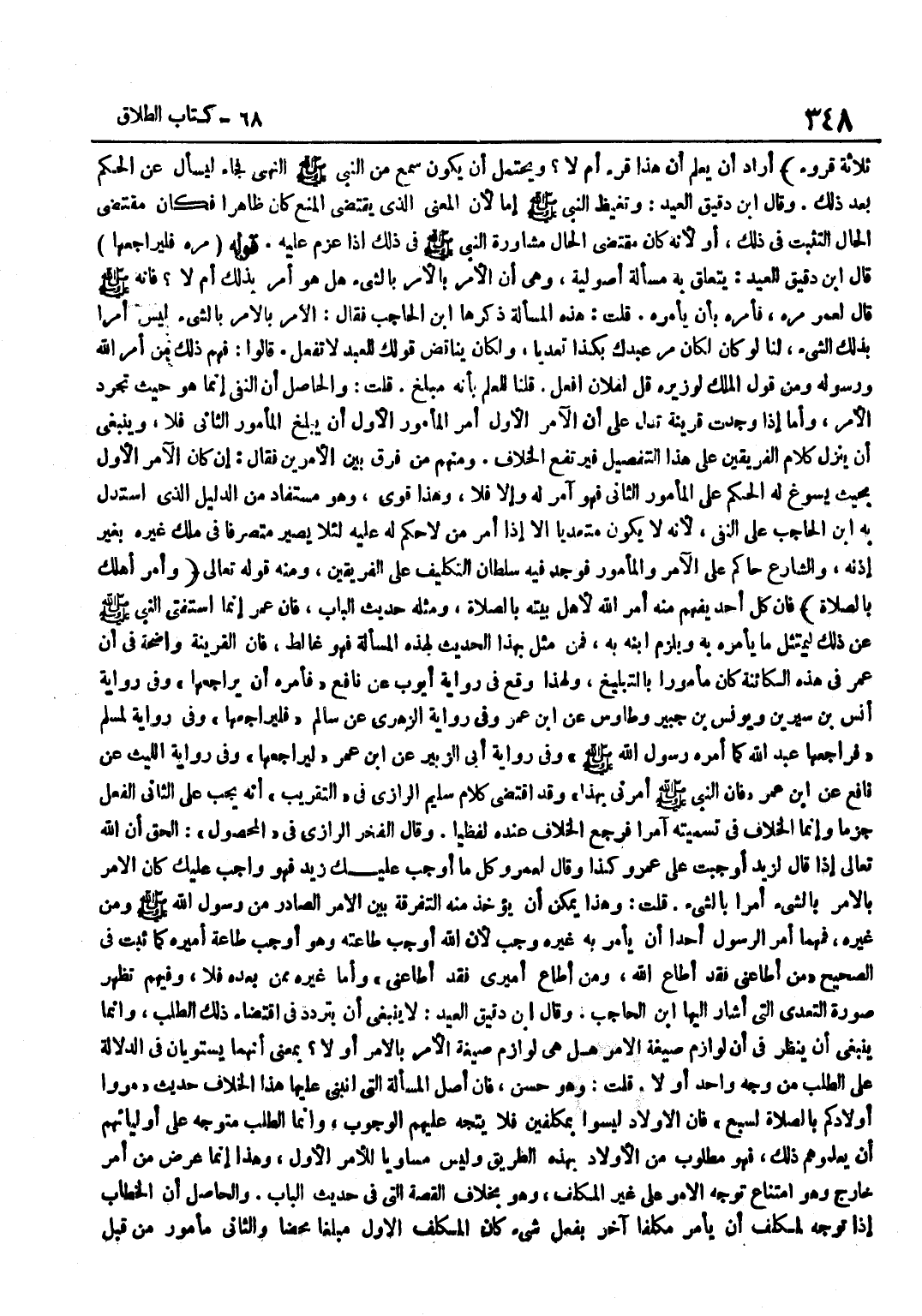 ثَلَاثَة قُرُوء أَرَادَ أَن يعلم أَن هَذَا قرء أم لَا وَيحْتَمل أَن يكون سَمِعَ مِنَ النَّبِيِّ صَلَّى اللَّهُ عَلَيْهِ وَسَلَّمَ النَّهْي فجَاء ليسأل عَن الحكم بعد ذَلِك وَقَالَ بن دَقِيق الْعِيد وتغيظ النَّبِي صلى الله عَلَيْهِ وَسلم أما لِأَن الْمَعْنى الَّذِي يَقْتَضِي الْمَنْع كَانَ ظَاهرا فَكَانَ مُقْتَضى الْحَال التثبت فِي ذَلِك أَو لِأَنَّهُ كَانَ مُقْتَضى الْحَال مُشَاورَة النَّبِيِّ صَلَّى اللَّهُ عَلَيْهِ وَسَلَّمَ فِي ذَلِكَ إِذا عزم عَلَيْهِ قَوْله مره فَلْيُرَاجِعهَا قَالَ بن دَقِيق الْعِيد يتَعَلَّق بِهِ مَسْأَلَة اصولية وَهِي أَن الْأَمر بِالْأَمر بالشَّيْء هَل هُوَ أَمر بذلك أم لَا فَإِنَّهُ صلى الله عَلَيْهِ وَسلم قَالَ لعمر مرّة فَأمره بِأَن يَأْمُرهُ قلت هَذِه الْمَسْأَلَة ذكرهَا بن الْحَاجِب فَقَالَ الْأَمر بِالْأَمر بالشَّيْء لَيْسَ أمرا بذلك الشَّيْء لنا لَو كَانَ لَكَانَ مر عَبدك بِكَذَا تَعَديا ولكان يُنَاقض قَوْلك للْعَبد لَا تفعل قَالُوا فهم ذَلِك من أَمر الله وَرَسُوله وَمن قَول الْملك لوزيره قل لفُلَان افْعَل قُلْنَا للْعلم بِأَنَّهُ مبلغ قلت وَالْحَاصِل أَن النَّفْي إِنَّمَا هُوَ حَيْثُ تجرد الْأَمر وَأما إِذا وجدت قرينَة تدل على أَن الْأَمر الأول أَمر الْمَأْمُور الأول أَن يبلغ الْمَأْمُور الثَّانِي فَلَا وَيَنْبَغِي أَن ينزل كَلَام الْفَرِيقَيْنِ على هَذَا التَّفْصِيل فيرتفع الْخلاف وَمِنْهُم من فرق بَين الامرين فَقَالَ أَن كَانَ الْأَمر الأول بِحَيْثُ يسوغ لَهُ الحكم على الْمَأْمُور الثَّانِي فَهُوَ آمُر لَهُ وَإِلَّا فَلَا وَهَذَا قوي وَهُوَ مُسْتَفَاد من الدَّلِيل الَّذِي اسْتدلَّ بِهِ بن الْحَاجِب على النَّفْي لِأَنَّهُ لَا يكون مُتَعَدِّيا الا إِذا أَمر من لَا حكم لَهُ عَلَيْهِ لِئَلَّا يصير متصرفا فِي ملك غَيره بِغَيْر إِذْنه والشارع حَاكم على الْأَمر والمأمور فَوجدَ فِيهِ سُلْطَان التَّكْلِيف على الْفَرِيقَيْنِ وَمِنْه قَوْله تَعَالَى وَأمر أهلك بِالصَّلَاةِ فَإِن كل أحد يفهم مِنْهُ أَمر الله لأهل بَيته بِالصَّلَاةِ وَمثله حَدِيث الْبَاب فَإِنَّ عُمَرَ إِنَّمَا اسْتَفْتَى النَّبِيُّ صَلَّى اللَّهُ عَلَيْهِ وَسَلَّمَ عَنْ ذَلِكَ لِيَمْتَثِلَ مَا يَأْمُرُهُ بِهِ وَيُلْزِمُ ابْنَهُ بِهِ فَمَنْ مَثَّلَ بِهَذَا الْحَدِيثِ لِهَذِهِ الْمَسْأَلَةِ فَهُوَ غَالِطٌ فَإِنَّ الْقَرِينَةَ وَاضِحَةٌ فِي أَنَّ عُمَرَ فِي هَذِهِ الْكَائِنَةِ كَانَ مَأْمُورًا بِالتَّبْلِيغِ وَلِهَذَا وَقَعَ فِي رِوَايَةِ أَيُّوبَ عَنْ نَافِعٍ فَأَمَرَهُ أَنْ يُرَاجِعَهَا وَفِي رِوَايَةِ أَنَسِ بْنِ سِيرِينَ وَيُونُسَ بْنِ جُبَيْرٍ وَطَاوُس عَن بن عُمَرَ وَفِي رِوَايَةِ الزُّهْرِيِّ عَنْ سَالِمٍ فَلْيُرَاجِعْهَا وَفِي رِوَايَةٍ لِمُسْلِمٍ فَرَاجَعَهَا عَبْدُ اللَّهِ كَمَا أَمَّرَهُ رَسُولُ اللَّهِ صَلَّى اللَّهُ عَلَيْهِ وَسَلَّمَ وَفِي رِوَايَةِ أَبِي الزبير عَن بن عُمَرَ لِيُرَاجِعْهَا وَفِي رِوَايَةِ اللَّيْثِ عَنْ نَافِعٍ عَن بن عُمَرَ فَإِنَّ النَّبِيَّ صَلَّى اللَّهُ عَلَيْهِ وَسَلَّمَ أَمَرَنِي بِهَذَا وَقَدِ اقْتَضَى كَلَامُ سُلَيْمٍ الرَّازِيِّ فِي التَّقْرِيبِ أَنَّهُ يَجِبُ عَلَى الثَّانِي الْفِعْلُ جَزْمًا وَإِنَّمَا الْخِلَافُ فِي تَسْمِيَتِهِ آمِرًا فَرَجَعَ الْخِلَافُ عِنْدَهُ لَفْظِيًّا وَقَالَ الْفَخْرُ الرَّازِيُّ فِي الْمَحْصُولِ الْحَقُّ أَنَّ اللَّهَ تَعَالَى إِذَا قَالَ لِزَيْدٍ أَوْجَبْتُ عَلَى عَمْرٍو كَذَا وَقَالَ لِعَمْرٍو كُلُّ مَا أَوْجَبَ عَلَيْكَ زَيْدٌ فَهُوَ وَاجِبٌ عَلَيْكَ كَانَ الْأَمْرُ بِالْأَمْرِ بِالشَّيْءِ أَمْرًا بِالشَّيْءِ قُلْتُ وَهَذَا يُمْكِنُ أَنْ يُؤْخَذَ مِنْهُ التَّفْرِقَةُ بَيْنَ الْأَمْرِ الصَّادِرِ مِنْ ر