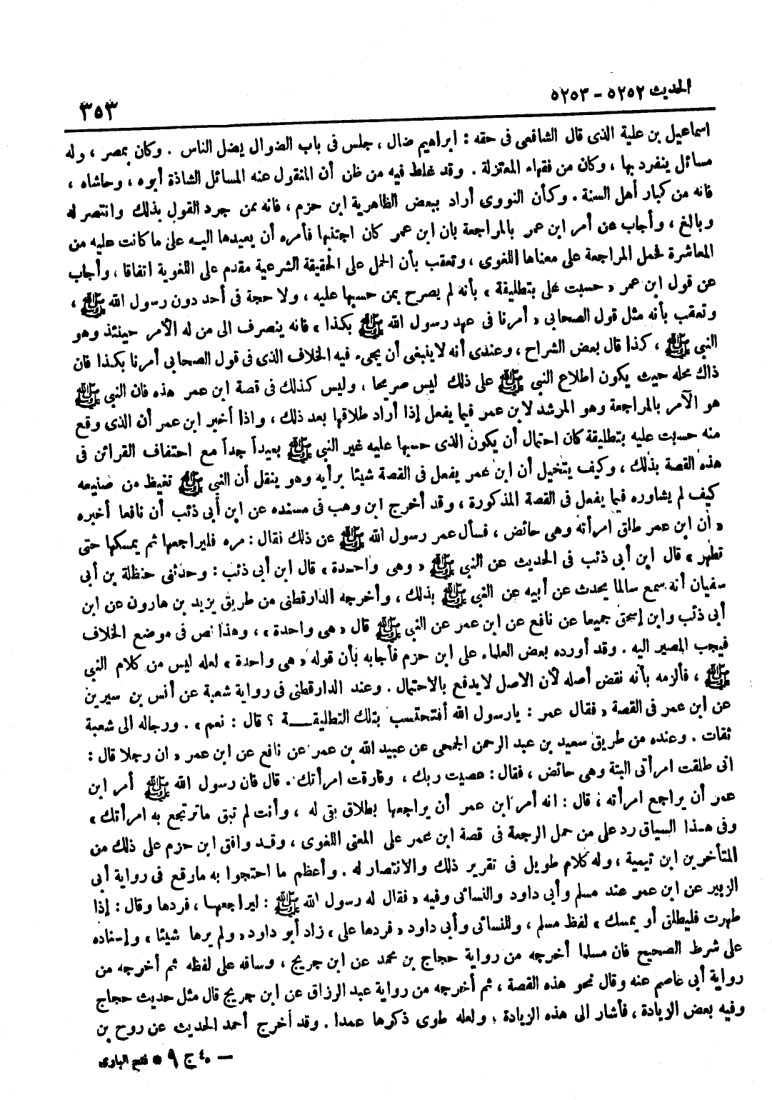 إِسْمَاعِيلَ بْنِ عُلَيَّةَ الَّذِي قَالَ الشَّافِعِيُّ فِي حَقِّهِ إِبْرَاهِيمُ ضَالٌّ جَلَسَ فِي بَابِ الضَّوَالِّ يُضِلُّ النَّاسَ وَكَانَ بِمِصْرَ وَلَهُ مَسَائِلُ يَنْفَرِدُ بِهَا وَكَانَ مِنْ فُقَهَاءِ الْمُعْتَزِلَةِ وَقَدْ غَلِطَ فِيهِ مَنْ ظَنَّ أَنَّ الْمَنْقُولَ عَنْهُ الْمَسَائِلُ الشَّاذَّةُ أَبُوهُ وَحَاشَاهُ فَإِنَّهُ مِنْ كِبَارِ أَهْلِ السّنة وَكَأن النَّوَوِيّ أَرَادَ بِبَعْض الظَّاهِرِيَّة بن حَزْمٍ فَإِنَّهُ مِمَّنْ جَرَّدَ الْقَوْلَ بِذَلِكَ وَانْتَصَرَ لَهُ وَبَالغ وَأجَاب عَن أَمر بن عمر بالمراجعة بَان بن عُمَرَ كَانَ اجْتَنَبَهَا فَأَمَرَهُ أَنْ يُعِيدَهَا إِلَيْهِ عَلَى مَا كَانَتْ عَلَيْهِ مِنَ الْمُعَاشَرَةِ فَحَمَلَ الْمُرَاجَعَةَ عَلَى مَعْنَاهَا اللُّغَوِيِّ وَتُعُقِّبَ بِأَنَّ الْحَمْلَ عَلَى الْحَقِيقَةِ الشَّرْعِيَّةِ مُقَدَّمٌ عَلَى اللُّغَوِيَّةِ اتِّفَاقًا وَأجَاب عَن قَول بن عُمَرَ حُسِبَتْ عَلَيَّ بِتَطْلِيقَةٍ بِأَنَّهُ لَمْ يُصَرِّحْ بِمَنْ حَسَبَهَا عَلَيْهِ وَلَا حُجَّةَ فِي أَحَدٍ دُونَ رَسُولِ اللَّهِ صَلَّى اللَّهُ عَلَيْهِ وَسَلَّمَ وَتُعُقِّبَ بِأَنَّهُ مِثْلُ قَوْلِ الصَّحَابِيِّ أُمِرْنَا فِي عَهْدِ رَسُولِ اللَّهِ صَلَّى اللَّهُ عَلَيْهِ وَسَلَّمَ بِكَذَا فَإِنَّهُ يَنْصَرِفُ إِلَى مَنْ لَهُ الْأَمْرُ حِينَئِذٍ وَهُوَ النَّبِيِّ صَلَّى اللَّهُ عَلَيْهِ وَسَلَّمَ كَذَا قَالَ بَعْضُ الشُّرَّاحِ وَعِنْدِي أَنَّهُ لَا يَنْبَغِي أَنْ يَجِئَ فِيهِ الْخِلَافُ الَّذِي فِي قَوْلِ الصَّحَابِيِّ أُمِرْنَا بِكَذَا فَإِنَّ ذَاكَ مَحَلُّهُ حَيْثُ يَكُونُ اطِّلَاعُ النَّبِيِّ صَلَّى اللَّهُ عَلَيْهِ وَسَلَّمَ عَلَى ذَلِكَ لَيْسَ صَرِيحًا وَلَيْسَ كَذَلِكَ فِي قصَّة بن عُمَرَ هَذِهِ فَإِنَّ النَّبِيَّ صَلَّى اللَّهُ عَلَيْهِ وَسَلَّمَ هُوَ الْآمِرُ بِالْمُرَاجَعَةِ وَهُوَ الْمُرْشِدُ لِابْنِ عُمَرَ فِيمَا يَفْعَلُ إِذَا أَرَادَ طَلَاقَهَا بَعْدَ ذَلِك وَإِذا أخبر بن عُمَرَ أَنَّ الَّذِي وَقَعَ مِنْهُ حُسِبَتْ عَلَيْهِ بِتَطْلِيقَةٍ كَانَ احْتِمَالُ أَنْ يَكُونَ الَّذِي حَسَبَهَا عَلَيْهِ غَيْرَ النَّبِيِّ صَلَّى اللَّهُ عَلَيْهِ وَسَلَّمَ بَعِيدًا جِدًّا مَعَ احْتِفَافِ الْقَرَائِنِ فِي هَذِهِ الْقِصَّة بذلك وَكَيف يتخيل أَن بن عُمَرَ يَفْعَلُ فِي الْقِصَّةِ شَيْئًا بِرَأْيِهِ وَهُوَ يُنْقَلْ أَنَّ النَّبِيَّ صَلَّى اللَّهُ عَلَيْهِ وَسَلَّمَ تَغَيَّظَ مِنْ صَنِيعِهِ كَيْفَ لَمْ يُشَاوِرْهُ فِيمَا يفعل فِي الْقِصَّة الْمَذْكُورَة وَقد أخرج بن وهب فِي مُسْنده عَن بن أبي ذِئْب أَن نَافِعًا أخبرهُ أَن بن عُمَرَ طَلَّقَ امْرَأَتَهُ وَهِيَ حَائِضٌ فَسَأَلَ عُمَرُ رَسُولِ اللَّهِ صَلَّى اللَّهُ عَلَيْهِ وَسَلَّمَ عَنْ ذَلِكَ فَقَالَ مُرْهُ فَلْيُرَاجِعْهَا ثُمَّ يُمْسِكْهَا حَتَّى تطهر قَالَ بن أَبِي ذِئْبٍ فِي الْحَدِيثَ عَنِ النَّبِيِّ صَلَّى اللَّهُ عَلَيْهِ وَسَلَّمَ وَهِي وَاحِدَة قَالَ بن أَبِي ذِئْبٍ وَحَدَّثَنِي حَنْظَلَةُ بْنُ أَبِي سُفْيَانَ أَنَّهُ سَمِعَ سَالِمًا يُحَدِّثُ عَنْ أَبِيهِ عَنِ النَّبِيِّ صَلَّى اللَّهُ عَلَيْهِ وَسَلَّمَ بِذَلِكَ وَأَخْرَجَهُ الدَّارَقُطْنِيُّ مِنْ طَرِيقِ يَزِيدَ بْنِ هَارُونَ عَنِ بن أبي ذِئْب وبن إِسْحَاق جَمِيعًا عَن نَافِع عَن بْنِ عُمَرَ عَنِ النَّبِيِّ صَلَّى اللَّهُ عَلَيْهِ وَسَلَّمَ قَالَ هِيَ وَاحِدَةٌ وَهَذَا نَصٌّ فِي مَوْضِعِ الْخِلَافِ فَيَجِبُ الْمَصِيرُ إِلَيْهِ وَقَدْ أَوْرَدَهُ بَعْضُ الْعلمَاء على بن حَزْمٍ فَأَجَابَهُ بِأَنَّ قَوْلَهُ هِيَ وَاحِدَةٌ لَعَلَّهُ لَيْسَ مِنْ كَلَامِ النَّبِيِّ صَلَّى اللَّهُ عَلَيْهِ وَسَلَّمَ فَأَلْزَمَهُ بِأَنَّهُ نَقَضَ 