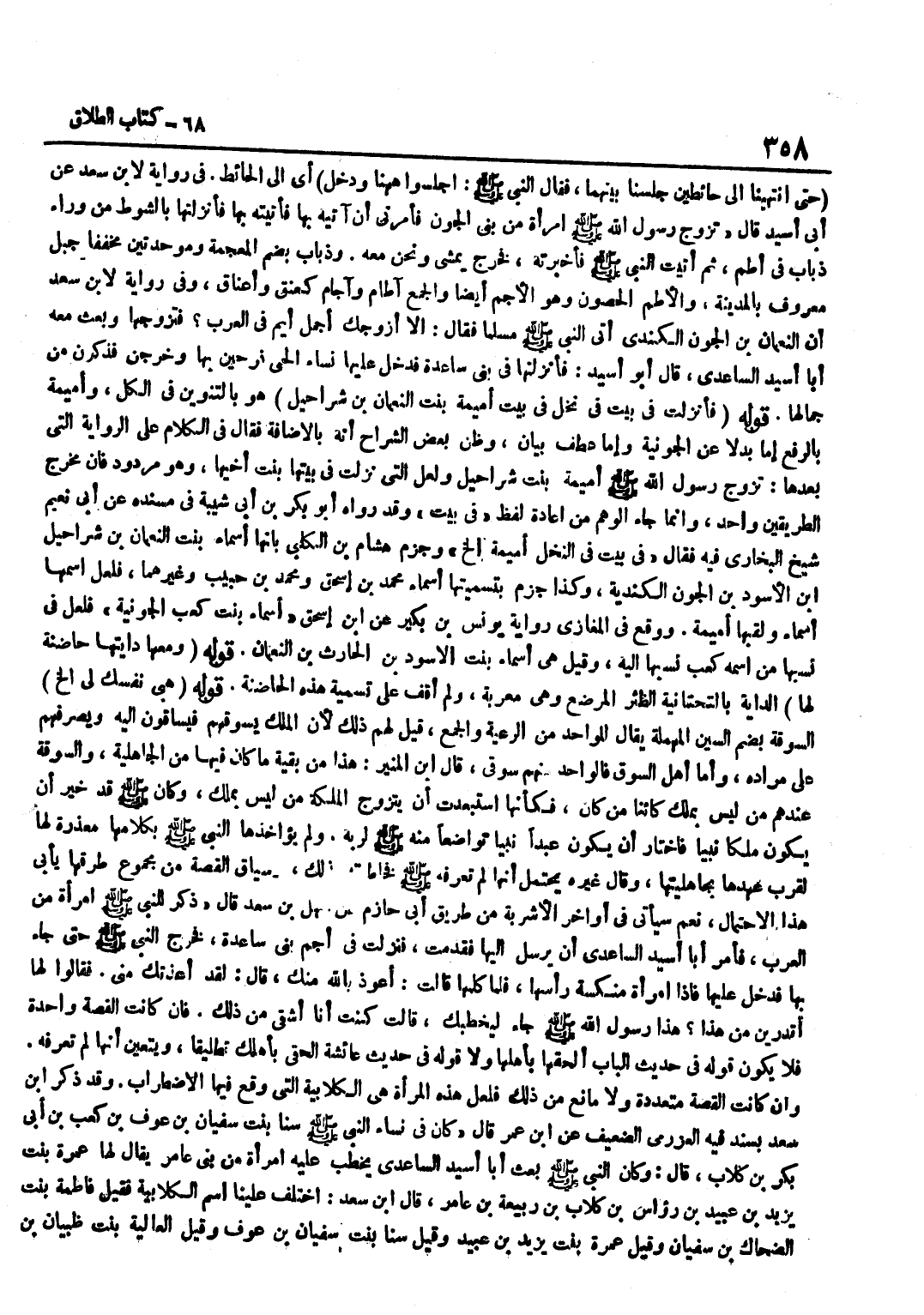 حَتَّى انْتَهَيْنَا إِلَى حَائِطِينَ جَلَسْنَا بَيْنَهُمَا فَقَالَ النَّبِي صلى الله عَلَيْهِ وَسلم اجلسوا هَا هُنَا وَدخل أَي إِلَى الْحَائِط فِي رِوَايَةٍ لِابْنِ سَعْدٍ عَنْ أَبِي أُسَيْدٍ قَالَ تَزَوَّجَ رَسُولِ اللَّهِ صَلَّى اللَّهُ عَلَيْهِ وَسَلَّمَ امْرَأَةٌ مِنْ بَنِي الْجَوْنِ فَأَمَرَنِي أَنْ آتِيَهُ بِهَا فَأَتَيْتُهُ بِهَا فَأَنْزَلْتُهَا بِالشَّوْطِ مِنْ وَرَاءِ ذُبَابٍ فِي أُطُمٍ ثُمَّ أَتَيْتُ النَّبِيَّ صَلَّى اللَّهُ عَلَيْهِ وَسَلَّمَ فَأَخْبَرْتُهُ فَخَرَجَ يَمْشِي وَنَحْنُ مَعَهُ وَذُبَابٌ بِضَمِّ الْمُعْجَمَةِ وَمُوَحَّدَتَيْنِ مُخَفَّفًا جَبَلٌ مَعْرُوفٌ بِالْمَدِينَةِ وَالْأُطُمُ الْحُصُونُ وَهُوَ الْأُجُمُ أَيْضًا وَالْجَمْعُ آطَامٌ وَآجَامٌ كَعُنُقٍ وَأَعْنَاقٍ وَفِي رِوَايَةٍ لِابْنِ سَعْدٍ أَنَّ النُّعْمَانَ بْنَ الْجَوْنِ الْكِنْدِيَّ أَتَى النَّبِيَّ صَلَّى اللَّهُ عَلَيْهِ وَسَلَّمَ مُسْلِمًا فَقَالَ أَلَا أُزَوِّجُكَ أَجْمَلَ أَيِّمٍ فِي الْعَرَبِ فَتَزَوَّجَهَا وَبَعَثَ مَعَهُ أَبَا أُسَيْدٍ السَّاعِدِيِّ قَالَ أَبُو أُسَيْدٍ فَأَنْزَلْتُهَا فِي بَنِي سَاعِدَةَ فَدَخَلَ عَلَيْهَا نِسَاءُ الْحَيِّ فَرِحِينَ بِهَا وَخَرَجْنَ فَذَكَرْنَ مِنْ جَمَالِهَا قَوْلُهُ فَأُنْزِلَتْ فِي بَيْتٍ فِي نَخْلٍ فِي بَيْتٍ أُمَيْمَةُ بِنْتُ النُّعْمَانِ بْنِ شَرَاحِيلَ هُوَ بِالتَّنْوِينِ فِي الْكُلِّ وَأُمَيْمَةُ بِالرَّفْعِ إِمَّا بَدَلًا عَنِ الْجَوْنِيَّةِ وَإِمَّا عَطْفُ بَيَانٍ وَظَنَّ بَعْضُ الشُّرَّاحِ أَنَّهُ بِالْإِضَافَةِ فَقَالَ فِي الْكَلَامِ عَلَى الرِّوَايَةِ الَّتِي بَعْدَهَا تَزَوَّجَ رَسُولُ اللَّهِ صَلَّى اللَّهُ عَلَيْهِ وَسَلَّمَ أُمَيْمَةَ بِنْتَ شَرَاحِيلَ وَلَعَلَّ الَّتِي نَزَلَتْ فِي بَيْتِهَا بِنْتُ أَخِيهَا وَهُوَ مَرْدُودٌ فَإِنَّ مَخْرَجُ الطَّرِيقِينَ وَاحِدٌ وَإِنَّمَا جَاءَ الْوَهْمُ مِنْ إِعَادَةِ لَفْظِ فِي بَيْتِ وَقَدْ رَوَاهُ أَبُو بَكْرِ بْنُ أَبِي شَيْبَةَ فِي مُسْنَدِهِ عَنْ أَبِي نُعَيْمٍ شَيْخِ الْبُخَارِيِّ فِيهِ فَقَالَ فِي بَيْتٍ فِي النَّخْلِ أُمَيْمَةُ إِلَخْ وَجَزَمَ هِشَامُ بْنُ الْكَلْبِيِّ بِأَنَّهَا أَسْمَاءُ بِنْتُ النُّعْمَانِ بْنِ شَرَاحِيلَ بْنِ الْأَسْوَدِ بْنِ الْجَوْنِ الْكِنْدِيَّةُ وَكَذَا جَزَمَ بِتَسْمِيَتِهَا أَسْمَاءَ مُحَمَّدُ بْنُ إِسْحَاقَ وَمُحَمَّدُ بْنُ حَبِيبٍ وَغَيْرُهُمَا فَلَعَلَّ اسْمَهَا أَسْمَاءُ وَلَقَبَهَا أُمَيْمَةُ وَوَقَعَ فِي الْمَغَازِي رِوَايَة يُونُس بن بكير عَن بن إِسْحَاقَ أَسْمَاءُ بِنْتُ كَعْبٍ الْجَوْنِيَّةُ فَلَعَلَّ فِي نَسَبِهَا مِنِ اسْمِهِ كَعْبٍ نَسَبَهَا إِلَيْهِ وَقِيلَ هِيَ أَسْمَاءُ بِنْتُ الْأَسْوَدِ بْنِ الْحَارِثِ بْنِ النُّعْمَانِ قَوْلُهُ وَمَعَهَا دَايَتُهَا حَاضِنَةً لَهَا الدَّايَةُ بِالتَّحْتَانِيَّةِ الظِّئْرُ الْمُرْضِعُ وَهِيَ مُعَرَّبَةٌ وَلَمْ أَقِفْ عَلَى تَسْمِيَةِ هَذِهِ الْحَاضِنَةِ قَوْلُهُ هَبِي نَفْسَكِ لِي إِلَخْ السُّوقَةُ بِضَمِّ السِّينِ الْمُهْمَلَةِ يُقَالُ لِلْوَاحِدِ مِنَ الرَّعِيَّةِ وَالْجَمْعِ قِيلَ لَهُمْ ذَلِكَ لِأَنَّ الْمَلِكَ يَسُوقُهُمْ فَيُسَاقُونَ إِلَيْهِ وَيَصْرِفُهُمْ عَلَى مُرَادِهِ وَأَمَّا أَهْلُ السُّوقِ فَالْوَاحِدُ مِنْهُمْ سُوقِيٌّ قَالَ بن الْمُنِيرِ هَذَا مِنْ بَقِيَّةِ مَا كَانَ فِيهَا مِنَ الْجَاهِلِيَّةِ وَالسُّوقَةُ عِنْدَهُمْ مَنْ لَيْسَ بِمَلِكٍ كَائِنًا مَنْ كَانَ فَكَأَنَّهَا اسْتَبْعَدَتْ أَنْ يَتَزَوَّجَ الْمَلِكَةَ مَنْ لَيْسَ بِمَلِكٍ وَكَانَ صَلَّى اللَّهُ عَلَيْهِ وَسَلَّمَ قَدْ خُيِّرَ أَنْ يَكُونَ مَلِكًا نَبِيًّا فَاخْتَارَ أَنْ يَكُونَ عَبْدًا 