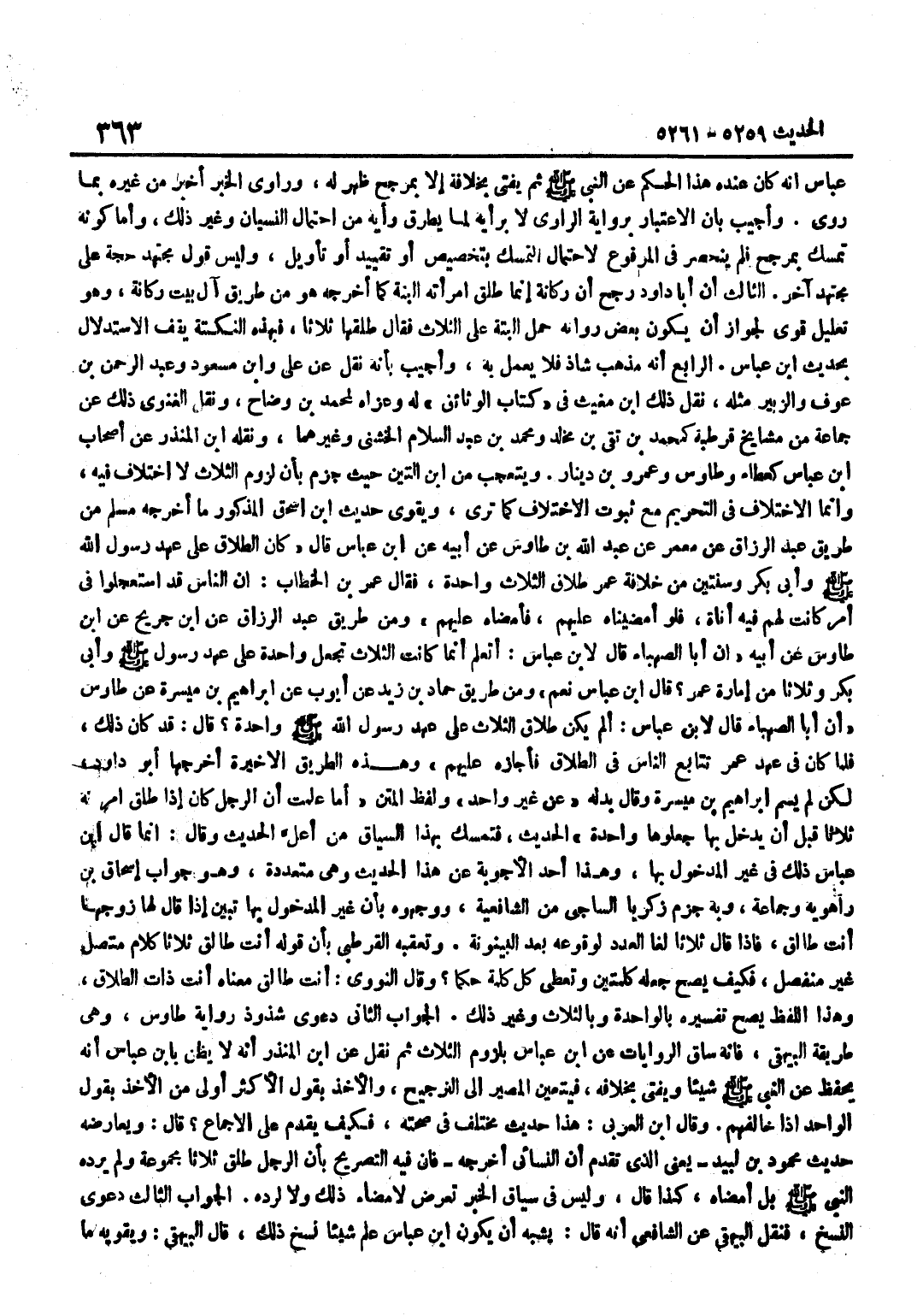 عَبَّاس أَنه كَانَ عِنْده هذاالحكم عَنِ النَّبِيِّ صَلَّى اللَّهُ عَلَيْهِ وَسَلَّمَ ثُمَّ يُفْتِي بِخِلَافِهِ إِلَّا بِمُرَجِّحٍ ظَهَرَ لَهُ وَرَاوِي الْخَبَرِ أَخْبَرُ مِنْ غَيْرِهِ بِمَا رَوَى وَأُجِيبُ بِأَنَّ الِاعْتِبَارَ بِرِوَايَةِ الرَّاوِي لَا بِرَأْيِهِ لِمَا يَطْرُقُ رَأْيَهُ مِنِ احْتِمَالِ النِّسْيَانِ وَغَيْرِ ذَلِكَ وَأَمَّا كَوْنُهُ تَمَسَّكَ بِمُرَجِّحٍ فَلَمْ يَنْحَصِرْ فِي الْمَرْفُوعِ لِاحْتِمَالِ التَّمَسُّكِ بِتَخْصِيصٍ أَوْ تَقْيِيدٍ أَوْ تَأْوِيلٍ وَلَيْسَ قَوْلُ مُجْتَهِدٍ حُجَّةً عَلَى مُجْتَهِدٍ آخَرَ الثَّالِثُ أَنَّ أَبَا دَاوُدَ رَجَّحَ أَنَّ رُكَانَةَ إِنَّمَا طَلَّقَ امْرَأَتَهُ أَلْبَتَّةَ كَمَا أَخْرَجَهُ هُوَ مِنْ طَرِيقِ آلِ بَيْتِ رُكَانَةَ وَهُوَ تَعْلِيلٌ قَوِيٌّ لِجَوَازِ أَنْ يَكُونَ بَعْضُ رُوَاتِهِ حَمَلَ أَلْبَتَّةَ عَلَى الثَّلَاثِ فَقَالَ طَلَّقَهَا ثَلَاثًا فبهذه النُّكْتَة يقف الِاسْتِدْلَال بِحَدِيث بن عَبَّاسٍ الرَّابِعُ أَنَّهُ مَذْهَبٌ شَاذٌّ فَلَا يُعْمَلُ بِهِ وَأجِيب بِأَنَّهُ نقل عَن عَليّ وبن مَسْعُودٍ وَعَبْدِ الرَّحْمَنِ بْنِ عَوْفٍ وَالزُّبَيْرِ مِثْلُهُ نقل ذَلِك بن مُغِيثٍ فِي كِتَابِ الْوَثَائِقِ لَهُ وَعَزَاهُ لِمُحَمَّدِ بْنِ وَضَّاحٍ وَنَقَلَ الْغَنَوِيُّ ذَلِكَ عَنْ جَمَاعَةٍ مِنْ مَشَايِخِ قُرْطُبَةَ كَمُحَمَّدِ بْنِ تَقِيِّ بْنِ مَخْلَدٍ وَمُحَمَّدِ بْنِ عَبْدِ السَّلَامِ الْخُشَنِيِّ وَغَيْرِهِمَا وَنَقله بن الْمُنْذر عَن أَصْحَاب بن عَبَّاسٍ كَعَطَاءٍ وَطَاوُسٍ وَعَمْرِو بْنِ دِينَارٍ وَيُتَعَجَّبُ من بن التِّينِ حَيْثُ جَزَمَ بِأَنَّ لُزُومَ الثَّلَاثِ لَا اخْتِلَافَ فِيهِ وَإِنَّمَا الِاخْتِلَافُ فِي التَّحْرِيمِ مَعَ ثُبُوت الِاخْتِلَاف كَمَا ترى ويقوى حَدِيث بن إِسْحَاقَ الْمَذْكُورَ مَا أَخْرَجَهُ مُسْلِمٌ مِنْ طَرِيقِ عَبْدِ الرَّزَّاقِ عَنْ مَعْمَرٍ عَنْ عَبْدِ اللَّهِ بْنِ طَاوُسٍ عَنْ أَبِيهِ عَن بن عَبَّاسٍ قَالَ كَانَ الطَّلَاقُ عَلَى عَهْدِ رَسُولِ اللَّهِ صَلَّى اللَّهُ عَلَيْهِ وَسَلَّمَ وَأَبِي بَكْرٍ وَسَنَتَيْنِ مِنْ خِلَافَةِ عُمَرَ طَلَاقُ الثَّلَاثِ وَاحِدَةً فَقَالَ عُمَرُ بْنُ الْخَطَّابِ إِنَّ النَّاسَ قَدِ اسْتَعْجَلُوا فِي أَمْرٍ كَانَتْ لَهُمْ فِيهِ أَنَاةٌ فَلَوْ أَمْضَيْنَاهُ عَلَيْهِمْ فَأَمْضَاهُ عَلَيْهِمْ وَمِنْ طَرِيقِ عبد الرَّزَّاق عَن بن جريج عَن بن طَاوُسٍ عَنْ أَبِيهِ أَنَّ أَبَا الصَّهْبَاءِ قَالَ لِابْنِ عَبَّاسٍ أَتَعْلَمُ إِنَّمَا كَانَتِ الثَّلَاثُ تُجْعَلُ وَاحِدَةً عَلَى عَهْدِ رَسُولِ اللَّهِ صَلَّى اللَّهُ عَلَيْهِ وَسَلَّمَ وَأَبِي بَكْرٍ وَثَلَاثًا مِنْ إِمَارَةِ عمر قَالَ بن عَبَّاسٍ نَعَمْ وَمِنْ طَرِيقِ حَمَّادِ بْنِ زَيْدٍ عَنْ أَيُّوبَ عَنْ إِبْرَاهِيمَ بْنِ مَيْسَرَةَ عَنْ طَاوُسٍ أَنَّ أَبَا الصَّهْبَاءِ قَالَ لِابْنِ عَبَّاسٍ أَلَمِ يَكُنْ طَلَاقُ الثَّلَاثِ عَلَى عَهْدِ رَسُولِ اللَّهِ صَلَّى اللَّهُ عَلَيْهِ وَسَلَّمَ وَاحِدَةً قَالَ قَدْ كَانَ ذَلِكَ فَلَمَّا كَانَ فِي عَهْدِ عُمَرَ تَتَابَعَ النَّاسُ فِي الطَّلَاقِ فَأَجَازَهُ عَلَيْهِمْ وَهَذِهِ الطَّرِيقُ الْأَخِيرَةُ أَخْرَجَهَا أَبُو دَاوُدَ لَكِنْ لَمْ يُسَمِّ إِبْرَاهِيمَ بْنَ مَيْسَرَةَ وَقَالَ بَدَلَهُ عَنْ غَيْرِ وَاحِدٍ وَلَفْظُ الْمَتْنِ أَمَا عَلِمْتَ أَنَّ الرَّجُلَ كَانَ إِذَا طَلَّقَ امْرَأَتَهُ ثَلَاثًا قَبْلَ أَنْ يَدْخُلَ بِهَا جَعَلُوهَا وَاحِدَةً الْحَدِيثَ فَتَمَسَّكَ بِهَذَا السِّيَاقِ مَنْ أَعَلَّ الْحَدِيثَ وَقَالَ إِنَّمَا قَالَ بن عَبَّاسٍ ذَلِكَ فِي غَيْرِ الْمَدْخُولِ بِهَا وَهَذَا أَحَدُ الْأَجْوِبَةِ عَنْ هَذَا الْحَدِيثِ وَهِيَ م