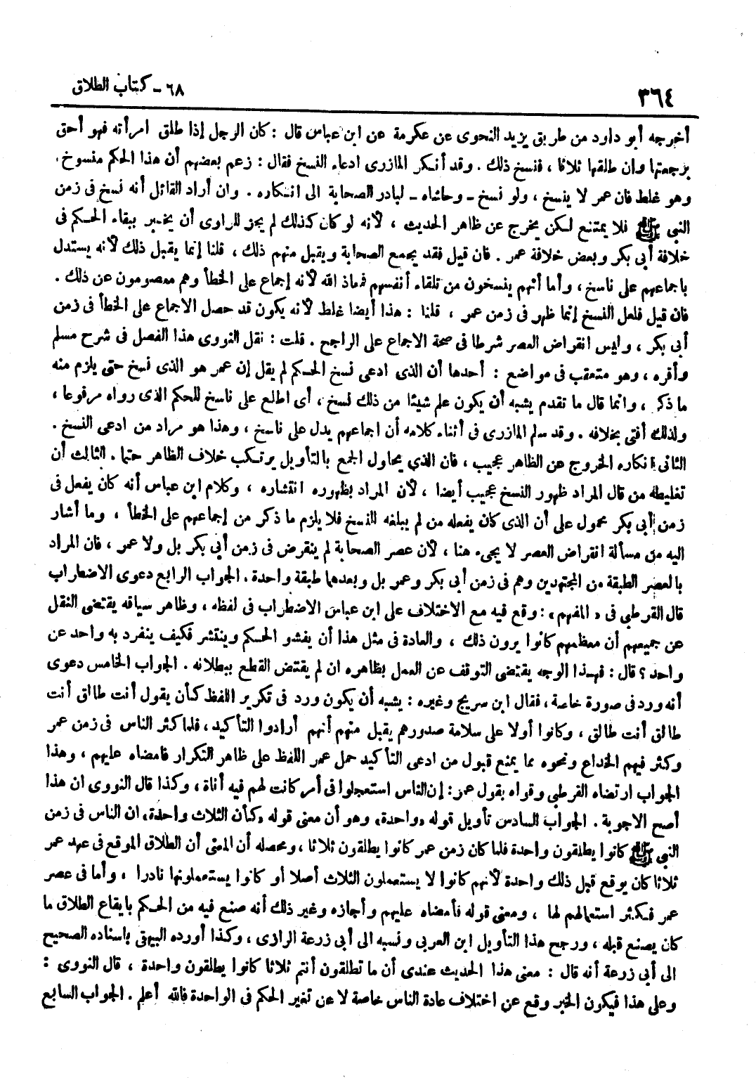 أَخْرَجَهُ أَبُو دَاوُدَ مِنْ طَرِيقِ يَزِيدَ النَّحْوِيِّ عَنْ عِكْرِمَةَ عَنِ بن عَبَّاسٍ قَالَ كَانَ الرَّجُلُ إِذَا طَلَّقَ امْرَأَتَهُ فَهُوَ أَحَقُّ بِرَجْعَتِهَا وَإِنْ طَلَّقَهَا ثَلَاثًا فَنُسِخَ ذَلِكَ وَقَدْ أَنْكَرَ الْمَازِرِيُّ ادِّعَاءَ النَّسْخِ فَقَالَ زعم بَعضهم أَن هذاالحكم مَنْسُوخٌ وَهُوَ غَلَطٌ فَإِنَّ عُمَرَ لَا يَنْسَخُ وَلَوْ نَسَخَ وَحَاشَاهُ لَبَادَرَ الصَّحَابَةُ إِلَى إِنْكَارِهِ وَإِنْ أَرَادَ الْقَائِلُ أَنَّهُ نُسِخَ فِي زَمَنِ النَّبِيِّ صَلَّى اللَّهُ عَلَيْهِ وَسَلَّمَ فَلَا يَمْتَنِعُ لَكِنْ يَخْرُجُ عَنْ ظَاهِرِ الْحَدِيثِ لِأَنَّهُ لَوْ كَانَ كَذَلِكَ لَمْ يَجُزْ لِلرَّاوِي أَنْ يُخْبِرَ بِبَقَاءِ الْحُكْمِ فِي خِلَافَةِ أَبِي بَكْرٍ وَبَعْضِ خِلَافَةِ عُمَرَ فَإِنْ قِيلَ فَقَدْ يُجْمِعُ الصَّحَابَةُ وَيُقْبَلُ مِنْهُمْ ذَلِكَ قُلْنَا إِنَّمَا يُقْبَلُ ذَلِكَ لِأَنَّهُ يُسْتَدَلُّ بِإِجْمَاعِهِمْ عَلَى نَاسِخٍ وَأَمَّا أَنَّهُمْ يَنْسَخُونَ مِنْ تِلْقَاءِ أَنْفُسِهِمْ فَمَعَاذَ اللَّهِ لِأَنَّهُ إِجْمَاعٌ عَلَى الْخَطَأِ وَهُمْ مَعْصُومُونَ عَنْ ذَلِكَ فَإِنْ قِيلَ فَلَعَلَّ النَّسْخَ إِنَّمَا ظَهَرَ فِي زَمَنِ عُمَرَ قُلْنَا هَذَا أَيْضًا غَلَطٌ لِأَنَّهُ يَكُونُ قَدْ حَصَلَ الْإِجْمَاعُ عَلَى الْخَطَأِ فِي زَمَنِ أَبِي بَكْرٍ وَلَيْسَ انْقِرَاضُ الْعَصْرِ شَرْطًا فِي صِحَّةِ الْإِجْمَاعِ عَلَى الرَّاجِحِ قُلْتُ نَقَلَ النَّوَوِيُّ هَذَا الْفَصْلَ فِي شَرْحِ مُسْلِمٍ وَأَقَرَّهُ وَهُوَ مُتَعَقَّبٌ فِي مَوَاضِعَ أَحَدُهَا أَنَّ الَّذِي ادَّعَى نَسْخَ الْحُكْمِ لَمْ يَقُلْ إِنَّ عُمَرَ هُوَ الَّذِي نَسَخَ حَتَّى يَلْزَمَ مِنْهُ مَا ذُكِرَ وَإِنَّمَا قَالَ مَا تَقَدَّمَ يُشْبِهُ أَنْ يَكُونَ عَلِمَ شَيْئًا مِنْ ذَلِكَ نَسَخَ أَيِ اطَّلَعَ عَلَى نَاسِخٍ لِلْحُكْمِ الَّذِي رَوَاهُ مَرْفُوعًا وَلِذَلِكَ أَفْتَى بِخِلَافِهِ وَقَدْ سَلَّمَ الْمَازِرِيُّ فِي أَثْنَاءِ كَلَامِهِ أَنَّ إِجْمَاعَهُمْ يَدُلُّ عَلَى نَاسِخٍ وَهَذَا هُوَ مُرَادُ مَنِ ادَّعَى النَّسْخَ الثَّانِي إِنْكَارُهُ الْخُرُوجَ عَنِ الظَّاهِرِ عَجِيبٌ فَإِنَّ الَّذِي يُحَاوِلُ الْجَمْعَ بِالتَّأْوِيلِ يَرْتَكِبُ خِلَافَ الظَّاهِرِ حَتْمًا الثَّالِثُ أَنَّ تَغْلِيطَهُ مَنْ قَالَ الْمُرَادُ ظُهُورُ النَّسْخِ عَجِيبٌ أَيْضًا لِأَنَّ الْمُرَادَ بِظُهُورِهِ انْتِشَارُهُ وَكَلَام بن عَبَّاسٍ أَنَّهُ كَانَ يُفْعَلُ فِي زَمَنِ أَبِي بَكْرٍ مَحْمُولٌ عَلَى أَنَّ الَّذِي كَانَ يَفْعَلُهُ مَنْ لَمْ يَبْلُغْهُ النَّسْخُ فَلَا يَلْزَمُ مَا ذُكِرَ مِنْ إِجْمَاعِهِمْ عَلَى الْخَطَأِ وَمَا أَشَارَ إِلَيْهِ مِنْ مَسْأَلَةِ انْقِرَاضِ الْعَصْرِ لَا يَجِئُ هُنَا لِأَنَّ عَصْرَ الصَّحَابَةِ لَمْ يَنْقَرِضْ فِي زَمَنِ أَبِي بَكْرٍ بَلْ وَلَا عُمَرَ فَإِنَّ الْمُرَادَ بِالْعَصْرِ الطَّبَقَةُ مِنَ الْمُجْتَهِدِينَ وَهُمْ فِي زَمَنِ أَبِي بَكْرٍ وَعُمَرَ بَلْ وَبَعْدَهُمَا طَبَقَةٌ وَاحِدَةٌ الْجَوَابُ الرَّابِعُ دَعْوَى الِاضْطِرَابِ قَالَ الْقُرْطُبِيُّ فِي الْمُفْهِمِ وَقَعَ فِيهِ مَعَ الِاخْتِلَافِ عَلَى بن عَبَّاسٍ الِاضْطِرَابَ فِي لَفْظِهِ وَظَاهِرُ سِيَاقِهِ يَقْتَضِي النَّقْلَ عَنْ جَمِيعِهِمْ أَنَّ مُعْظَمَهُمْ كَانُوا يَرَوْنَ ذَلِكَ وَالْعَادَةُ فِي مِثْلِ هَذَا أَنْ يَفْشُوَ الْحُكْمَ وَيَنْتَشِرَ فَكَيْفَ يَنْفَرِدُ بِهِ وَاحِدٌ عَنْ وَاحِدٍ قَالَ فَهَذَا الْوَجْهُ يَقْتَضِي التَّوَقُّفَ عَنِ الْعَمَلِ بِظَاهِرِهِ إِنْ لَمْ يَقْتَضِ الْقَطْعَ بِبُطْلَانِهِ الْجَوَابُ الْخَامِسُ دَعْوَى أَنَّهُ وَرَدَ فِي صُورَةٍ خَاصَّة فَقَالَ بن سُرَيْجٍ وَغَيْرُه
