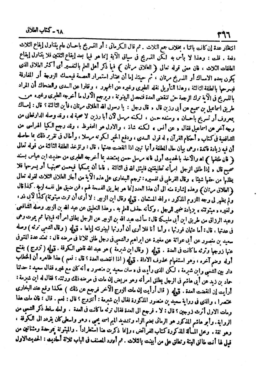 انْتِظَارِ عِدَّةٍ إِنْ كَانَتْ بَائِنًا بِخِلَافِ جَمْعِ الثَّلَاثِ ثُمَّ قَالَ الْكِرْمَانِيُّ أَوِ التَّسْرِيحُ بِإِحْسَانٍ عَامٌّ يَتَنَاوَلُ إِيقَاعَ الثَّلَاثِ دَفْعَةً قُلْتُ وَهَذَا لَا بَأْسَ بِهِ لَكِنَّ التَّسْرِيحَ فِي سِيَاقِ الْآيَةِ إِنَّمَا هُوَ فِيمَا بَعْدَ إِيقَاعِ الثِّنْتَيْنِ فَلَا يَتَنَاوَلُ إِيقَاعَ الطَّلْقَاتِ الثَّلَاثِ فَإِنَّ مَعْنَى قَوْله تَعَالَى الطَّلَاق مَرَّتَانِ فِيمَا ذَكَرَ أَهْلُ الْعِلْمِ بِالتَّفْسِيرِ أَيْ أَكْثَرُ الطَّلَاقِ الَّذِي يَكُونُ بَعْدَهُ الْإِمْسَاكُ أَوِ التَّسْرِيحُ مَرَّتَانِ ثُمَّ حِينَئِذٍ إِمَّا أَنْ يَخْتَارَ اسْتِمْرَارَ الْعِصْمَةِ فَيُمْسِكَ الزَّوْجَةَ أَوِ الْمُفَارَقَةَ فَيُسَرِّحُهَا بِالطَّلْقَةِ الثَّالِثَةِ وَهَذَا التَّأْوِيلُ نَقَلَهُ الطَّبَرِيُّ وَغَيْرُهُ عَنِ الْجُمْهُورِ وَنَقَلُوا عَنِ السُّدِّيِّ وَالضَّحَّاكِ أَنَّ الْمُرَادَ بِالتَّسْرِيحِ فِي الْآيَةِ تَرْكُ الرَّجْعَةِ حَتَّى تَنْقَضِيَ الْعِدَّةُ فَتَحْصُلَ الْبَيْنُونَةُ وَيُرَجِّحُ الْأَوَّلَ مَا أَخْرَجَهُ الطَّبَرِيُّ وَغَيْرُهُ مِنْ طَرِيقِ إِسْمَاعِيلَ بْنِ سُمَيْعٍ عَنْ أَبِي رَزِينٍ قَالَ قَالَ رَجُلٌ يَا رَسُولَ اللَّهِ الطَّلَاقُ مَرَّتَانِ فَأَيْنَ الثَّالِثَةُ قَالَ إِمْسَاكٌ بِمَعْرُوفٍ أَوْ تَسْرِيحٌ بِإِحْسَانٍ وَسَنَدُهُ حَسَنٌ لَكِنَّهُ مُرْسَلٌ لِأَنَّ أَبَا رَزِينٍ لَا صُحْبَةَ لَهُ وَقَدْ وَصَلَهُ الدَّارَقُطْنِيُّ مِنْ وَجْهٍ آخَرَ عَنْ إِسْمَاعِيلَ فَقَالَ عَنْ أَنَسٍ لَكِنَّهُ شَاذٌّ وَالْأَوَّلُ هُوَ الْمَحْفُوظُ وَقَدْ رَجَّحَ الْكِيَا الْهَرَّاسِيُّ مِنَ الشَّافِعِيَّةِ فِي كِتَابِ أَحْكَامِ الْقُرْآنِ لَهُ قَوْلُ السُّدِّيِّ وَدَفَعَ الْخَبَرَ لِكَوْنِهِ مُرْسَلًا وَأَطَالَ فِي تَقْرِيرِ ذَلِكَ بِمَا حَاصِلُهُ أَنَّ فِيهِ زِيَادَةَ فَائِدَةٍ وَهِيَ بَيَانُ حَالِ الْمُطَلَّقَةِ وَأَنَّهَا تَبِينُ إِذَا انْقَضَتْ عِدَّتُهَا قَالَ وَتُؤْخَذُ الطَّلْقَةُ الثَّالِثَة من قَوْله تَعَالَى فَإِن طَلقهَا اه وَالْأَخْذُ بِالْحَدِيثِ أَوْلَى فَإِنَّهُ مُرْسَلٌ حَسَنٌ يعتضد بِمَا أخرجه الطَّبَرِيّ من حَدِيث بن عَبَّاسٍ بِسَنَدٍ صَحِيحٍ قَالَ إِذَا طَلَّقَ الرَّجُلُ امْرَأَتَهُ تَطْلِيقَتَيْنِ فَلْيَتَّقِ اللَّهَ فِي الثَّالِثَةِ فَإِمَّا أَنْ يُمْسِكَهَا فَيُحْسِنُ صُحْبَتَهَا أَوْ يُسَرِّحَهَا فَلَا يَظْلِمْهَا مِنْ حَقِّهَا شَيْئًا وَقَالَ الْقُرْطُبِيُّ فِي تَفْسِيرِهِ تَرْجَمَ الْبُخَارِيُّ عَلَى هَذِهِ الْآيَةِ مَنْ أَجَازَ الطَّلَاقَ الثَّلَاثَ لِقَوْلِهِ تَعَالَى الطَّلَاقُ مَرَّتَانِ وَهَذِهِ إِشَارَةٌ مِنْهُ إِلَى أَنَّ هَذَا الْعَدَدَ إِنَّمَا هُوَ بِطَرِيقِ الْفُسْحَةِ لَهُمْ فَمَنْ ضَيَّقَ عَلَى نَفْسِهِ لَزِمَهُ كَذَا قَالَ وَلَمْ يَظْهَرْ لِي وَجْهُ اللُّزُومِ الْمَذْكُورِ وَاللَّهُ الْمُسْتَعَانُ قَوْلُهُ وَقَالَ بن الزُّبَيْرِ لَا أَرَى أَنْ تَرِثَ مَبْتُوتَةٌ كَذَا لِأَبِي ذَرٍّ وَلِغَيْرِهِ مَبْتُوتَتُهُ بِزِيَادَةِ ضَمِيرٍ لِلرَّجُلِ وَكَأَنَّهُ حُذِفَ لِلْعِلْمِ بِهِ وَهَذَا التَّعْلِيقُ عَنْ عَبْدِ اللَّهِ بْنِ الزُّبَيْرِ وَصَلَهُ الشَّافِعِيُّ وَعَبْدُ الرَّزَّاق من طَرِيق بن أَبِي مُلَيْكَةَ قَالَ سَأَلْتُ عَبْدَ اللَّهِ بْنَ الزُّبَيْرِ عَنِ الرَّجُلِ يُطَلِّقُ امْرَأَتَهُ فَيَبُتُّهَا ثُمَّ يَمُوتُ وَهِيَ فِي عِدَّتِهَا قَالَ أَمَّا عُثْمَانُ فَوَرَّثَهَا وَأَمَّا أَنَا فَلَا أَرَى أَنْ أُوَرِّثَهَا لِبَيْنُونَتِهِ إِيَّاهَا قَوْلُهُ وَقَالَ الشَّعْبِيُّ تَرِثُهُ وَصَلَهُ سَعِيدُ بْنُ مَنْصُورٍ عَنْ أَبِي عَوَانَةَ عَنْ مُغِيرَةَ عَنْ إِبْرَاهِيمَ 