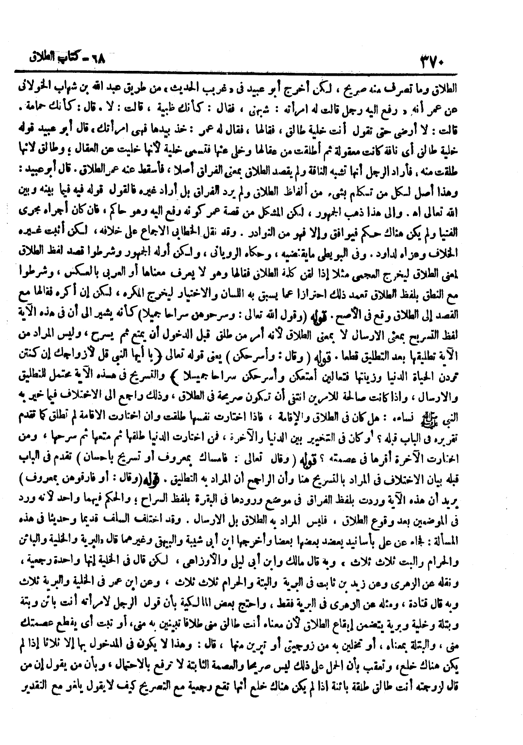 الطَّلَاقِ وَمَا تَصَرَّفَ مِنْهُ صَرِيحٌ لَكِنْ أَخْرَجَ أَبُو عُبَيْدٍ فِي غَرِيبِ الْحَدِيثِ مِنْ طَرِيقِ عَبْدِ اللَّهِ بْنِ شِهَابٍ الْخَوْلَانِيِّ عَنْ عُمَرَ أَنَّهُ رُفِعَ إِلَيْهِ رَجُلٌ قَالَتْ لَهُ امْرَأَتُهُ شَبِّهْنِي فَقَالَ كَأَنَّكِ ظَبْيَةٌ قَالَتْ لَا قَالَ كَأَنَّكِ حَمَامَةٌ قَالَتْ لَا أَرْضَى حَتَّى تَقُولَ أَنْتِ خَلِيَّةٌ طَالِقٌ فَقَالَهَا فَقَالَ لَهُ عُمَرُ خُذْ بِيَدِهَا فَهِيَ امْرَأَتُكَ قَالَ أَبُو عُبَيْدٍ قَوْلُهُ خَلِيَّةٌ طَالِقٌ أَيْ نَاقَةٌ كَانَتْ مَعْقُولَةً ثُمَّ أُطْلِقَتْ مِنْ عِقَالِهَا وَخُلِّيَ عَنْهَا فَتُسَمَّى خَلِيَّةً لِأَنَّهَا خُلِّيَتْ عَنِ الْعِقَالِ وَطَالِقٌ لِأَنَّهَا طَلُقَتْ مِنْهُ فَأَرَادَ الرَّجُلُ أَنَّهَا تُشْبِهُ النَّاقَةَ وَلَمْ يَقْصِدِ الطَّلَاقَ بِمَعْنَى الْفِرَاقِ أَصْلًا فَأَسْقَطَ عَنْهُ عُمَرُ الطَّلَاقَ قَالَ أَبُو عُبَيْدٍ وَهَذَا أَصْلٌ لِكُلِّ مَنْ تَكَلَّمَ بِشَيْءٍ مِنْ أَلْفَاظِ الطَّلَاقِ وَلَمْ يُرِدِ الْفِرَاقَ بَلْ أَرَادَ غَيْرَهُ فَالْقَوْلُ قَوْلُهُ فِيهِ فِيمَا بَيْنَهُ وَبَيْنَ اللَّهِ تَعَالَى اه وَإِلَى هَذَا ذَهَبَ الْجُمْهُورُ لَكِنَّ الْمُشْكِلَ مِنْ قِصَّةِ عُمَرَ كَوْنُهُ رُفِعَ إِلَيْهِ وَهُوَ حَاكِمٌ فَإِنْ كَانَ أَجْرَاهُ مَجْرَى الْفُتْيَا وَلَمْ يَكُنْ هُنَاكَ حُكْمٌ فَيُوَافَقُ وَإِلَّا فَهُوَ مِنَ النَّوَادِرِ وَقَدْ نَقَلَ الْخَطَّابِيُّ الْإِجْمَاعَ عَلَى خِلَافِهِ لَكِنْ أَثْبَتَ غَيْرُهُ الْخِلَافَ وَعَزَاهُ لِدَاوُدَ وَفِي الْبُوَيْطِيِّ مَا يَقْتَضِيهِ وَحَكَاهُ الرُّويَانِيُّ وَلَكِنْ أَوَّلَهُ الْجُمْهُورُ وَشَرَطُوا قَصْدَ لَفْظِ الطَّلَاقِ لِمَعْنَى الطَّلَاقِ لِيَخْرُجَ الْعَجَمِيُّ مَثَلًا إِذَا لُقِّنَ كَلِمَةَ الطَّلَاقِ فَقَالَهَا وَهُوَ لَا يَعْرِفُ مَعْنَاهَا أَوِ الْعَرَبِيُّ بِالْعَكْسِ وَشَرَطُوا مَعَ النُّطْقِ بِلَفْظِ الطَّلَاقِ تَعَمُّدَ ذَلِكَ احْتِرَازًا عَمَّا يَسْبِقُ بِهِ اللِّسَانُ وَالِاخْتِيَارُ لِيَخْرُجَ الْمُكْرَهُ لَكِنْ إِنْ أُكْرِهَ فَقَالَهَا مَعَ الْقَصْدِ إِلَى الطَّلَاقِ وَقَعَ فِي الْأَصَحِّ قَوْلُهُ وَقَوْلُ اللَّهِ تَعَالَى وَسَرِّحُوهُنَّ سَرَاحًا جَمِيلًا كَأَنَّهُ يُشِيرُ إِلَى أَنَّ فِي هَذِهِ الْآيَةِ لَفْظَ التَّسْرِيحِ بِمَعْنَى الْإِرْسَالِ لَا بِمَعْنَى الطَّلَاقِ لِأَنَّهُ أَمَرَ مَنْ طَلَّقَ قَبْلَ الدُّخُولِ أَنْ يُمَتِّعَ ثُمَّ يُسَرِّحَ وَلَيْسَ الْمُرَادُ مِنَ الْآيَةِ تَطْلِيقُهَا بَعْدَ التَّطْلِيقِ قَطْعًا قَوْلُهُ وَقَالَ وَأُسَرِّحْكُنَّ يَعْنِي قَوْله تَعَالَى يَا أَيُّهَا النَّبِيُّ قُلْ لِأَزْوَاجِكَ إِنْ كُنْتُنَّ تُرِدْنَ الْحَيَاةَ الدُّنْيَا وَزِينَتَهَا فَتَعَالَيْنَ أُمَتِّعْكُنَّ وَأُسَرِّحْكُنَّ سَرَاحًا جَمِيلًا وَالتَّسْرِيحُ فِي هَذِهِ الْآيَةِ مُحْتَمِلٌ لِلتَّطْلِيقِ وَالْإِرْسَالِ وَإِذَا كَانَتْ صَالِحَةً لِلْأَمْرَيْنِ انْتَفَى أَنْ تَكُونَ صَرِيحَةً فِي الطَّلَاقِ وَذَلِكَ رَاجِعٌ إِلَى الِاخْتِلَافِ فِيمَا خَيَّرَ بِهِ النَّبِيُّ صَلَّى اللَّهُ عَلَيْهِ وَسَلَّمَ نِسَاءَهُ هَلْ كَانَ فِي الطَّلَاقِ وَالْإِقَامَةِ فَإِذَا اخْتَارَتْ نَفْسَهَا طَلُقَتْ وَإِنِ اخْتَارَتِ الْإِقَامَةَ لَمْ تَطْلُقْ كَمَا تَقَدَّمَ تَقْرِيرُهُ فِي الْبَابِ قَبْلَهُ أَوْ كَانَ فِي التَّخْيِيرِ بَيْنَ الدُّنْيَا وَالْآخِرَةِ فَمَنِ اخْتَارَتِ الدُّنْيَا طَلَّقَهَا ثُمَّ مَتَّعَهَا ثُمَّ سَرَّحَهَا وَمَنِ اخْتَارَتِ الْآخِرَةَ أَقَرَّهَا فِي عِصْمَتِهِ قَوْلُهُ وَقَالَ تَعَالَى فَإِمْسَاكٌ بِمَعْرُوفٍ أَوْ تَسْرِيح بِإِحْسَان تَقَدَّمَ فِي الْبَابِ قَبْلَهُ بَ