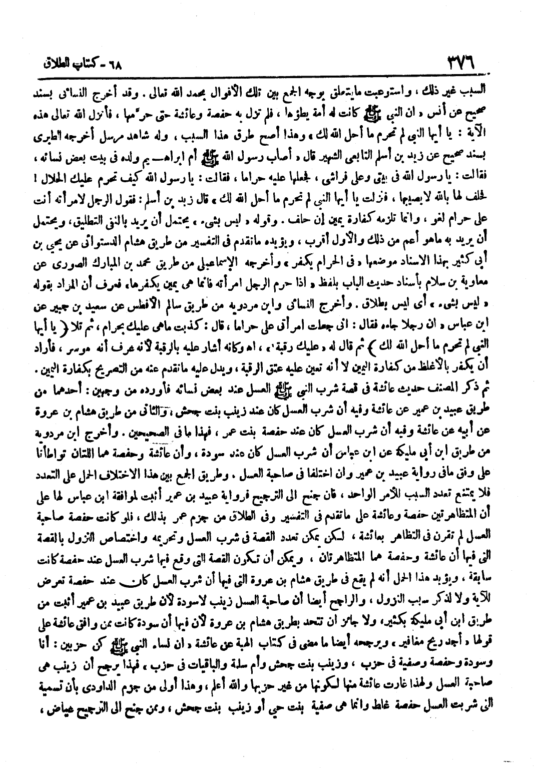السَّبَبِ غَيْرُ ذَلِكَ وَاسْتَوْعَبْتُ مَا يَتَعَلَّقُ بِوَجْهِ الْجَمْعِ بَيْنَ تِلْكَ الْأَقْوَالِ بِحَمْدِ اللَّهِ تَعَالَى وَقَدْ أَخْرَجَ النَّسَائِيُّ بِسَنَدٍ صَحِيحٍ عَنْ أَنَسٍ أَنَّ النَّبِيَّ صَلَّى اللَّهُ عَلَيْهِ وَسَلَّمَ كَانَتْ لَهُ أَمَةٌ يَطَؤُهَا فَلَمْ تَزَلْ بِهِ حَفْصَةُ وَعَائِشَةُ حَتَّى حَرَّمَهَا فَأَنْزَلَ اللَّهُ تَعَالَى هَذِهِ الْآيَة يَا أَيُّهَا النَّبِيُّ لِمَ تُحَرِّمُ مَا أَحَلَّ اللَّهُ لَكَ وَهَذَا أَصَحُّ طُرُقِ هَذَا السَّبَبِ وَلَهُ شَاهِدٌ مُرْسَلٌ أَخْرَجَهُ الطَّبَرِيُّ بِسَنَدٍ صَحِيحٍ عَنْ زَيْدِ بْنِ أَسْلَمَ التَّابِعِيِّ الشَّهِيرِ قَالَ أَصَابَ رَسُولُ اللَّهِ صَلَّى اللَّهُ عَلَيْهِ وَسَلَّمَ أُمَّ إِبْرَاهِيمَ وَلَدِهِ فِي بَيْتِ بَعْضِ نِسَائِهِ فَقَالَتْ يَا رَسُولَ اللَّهِ فِي بَيْتِي وَعَلَى فِرَاشِي فَجَعَلَهَا عَلَيْهِ حَرَامًا فَقَالَتْ يَا رَسُولَ اللَّهِ كَيْفَ تُحَرِّمُ عَلَيْكَ الْحَلَالَ فَحَلَفَ لَهَا بِاللَّهِ لَا يُصِيبُهَا فَنَزَلَتْ يَا أَيُّهَا النَّبِيُّ لِمَ تُحَرِّمُ مَا أَحَلَّ اللَّهُ لَكَ قَالَ زَيْدُ بْنُ أَسْلَمَ فَقَوْلُ الرَّجُلِ لِامْرَأَتِهِ أَنْتِ عَلَيَّ حَرَامٌ لَغْوٌ وَإِنَّمَا تَلْزَمُهُ كَفَّارَةُ يَمِينٍ إِنْ حَلَفَ وَقَوْلُهُ لَيْسَ بِشَيْءٍ يَحْتَمِلُ أَنْ يُرِيدَ بِالنَّفْيِ التَّطْلِيقَ وَيَحْتَمِلُ أَنْ يُرِيدَ بِهِ مَا هُوَ أَعَمُّ مِنْ ذَلِكَ وَالْأَوَّلُ أَقْرَبُ وَيُؤَيِّدُهُ مَا تَقَدَّمَ فِي التَّفْسِيرِ مِنْ طَرِيقِ هِشَامٍ الدَّسْتُوَائِيِّ عَنْ يَحْيَى بْنِ أَبِي كَثِيرٍ بِهَذَا الْإِسْنَادِ مَوْضِعُهَا فِي الْحَرَامِ يُكَفِّرُ وَأَخْرَجَهُ الْإِسْمَاعِيلِيُّ مِنْ طَرِيقِ مُحَمَّدِ بْنِ الْمُبَارَكِ الصُّورِيِّ عَنْ مُعَاوِيَةَ بْنِ سَلَامٍ بِإِسْنَادِ حَدِيثِ الْبَابِ بِلَفْظِ إِذَا حَرَّمَ الرَّجُلُ امْرَأَتَهُ فَإِنَّمَا هيَ يَمِينٌ يُكَفِّرُهَا فَعُرِفَ أَنَّ الْمُرَادَ بِقَوْلِهِ لَيْسَ بِشَيْءٍ أَيْ لَيْسَ بِطَلَاقٍ وَأَخْرَجَ النَّسَائِيُّ وبن مَرْدَوَيْهِ مِنْ طَرِيقِ سَالِمٍ الْأَفْطَسِ عَنْ سَعِيدِ بْنِ جُبَيْرٍ عَنْ بن عَبَّاسٍ أَنَّ رَجُلًا جَاءَهُ فَقَالَ إِنِّي جَعَلْتُ امْرَأَتِي عَلَيَّ حَرَامًا قَالَ كَذَبْتَ مَا هيَ عَلَيْك بِحرَام ثمَّ تَلا يَا أَيُّهَا النَّبِيُّ لِمَ تُحَرِّمُ مَا أَحَلَّ اللَّهُ لَكَ ثُمَّ قَالَ لَهُ عَلَيْكَ رَقَبَةٌ اهـ وَكَأَنَّهُ أَشَارَ عَلَيْهِ بِالرَّقَبَةِ لِأَنَّهُ عَرَفَ أَنَّهُ مُوسِرٌ فَأَرَادَ أَنْ يُكَفِّرَ بِالْأَغْلَظِ مِنْ كَفَّارَةِ الْيَمِينِ لَا أَنَّهُ تَعَيَّنَ عَلَيْهِ عِتْقُ الرَّقَبَةِ وَيَدُلُّ عَلَيْهِ مَا تَقَدَّمَ عَنْهُ مِنَ التَّصْرِيحِ بِكَفَّارَةِ الْيَمِينِ ثُمَّ ذَكَرَ الْمُصَنِّفُ حَدِيثَ عَائِشَةَ فِي قِصَّةِ شُرْبِ النَّبِيِّ صَلَّى اللَّهُ عَلَيْهِ وَسَلَّمَ الْعَسَلَ عِنْدَ بَعْضِ نِسَائِهِ فَأَوْرَدَهُ مِنْ وَجْهَيْنِ أَحَدُهُمَا مِنْ طَرِيقِ عُبَيْدِ بْنِ عُمَيْرٍ عَنْ عَائِشَةَ وَفِيهِ أَنَّ شُرْبَ الْعَسَلِ كَانَ عِنْدَ زَيْنَبَ بِنْتِ جَحْشٍ وَالثَّانِي مِنْ طَرِيقِ هِشَامِ بْنِ عُرْوَةَ عَنْ أَبِيهِ عَنْ عَائِشَةَ وَفِيهِ أَنَّ شُرْبَ الْعَسَلِ كَانَ عِنْدَ حَفْصَةَ بِنْتِ عمر فَهَذَا مَا فِي الصَّحِيحَيْنِ وَأخرج بن مردوية من طَرِيق بن أبي مليكَة عَن بن عَبَّاسٍ أَنَّ شُرْبَ الْعَسَلِ كَانَ عِنْدَ سَوْدَةَ وَأَنَّ عَائِشَةَ وَحَفْصَةَ هُمَا اللَّتَانِ تَوَاطَأَتَا عَلَى وَفْقِ مَا فِي رِوَايَةِ عُبَيْدِ بْنِ عُمَيْرٍ وَإِنِ اخْتَلَفَا فِي صَاحِبَةِ الْعَسَلِ وَطَرِيقُ الْجَمْعِ بَيْنَ هَذَا الِاخْتِلَافِ الْحَمْلُ عَلَى التَّعَدُّدِ فَلَا يَمْتَنِعُ ت