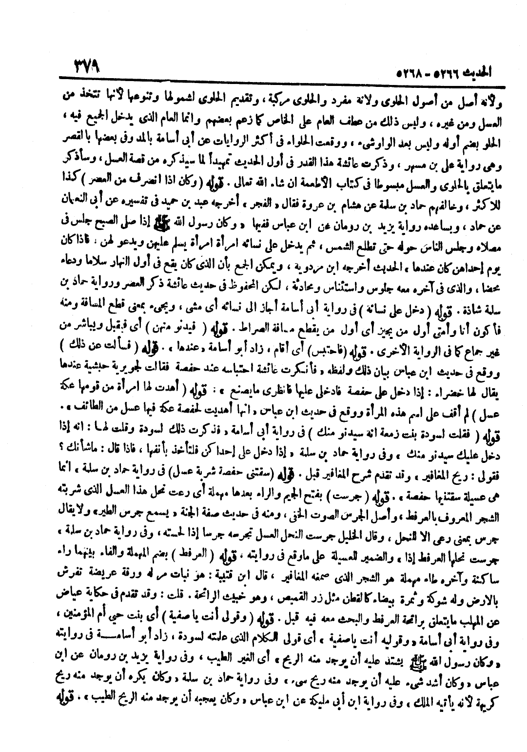وَلِأَنَّهُ أَصْلٌ مِنْ أُصُولِ الْحَلْوَى وَلِأَنَّهُ مُفْرَدٌ وَالْحَلْوَى مُرَكَّبَةٌ وَتَقْدِيمُ الْحَلْوَى لِشُمُولِهَا وَتَنَوُّعِهَا لِأَنَّهَا تُتَّخَذُ مِنَ الْعَسَلِ وَمِنْ غَيْرِهِ وَلَيْسَ ذَلِكَ مِنْ عَطْفِ الْعَامِّ عَلَى الْخَاصِّ كَمَا زَعَمَ بَعْضُهُمْ وَإِنَّمَا الْعَامُّ الَّذِي يَدْخُلُ الْجَمِيعُ فِيهِ الْحُلْوُ بِضَمِّ أَوَّلِهِ وَلَيْسَ بَعْدَ الْوَاوِ شَيْءٌ وَوَقَعَتِ الْحَلْوَاءُ فِي أَكْثَرِ الرِّوَايَاتِ عَنْ أَبِي أُسَامَةَ بِالْمَدِّ وَفِي بَعْضِهَا بِالْقَصْرِ وَهِيَ رِوَايَةُ عَلِيِّ بْنِ مُسْهِرٍ وَذَكَرَتْ عَائِشَةُ هَذَا الْقَدْرَ فِي أَوَّلِ الْحَدِيثِ تَمْهِيدًا لِمَا سَيَذْكُرُهُ مِنْ قِصَّةِ الْعَسَلِ وَسَأَذْكُرُ مَا يَتَعَلَّقُ بِالْحَلْوَى وَالْعَسَلِ مَبْسُوطًا فِي كِتَابِ الْأَطْعِمَةِ إِنْ شَاءَ اللَّهُ تَعَالَى قَوْلُهُ وَكَانَ إِذَا انْصَرَفَ مِنَ الْعَصْرِ كَذَا لِلْأَكْثَرِ وَخَالَفَهُمْ حَمَّادِ بْنِ سَلَمَةَ عَنْ هِشَامِ بْنِ عُرْوَةَ فَقَالَ الْفَجْرُ أَخْرَجَهُ عَبْدُ بْنُ حُمَيْدٍ فِي تَفْسِيرِهِ عَنْ أَبِي النُّعْمَانِ عَنْ حَمَّادٍ وَيُسَاعِدُهُ رِوَايَةُ يَزِيدَ بْنِ رُومَانَ عَن بن عَبَّاسٍ فَفِيهَا وَكَانَ رَسُولُ اللَّهِ صَلَّى اللَّهُ عَلَيْهِ وَسَلَّمَ إِذَا صَلَّى الصُّبْحَ جَلَسَ فِي مُصَلَّاهُ وَجَلَسَ النَّاسُ حَوْلَهُ حَتَّى تَطْلُعَ الشَّمْسُ ثُمَّ يَدْخُلُ عَلَى نِسَائِهِ امْرَأَةً امْرَأَةً يُسَلِّمُ عَلَيْهِنَّ وَيَدْعُو لَهُنَّ فَإِذَا كَانَ يَوْمُ إِحْدَاهُنَّ كَانَ عِنْدهَا الحَدِيث أخرجه بن مَرْدَوَيْهِ وَيُمْكِنُ الْجَمْعُ بِأَنَّ الَّذِي كَانَ يَقَعُ فِي أَوَّلِ النَّهَارِ سَلَامًا وَدُعَاءً مَحْضًا وَالَّذِي فِي آخِرِهِ مَعَهُ جُلُوسٌ وَاسْتِئْنَاسٌ وَمُحَادَثَةٌ لَكِنَّ الْمَحْفُوظَ فِي حَدِيثِ عَائِشَةَ ذِكْرُ الْعَصْرِ وَرِوَايَةُ حَمَّادِ بْنِ سَلَمَةَ شَاذَّةٌ قَوْلُهُ دَخَلَ عَلَى نِسَائِهِ فِي رِوَايَةِ أَبِي أُسَامَةَ أَجَازَ إِلَى نِسَائِهِ أَيْ مَشَى وَيَجِيءُ بِمَعْنَى قَطَعَ الْمَسَافَةَ وَمِنْهُ فَأَكُونُ أَنَا وَأُمَّتِي أَوَّلَ مَنْ يُجِيزُ أَيْ أَوَّلَ مَنْ يَقْطَعُ مَسَافَةَ الصِّرَاطِ قَوْلُهُ فَيَدْنُو مِنْهُنَّ أَيْ فَيُقَبِّلُ وَيُبَاشِرُ مِنْ غَيْرِ جِمَاعٍ كَمَا فِي الرِّوَايَةِ الْأُخْرَى قَوْلُهُ فَاحْتَبَسَ أَيْ أَقَامَ زَادَ أَبُو أُسَامَةَ عِنْدَهَا قَوْلُهُ فَسَأَلت عَن ذَلِك وَوَقع فِي حَدِيث بن عَبَّاسٍ بَيَانُ ذَلِكَ وَلَفْظُهُ فَأَنْكَرَتْ عَائِشَةَ احْتِبَاسَهُ عِنْد حَفْصَة فَقَالَت لجويرية حبشية عَنْدَهَا يُقَالُ لَهَا خَضْرَاءُ إِذَا دَخَلَ عَلَى حَفْصَةَ فَادْخُلِي عَلَيْهَا فَانْظُرِي مَا يَصْنَعُ قَوْلُهُ أَهْدَتْ لَهَا امْرَأَةٌ مِنْ قَوْمِهَا عُكَّةَ عَسَلٍ لَمْ أَقِفْ عَلَى اسْمِ هَذِهِ الْمَرْأَةِ وَوَقَعَ فِي حَدِيث بن عَبَّاس أَنَّهَا أهديت لحفصة عكة فها عَسَلٌ مِنَ الطَّائِفِ قَوْلُهُ فَقُلْتُ لِسَوْدَةَ بِنْتِ زَمْعَةَ إِنَّهُ سَيَدْنُو مِنْكِ فِي رِوَايَةِ أَبِي أُسَامَةَ فَذَكَرْتُ ذَلِكَ لِسَوْدَةَ وَقُلْتُ لَهَا إِنَّهُ إِذَا دَخَلَ عَلَيْكِ سَيَدْنُو مِنْكِ وَفِي رِوَايَةِ حَمَّادِ بْنِ سَلَمَةَ إِذَا دَخَلَ عَلَى إِحْدَاكُنَّ فَلْتَأْخُذْ بِأَنْفِهَا فَإِذَا قَالَ مَا شَأْنُكِ فَقُولِي رِيحَ الْمَغَافِيرِ وَقَدْ تَقَدَّمَ شَرْحُ الْمَغَافِيرِ قَبْلُ قَوْلُهُ سَقَتْنِي حَفْصَةُ شَرْبَةَ عَسَلٍ فِي رِوَايَةِ حَمَّادِ بْنِ سَلَمَةَ إِنَّمَا هيَ عُسَيْلَةٌ سَقَتْنِيهَا حَفْصَةُ قَوْلُهُ جَرَسَتْ بِفَتْحِ الْجِيمِ وَالرَّاءِ بَعْدَهَا مُهْمَلَةٌ أَيْ رَعَتْ نَحْلُ هَذَا الْعَسَلِ الَّذِي شَرِبْتُهُ الشَّجَر