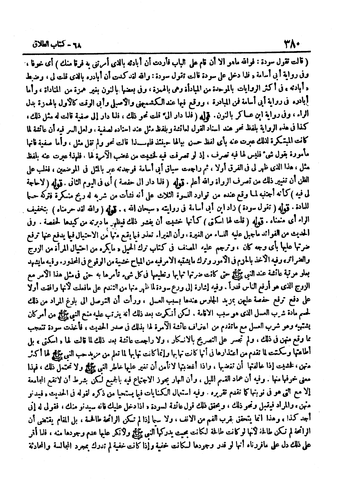 قَالَتْ تَقُولُ سَوْدَةُ فَوَاللَّهِ مَا هُوَ إِلَّا أَنْ قَامَ عَلَى الْبَابِ فَأَرَدْتُ أَنْ أُبَادِئَهُ بِالَّذِي أَمَرْتِنِي بِهِ فَرَقًا مِنْكِ أَيْ خَوْفًا وَفِي رِوَايَةِ أَبِي أُسَامَةَ فَلَمَّا دَخَلَ عَلَى سَوْدَةَ قَالَتْ تَقُولُ سَوْدَةُ وَاللَّهِ لَقَدْ كِدْتُ أَنْ أُبَادِرَهُ بِالَّذِي قُلْتِ لِي وَضُبِطَ أُبَادِئُهُ فِي أَكْثَرِ الرِّوَايَاتِ بِالْمُوَحَّدَةِ مِنَ الْمُبَادَأَةِ وَهِيَ بِالْهَمْزَةِ وَفِي بَعْضِهَا بِالنُّونِ بِغَيْرِ هَمْزَةٍ مِنَ الْمُنَادَاةِ وَأَمَّا أُبَادِرُهُ فِي رِوَايَةِ أَبِي أُسَامَةَ فَمِنَ الْمُبَادَرَةِ وَوَقَعَ فِيهَا عِنْدَ الْكُشْمِيهَنِيِّ وَالْأَصِيلِيِّ وَأَبِي الْوَقْتِ كَالْأَوَّلِ بِالْهَمْزَةِ بَدَلَ الرَّاءِ وَفِي رِوَايَة بن عَسَاكِرَ بِالنُّونِ قَوْلُهُ فَلَمَّا دَارَ إِلَيَّ قُلْتُ نَحْوَ ذَلِكَ فَلَمَّا دَارَ إِلَى صَفِيَّةَ قَالَتْ لَهُ مِثْلَ ذَلِكَ كَذَا فِي هَذِهِ الرِّوَايَةِ بِلَفْظِ نَحْوَ عِنْدَ إِسْنَادِ الْقَوْلِ لِعَائِشَةَ وَبِلَفْظِ مِثْلَ عِنْدَ إِسْنَادِهِ لِصَفِيَّةَ وَلَعَلَّ السِّرَّ فِيهِ أَنَّ عَائِشَةَ لَمَّا كَانَتِ الْمُبْتَكِرَةَ لِذَلِكَ عَبَّرَتْ عَنْهُ بِأَيِّ لَفْظٍ حَسَنٍ بِبَالِهَا حِينَئِذٍ فَلِهَذَا قَالَتْ نَحْوَ وَلَمْ تَقُلْ مِثْلَ وَأَمَّا صَفِيَّةُ فَإِنَّهَا مَأْمُورَةٌ بِقَوْلِ شَيْءٍ فَلَيْسَ لَهَا فِيهِ تَصَرُّفٌ إِذْ لَوْ تَصَرَّفَتْ فِيهِ لَخَشِيَتْ مِنْ غَضَبِ الْآمِرَةِ لَهَا فَلِهَذَا عَبَّرَتْ عَنْهُ بِلَفْظِ مِثْلَ هَذَا الَّذِي ظَهَرَ لِي فِي الْفَرْقِ أَوَّلًا ثُمَّ رَاجَعْتُ سِيَاقَ أَبِي أُسَامَةَ فَوَجَدْتُهُ عَبَّرَ بِالْمِثْلِ فِي الْمَوْضِعَيْنِ فَغَلَبَ عَلَى الظَّنِّ أَنَّ تَغْيِيرَ ذَلِكَ مِنْ تَصَرُّفِ الرُّوَاةِ وَاللَّهُ أَعْلَمُ قَوْلُهُ فَلَمَّا دَارَ إِلَى حَفْصَةَ أَيْ فِي الْيَوْمِ الثَّانِي قَوْلُهُ لَا حَاجَةَ لِي فِيهِ كَأَنَّهُ اجْتَنَبَهُ لِمَا وَقَعَ عِنْدَهُ مِنْ تَوَارُدِ النِّسْوَةِ الثَّلَاثِ عَلَى أَنَّهُ نَشَأَتْ مِنْ شُرْبِهِ لَهُ رِيحٌ مُنْكَرَةٌ فَتَرَكَهُ حَسْمًا لِلْمَادَّةِ قَوْله تَقول سَوْدَة زَاد بن أَبِي أُسَامَةَ فِي رِوَايَتِهِ سُبْحَانَ اللَّهِ قَوْلُهُ وَاللَّهِ لَقَدْ حَرَمْنَاهُ بِتَخْفِيفِ الرَّاءِ أَيْ مَنَعْنَاهُ قَوْلُهُ قُلْتُ لَهَا اسْكُتِي كَأَنَّهَا خَشِيَتْ أَنْ يَفْشُوَ ذَلِكَ فَيَظْهَرَ مَا دَبَّرَتْهُ مِنْ كَيَدِهَا لِحَفْصَةَ وَفِي الْحَدِيثِ مِنَ الْفَوَائِدِ مَا جُبِلَ عَلَيْهِ النِّسَاءُ مِنَ الْغَيْرَةِ وَأَنَّ الْغَيْرَاءَ تُعْذَرُ فِيمَا يَقَعُ مِنْهَا مِنَ الِاحْتِيَالِ فِيمَا يَدْفَعُ عَنْهَا تَرَفُّعَ ضَرَّتِهَا عَلَيْهَا بِأَيِّ وَجْهٍ كَانَ وَتَرْجَمَ عَلَيْهِ الْمُصَنِّفُ فِي كِتَابِ تَرْكِ الْحِيَلِ مَا يُكْرَهُ مِنِ احْتِيَالِ الْمَرْأَةِ مِنَ الزَّوْجِ وَالضَّرَائِرِ وَفِيهِ الْأَخْذُ بِالْحَزْمِ فِي الْأُمُورِ وَتَرْكُ مَا يَشْتَبِهُ الْأَمْرُ فِيهِ مِنَ الْمُبَاحِ خَشْيَةً مِنَ الْوُقُوعِ فِي الْمَحْذُورِ وَفِيهِ مَا يَشْهَدُ بِعُلُوِّ مَرْتَبَةِ عَائِشَةَ عِنْدَ النَّبِيِّ صَلَّى اللَّهُ عَلَيْهِ وَسَلَّمَ حَتَّى كَانَتْ ضَرَّتُهَا تَهَابُهَا وَتُطِيعُهَا فِي كُلِّ شَيْءٍ تَأْمُرُهَا بِهِ حَتَّى فِي مِثْلِ هَذَا الْأَمْرِ مَعَ الزَّوْجِ الَّذِي هُوَ أَرْفَعُ النَّاسِ قَدْرًا وَفِيهِ إِشَارَةٌ إِلَى وَرَعِ سَوْدَةَ لِمَا ظَهَرَ مِنْهَا مِنَ التَّنَدُّمِ عَلَى مَا فَعَلَتْ لِأَنَّهَا وَافَقَتْ أَوَّلًا عَلَى دَفْعِ تَرَفُّعِ حَفْصَةَ عَلَيْهِنَّ بِمَزِيدِ الْجُلُوسِ عِنْدَهَا بِسَبَبِ الْعَسَلِ وَرَأَتْ أَنَّ التَّوَصُّلَ إِلَى بُلُوغِ الْمُرَادِ مِن