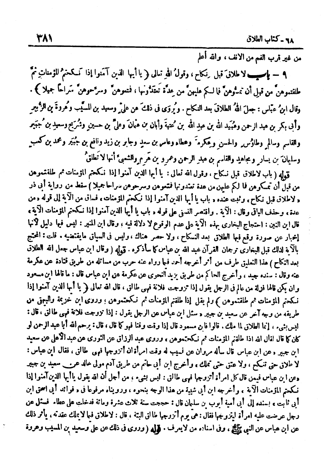 وَقَوْلِ اللَّهِ تَعَالَى يَا أَيُّهَا الَّذِينَ آمَنُوا إِذَا نكحتم الْمُؤْمِنَات ثمَّ طلقتموهن من قبل أَن تمسكوهن فَمَا لَكُمْ عَلَيْهِنَّ مِنْ عِدَّةٍ تَعْتَدُّونَهَا فَمَتِّعُوهُنَّ وسرحوهن سراحا جميلا سَقَطَ مِنْ رِوَايَةِ أَبِي ذَرٍّ لَا طَلَاقَ قبل نِكَاح وَثَبت عِنْده بَاب يَا أَيُّهَا الَّذِينَ آمَنُوا إِذَا نَكَحْتُمْ الْمُؤْمِنَاتِ فَسَاقَ مِنَ الْآيَةِ إِلَى قَوْلِهِ مِنْ عِدَّةٍ وَحَذَفَ الْبَاقِيَ وَقَالَ الْآيَةَ وَاقْتَصَرَ النَّسَفِيُّ عَلَى قَوْله بَاب يَا أَيُّهَا الَّذِينَ آمَنُوا إِذَا نَكَحْتُمْ الْمُؤْمِنَاتِ الْآيَة قَالَ بن التِّينِ احْتِجَاجُ الْبُخَارِيِّ بِهَذِهِ الْآيَةِ عَلَى عَدَمِ الْوُقُوع لَا دلَالَة فِيهِ وَقَالَ بن الْمُنِيرِ لَيْسَ فِيهَا دَلِيلٌ لِأَنَّهَا إِخْبَارٌ عَنْ صُورَةٍ وَقَعَ فِيهَا الطَّلَاقُ بَعْدَ النِّكَاحِ وَلَا حَصْرَ هُنَاكَ وَلَيْسَ فِي السِّيَاقِ مَا يَقْتَضِيهِ قُلْتُ الْمُحْتَجُّ بِالْآيَةِ لِذَلِكَ قَبْلَ الْبُخَارِيِّ تَرْجُمَانُ الْقُرْآنِ عَبْدُ اللَّهِ بْنُ عَبَّاسٍ كَمَا سَأَذْكُرُهُ قَوْله وَقَالَ بن عَبَّاسٍ جَعَلَ اللَّهُ الطَّلَاقَ بَعْدَ النِّكَاحِ هَذَا التَّعْلِيقُ طَرَفٌ مِنْ أَثَرٍ أَخْرَجَهُ أَحْمَدُ فِيمَا رَوَاهُ عَنْهُ حَرْبٌ مِنْ مَسَائِلِهِ مِنْ طَرِيقِ قَتَادَةَ عَنْ عِكْرِمَةَ عَنْهُ وَقَالَ سَنَدُهُ جَيِّدٌ وَأَخْرَجَ الْحَاكِمُ مِنْ طَرِيقِ يَزِيدَ النَّحْوِيِّ عَنْ عِكْرِمَةَ عَنِ بن عَبَّاس قَالَ مَا قَالَهَا بن مَسْعُودٍ وَإِنْ يَكُنْ قَالَهَا فَزَلَّةٌ مِنْ عَالِمٍ فِي الرَّجُلِ يَقُولُ إِذَا تَزَوَّجْتُ فُلَانَةَ فَهِيَ طَالِق قَالَ اللَّهِ تَعَالَى يَا أَيُّهَا الَّذِينَ آمَنُوا إِذَا نكحتم الْمُؤْمِنَات ثمَّ طلقتموهن وَلَمْ يَقُلْ إِذَا طَلَّقْتُمُ الْمُؤْمِنَاتِ ثُمَّ نَكَحْتُمُوهُنَّ وروى بن خُزَيْمَةَ وَالْبَيْهَقِيُّ مِنْ طَرِيقِهِ مِنْ وَجْهٍ آخَرَ عَنْ سَعِيدِ بْنِ جُبَيْرٍ سُئِلَ بن عَبَّاسٍ عَنِ الرَّجُلِ يَقُولُ إِذَا تَزَوَّجْتُ فُلَانَةَ فَهِيَ طَالِقٌ قَالَ لَيْسَ بِشَيْءٍ إِنَّمَا الطَّلَاقُ لِمَا مَلَكَ قَالُوا فَابْنُ مَسْعُودٍ قَالَ إِذَا وَقَّتَ وَقْتًا فَهُوَ كَمَا قَالَ قَالَ يَرْحَمُ الله أَبَا عبد الرَّحْمَنِ لَوْ كَانَ كَمَا قَالَ لَقَالَ اللَّهُ إِذَا طَلَّقْتُمُ الْمُؤْمِنَاتِ ثُمَّ نَكَحْتُمُوهُنَّ وَرَوَى عَبْدُ الرَّزَّاقِ عَنِ الثَّوْرِيِّ عَنْ عَبْدِ الْأَعْلَى عَنْ سعيد بن جُبَير عَن بن عَبَّاسٍ قَالَ سَأَلَهُ مَرْوَانُ عَنْ نَسِيبٍ لَهُ وَقت امْرَأَة أَن اتزوجها فَهِيَ طَالِق فَقَالَ بن عَبَّاسٍ لَا طَلَاقَ حَتَّى تَنْكِحَ وَلَا عِتْقَ حَتَّى تملك وَأخرج بن أَبِي حَاتِمٍ مِنْ طَرِيقِ آدَمَ مَوْلَى خَالِدٍ عَن سعيد بن جُبَير عَن بن عَبَّاسٍ فِيمَنْ قَالَ كُلُّ امْرَأَةٍ أَتَزَوَّجُهَا فَهِيَ طَالِقٌ لَيْسَ بِشَيْءٍ مِنْ أَجْلِ أَنَّ اللَّهَ يَقُول يَا أَيُّهَا الَّذِينَ آمَنُوا إِذَا نَكَحْتُمْ الْمُؤْمِنَاتِ الْآيَة وَأخرجه بن أَبِي شَيْبَةَ مِنْ هَذَا الْوَجْهِ بِنَحْوِهِ وَرُوِّينَاهُ مَرْفُوعًا فِي فَوَائِدِ أَبِي إِسْحَاقَ بْنِ أَبِي ثَابِتٍ بِسَنَدِهِ إِلَى أَبِي أُمَيَّةَ أَيُّوبَ بْنِ سُلَيْمَانَ قَالَ حَجَجْتُ سَنَةَ ثَلَاثَ عَشْرَةَ وَمِائَةٍ فَدَخَلْتُ عَلَى عَطَاءٍ فَسُئِلَ عَنْ رَجُلٍ عُرِضَتْ عَلَيْهِ امْرَأَةٌ لِيَتَزَوَّجَهَا فَقَالَ هِيَ يَوْمُ أَتَزَوَّجُهَا طَالِقٌ أَلْبَتَّةَ قَالَ لَا طَلَاقَ فِيمَا لَا يملك عقدته يأثر ذَلِك عَن بن عَبَّاسٍ عَنِ النَّبِيِّ صَلَّى اللَّهُ عَلَيْهِ وَسَلَّمَ وَفِي إِسْنَادِهِ مَنْ لَا يُعْرَفُ قَوْلُهُ وَرُوِيَ فِي ذَلِكَ عَنْ عَلِيٍّ وَسَعِيدِ بْنِ الْمُسَيَّبِ وَعُرْوَة