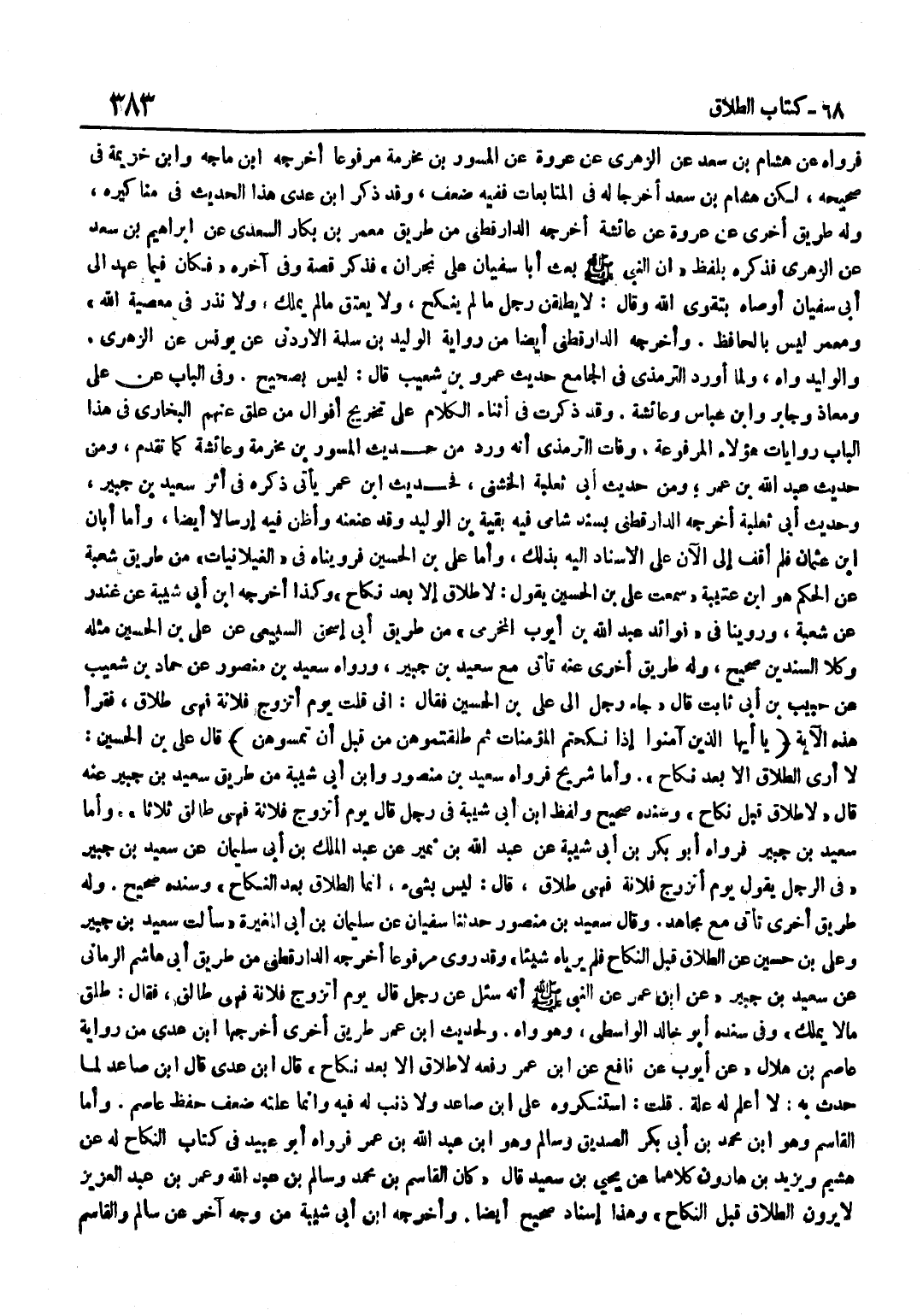 فَرَوَاهُ عَنْ هِشَامِ بْنِ سَعْدٍ عَنِ الزُّهْرِيُّ عَنْ عُرْوَةَ عَنِ الْمِسْوَرِ بْنِ مَخْرَمَةَ مَرْفُوعًا أخرجه بن ماجة وبن خُزَيْمَةَ فِي صَحِيحِهِ لَكِنَّ هِشَامَ بْنَ سَعْدٍ أَخْرَجَا لَهُ فِي الْمُتَابَعَاتِ فَفِيهِ ضَعْفٌ وَقَدْ ذكر بن عَدِيٍّ هَذَا الْحَدِيثَ فِي مَنَاكِيرِهِ وَلَهُ طَرِيقٌ أُخْرَى عَنْ عُرْوَةَ عَنْ عَائِشَةَ أَخْرَجَهُ الدَّارَقُطْنِيُّ مِنْ طَرِيقِ مَعْمَرِ بْنِ بَكَّارٍ السَّعْدِيِّ عَنْ إِبْرَاهِيمَ بْنِ سَعْدٍ عَنِ الزُّهْرِيِّ فَذَكَرَهُ بِلَفْظِ أَنَّ النَّبِيَّ صَلَّى اللَّهُ عَلَيْهِ وَسَلَّمَ بَعَثَ أَبَا سُفْيَانَ عَلَى نَجْرَانَ فَذَكَرَ قِصَّةً وَفِي آخِره فَكَانَ فِيمَا عَهْدٌ إِلَى أَبِي سُفْيَانَ أَوْصَاهُ بِتَقْوَى اللَّهِ وَقَالَ لَا يُطَلِّقَنَّ رَجُلٌ مَا لَمْ يَنْكِحْ وَلَا يُعْتِقْ مَا لَمْ يَمْلِكْ وَلَا نَذْرَ فِي مَعْصِيَةِ اللَّهِ وَمَعْمَرٌ لَيْسَ بِالْحَافِظِ وَأَخْرَجَهُ الدَّارَقُطْنِيُّ أَيْضًا مِنْ رِوَايَةِ الْوَلِيدِ بْنِ سَلَمَةَ الْأُرْدُنِيِّ عَنْ يُونُسَ عَنِ الزُّهْرِيِّ وَالْوَلِيدُ وَاهٍ وَلَمَّا أَوْرَدَ التِّرْمِذِيُّ فِي الْجَامِعِ حَدِيثَ عَمْرِو بْنِ شُعَيْبٍ قَالَ لَيْسَ بِصَحِيحٍ وَفِي الْبَابِ عَن على ومعاذ وَجَابِر وبن عَبَّاس وَعَائِشَة وَقد ذكرت فِي أَثْنَاءَ الْكَلَامِ عَلَى تَخْرِيجِ أَقْوَالِ مَنْ عَلَّقَ عَنْهُمُ الْبُخَارِيُّ فِي هَذَا الْبَابِ رِوَايَاتِ هَؤُلَاءِ الْمَرْفُوعَةَ وَفَاتَ التِّرْمِذِيَّ أَنَّهُ وَرَدَ مِنْ حَدِيثِ الْمِسْوَرِ بْنِ مَخْرَمَةَ وَعَائِشَةَ كَمَا تَقَدَّمَ وَمِنْ حَدِيثِ عَبْدِ اللَّهِ بْنِ عُمَرَ وَمِنْ حَدِيثِ أبي ثَعْلَبَة الْخُشَنِي فَحَدِيث بن عُمَرَ يَأْتِي ذِكْرُهُ فِي أَثَرِ سَعِيدِ بْنِ جُبَيْرٍ وَحَدِيثُ أَبِي ثَعْلَبَةَ أَخْرَجَهُ الدَّارَقُطْنِيُّ بِسَنَدٍ شَامِيٍّ فِيهِ بَقِيَّةُ بْنُ الْوَلِيدِ وَقَدْ عَنْعَنَهُ وَأَظُنُّ فِيهِ إِرْسَالًا أَيْضًا وَأَمَّا أَبَانُ بْنُ عُثْمَانَ فَلَمْ أَقِفْ إِلَى الْآنِ عَلَى الْإِسْنَادِ إِلَيْهِ بذلك وَأما عَليّ بن الْحُسَيْن فَرُوِّينَاهُ فِي الْغَيْلَانِيَّاتِ مِنْ طَرِيقِ شُعْبَةَ عَنِ الحكم هُوَ بن عتيبة سَمِعت عَليّ بن الْحُسَيْن يَقُولُ لَا طَلَاقَ إِلَّا بَعْدَ نِكَاحٍ وَكَذَا أخرجه بن أَبِي شَيْبَةَ عَنْ غُنْدَرٍ عَنْ شُعْبَةَ وَرُوِّينَا فِي فَوَائِدِ عَبْدِ اللَّهِ بْنِ أَيُّوبَ الْمَخْرَمِيِّ مِنْ طَرِيقِ أَبِي إِسْحَاقَ السَّبِيعِيِّ عَنْ عَلِيِّ بْنِ الْحُسَيْنِ مِثْلُهُ وَكِلَا السَّنَدَيْنِ صَحِيحٌ وَلَهُ طَرِيقٌ أُخْرَى عَنْهُ تَأْتِي مَعَ سَعِيدِ بْنِ جُبَيْرٍ وَرَوَاهُ سَعِيدُ بْنُ مَنْصُورٍ عَنْ حَمَّادِ بْنِ شُعَيْبٍ عَنْ حَبِيبِ بْنِ أَبِي ثَابِتٍ قَالَ جَاءَ رَجُلٌ إِلَى عَلِيِّ بْنِ الْحُسَيْنِ فَقَالَ إِنِّي قُلْتُ يَوْمَ أَتَزَوَّجُ فُلَانَةَ فَهِيَ طَلَاق فَقَرَأَ هَذِه الْآيَة يَا أَيُّهَا الَّذِينَ آمَنُوا إِذَا نَكَحْتُمْ الْمُؤْمِنَاتِ ثمَّ طلقتموهن من قبل أَن تمَسُّوهُنَّ قَالَ عَلِيُّ بْنُ الْحُسَيْنِ لَا أَرَى الطَّلَاقَ إِلَّا بَعْدَ نِكَاحٍ وَأَمَّا شُرَيْحٌ فَرَوَاهُ سَعِيدُ بن مَنْصُور وبن أَبِي شَيْبَةَ مِنْ طَرِيقِ سعِيدِ بْنِ جُبَيْرٍ عَنْهُ قَالَ لَا طَلَاقَ قَبْلَ نِكَاحٍ وَسَنَدُهُ صَحِيح وَلَفظ بن أبي شيبَة فِي رَجُلٍ قَالَ يَوْمَ أَتَزَوَّجُ فُلَانَةَ فَهِيَ طَالِقٌ ثَلَاثًا وَأَمَّا سَعِيدُ بْنُ جُبَيْرٍ فَرَوَاهُ أَبُو بَكْرِ بْنُ أَبِي شَيْبَةَ عَنْ عَبْدِ اللَّهِ بْنِ نُمَيْرٍ عَنْ عَبْدِ الْمَلِكِ بْنِ أَبِي سُلَيْمَانَ عَنْ سَعِيدِ بْنِ جُبَيْرٍ فِي الرَّجُلِ يَقُولُ يَوْمَ أَتَزَوَّجُ فُلَانَةَ فَهِيَ طَلَاقٌ قَالَ لَيْسَ بِشَيْءٍ إِ