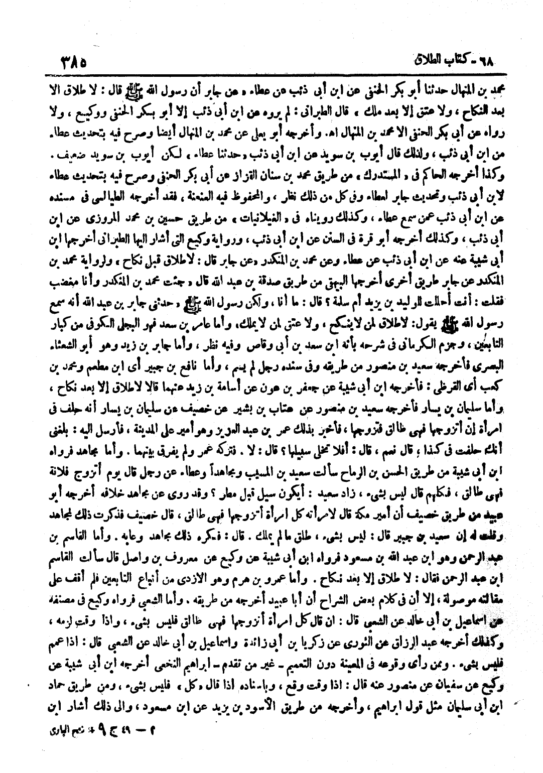 مُحَمَّدُ بْنُ الْمِنْهَالِ حَدَّثَنَا أَبُو بَكْرٍ الْحَنَفِيُّ عَن بن أَبِي ذِئْبٍ عَنْ عَطَاءٍ عَنْ جَابِرٍ أَنَّ رَسُولَ اللَّهِ صَلَّى اللَّهُ عَلَيْهِ وَسَلَّمَ قَالَ لَا طَلَاقَ إِلَّا بَعْدَ النِّكَاحِ وَلَا عِتْقَ إِلَّا بَعْدَ مِلْكٍ قَالَ الطَّبَرَانِيُّ لَمْ يَرْوِهِ عَن بن أَبِي ذِئْبٍ إِلَّا أَبُو بَكْرٍ الْحَنَفِيُّ وَوَكِيعٌ وَلَا رَوَاهُ عَنْ أَبِي بَكْرٍ الْحَنَفِيِّ إِلَّا مُحَمَّدُ بْنُ الْمِنْهَالِ اه وَأَخْرَجَهُ أَبُو يَعْلَى عَنْ مُحَمَّدِ بْنِ الْمِنْهَالِ أَيْضًا وَصَرَّحَ فِيهِ بتحديث عَطاء من بن أَبِي ذِئْبٍ وَلِذَلِكَ قَالَ أَيُّوبُ بْنُ سُوَيْدٍ عَن بن أَبِي ذِئْبٍ حَدَّثَنَا عَطَاءٌ لَكِنْ أَيُّوبُ بْنُ سُوَيْدٍ ضَعِيفٌ وَكَذَا أَخْرَجَهُ الْحَاكِمُ فِي الْمُسْتَدْرَكِ مِنْ طَرِيقِ مُحَمَّدِ بْنِ سِنَانٍ الْقَزَّازِ عَنْ أَبِي بَكْرٍ الْحَنَفِيِّ وَصَرَّحَ فِيهِ بِتَحْدِيثِ عَطَاءٍ لِابْنِ أَبِي ذِئْبٍ وَتَحْدِيثِ جَابِرٍ لِعَطَاءٍ وَفِي كُلٍّ مِنْ ذَلِكَ نَظَرٌ وَالْمَحْفُوظُ فِيهِ الْعَنْعَنَةُ فقد أخرجه الطَّيَالِسِيّ فِي مُسْنده عَن بن أَبِي ذِئْبٍ عَمَّنْ سَمِعَ عَطَاءً وَكَذَلِكَ رُوِّينَاهُ فِي الْغَيْلَانِيَّاتِ مِنْ طَرِيقِ حُسَيْنِ بْنِ مُحَمَّدٍ الْمروزِي عَن بن أَبِي ذِئْبٍ وَكَذَلِكَ أَخْرَجَهُ أَبُو قُرَّةَ فِي السّنَن عَن بن أَبِي ذِئْبٍ وَرِوَايَةُ وَكِيعٍ الَّتِي أَشَارَ إِلَيْهَا الطَّبَرَانِيّ أخرجهَا بن أبي شيبَة عَنهُ عَن بن أَبِي ذِئْبٍ عَنْ عَطَاءٍ وَعَنْ مُحَمَّدِ بْنِ الْمُنْكَدِرِ عَنْ جَابِرٍ قَالَ لَا طَلَاقَ قَبْلَ نِكَاحٍ وَلِرِوَايَةِ مُحَمَّدِ بْنِ الْمُنْكَدِرِ عَنْ جَابِرٍ طَرِيقٌ أُخْرَى أَخْرَجَهَا الْبَيْهَقِيُّ مِنْ طَرِيقِ صَدَقَةَ بْنِ عَبْدِ اللَّهِ قَالَ جِئْتُ مُحَمَّدَ بْنَ الْمُنْكَدِرِ وَأَنَا مُغْضَبٌ فَقُلْتُ أَنْتَ أَحْلَلْتَ لِلْوَلِيدِ بْنِ يَزِيدَ أُمَّ سَلَمَةَ قَالَ مَا أَنَا وَلَكِنْ رَسُولُ اللَّهِ صَلَّى اللَّهُ عَلَيْهِ وَسَلَّمَ حَدَّثَنِي جَابِرُ بْنُ عَبْدِ اللَّهِ أَنَّهُ سَمِعَ رَسُولَ اللَّهِ صَلَّى اللَّهُ عَلَيْهِ وَسَلَّمَ يَقُولُ لَا طَلَاقَ لِمَنْ لَا يَنْكِحُ وَلَا عِتْقَ لِمَنْ لَا يَمْلِكُ وَأَمَّا عَامِرُ بْنُ سَعْدٍ فَهُوَ الْبَجَلِيُّ الْكُوفِيُّ مِنْ كِبَارِ التَّابِعِينَ وَجَزَمَ الْكرْمَانِي فِي شَرحه بِأَنَّهُ بن سَعْدِ بْنِ أَبِي وَقَّاصٍ وَفِيهِ نَظَرٌ وَأَمَّا جَابِرُ بْنُ زَيْدٍ وَهُوَ أَبُو الشَّعْثَاءِ الْبَصْرِيُّ فَأَخْرَجَهُ سَعِيدُ بْنُ مَنْصُورٍ مِنْ طَرِيقِهِ وَفِي سَنَدِهِ رَجُلٌ لَمْ يُسَمَّ وَأَمَّا نَافِعُ بْنُ جُبَير أَي بن مُطْعِمٍ وَمُحَمَّدُ بْنُ كَعْبٍ أَيِ الْقُرَظِيُّ فَأَخْرَجَهُ بن أَبِي شَيْبَةَ عَنْ جَعْفَرِ بْنِ عَوْنٍ عَنْ أُسَامَةَ بْنِ زَيْدٍ عَنْهُمَا قَالَا لَا طَلَاقَ إِلَّا بَعْدَ نِكَاحٍ وَأَمَّا سُلَيْمَانُ بْنُ يَسَارٍ فَأَخْرَجَهُ سَعِيدُ بْنُ مَنْصُورٍ عَنْ عَتَّابِ بْنِ بَشِيرٍ عَنْ خَصِيفٍ عَنْ سُلَيْمَانَ بْنِ يَسَارٍ أَنَّهُ حَلَفَ فِي امْرَأَةٍ إِنْ أَتَزَوَّجْهَا فَهِيَ طَالِقٌ فَتَزَوَّجَهَا فَأُخْبِرَ بِذَلِكَ عُمَرُ بْنُ عَبْدِ الْعَزِيزِ وَهُوَ أَمِيرٌ عَلَى الْمَدِينَةِ فَأَرْسَلَ إِلَيْهِ بَلَغَنِي أَنَّكَ حَلَفْتَ فِي كَذَا قَالَ نَعَمْ قَالَ أَفَلَا تُخَلِّي سَبِيلَهَا قَالَ لَا فَتَرَكَهُ عُمَرُ وَلَمْ يُفَرِّقْ بَيْنَهُمَا وَأَمَّا مُجَاهِدٌ فَرَوَاهُ بن أَبِي شَيْبَةَ مِنْ طَرِيقِ الْحَسَنِ بْنِ الرَّمَّاحِ سَأَلْتُ سَعِيدَ بْنَ الْمُسَيَّبِ وَمُجَاهِدًا وَعَطَاءً عَنْ رَجُلٍ قَالَ يَوْمَ أَتَزَوَّجُ فُلَانَةَ فَهِيَ طَالِقٌ فَكُلُّهُمْ قَالَ لَيْسَ بِشَيْءٍ زَادَ سَعِيدٌ أَيَكُونُ سَ