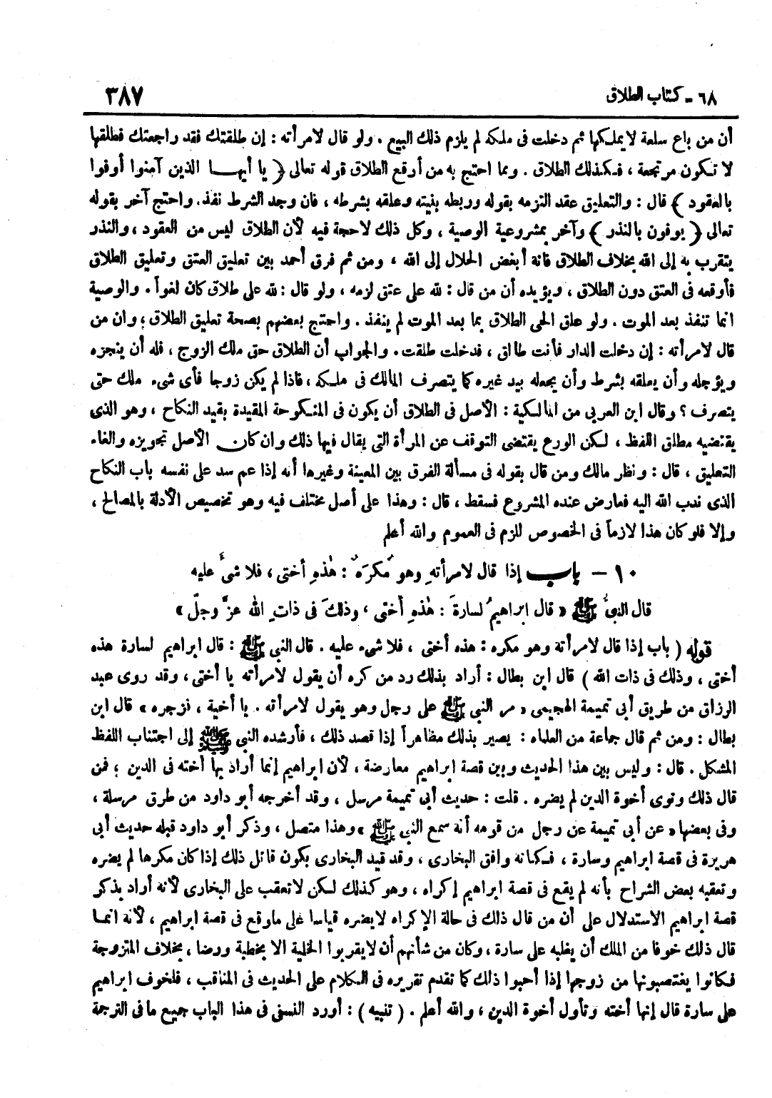قَالَ النَّبِيُّ صَلَّى اللَّهُ عَلَيْهِ وَسَلَّمَ قَالَ إِبْرَاهِيمُ لسارة هَذِه أُخْتِي وَذَلِكَ فِي ذَات الله قَالَ بن بَطَّالٍ أَرَادَ بِذَلِكَ رَدَّ مِنْ كَرِهَ أَنْ يَقُولَ لِامْرَأَتِهِ يَا أُخْتِي وَقَدْ رَوَى عَبْدُ الرَّزَّاقِ مِنْ طَرِيقِ أَبِي تَمِيمَةَ الْهُجَيْمِيِّ مَرَّ النَّبِيُّ صَلَّى اللَّهُ عَلَيْهِ وَسَلَّمَ عَلَى رَجُلٍ وَهُوَ يَقُول لامْرَأَته يَا آخية فزجره قَالَ بن بَطَّالٍ وَمِنْ ثَمَّ قَالَ جَمَاعَةٌ مِنَ الْعُلَمَاءِ يصير بذلك مُظَاهرا إِذا قصد ذَلِك فَأَرْشَدَهُ النَّبِيُّ صَلَّى اللَّهُ عَلَيْهِ وَسَلَّمَ إِلَى اجْتِنَابِ اللَّفْظِ الْمُشْكِلِ قَالَ وَلَيْسَ بَيْنَ هَذَا الحَدِيث وَبَين قصَّة إِبْرَاهِيم مُعَارضَة لِأَن إِبْرَاهِيم إِنَّمَا أَرَادَ بِهَا أُخْتَهُ فِي الدِّينِ فَمَنْ قَالَ ذَلِكَ وَنَوَى أُخُوَّةَ الدِّينِ لَمْ يَضُرَّهُ قلت حَدِيث أبي تَمِيمَة مُرْسل وقداخرجه أَبُو دَاوُد من طرق مُرْسلَة وَفِي بَعْضِهَا عَنْ أَبِي تَمِيمَةَ عَنْ رَجُلٍ مِنْ قَوْمِهِ أَنَّهُ سَمِعَ النَّبِيَّ صَلَّى اللَّهُ عَلَيْهِ وَسَلَّمَ وَهَذَا مُتَّصِلٌ وَذَكَرَ أَبُو دَاوُدَ قَبْلَهُ حَدِيثَ أَبِي هُرَيْرَة فِي قِصَّةِ إِبْرَاهِيمَ وَسَارَّةَ فَكَأَنَّهُ وَافَقَ الْبُخَارِيَّ وَقَدْ قَيَّدَ الْبُخَارِيُّ بِكَوْنِ قَائِلِ ذَلِكَ إِذَا كَانَ مُكْرَهًا لَمْ يَضُرَّهُ وَتَعَقَّبَهُ بَعْضُ الشُّرَّاحِ بِأَنَّهُ لَمْ يَقَعْ فِي قِصَّةِ إِبْرَاهِيمَ إِكْرَاهٌ وَهُوَ كَذَلِكَ لَكِنْ لَا تَعَقُّبَ عَلَى الْبُخَارِيِّ لِأَنَّهُ أَرَادَ بِذِكْرِ قِصَّةِ إِبْرَاهِيمَ الِاسْتِدْلَالَ عَلَى أَنَّ مَنْ قَالَ ذَلِكَ فِي حَالَةِ الْإِكْرَاهِ لَا يَضُرُّهُ قِيَاسًا عَلَى مَا وَقَعَ فِي قِصَّةِ إِبْرَاهِيمَ لِأَنَّهُ إِنَّمَا قَالَ ذَلِكَ خَوْفًا مِنَ الْمَلِكِ أَنْ يَغْلِبَهُ عَلَى سَارَّةَ وَكَانَ مِنْ شَأْنِهِمْ أَنْ لَا يَقْرَبُوا الْخَلِيَّةَ إِلَّا بِخِطْبَةٍ وَرِضًا بِخِلَافِ الْمُتَزَوِّجَةِ فَكَانُوا يَغْتَصِبُونَهَا مِنْ زَوْجِهَا إِذَا أَحَبُّوا ذَلِكَ كَمَا تَقَدَّمَ تَقْرِيرُهُ فِي الْكَلَامِ عَلَى الْحَدِيثِ فِي الْمَنَاقِبِ فَلِخَوْفِ إِبْرَاهِيمَ عَلَى سَارَّةَ قَالَ إِنَّهَا أُخْتُهُ وَتَأَوَّلَ أُخُوَّةَ الدِّينِ وَاللَّهُ أَعْلَمُ تَنْبِيهٌ أَوْرَدَ النَّسَفِيُّ فِي هَذَا الْبَابِ جَمِيعَ مَا فِي التَّرْجَمَةِ