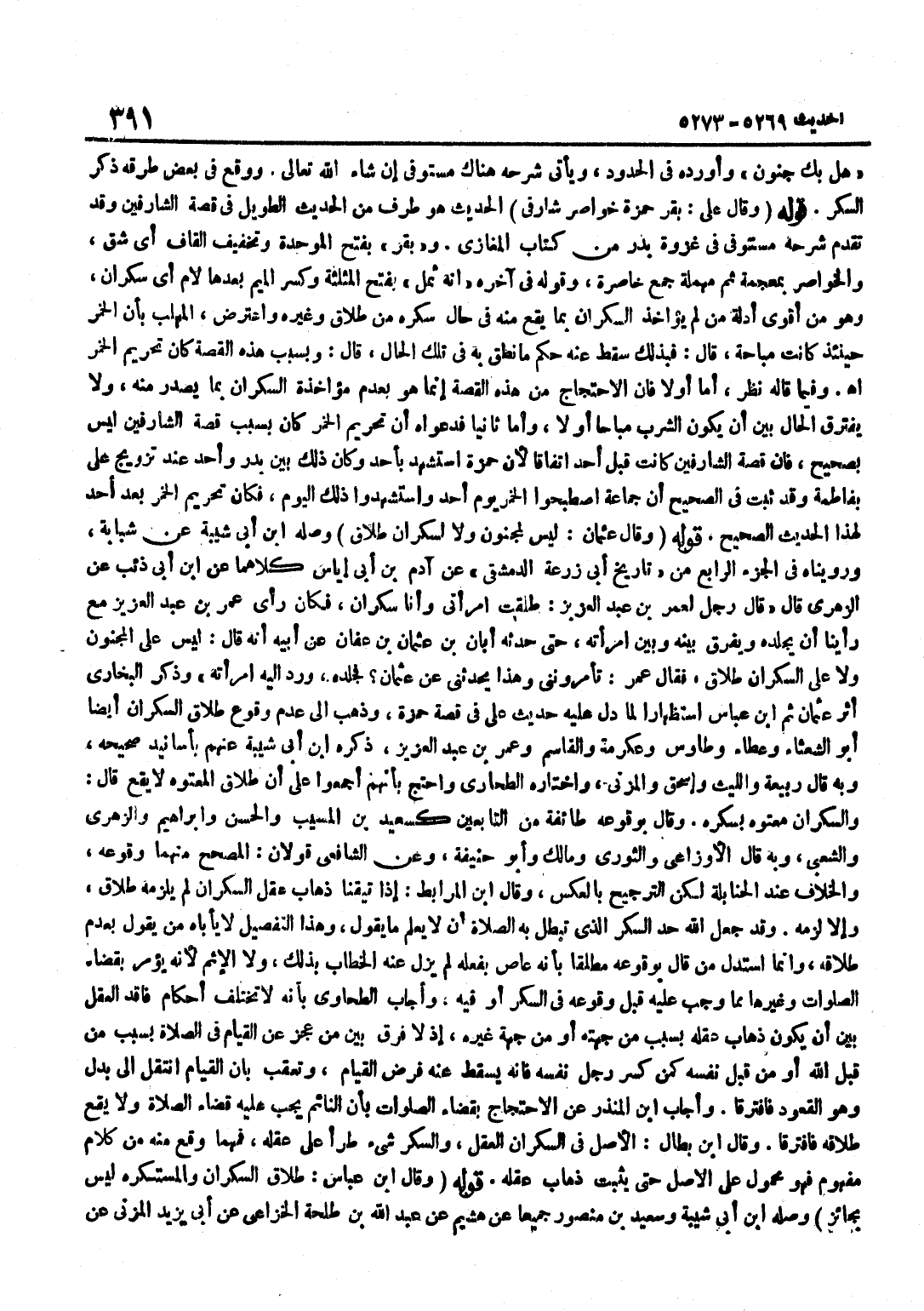 هَلْ بِكَ جُنُونٌ وَأَوْرَدَهُ فِي الْحُدُودِ وَيَأْتِي شَرْحُهُ هُنَاكَ مُسْتَوْفًى إِنْ شَاءَ اللَّهُ تَعَالَى وَوَقَعَ فِي بَعْضِ طُرُقِهِ ذِكْرُ السُّكْرِ قَوْلُهُ وَقَالَ عَلِيٌّ بَقَرَ حَمْزَةُ خَوَاصِرَ شَارِفَيَّ الْحَدِيثَ هُوَ طَرَفٌ مِنَ الْحَدِيثِ الطَّوِيلِ فِي قِصَّةِ الشَّارِفَيْنِ وَقَدْ تَقَدَّمَ شَرْحُهُ مُسْتَوْفًى فِي غَزْوَةِ بدر من كتاب الْمَغَازِي وبقر بِفَتْحِ الْمُوَحَّدَةِ وَتَخْفِيفِ الْقَافِ أَيْ شَقَّ وَالْخَوَاصِرُ بِمُعْجَمَةٍ ثُمَّ مُهْمَلَةٍ جَمْعُ خَاصِرَةٍ وَقَوْلُهُ فِي آخِرِهِ إِنَّهُ ثَمِلٌ بِفَتْحِ الْمُثَلَّثَةِ وَكَسْرِ الْمِيمِ بَعْدَهَا لَامٌ أَيْ سَكْرَانُ وَهُوَ مِنْ أَقْوَى أَدِلَّةِ مَنْ لَمْ يُؤَاخِذِ السَّكْرَانَ بِمَا يَقَعُ مِنْهُ فِي حَالِ سُكْرِهِ مِنْ طَلَاقٍ وَغَيْرِهِ وَاعْتَرَضَ الْمُهَلَّبُ بِأَنَّ الْخَمْرَ حِينَئِذٍ كَانَتْ مُبَاحَةً قَالَ فَبِذَلِكَ سَقَطَ عَنْهُ حُكْمُ مَا نَطَقَ بِهِ فِي تِلْكَ الْحَالِ قَالَ وَبِسَبَبِ هَذِهِ الْقِصَّةِ كَانَ تَحْرِيمُ الْخَمْرِ اه وَفِيمَا قَالَهُ نَظَرٌ أَمَّا أَوَّلًا فَإِنَّ الِاحْتِجَاجَ مِنْ هَذِهِ الْقِصَّة إِنَّمَا هُوَ بِعَدَمِ مُؤَاخَذَةِ السَّكْرَانِ بِمَا يُصْدَرُ مِنْهُ وَلَا يَفْتَرِقُ الْحَالُ بَيْنَ أَنْ يَكُونَ الشُّرْبُ مُبَاحًا أَوْ لَا وَأَمَّا ثَانِيًا فَدَعْوَاهُ أَنَّ تَحْرِيمَ الْخَمْرِ كَانَ بِسَبَبِ قِصَّةِ الشَّارِفَيْنِ لَيْسَ بِصَحِيحٍ فَإِنَّ قِصَّةَ الشَّارِفَيْنِ كَانَتْ قَبْلَ أُحُدٍ اتِّفَاقًا لِأَنَّ حَمْزَةَ اسْتُشْهِدَ بِأُحُدٍ وَكَانَ ذَلِكَ بَيْنَ بَدْرٍ وَأُحُدٍ عِنْدَ تَزْوِيجِ عَلِيٍّ بِفَاطِمَةَ وَقَدْ ثَبَتَ فِي الصَّحِيحِ أَنَّ جَمَاعَةً اصْطَبَحُوا الْخَمْرَ يَوْمَ أُحُدٍ وَاسْتُشْهِدُوا ذَلِكَ الْيَوْمَ فَكَانَ تَحْرِيمُ الْخَمْرِ بَعْدَ أُحُدٍ لِهَذَا الْحَدِيثِ الصَّحِيحِ قَوْلُهُ وَقَالَ عُثْمَانُ لَيْسَ لِمَجْنُونٍ وَلَا لِسَكْرَانَ طَلَاقٌ وَصَلَهُ بن أَبِي شَيْبَةَ عَنْ شَبَابَةَ وَرُوِّينَاهُ فِي الْجُزْءِ الرَّابِعِ مِنْ تَارِيخِ أَبِي زُرْعَةَ الدِّمَشْقِيِّ عَنْ آدم بن أبي إِيَاس كِلَاهُمَا عَن بن أَبِي ذِئْبٍ عَنِ الزُّهْرِيِّ قَالَ قَالَ رَجُلٌ لِعُمَرَ بْنِ عَبْدِ الْعَزِيزِ طَلَّقْتُ امْرَأَتِي وَأَنَا سَكْرَانُ فَكَانَ رَأْيُ عُمَرَ بْنِ عَبْدِ الْعَزِيزِ مَعَ رَأْيِنَا أَنْ يَجْلِدَهُ وَيُفَرِّقَ بَيْنَهُ وَبَيْنَ امْرَأَتِهِ حَتَّى حَدَّثَهُ أَبَانُ بْنُ عُثْمَانَ بْنِ عَفَّانَ عَنْ أَبِيهِ أَنَّهُ قَالَ لَيْسَ عَلَى الْمَجْنُون وَلَا على السَّكْرَان طَلَاق فَقَالَ عُمَرُ تَأْمُرُونَنِي وَهَذَا يُحَدِّثُنِي عَنْ عُثْمَانَ فَجَلَدَهُ وَرَدَّ إِلَيْهِ امْرَأَتَهُ وَذَكَرَ الْبُخَارِيُّ أَثَرَ عُثْمَانَ ثمَّ بن عَبَّاسٍ اسْتِظْهَارًا لِمَا دَلَّ عَلَيْهِ حَدِيثُ عَلِيٍّ فِي قِصَّةِ حَمْزَةَ وَذَهَبَ إِلَى عَدَمِ وُقُوعِ طَلَاقِ السَّكْرَانِ أَيْضًا أَبُو الشَّعْثَاءَ وَعَطَاءٌ وَطَاوُسٌ وَعِكْرِمَةُ وَالْقَاسِمُ وَعُمَرُ بْنُ عَبْدِ الْعَزِيزِ ذَكَرَهُ بن أَبِي شَيْبَةَ عَنْهُمْ بِأَسَانِيدَ صَحِيحَةٍ وَبِهِ قَالَ رَبِيعَةُ وَاللَّيْثُ وَإِسْحَاقُ وَالْمُزَنِيُّ وَاخْتَارَهُ الطَّحَاوِيُّ وَاحْتَجَّ بِأَنَّهُمْ أَجْمَعُوا عَلَى أَنَّ طَلَاقَ الْمَعْتُوهِ لَا يَقَعُ قَالَ وَالسَّكْرَانُ مَعْتُوهٌ بِسُكْرِهِ وَقَالَ بِوُقُوعِهِ طَائِفَةٌ مِنَ التَّابِعِينَ كَسَعِيدِ بْنِ الْمُسَيَّبِ وَالْحَسَنِ وَإِبْرَاهِيمَ وَالزُّهْرِيِّ وَالشَّعْبِيِّ وَبِهِ قَالَ الْأَوْزَاعِيُّ وَالثَّوْرِيُّ وَمَالِكٌ وَأَبُو حَنِيفَةَ وَعَنِ الشَّافِعِيِّ قَوْلَانِ الْمُصَحَّحُ مِنْهُمَا وُقُوعُهُ 