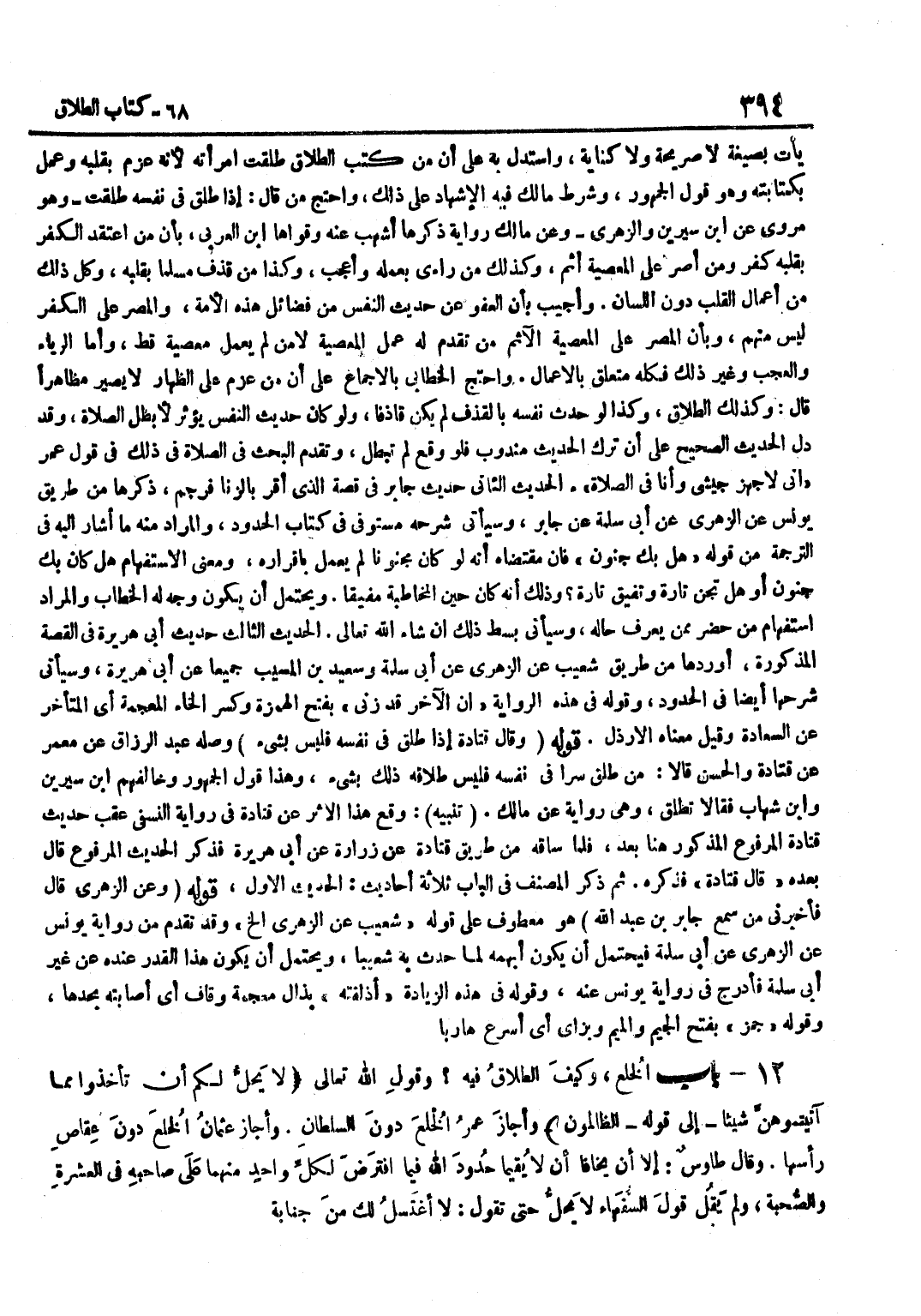 يَأْتِ بِصِيغَةٍ لَا صَرِيحَةٍ وَلَا كِنَايَةٍ وَاسْتُدِلَّ بِهِ عَلَى أَنَّ مَنْ كَتَبَ الطَّلَاقَ طَلُقَتِ امْرَأَتُهُ لِأَنَّهُ عَزَمَ بِقَلْبِهِ وَعَمَلَ بِكِتَابَتِهِ وَهُوَ قَوْلُ الْجُمْهُورِ وَشَرْطُ مَالِكٍ فِيهِ الْإِشْهَادُ عَلَى ذَلِك وَاحْتج من قَالَ إِذا طلق فِي نَفسه طلقت وَهُوَ مَرْوِيّ عَن بن سِيرِينَ وَالزُّهْرِيِّ وَعَنْ مَالِكٍ رِوَايَةٌ ذَكَرَهَا أَشْهَبُ عَنهُ وقواها بن الْعَرَبِيِّ بِأَنَّ مَنِ اعْتَقَدَ الْكُفْرَ بِقَلْبِهِ كَفَرَ وَمَنْ أَصَرَّ عَلَى الْمَعْصِيَةِ أَثِمَ وَكَذَلِكَ مَنْ رَاءَى بِعَمَلِهِ وَأُعْجِبَ وَكَذَا مَنْ قَذَفَ مُسْلِمًا بِقَلْبِهِ وَكُلُّ ذَلِكَ مِنْ أَعْمَالِ الْقَلْبِ دُونَ اللِّسَانِ وَأُجِيبَ بِأَنَّ الْعَفْوَ عَنْ حَدِيثِ النَّفْسِ مِنْ فَضَائِلِ هَذِهِ الْأُمَّةِ وَالْمُصِرُّ عَلَى الْكُفْرِ لَيْسَ مِنْهُمْ وَبِأَنَّ الْمُصِرَّ عَلَى الْمَعْصِيَةِ الْآثِمَ مَنْ تَقَدَّمَ لَهُ عَمَلُ الْمَعْصِيَةِ لَا مَنْ لَمْ يَعْمَلْ مَعْصِيَةً قَطُّ وَأَمَّا الرِّيَاءُ وَالْعُجْبُ وَغَيْرُ ذَلِكَ فَكُلُّهُ مُتَعَلِّقٌ بِالْأَعْمَالِ وَاحْتَجَّ الْخَطَّابِيُّ بِالْإِجْمَاعِ عَلَى أَنَّ مَنْ عَزَمَ عَلَى الظِّهَارِ لَا يَصِيرُ مُظَاهِرًا قَالَ وَكَذَلِكَ الطَّلَاقُ وَكَذَا لَوْ حَدَّثَ نَفْسَهُ بِالْقَذْفِ لَمْ يَكُنْ قَاذِفًا وَلَوْ كَانَ حَدِيثُ النَّفْسِ يُؤَثِّرُ لَأَبْطَلَ الصَّلَاةَ وَقَدْ دَلَّ الْحَدِيثُ الصَّحِيحُ عَلَى أَنَّ تَرْكَ الْحَدِيثِ مَنْدُوبٌ فَلَوْ وَقَعَ لَمْ تَبْطُلْ وَتَقَدَّمَ الْبَحْثُ فِي الصَّلَاةِ فِي ذَلِكَ فِي قَوْلِ عُمَرُ إِنِّي لِأُجَهِّزُ جَيْشِي وَأَنَا فِي الصَّلَاةِ الْحَدِيثُ الثَّانِي حَدِيثُ جَابِرٍ فِي قِصَّةِ الَّذِي أقرّ بالزنى فَرُجِمَ ذَكَرَهَا مِنْ طَرِيقِ يُونُسَ عَنِ الزَّهْرِيِّ عَنْ أَبِي سَلَمَةَ عَنْ جَابِرٍ وَسَيَأْتِي شَرْحُهُ مُسْتَوْفًى فِي كِتَابِ الْحُدُودِ وَالْمُرَادُ مِنْهُ مَا أَشَارَ إِلَيْهِ فِي التَّرْجَمَةِ مِنْ