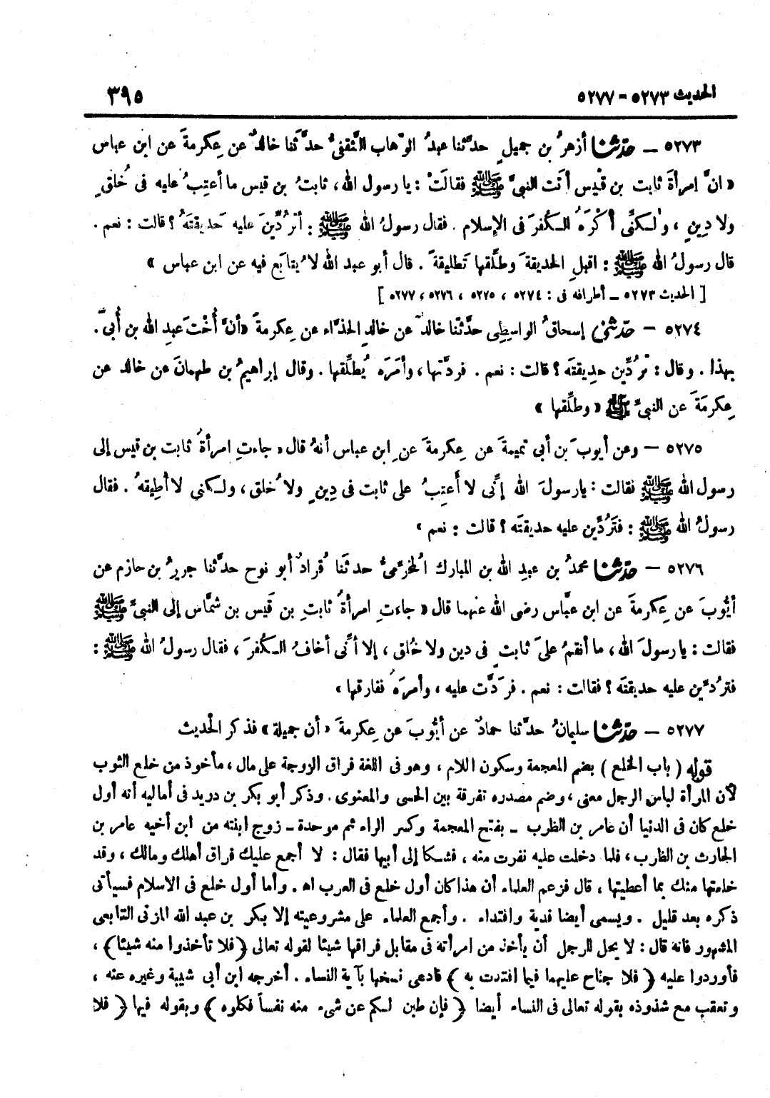 بِضَمِّ الْمُعْجَمَةِ وَسُكُونِ اللَّامِ وَهُوَ فِي اللُّغَةِ فِرَاقُ الزَّوْجَةِ عَلَى مَالٍ مَأْخُوذٌ مِنْ خَلَعَ الثَّوْبَ لِأَنَّ الْمَرْأَةَ لِبَاسُ الرَّجُلِ مَعْنًى وَضُمَّ مَصْدَرُهُ تَفْرِقَةً بَيْنَ الْحِسِّيِّ وَالْمَعْنَوِيِّ وَذَكَرَ أَبُو بَكْرِ بْنُ دُرَيْدٍ فِي أَمَالِيهِ أَنه أَوَّلَ خُلْعٍ كَانَ فِي الدُّنْيَا أَنَّ عَامِرَ بْنَ الظَّرِبِ بِفَتْحِ الْمُعْجَمَةِ وَكَسْرِ الرَّاءِ ثُمَّ مُوَحدَة زوج ابْنَته من بن أَخِيهِ عَامِرِ بْنِ الْحَارِثِ بْنِ الظَّرِبِ فَلَمَّا دَخَلَتْ عَلَيْهِ نَفَرَتْ مِنْهُ فَشَكَا إِلى أَبِيهَا فَقَالَ لَا أَجْمَعُ عَلَيْكَ فِرَاقَ أَهْلِكَ وَمَالِكَ وَقَدْ خَلَعْتُهَا مِنْكَ بِمَا أَعْطَيْتَهَا قَالَ فَزَعَمَ الْعُلَمَاءُ أَنَّ هَذَا كَانَ أَوَّلَ خُلْعٍ فِي الْعَرَبِ اه وَأَمَّا أَوَّلُ خُلْعٍ فِي الْإِسْلَامِ فَسَيَأْتِي ذِكْرُهُ بَعْدَ قَلِيلٍ وَيُسَمَّى أَيْضًا فِدْيَةً وَافْتِدَاءً وَأَجْمَعَ الْعُلَمَاءُ عَلَى مَشْرُوعِيَّتِهِ إِلَّا بَكْرَ بْنَ عَبْدِ اللَّهِ الْمُزَنِيَّ التَّابِعِيَّ الْمَشْهُورَ فَإِنَّهُ قَالَ لَا يَحِلُّ لِلرَّجُلِ أَنْ يَأْخُذَ مِنِ امْرَأَتِهِ فِي مُقَابِلِ فِرَاقِهَا شَيْئًا لِقَوْلِهِ تَعَالَى فَلَا تَأْخُذُوا مِنْهُ شَيْئا فَأَوْرَدُوا عَلَيْهِ فَلَا جُنَاحَ عَلَيْهِمَا فِيمَا افْتَدَتْ بِهِ فَادّعى نسخهَا بِآيَة النِّسَاء أخرجه بن أَبِي شَيْبَةَ وَغَيْرُهُ عَنْهُ وَتُعُقِّبَ مَعَ شُذُوذِهِ بِقَوْلِهِ تَعَالَى فِي النِّسَاءِ أَيْضًا فَإِنْ طِبْنَ لكم عَن شَيْء مِنْهُ نفسا فكلوه وَبِقَوْلِهِ فِيهَا فَلَا