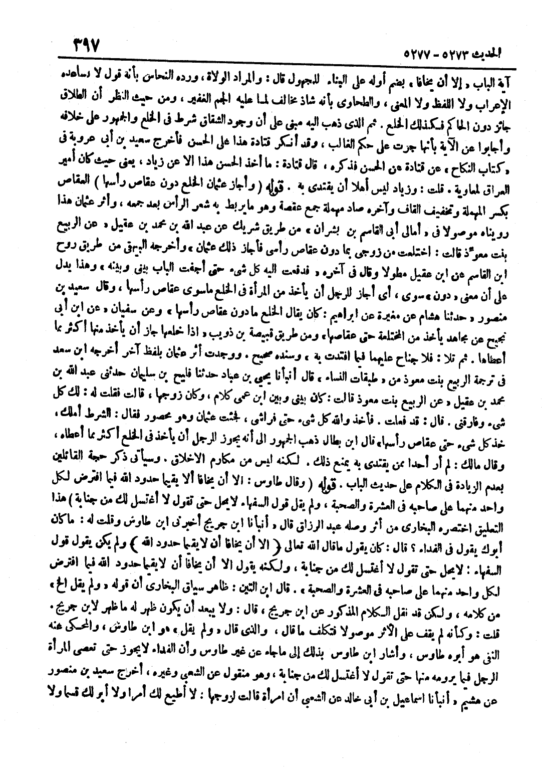 آيَة الْبَاب الا أَن يخافا بِضَمِّ أَوَّلِهِ عَلَى الْبِنَاءِ لِلْمَجْهُولِ قَالَ وَالْمُرَادُ الْوُلَاةُ وَرَدَّهُ النَّحَّاسُ بِأَنَّهُ قَوْلٌ لَا يُسَاعِدُهُ الْإِعْرَابُ وَلَا اللَّفْظُ وَلَا الْمَعْنَى وَالطَّحَاوِيُّ بِأَنَّهُ شَاذٌّ مُخَالِفٌ لِمَا عَلَيْهِ الْجَمُّ الْغَفِيرُ وَمِنْ حَيْثُ النَّظَرُ أَنَّ الطَّلَاقَ جَائِزٌ دُونَ الْحَاكِمِ فَكَذَلِكَ الْخُلْعُ ثُمَّ الَّذِي ذَهَبَ إِلَيْهِ مَبْنِيٌّ عَلَى أَنَّ وُجُودَ الشِّقَاقِ شَرْطٌ فِي الْخُلْعِ وَالْجُمْهُورُ عَلَى خِلَافِهِ وَأَجَابُوا عَنِ الْآيَةِ بِأَنَّهَا جَرَتْ عَلَى حُكْمِ الْغَالِبِ وَقَدْ أَنْكَرَ قَتَادَةُ هَذَا عَلَى الْحَسَنِ فَأَخْرَجَ سَعِيدُ بْنُ أَبِي عَرُوبَةَ فِي كِتَابِ النِّكَاحِ عَن قَتَادَة عَن الْحَسَنِ فَذَكَرَهُ قَالَ قَتَادَةُ مَا أَخَذَ الْحَسَنُ هَذَا إِلَّا عَنْ زِيَادٍ يَعْنِي حَيْثُ كَانَ أَمِيرَ الْعِرَاقِ لِمُعَاوِيَةَ قُلْتُ وَزِيَادٌ لَيْسَ أَهْلًا أَنْ يُقْتَدَى بِهِ قَوْلُهُ وَأَجَازَ عُثْمَانُ الْخُلْعَ دُونَ عِقَاصِ رَأْسِهَا الْعِقَاصُ بِكَسْرِ الْمُهْمَلَةِ وَتَخْفِيفِ الْقَافِ وَآخِرُهُ صَادٌ مُهْمَلَةٌ جَمْعُ عِقْصَةٍ وَهُوَ مَا يُرْبَطُ بِهِ شَعْرُ الرَّأْسِ بَعْدَ جَمْعِهِ وَأَثَرُ عُثْمَانَ هَذَا رَوَيْنَاهُ مَوْصُولًا فِي أَمَالِي أَبِي الْقَاسِمِ بْنِ بَشْرَانِ مِنْ طَرِيقِ شَرِيكٍ عَنْ عَبْدِ اللَّهِ بْنِ مُحَمَّدِ بْنِ عُقَيْلٍ عَنْ الرُّبَيِّعِ بِنْتِ مُعَوِّذٍ قَالَتِ اخْتَلَعْتُ مِنْ زَوْجِي بِمَا دُونَ عِقَاصِ رَأْسِي فَأَجَازَ ذَلِكَ عُثْمَانُ وَأَخْرَجَهُ الْبَيْهَقِيُّ مِنْ طَرِيقِ رَوْحِ بْنِ الْقَاسِم عَن بن عَقِيلٍ مُطَوَّلًا وَقَالَ فِي آخِرِهِ فَدَفَعْتُ إِلَيْهِ كُلَّ شَيْءٍ حَتَّى أَجَفْتُ الْبَابَ بَيْنِي وَبَيْنَهُ وَهَذَا يَدُلُّ عَلَى أَنَّ مَعْنَى دُونَ سِوَى أَيْ أَجَازَ لِلرَّجُلِ أَنْ يَأْخُذَ مِنَ الْمَرْأَةِ فِي الْخُلْعِ مَا سِوَى عِقَاصِ رَأْسِهَا وَقَالَ سَعِيدُ بْنُ مَنْصُورٍ حَدَّثَنَا هِشَامٌ عَنْ مُغِيرَةَ عَنْ إِبْرَاهِيمَ كَانَ يُقَالُ الْخُلْعُ مَا دُونَ عقَاص رَأسهَا وَعَن سُفْيَان عَن بن أَبِي نَجِيحٍ عَنْ مُجَاهِدٍ يَأْخُذُ مِنَ الْمُخْتَلِعَةِ حَتَّى عقاصها وَمن طَرِيق قبيصَة بن ذويب إِذَا خَلَعَهَا جَازَ أَنْ يَأْخُذَ مِنْهَا أَكْثَرَ مِمَّا أَعْطَاهَا ثُمَّ تَلَا فَلَا جُنَاحَ عَلَيْهِمَا فِيمَا افتدت بِهِ وَسَنَدُهُ صَحِيحٌ وَوَجَدْتُ أَثَرَ عُثْمَانَ بِلَفْظٍ آخَرَ أخرجه بن سَعْدٍ فِي تَرْجَمَةِ الرُّبَيِّعِ بِنْتِ مُعَوِّذٍ مِنْ طَبَقَاتِ النِّسَاءِ قَالَ أَنْبَأَنَا يَحْيَى بْنُ عَبَّادٍ حَدَّثَنَا فُلَيْحُ بْنُ سُلَيْمَانَ حَدَّثَنِي عَبْدِ اللَّهِ بْنِ مُحَمَّدِ بْنِ عُقَيْلٍ عَنْ الرّبيع بنت معوذ قَالَت كَانَ بيني وَبَين بن عَمِّي كَلَامٌ وَكَانَ زَوْجَهَا قَالَتْ فَقُلْتُ لَهُ لَكَ كُلُّ شَيْءٍ وَفَارِقْنِي قَالَ قَدْ فَعَلْتُ فَأَخَذَ وَاللَّهِ كُلَّ شَيْءٍ حَتَّى فِرَاشِي فَجِئْتُ عُثْمَانَ وَهُوَ مَحْصُورٌ فَقَالَ الشَّرْطُ أَمْلَكُ خُذْ كل شَيْء حَتَّى عقَاص رَأسهَا قَالَ بن بَطَّالٍ ذَهَبَ الْجُمْهُورُ إِلَى أَنَّهُ يَجُوزُ لِلرَّجُلِ أَنْ يَأْخُذَ فِي الْخُلْعِ أَكْثَرَ مِمَّا أَعْطَاهُ وَقَالَ مَالِكٌ لَمْ أَرَ أَحَدًا مِمَّنْ يُقْتَدَى بِهِ يَمْنَعُ ذَلِكَ لَكِنَّهُ لَيْسَ مِنْ مَكَارِمِ الْأَخْلَاقِ وَسَيَأْتِي ذِكْرُ حُجَّةِ الْقَائِلِينَ بِعَدَمِ الزِّيَادَةِ فِي الْكَلَامِ عَلَى حَدِيثِ الْبَابِ قَوْلُهُ وَقَالَ طَاوُسٌ إِلَّا أَنْ يَخَافَا أَلَّا يُقِيمَا حُدُودَ اللَّهِ فِيمَا افْتَرَضَ لِكُلِّ وَاحِدٍ مِنْهُمَا عَلَى صَاحِبِهِ فِي الْعِشْرَةِ وَالصُّحْبَةِ وَلَمْ يَ