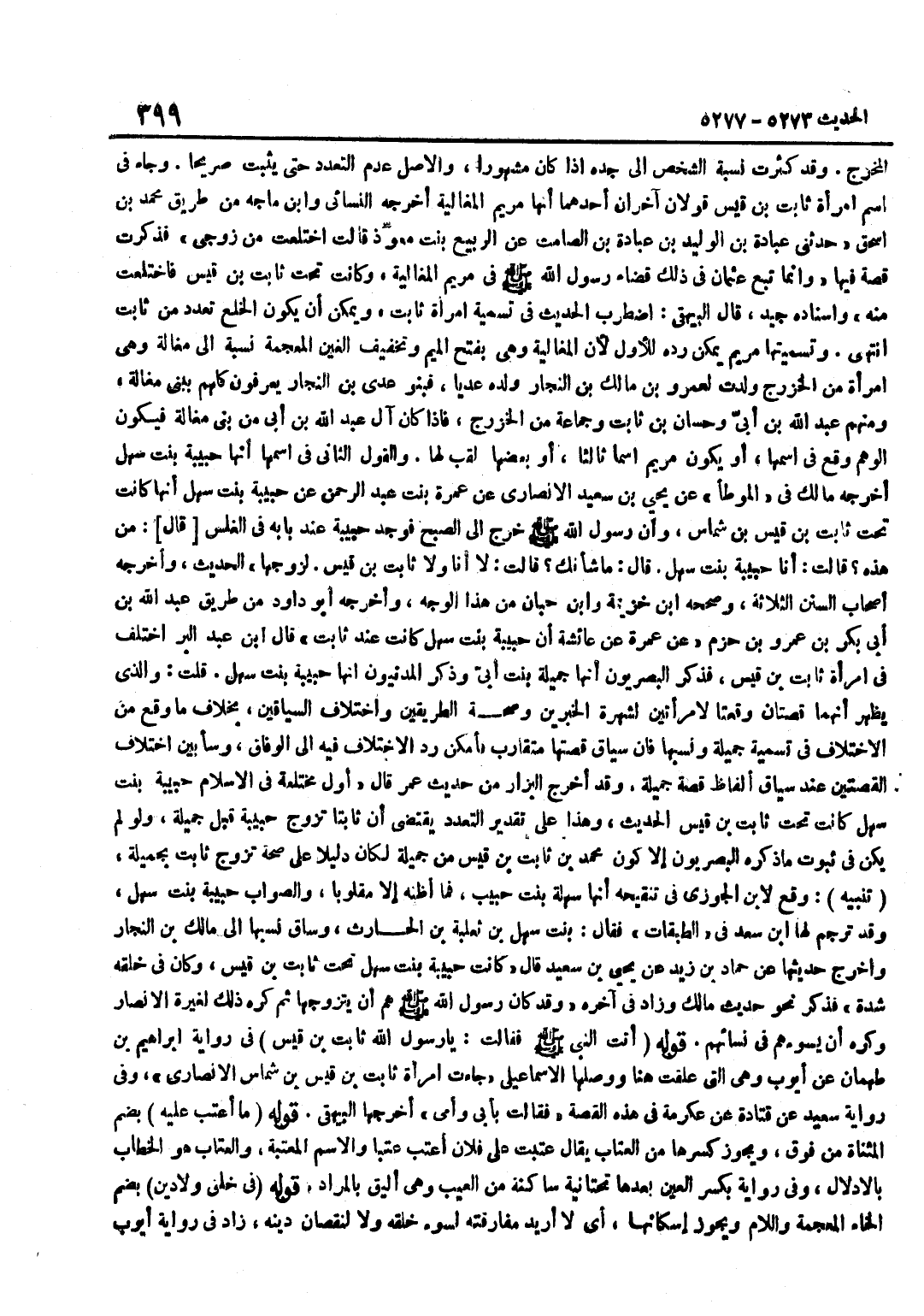 الْمَخْرَجِ وَقَدْ كَثُرَتْ نِسْبَةُ الشَّخْصِ إِلَى جَدِّهِ إِذَا كَانَ مَشْهُورًا وَالْأَصْلُ عَدَمُ التَّعَدُّدِ حَتَّى يَثْبُتَ صَرِيحًا وَجَاءَ فِي اسْمِ امْرَأَةِ ثَابِتِ بْنِ قَيْسٍ قَوْلَانِ آخَرَانِ أَحَدُهُمَا أَنَّهَا مَرْيَمُ المغالية أخرجه النَّسَائِيّ وبن مَاجَهْ مِنْ طَرِيقِ مُحَمَّدِ بْنِ إِسْحَاقَ حَدَّثَنِي عُبَادَةَ بْنِ الْوَلِيدِ بْنِ عُبَادَةَ بْنِ الصَّامِتِ عَنِ الرُّبَيِّعِ بِنْتِ مُعَوِّذٍ قَالَتِ اخْتَلَعْتُ مِنْ زَوْجِي فَذَكَرَتْ قِصَّةً فِيهَا وَإِنَّمَا تَبِعَ عُثْمَانُ فِي ذَلِكَ قَضَاءَ رَسُولِ اللَّهِ صَلَّى اللَّهُ عَلَيْهِ وَسَلَّمَ فِي مَرْيَمَ الْمَغَالِيَّةِ وَكَانَتْ تَحْتَ ثَابِتِ بْنِ قَيْسٍ فَاخْتَلَعَتْ مِنْهُ وَإِسْنَادُهُ جَيِّدٌ قَالَ الْبَيْهَقِيُّ اضْطَرَبَ الْحَدِيثُ فِي تَسْمِيَةِ امْرَأَةِ ثَابِتٍ وَيُمْكِنُ أَنْ يَكُونَ الْخُلْعُ تَعَدَّدَ مِنْ ثَابِتٍ انْتَهَى وَتَسْمِيَتُهَا مَرْيَمَ يُمْكِنُ رَدُّهُ لِلْأَوَّلِ لِأَنَّ الْمَغَالِيَّةَ وَهِيَ بِفَتْحِ الْمِيمِ وَتَخْفِيفِ الْغَيْنِ الْمُعْجَمَةِ نِسْبَةٌ إِلَى مَغَالَةَ وَهِيَ امْرَأَةٌ مِنَ الْخَزْرَجِ وَلَدَتْ لِعَمْرِو بْنِ مَالِكِ بْنِ النَّجَّارِ وَلَدُهَ عَدِيًّا فَبَنُو عَدِيِّ بْنِ النَّجَّارِ يُعْرَفُونَ كُلُّهُمْ بِبَنِي مَغَالَةَ وَمِنْهُمْ عَبْدُ اللَّهِ بْنُ أُبَيِّ وَحَسَّانُ بْنُ ثَابِتٍ وَجَمَاعَةٌ مِنَ الْخَزْرَجِ فَإِذَا كَانَ آلُ عَبْدِ اللَّهِ بْنِ أُبَيٍّ مِنْ بَنِي مَغَالَةَ فَيَكُونُ الْوَهْمُ وَقَعَ فِي اسْمِهَا أَوْ يَكُونُ مَرْيَمُ اسْمًا ثَالِثًا أَوْ بَعْضُهَا لَقَبٌ لَهَا وَالْقَوْلُ الثَّانِي فِي اسْمِهَا أَنَّهَا حَبِيبَةُ بِنْتُ سَهْلٍ أَخْرَجَهُ مَالِكٌ فِي الْمُوَطَّأِ عَنْ يَحْيَى بْنِ سَعِيدٍ الْأَنْصَارِيِّ عَنْ عَمْرَةَ بِنْتِ عَبْدِ الرَّحْمَنِ عَنْ حَبِيبَةَ بِنْتِ سَهْلٍ أَنَّهَا كَانَتْ تَحْتَ ثَابِتِ بْنِ قَيْسِ بْنِ شَمَّاسٍ وَإِنَّ رَسُولَ اللَّهِ صَلَّى اللَّهُ عَلَيْهِ وَسَلَّمَ خَرَجَ إِلَى الصُّبْحِ فَوَجَدَ حَبِيبَةَ عِنْدَ بَابِهِ فِي الْغَلَسِ قَالَ مَنْ هَذِهِ قَالَتْ أَنَا حَبِيبَةُ بِنْتُ سَهْلٍ قَالَ مَا شَأْنُكِ قَالَتْ لَا أَنَا وَلَا ثَابِتُ بْنُ قَيْسٍ لِزَوْجِهَا الْحَدِيثَ وَأَخْرَجَهُ أَصْحَابُ السُّنَنِ الثَّلَاثَةُ وَصَححهُ بن خُزَيْمَة وبن حِبَّانَ مِنْ هَذَا الْوَجْهِ وَأَخْرَجَهُ أَبُو دَاوُدَ مِنْ طَرِيقِ عَبْدِ اللَّهِ بْنِ أَبِي بَكْرِ بْنِ عَمْرِو بْنِ حَزْمٍ عَنْ عَمْرَةَ عَنْ عَائِشَةَ أَنَّ حَبِيبَةَ بِنْتَ سَهْلٍ كَانَتْ عِنْدَ ثَابِتٍ قَالَ بن عَبْدِ الْبَرِّ اخْتُلِفَ فِي امْرَأَةِ ثَابِتِ بْنِ قَيْسٍ فَذَكَرَ الْبَصْرِيُّونَ أَنَّهَا جَمِيلَةُ بِنْتُ أُبَيٍّ وَذَكَرَ الْمَدَنِيُّونَ أَنَّهَا حَبِيبَةُ بِنْتُ سَهْلٍ قُلْتُ وَالَّذِي يَظْهَرُ أَنَّهُمَا قِصَّتَانِ وَقَعَتَا لِامْرَأَتَيْنِ لِشُهْرَةِ الْخَبَرَيْنِ وَصِحَّةِ الطَّرِيقِينَ وَاخْتِلَافُ السِّيَاقَيْنِ بِخِلَافِ مَا وَقَعَ مِنَ الِاخْتِلَافِ فِي تَسْمِيَةِ جَمِيلَةَ وَنَسَبِهَا فَإِنَّ سِيَاقَ قِصَّتِهَا مُتَقَارِبٌ فَأَمْكَنَ رَدُّ الِاخْتِلَافِ فِيهِ إِلَى الْوِفَاقِ وَسَأُبَيِّنُ اخْتِلَافَ الْقِصَّتَيْنِ عِنْدَ سِيَاقِ أَلْفَاظِ قِصَّةِ جَمِيلَةَ وَقَدْ أَخْرَجَ الْبَزَّارُ مِنْ حَدِيثِ عُمَرَ قَالَ أَوَّلُ مُخْتَلِعَةٍ فِي الْإِسْلَامِ حَبِيبَةُ بِنْتُ سَهْلٍ كَانَتْ تَحْتَ ثَابِتِ بْنِ قَيْسٍ الْحَدِيثَ وَهَذَا عَلَى تَقْدِيرِ التَّعَدُّدِ يَقْتَضِي أَنَّ ثَابِتًا تَزَوَّجَ حَبِيبَةَ قَبْلَ جَمِيلَةَ وَلَوْ لَمْ يَكُنْ فِي ثُبُوتِ مَا ذَكَرَهُ الْبَصْرِيُّونَ إِلَّا كَوْنَ مُحَمَّدِ 