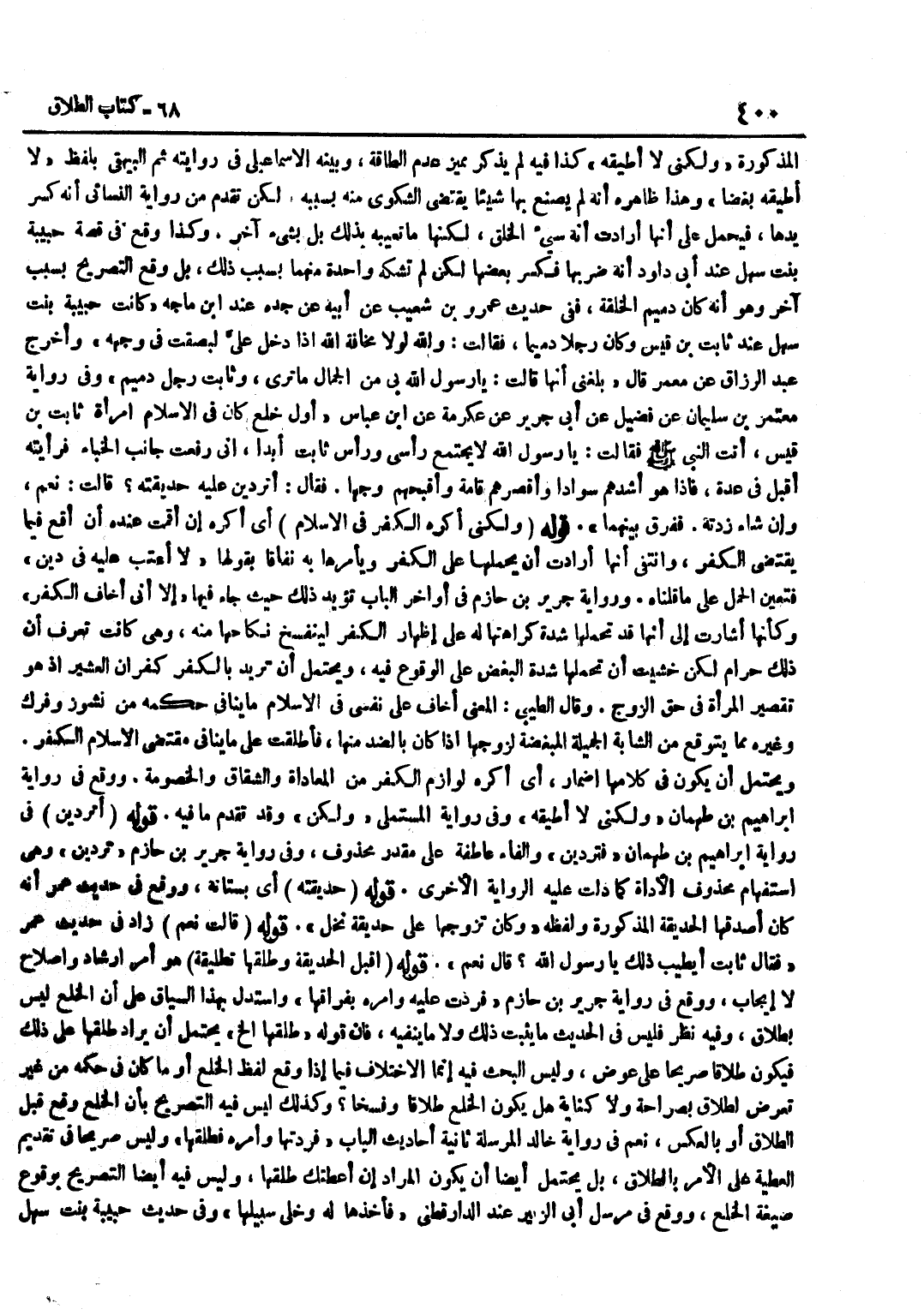 الْمَذْكُورَةِ وَلَكِنِّي لَا أُطِيقُهُ كَذَا فِيهِ لَمْ يَذْكُرْ مُمَيِّزَ عَدَمِ الطَّاقَةِ وَبَيَّنَهُ الْإِسْمَاعِيلِيُّ فِي رِوَايَتِهِ ثُمَّ الْبَيْهَقِيُّ بِلَفْظِ لَا أُطِيقُهُ بُغْضًا وَهَذَا ظَاهِرُهُ أَنَّهُ لَمْ يَصْنَعْ بِهَا شَيْئًا يَقْتَضِي الشَّكْوَى مِنْهُ بِسَبَبِهِ لَكِنْ تَقَدَّمَ مِنْ رِوَايَةِ النَّسَائِيِّ أَنَّهُ كَسَرَ يَدَهَا فَيُحْمَلُ عَلَى أَنَّهَا أَرَادَت أَنه سيء الْخُلُقِ لَكِنَّهَا مَا تَعِيبُهُ بِذَلِكَ بَلْ بِشَيْءٍ آخَرَ وَكَذَا وَقَعَ فِي قِصَّةِ حَبِيبَةَ بِنْتِ سَهْلٍ عِنْدَ أَبِي دَاوُدَ أَنَّهُ ضَرَبَهَا فَكَسَرَ بَعْضَهَا لَكِنْ لَمْ تَشْكُهُ وَاحِدَةً مِنْهُمَا بِسَبَبِ ذَلِكَ بَلْ وَقَعَ التَّصْرِيحُ بِسَبَبٍ آخَرَ وَهُوَ أَنَّهُ كَانَ دَمِيمَ الْخِلْقَةِ فَفِي حَدِيثِ عَمْرِو بْنِ شُعَيْبٍ عَنْ أَبِيهِ عَنْ جَدِّهِ عِنْدَ بن مَاجَهْ كَانَتْ حَبِيبَةُ بِنْتُ سَهْلٍ عِنْدَ ثَابِتِ بْنِ قَيْسٍ وَكَانَ رَجُلًا دَمِيمًا فَقَالَتْ وَاللَّهِ لَوْلَا مَخَافَةُ اللَّهِ إِذَا دَخَلَ عَلَيَّ لَبَصَقْتُ فِي وَجْهِهِ وَأَخْرَجَ عَبْدُ الرَّزَّاقِ عَنْ مَعْمَرٍ قَالَ بَلَغَنِي أَنَّهَا قَالَتْ يَا رَسُولَ اللَّهِ بِي مِنَ الْجَمَالِ مَا تَرَى وَثَابِتٌ رَجُلٌ دَمِيمٌ وَفِي رِوَايَةِ مُعْتَمِرِ بْنِ سُلَيْمَانَ عَنْ فُضَيْلٍ عَنْ أَبِي جَرِيرٍ عَنْ عِكْرِمَةَ عَنِ بن عَبَّاسٍ أَوَّلُ خُلْعٍ كَانَ فِي الْإِسْلَامِ امْرَأَةُ ثَابِتِ بْنِ قَيْسٍ أَتَتِ النَّبِيَّ صَلَّى اللَّهُ عَلَيْهِ وَسَلَّمَ فَقَالَتْ يَا رَسُولَ اللَّهِ لَا يَجْتَمِعُ رَأْسِي وَرَأْسُ ثَابِتٍ أَبَدًا إِنِّي رَفَعْتُ جَانِبَ الْخِبَاءِ فَرَأَيْتُهُ أَقْبَلَ فِي عِدَّةٍ فَإِذَا هُوَ أَشَدُّهُمْ سَوَادًا وَأَقْصَرُهُمْ قَامَةً وَأَقْبَحُهُمْ وَجْهًا فَقَالَ أَتَرُدِّينَ عَلَيْهِ حَدِيقَتَهُ قَالَتْ نَعَمْ وَإِنْ شَاءَ زِدْتُهُ فَفَرَّقَ بَيْنَهُمَا قَوْلُهُ وَلَكِنِّي أَكْرَهُ الْكُفْرَ فِي الْإِسْلَامِ أَيْ أَكْرَهُ إِنْ أَقَمْتُ عِنْدَهُ أَنْ أَقَعَ فِيمَا يَقْتَضِي الْكُفْرَ وَانْتَفَى أَنَّهَا أَرَادَتْ أَنْ يَحْمِلَهَا عَلَى الْكُفْرِ وَيَأْمُرَهَا بِهِ نِفَاقًا بِقَوْلِهَا لَا أَعْتُبُ عَلَيْهِ فِي دَيْنٍ فَتَعَيَّنَ الْحَمْلُ عَلَى مَا قُلْنَاهُ وَرِوَايَةُ جَرِيرِ بْنِ حَازِمٍ فِي أَوَاخِرِ الْبَابِ تُؤَيِّدُ ذَلِكَ حَيْثُ جَاءَ فِيهَا إِلَّا أَنِّي أَخَافُ الْكُفْرَ وَكَأَنَّهَا أَشَارَتْ إِلَى أَنَّهَا قَدْ تَحْمِلُهَا شِدَّةُ كَرَاهَتِهَا لَهُ عَلَى إِظْهَارِ الْكُفْرِ لِيَنْفَسِخَ نِكَاحُهَا مِنْهُ وَهِيَ كَانَتْ تَعْرِفُ أَنَّ ذَلِكَ حَرَامٌ لَكِنْ خَشِيَتْ أَنْ تَحْمِلَهَا شِدَّةُ الْبُغْضِ عَلَى الْوُقُوعِ فِيهِ وَيُحْتَمَلُ أَنْ تُرِيدَ بِالْكُفْرِ كُفْرَانُ الْعَشِيرِ إِذْ هُوَ تَقْصِيرُ الْمَرْأَةِ فِي حَقِّ الزَّوْجِ وَقَالَ الطِّيبِيُّ الْمَعْنَى أَخَافُ عَلَى نَفْسِي فِي الْإِسْلَامِ مَا يُنَافِي حُكْمَهُ مِنْ نُشُوزٍ وَفَرْكٍ وَغَيْرِهِ مِمَّا يُتَوَقَّعُ مِنَ الشَّابَّةِ الْجَمِيلَةِ الْمُبْغِضَةِ لِزَوْجِهَا إِذَا كَانَ بِالضِّدِّ مِنْهَا فَأَطْلَقَتْ عَلَى مَا يُنَافِي مُقْتَضَى الْإِسْلَامِ الْكُفْرَ وَيُحْتَمَلُ أَنْ يَكُونَ فِي كَلَامِهَا إِضْمَارٌ أَيْ إِكْرَاهُ لَوَازِمِ الْكُفْرِ مِنَ الْمُعَادَاةِ وَالشِّقَاقِ وَالْخُصُومَةِ وَوَقَعَ فِي رِوَايَةِ إِبْرَاهِيمَ بْنِ طَهْمَانَ وَلَكِنِّي لَا أُطِيقُهُ وَفِي رِوَايَةِ الْمُسْتَمْلِي وَلَكِنْ وَقَدْ تَقَدَّمَ مَا فِيهِ قَوْلُهُ أَتَرُدِّينَ فِي رِوَايَةِ إِبْرَاهِيمَ بْنِ طَهْمَانَ فَتَرُدِّينَ وَالْفَاءُ عَاطِفَةٌ عَلَى مُقَدَّرٍ مَحْذُوفٍ وَفِي رِوَايَةِ 