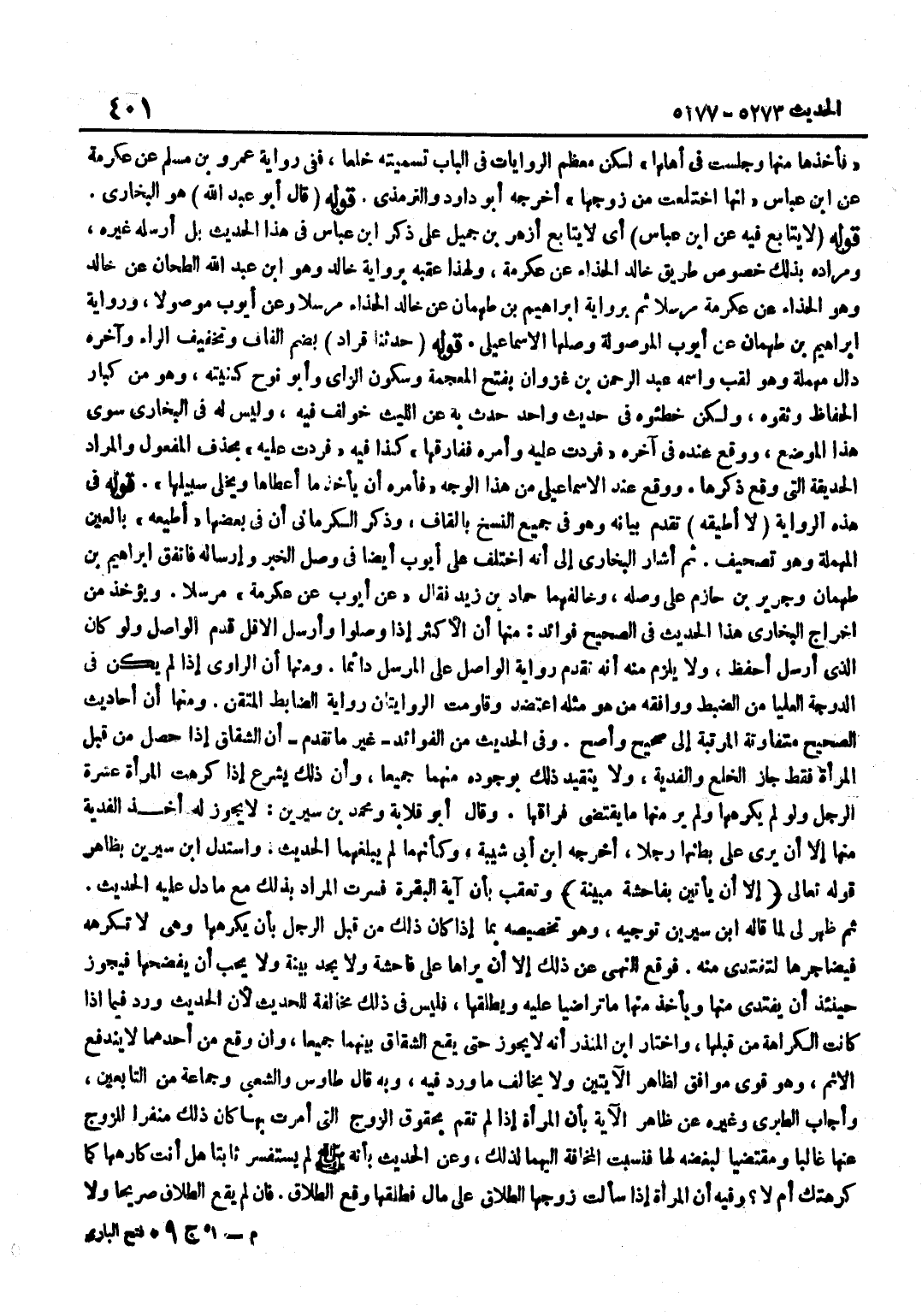 [5276] قَوْلُهُ حَدَّثَنَا قُرَادٌ بِضَمِّ الْقَافِ وَتَخْفِيفِ الرَّاءِ وَآخِرُهُ دَالٌ مُهْمَلَةٌ وَهُوَ لَقَبٌ وَاسْمُهُ عَبْدُ الرَّحْمَنِ بْنُ غَزْوَانَ بِفَتْحِ الْمُعْجَمَةِ وَسُكُونِ الزَّايِ وَأَبُو نُوحٍ كُنْيَتُهُ وَهُوَ مِنْ كِبَارِ الْحُفَّاظِ وَثَّقُوهُ وَلَكِنْ خَطَّئُوهُ فِي حَدِيثٍ وَاحِدٍ حَدَّثَ بِهِ عَنِ اللَّيْثِ خُولِفَ فِيهِ وَلَيْسَ لَهُ فِي الْبُخَارِيِّ سِوَى هَذَا الْمَوْضِعِ وَوَقَعَ عِنْدَهُ فِي آخِرِهِ فَرُدَّتْ عَلَيْهِ وَأَمَرَهُ فَفَارَقَهَا كَذَا فِيهِ فَرَدَّتْ عَلَيْهِ بِحَذْفِ الْمَفْعُولِ وَالْمُرَادُ الْحَدِيقَةُ الَّتِي وَقَعَ ذِكْرُهَا وَوَقَعَ عِنْدَ الْإِسْمَاعِيلِيِّ مِنْ هَذَا الْوَجْه فَأمره أَن يَأْخُذ أَعْطَاهَا ويخلي سَبِيلهَا قَوْلُهُ فِي هَذِهِ الرِّوَايَةِ لَا أُطِيقُهُ تَقَدَّمَ بَيَانُهُ وَهُوَ فِي جَمِيعِ النُّسَخِ بِالْقَافِ وَذَكَرَ الْكِرْمَانِيُّ أَنَّ فِي بَعْضِهَا أُطِيعُهُ بِالْعَيْنِ الْمُهْمَلَةِ وَهُوَ تَصْحِيفٌ ثُمَّ أَشَارَ الْبُخَارِيُّ إِلَى أَنَّهُ اخْتُلِفَ عَلَى أَيُّوبَ أَيْضًا فِي وَصْلِ الْخَبَرِ وَإِرْسَالِهِ فَاتَّفَقَ إِبْرَاهِيمُ بْنُ طَهْمَانَ وَجَرِيرُ بْنُ حَازِمٍ عَلَى وَصْلِهِ وَخَالَفَهُمَا حَمَّادُ بْنُ زَيْدٍ فَقَالَ عَنْ أَيُّوبَ عَنْ عِكْرِمَةَ مُرْسَلًا وَيُؤْخَذُ مِنْ إِخْرَاجِ الْبُخَارِيِّ هَذَا الْحَدِيثَ فِي الصَّحِيحِ فَوَائِدُ مِنْهَا أَنَّ الْأَكْثَرَ إِذَا وَصَلُوا وَأَرْسَلَ الْأَقَلُّ قُدِّمَ الْوَاصِلُ وَلَوْ كَانَ الَّذِي أَرْسَلَ أَحْفَظَ وَلَا يَلْزَمُ مِنْهُ أَنَّهُ تُقَدَّمُ رِوَايَةُ الْوَاصِلِ عَلَى الْمُرْسِلِ دَائِمًا وَمِنْهَا أَنَّ الرَّاوِيَ إِذَا لَمْ يَكُنْ فِي الدَّرَجَةِ الْعُلْيَا مِنَ الضَّبْطِ وَوَافَقَهُ مَنْ هُوَ مِثْلُهُ اعْتَضَدَ وَقَاوَمَتِ الرِّوَايَتَانِ رِوَايَةَ الضَّابِطِ الْمُتْقِنِ وَمِنْهَا أَنَّ أَحَادِيثَ الصَّحِيحِ مُتَفَاوِتَةُ الْمَرْتَبَةِ إِلَى صَحِيحٍ وَأَصَحَّ وَفِي الْحَدِيثِ مِنَ الْفَوَائِدِ غَيْرِ مَا تَقَدَّمَ أَنَّ الشِّقَاقَ إِذَا حَصَلَ مِنْ قِبَلِ الْمَرْأَةِ فَقَطْ جَازَ الْخُلْعُ وَالْفِدْيَةُ وَلَا يَتَقَيَّدُ ذَلِكَ بِوُجُودِهِ مِنْهُمَا جَمِيعًا وَأَنَّ ذَلِكَ يُشْرَعُ إِذَا كَرِهَتِ الْمَرْأَةُ عِشْرَةَ الرَّجُلِ وَلَوْ لَمْ يَكْرَهْهَا وَلَمْ يَرَ مِنْهَا مَا يَقْتَضِي فِرَاقَهَا وَقَالَ أَبُو قِلَابَةَ وَمُحَمَّدُ بْنُ سِيرِينَ لَا يَجُوزُ لَهُ أَخْذَ الْفِدْيَةِ مِنْهَا إِلَّا أَنْ يَرَى عَلَى بَطنهَا رجلا أخرجه بن أَبِي شَيْبَةَ وَكَأَنَّهُمَا لَمْ يَبْلُغْهُمَا الْحَدِيثُ وَاسْتَدَلَّ بن سِيرِينَ بِظَاهِرِ قَوْلِهِ تَعَالَى إِلَّا أَنْ يَأْتِينَ بِفَاحِشَة مبينَة وَتُعُقِّبَ بِأَنَّ آيَةَ الْبَقَرَةِ فَسَّرَتِ الْمُرَادَ بِذَلِكَ مَعَ مَا دَلَّ عَلَيْهِ الْحَدِيثُ ثُمَّ ظَهَرَ لي لما قَالَه بن سِيرِينَ تَوْجِيهٌ وَهُوَ تَخْصِيصُهُ بِمَا إِذَا كَانَ ذَلِكَ مِنْ قِبَلِ الرَّجُلِ بِأَنْ يَكْرَهَهَا وَهِيَ لَا تَكْرَهُهُ فَيُضَاجِرُهَا لِتَفْتَدِيَ مِنْهُ فَوَقَعَ النَّهْيُ عَنْ ذَلِكَ إِلَّا أَنْ يَرَاهَا عَلَى فَاحِشَةٍ وَلَا يَجِدُ بَيِّنَةً وَلَا يُحِبُّ أَنْ يَفْضَحَهَا فَيَجُوزُ حِينَئِذٍ أَنْ يَفْتَدِيَ مِنْهَا وَيَأْخُذَ مِنْهَا مَا تَرَاضَيَا عَلَيْهِ وَيُطَلِّقَهَا فَلَيْسَ فِي ذَلِكَ مُخَالَفَةٌ لِلْحَدِيثِ لِأَنَّ الْحَدِيثَ وَرَدَ فِيمَا إِذَا كَانَت الْكَرَاهَة من قبلهَا وَاخْتَارَ بن الْمُنْذِرِ أَنَّهُ لَا يَجُوزُ حَتَّى يَقَعَ الشِّقَاقُ بَيْنَهُمَا جَمِيعًا وَإِنْ وَقَعَ مِنْ أَحَدِهِمَا لَا يَنْدَفِعُ الْإِثْمُ وَهُوَ قَوِيٌّ مُوَافِقٌ لِظَاهِرِ الْآيَتَيْنِ 