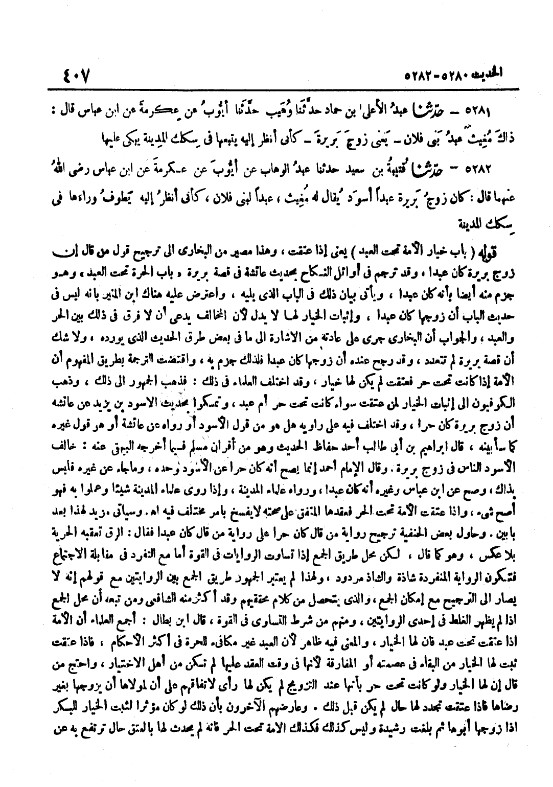 يَعْنِي إِذَا عَتَقَتْ وَهَذَا مَصِيرٌ مِنَ الْبُخَارِيِّ إِلَى تَرْجِيحِ قَوْلِ مَنْ قَالَ إِنَّ زَوْجَ بَرِيرَةَ كَانَ عَبْدًا وَقَدْ تَرْجَمَ فِي أَوَائِلِ النِّكَاحِ بِحَدِيثِ عَائِشَةَ فِي قِصَّةِ بَرِيرَةَ بَابُ الْحُرَّةِ تَحْتَ الْعَبْدِ وَهُوَ جَزْمٌ مِنْهُ أَيْضًا بِأَنَّهُ كَانَ عَبْدًا وَيَأْتِي بَيَانُ ذَلِكَ فِي الْبَابِ الَّذِي يَلِيهِ وَاعْترض عَلَيْهِ هُنَاكَ بن الْمُنِيرِ بِأَنَّهُ لَيْسَ فِي حَدِيثِ الْبَابِ أَنَّ زَوْجَهَا كَانَ عَبْدًا وَإِثْبَاتُ الْخِيَارِ لَهَا لَا يَدُلُّ لِأَنَّ الْمُخَالِفَ يَدَّعِي أَنْ لَا فَرْقَ فِي ذَلِكَ بَيْنَ الْحُرِّ وَالْعَبْدِ وَالْجَوَابُ أَنَّ الْبُخَارِيَّ جَرَى عَلَى عَادَتِهِ مِنَ الْإِشَارَةِ إِلَى مَا فِي بَعْضِ طُرُقِ الْحَدِيثِ الَّذِي يُورِدُهُ وَلَا شَكَّ أَنَّ قِصَّةَ بَرِيرَةَ لَمْ تَتَعَدَّدْ وَقَدْ رَجَحَ عِنْدَهُ أَنَّ زَوْجَهَا كَانَ عَبْدًا فَلِذَلِكَ جَزَمَ بِهِ وَاقْتَضَتِ التَّرْجَمَةُ بِطَرِيقِ الْمَفْهُومِ أَنَّ الْأَمَةَ إِذَا كَانَتْ تَحْتَ حُرٍّ فَعُتِقَتْ لَمْ يَكُنْ لَهَا خِيَارٌ وَقَدِ اخْتَلَفَ الْعُلَمَاءُ فِي ذَلِكَ فَذَهَبَ الْجُمْهُورُ إِلَى ذَلِكَ وَذَهَبَ الْكُوفِيُّونَ إِلَى إِثْبَاتِ الْخِيَارِ لِمَنْ عَتَقَتْ سَوَاءٌ كَانَتْ تَحْتَ حُرٍّ أَمْ عَبْدٍ وَتَمَسَّكُوا بِحَدِيثِ الْأَسْوَدِ بْنِ يَزِيدَ عَنْ عَائِشَةَ أَنَّ زَوْجَ بَرِيرَةَ كَانَ حُرًّا وَقَدِ اخْتُلِفَ فِيهِ عَلَى راوية هَلْ هُوَ مِنْ قَوْلِ الْأَسْوَدِ أَوْ رَوَاهُ عَنْ عَائِشَةَ أَوْ هُوَ قَوْلُ غَيْرِهِ كَمَا سَأُبَيِّنُهُ قَالَ إِبْرَاهِيمُ بْنُ أَبِي طَالِبٍ أَحَدُ حُفَّاظِ الْحَدِيثِ وَهُوَ مِنْ أَقْرَانِ مُسْلِمٍ فِيمَا أَخْرَجَهُ الْبَيْهَقِيُّ عَنْهُ خَالَفَ الْأَسْوَدُ النَّاسَ فِي زَوْجِ بَرِيرَةَ وَقَالَ الْإِمَامُ أَحْمَدُ إِنَّمَا يَصِحُّ أَنَّهُ كَانَ حُرًّا عَنِ الْأَسْوَدِ وَحْدَهُ وَمَا جَاءَ عَنْ غَيْرِهِ فَلَيْسَ بِذَاكَ وَصَحَّ عَنِ بن عَبَّاسٍ وَغَيْرِهِ أَنَّهُ كَانَ عَبْدًا وَرَوَاهُ عُلَمَاءُ الْمَدِينَةِ وَإِذَا رَوَى عُلَمَاءُ الْمَدِينَةِ شَيْئًا وَعَمِلُوا بِهِ فَهُوَ أَصَحُّ شَيْءٍ وَإِذَا عُتِقَتِ الْأَمَةُ تَحْتَ الْحُرِّ فَعَقْدُهَا الْمُتَّفَقُ عَلَى صِحَّتِهِ لَا يُفْسَخُ بِأَمْرٍ مُخْتَلَفٍ فِيهِ اه وَسَيَأْتِي مَزِيدٌ لِهَذَا بَعْدَ بَابَيْنِ وَحَاوَلَ بَعْضُ الْحَنَفِيَّةِ تَرْجِيحَ رِوَايَةِ مَنْ قَالَ كَانَ حُرًّا عَلَى رِوَايَةِ مَنْ قَالَ كَانَ عَبْدًا فَقَالَ الرِّقُّ تَعْقُبُهُ الْحُرِّيَّةُ بِلَا عَكْسٍ وَهُوَ كَمَا قَالَ لَكِنَّ مَحِلَّ طَرِيقِ الْجَمْعِ إِذَا تَسَاوَتِ الرِّوَايَاتُ فِي الْقُوَّةِ أَمَّا مَعَ التَّفَرُّدِ فِي مُقَابَلَةِ الِاجْتِمَاعِ فَتَكُونُ الرِّوَايَةُ الْمُنْفَرِدَةُ شَاذَّةً وَالشَّاذُّ مَرْدُودٌ وَلِهَذَا لَمْ يَعْتَبِرِ الْجُمْهُورُ طَرِيقَ الْجَمْعِ بَيْنَ الرِّوَايَتَيْنِ مَعَ قَوْلِهِمْ إِنَّهُ لَا يُصَارُ إِلَى التَّرْجِيحِ مَعَ إِمْكَانِ الْجَمْعِ وَالَّذِي يَتَحَصَّلُ مِنْ كَلَامِ مُحَقِّقِيهِمْ وَقَدْ أَكْثَرَ مِنْهُ الشَّافِعِيُّ وَمَنْ تَبِعَهُ أَنَّ مَحِلَّ الْجَمْعِ إِذَا لَمْ يَظْهَرِ الْغَلَطُ فِي إِحْدَى الرِّوَايَتَيْنِ وَمِنْهُمْ مَنْ شَرَطَ التَّسَاوِيَ فِي الْقُوَّة قَالَ بن بَطَّالٍ أَجْمَعَ الْعُلَمَاءُ أَنَّ الْأَمَةَ إِذَا عُتِقَتْ تَحْتَ عَبْدٍ فَإِنَّ لَهَا الْخِيَارَ وَالْمَعْنَى فِيهِ ظَاهِرٌ لِأَنَّ الْعَبْدَ غَيْرُ مُكَافِئٍ لِلْحُرَّةِ فِي أَكْثَرِ الْأَحْكَامِ فَإِذَا عَتَقَتْ ثَبَتَ لَهَا الْخِيَارُ مِنَ الْبَقَاءِ فِي عِصْمَتِهِ أَوِ الْمُفَارَقَةِ لِأَنَّهَا فِي وَقْتِ الْعَقْدِ