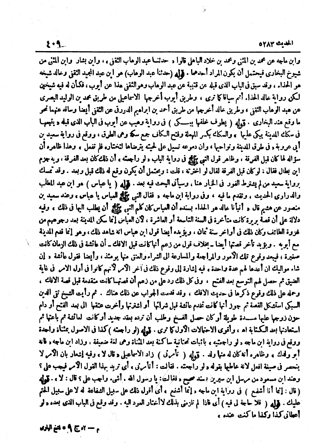 وبن مَاجَهْ عَنْ مُحَمَّدِ بْنِ الْمُثَنَّى وَمُحَمَّدِ بْنِ خَلَّادٍ الْبَاهِلِيِّ قَالُوا حَدَّثَنَا عَبْدُ الْوَهَّابِ الثَّقَفِيُّ وبن بشار وبن الْمُثَنَّى مِنْ شُيُوخِ الْبُخَارِيِّ فَيَحْتَمِلُ أَنْ يَكُونَ الْمُرَادُ أَحَدَهُمَا قَوْلُهُ حَدَّثَنَا عَبْدُ الْوَهَّابِ هُوَ بن عَبْدِ الْمَجِيدِ الثَّقَفِيُّ وَخَالِدٌ شَيْخُهُ هُوَ الْحَذَّاءُ وَقَدْ سَبَقَ فِي الْبَابِ الَّذِي قَبْلَهُ عَنْ قُتَيْبَةَ عَنْ عَبْدِ الْوَهَّابِ وَهُوَ الثَّقَفِيُّ هَذَا عَنْ أَيُّوبَ فَكَأَنَّ لَهُ فِيهِ شَيْخَيْنِ لَكِنَّ رِوَايَةَ خَالِدٍ الْحَذَّاءِ أَتَمُّ سِيَاقًا كَمَا تَرَى وَطَرِيقُ أَيُّوبَ أَخْرَجَهَا الْإِسْمَاعِيلِيُّ مِنْ طَرِيقِ مُحَمَّدِ بْنِ الْوَلِيدِ الْبَصْرِيِّ عَنْ عَبْدِ الْوَهَّابِ الثَّقَفِيِّ وَطَرِيقُ خَالِدٍ أَخْرَجَهَا مِنْ طَرِيقِ أَحْمَدَ بْنِ إِبْرَاهِيمَ الدَّوْرَقِيِّ عَنِ الثَّقَفِيِّ أَيْضًا وَسَاقَهُ عَنْهُمَا نَحْوَ مَا وَقَعَ عِنْدَ الْبُخَارِيِّ قَوْلُهُ يَطُوفُ خَلْفَهَا يَبْكِي فِي رِوَايَةِ وُهَيْبٍ عَنْ أَيُّوبَ فِي الْبَابِ الَّذِي قَبْلَهُ يَتْبَعُهَا فِي سِكَكِ الْمَدِينَةِ يَبْكِي عَلَيْهَا وَالسِّكَكُ بِكَسْرِ الْمُهْمَلَةِ وَفَتْحِ الْكَافِ جَمْعُ سِكَّةٍ وَهِيَ الطُّرُقُ وَوَقَعَ فِي رِوَايَةِ سَعِيدِ بْنِ أَبِي عَرُوبَةَ فِي طُرُقِ الْمَدِينَةِ وَنَوَاحِيهَا وَأَنَّ دُمُوعَهُ تَسِيلُ عَلَى لِحْيَتِهِ يَتَرَضَّاهَا لتختاره فَلَمْ تَفْعَلْ وَهَذَا ظَاهِرُهُ أَنَّ سُؤَالَهُ لَهَا كَانَ قَبْلَ الْفُرْقَةِ وَظَاهِرُ قَوْلَ النَّبِيِّ صَلَّى اللَّهُ عَلَيْهِ وَسَلَّمَ فِي رِوَايَةِ الْبَابِ لَوْ راجعته أَنَّ ذَلِكَ كَانَ بَعْدَ الْفُرْقَةِ وَبِهِ جَزَمَ بن بَطَّالٍ فَقَالَ لَوْ كَانَ قَبْلَ الْفُرْقَةِ لَقَالَ لَوِ اخْتَرْتِهِ قُلْتُ وَيُحْتَمَلُ أَنْ يَكُونَ وَقَعَ لَهُ ذَلِكَ قَبْلُ وَبَعْدُ وَقَدْ تَمَسَّكَ بِرِوَايَةِ سَعِيدٍ مَنْ لَمْ يَشْتَرِطِ الْفَوْرَ فِي الْخِيَارِ هُنَا وَسَيَأْتِي الْبَحْثُ فِيهِ بَعْدُ قَوْلُهُ يَا عَبَّاس هُوَ بن عَبْدِ الْمُطَّلِبِ وَالِدُ رَاوِي الْحَدِيثِ وَتَقَدَّمَ مَا فِيهِ وَفِي رِوَايَة بن مَاجَهْ فَقَالَ النَّبِيُّ صَلَّى اللَّهُ عَلَيْهِ وَسَلَّمَ لِلْعَبَّاسِ يَا عَبَّاسُ وَعِنْدَ سَعِيدِ بْنِ مَنْصُورٍ عَنْ هُشَيْمٍ قَالَ أَنْبَأَنَا خَالِدٌ هُوَ الْحَذَّاءُ بِسَنَدِهِ أَنَّ الْعَبَّاسَ كَانَ كَلَّمَ النَّبِيَّ صَلَّى اللَّهُ عَلَيْهِ وَسَلَّمَ أَنْ يَطْلُبَ إِلَيْهَا فِي ذَلِكَ وَفِيهِ دَلَالَةٌ عَلَى أَنَّ قِصَّةَ بَرِيرَةَ كَانَتْ مُتَأَخِّرَةً فِي السَّنَةِ التَّاسِعَةِ أَوِ الْعَاشِرَةِ لِأَنَّ الْعَبَّاسَ إِنَّمَا سَكَنَ الْمَدِينَةَ بَعْدَ رُجُوعِهِمْ مِنْ غَزْوَةِ الطَّائِفِ وَكَانَ ذَلِكَ فِي أَوَاخِرِ سنة ثَمَان وَيُؤَيِّدهُ أَيْضا قَول بن عَبَّاسٍ إِنَّهُ شَاهَدَ ذَلِكَ وَهُوَ إِنَّمَا قَدِمَ الْمَدِينَةَ مَعَ أَبَوَيْهِ وَيُؤَيِّدُ تَأَخُّرَ قِصَّتِهَا أَيْضًا بِخِلَافِ قَوْلِ مَنْ زَعَمَ أَنَّهَا كَانَتْ قَبْلَ الْإِفْكِ أَنَّ عَائِشَةَ فِي ذَلِكَ الزَّمَانِ كَانَتْ صَغِيرَةً فَيَبْعُدُ وُقُوعُ تِلْكَ الْأُمُورِ وَالْمُرَاجَعَةُ وَالْمُسَارَعَةُ إِلَى الشِّرَاءِ وَالْعِتْقُ مِنْهَا يَوْمَئِذٍ وَأَيْضًا فَقَوْلُ عَائِشَةَ إِنْ شَاءَ مَوَالِيكِ أَنْ أَعُدَّهَا لَهُمْ عَدَّةً وَاحِدَةً فِيهِ إِشَارَةٌ إِلَى وُقُوعِ ذَلِكَ فِي آخِرِ الْأَمْرِ لِأَنَّهُمْ كَانُوا فِي أَوَّلِ الْأَمْرِ فِي غَايَةِ الضِّيقِ ثُمَّ حَصَلَ لَهُمُ التَّوَسُّعُ بَعْدَ الْفَتْحِ وَفِي كُلِّ ذَلِكَ رَدٌّ عَلَى مَنْ زَعَمَ أَنَّ قِصَّتَهَا كَانَتْ مُتَقَدِّمَةً قَبْلَ قِصَّةِ الْ